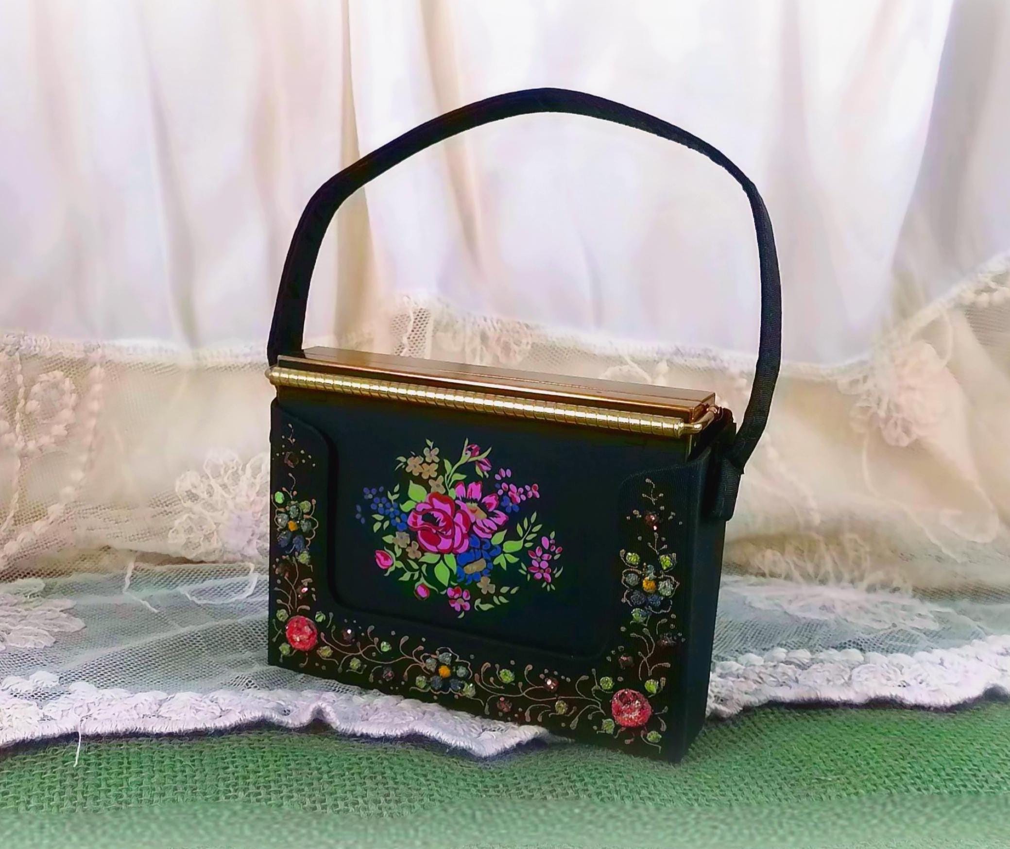 Up for your consideration is a gorgeous Carry All Dance Purse with Matching Compact put out by the Volupte Company, Circa 1940's. This item is also known as a "Minaudieres Vanity Case". This compact has a matte black finish with a flower applet of Pink, Blue and Pale Green. The Compact Case has a "Swinglok" Closure.
