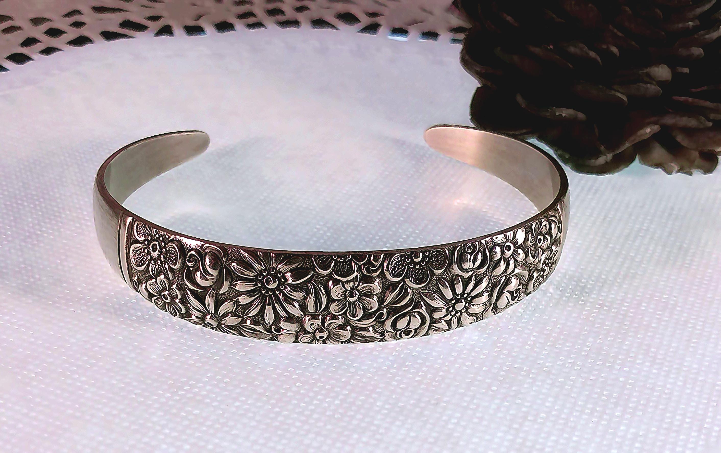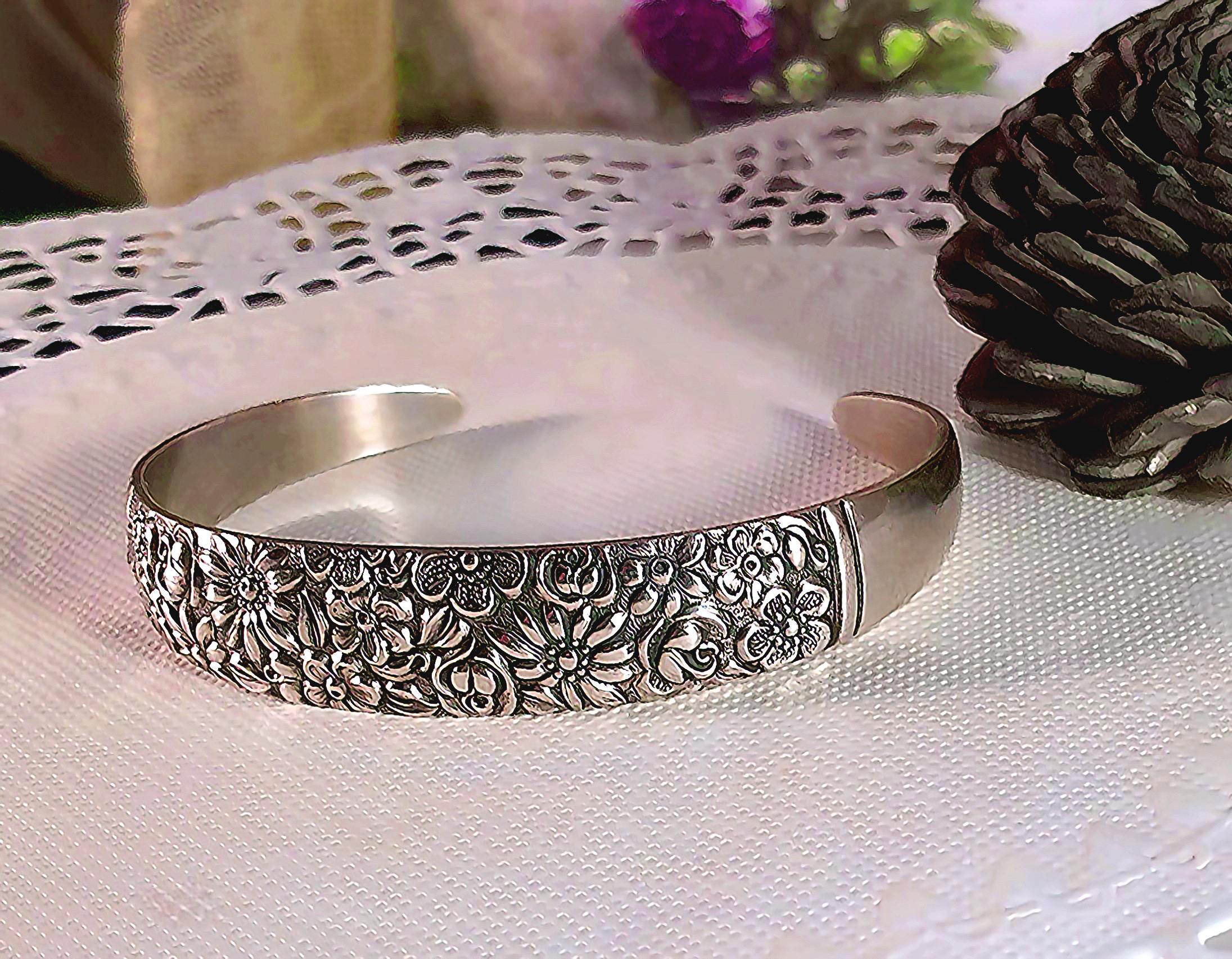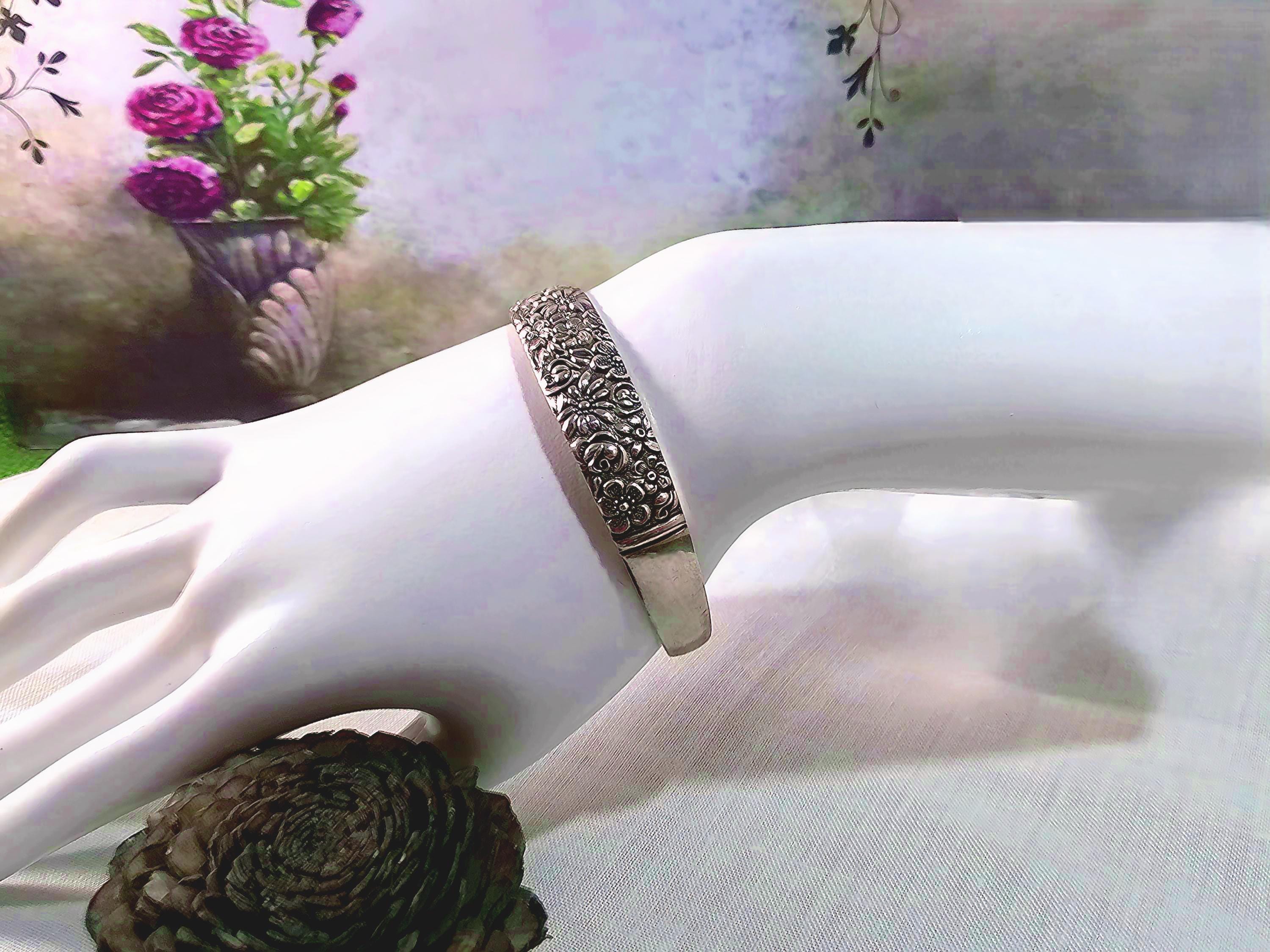 Sterling Silver Cuff Bracelet with Embossed Patina Relief - Contessina Floral designed 1965 by Towle Silversmiths