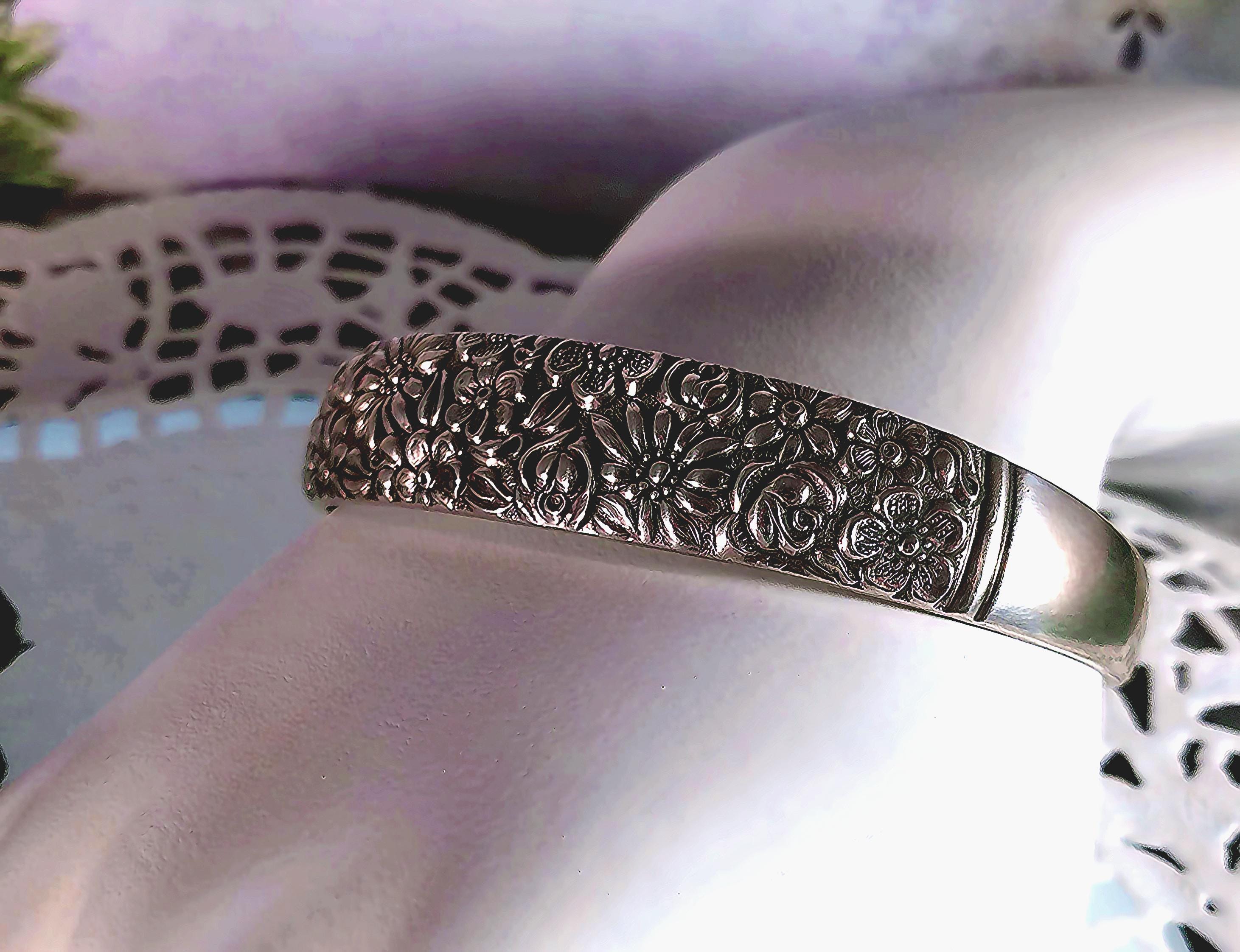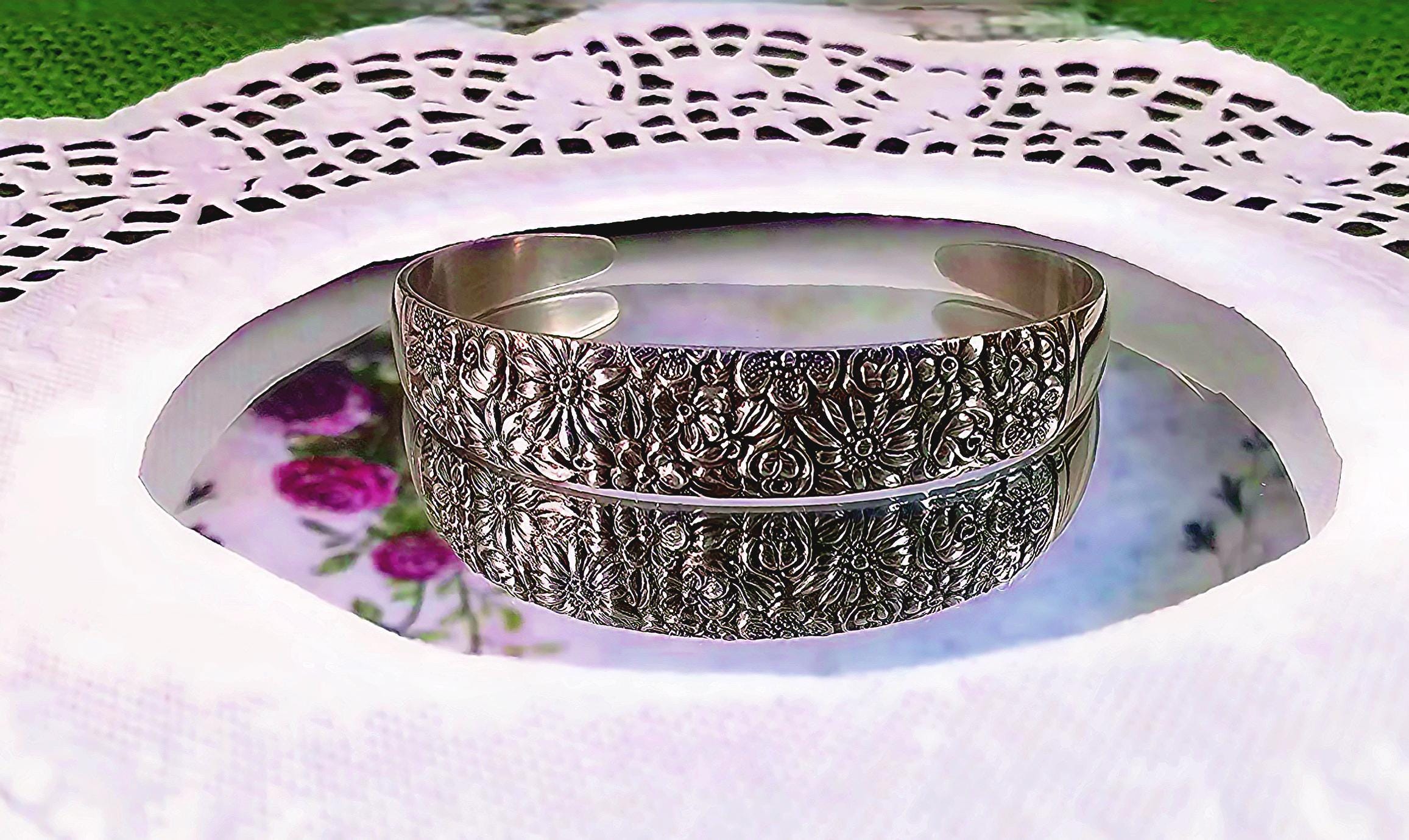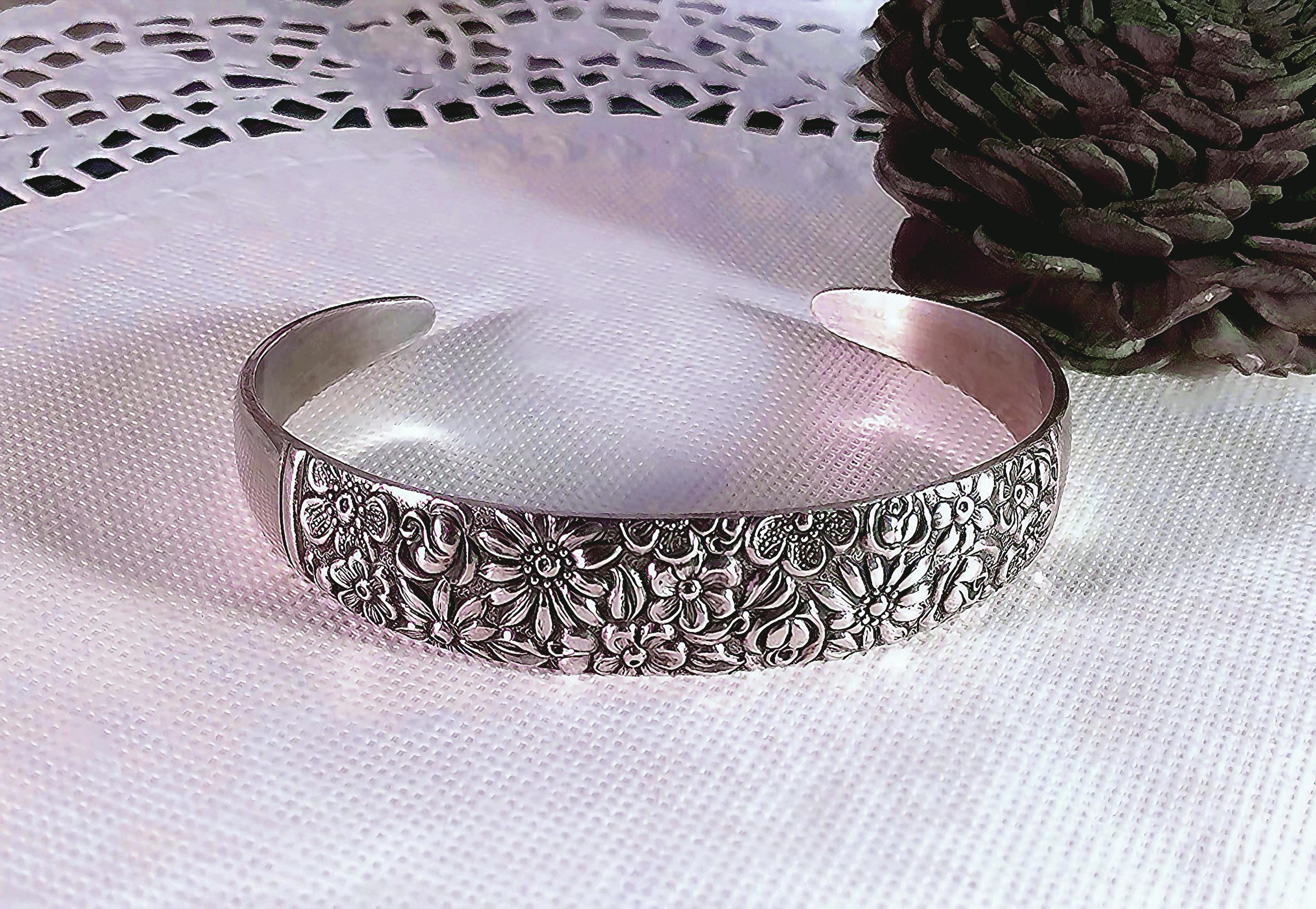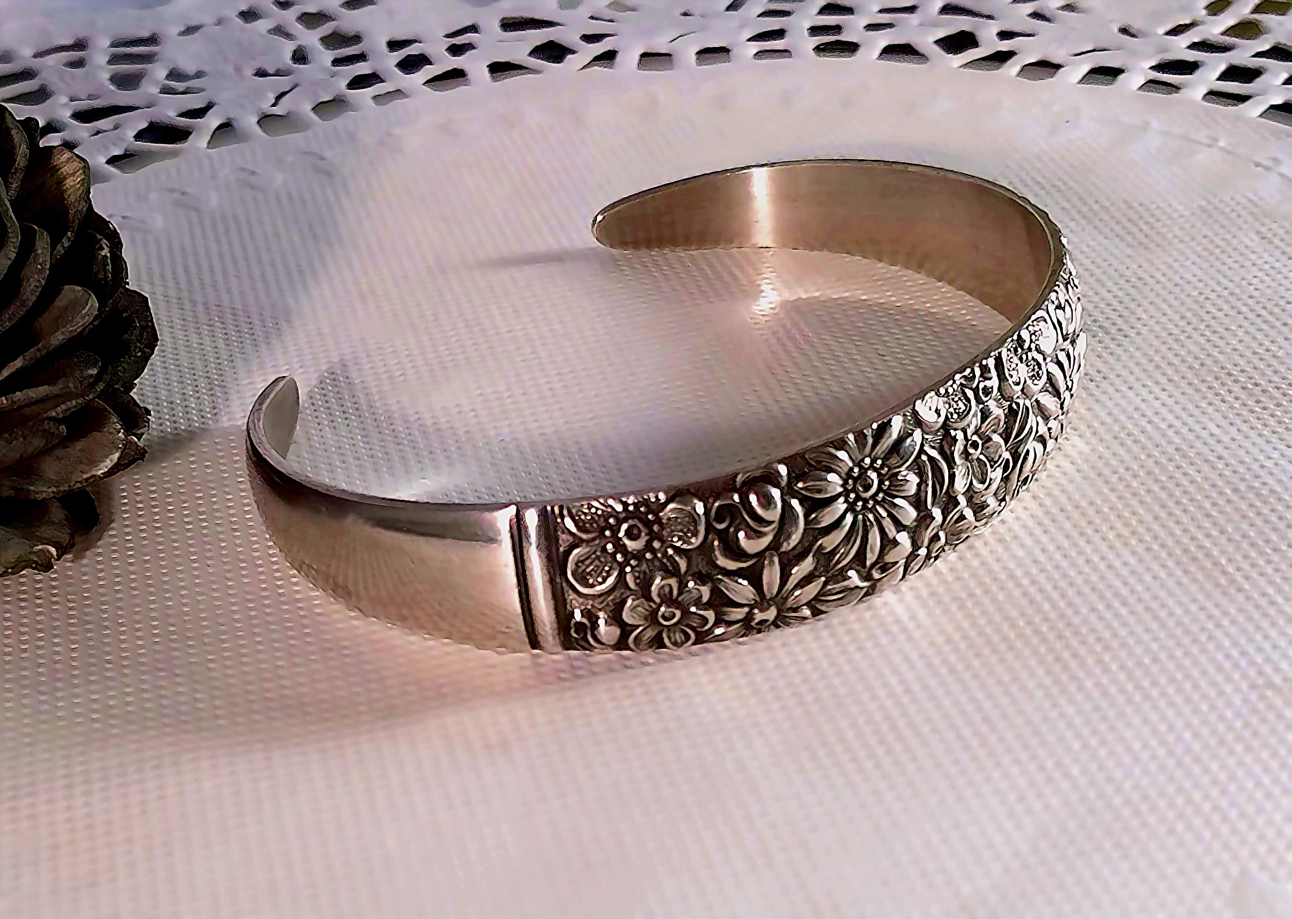 Sterling Silver Cuff Bracelet with Embossed Patina Relief - Contessina Floral designed 1965 by Towle Silversmiths