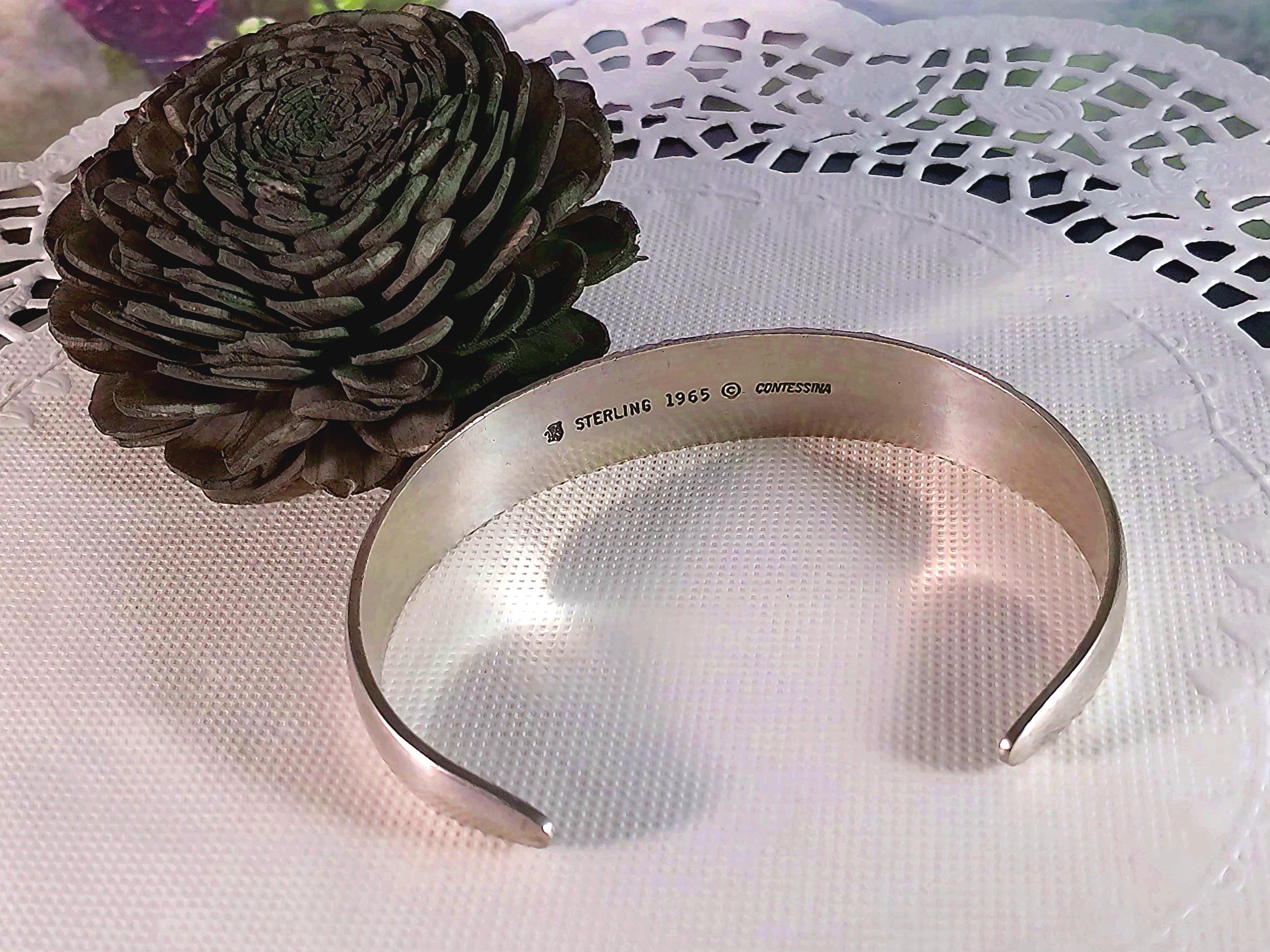 A perfect balance of patina and clean shininess is found in this Sterling Silver “Contessina” 1965 Cuff Bracelet, embossed with a floral relief design expertly crafted by Towle Silversmiths. The blend of patina to highlight each textured detail in the relief of the floral motif, accented by the smooth shiny areas will only be enhanced by the wearing of this beautiful cuff bracelet.