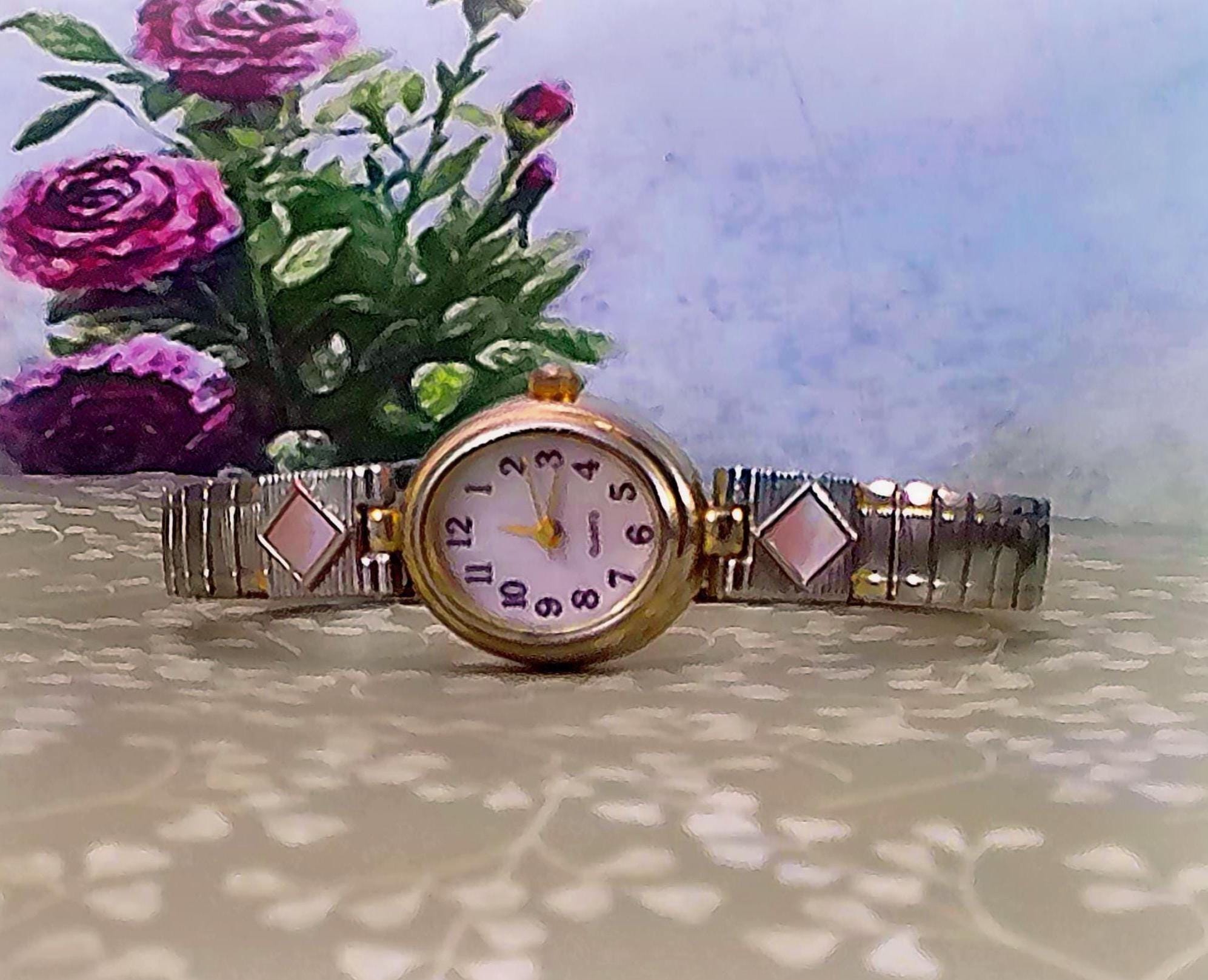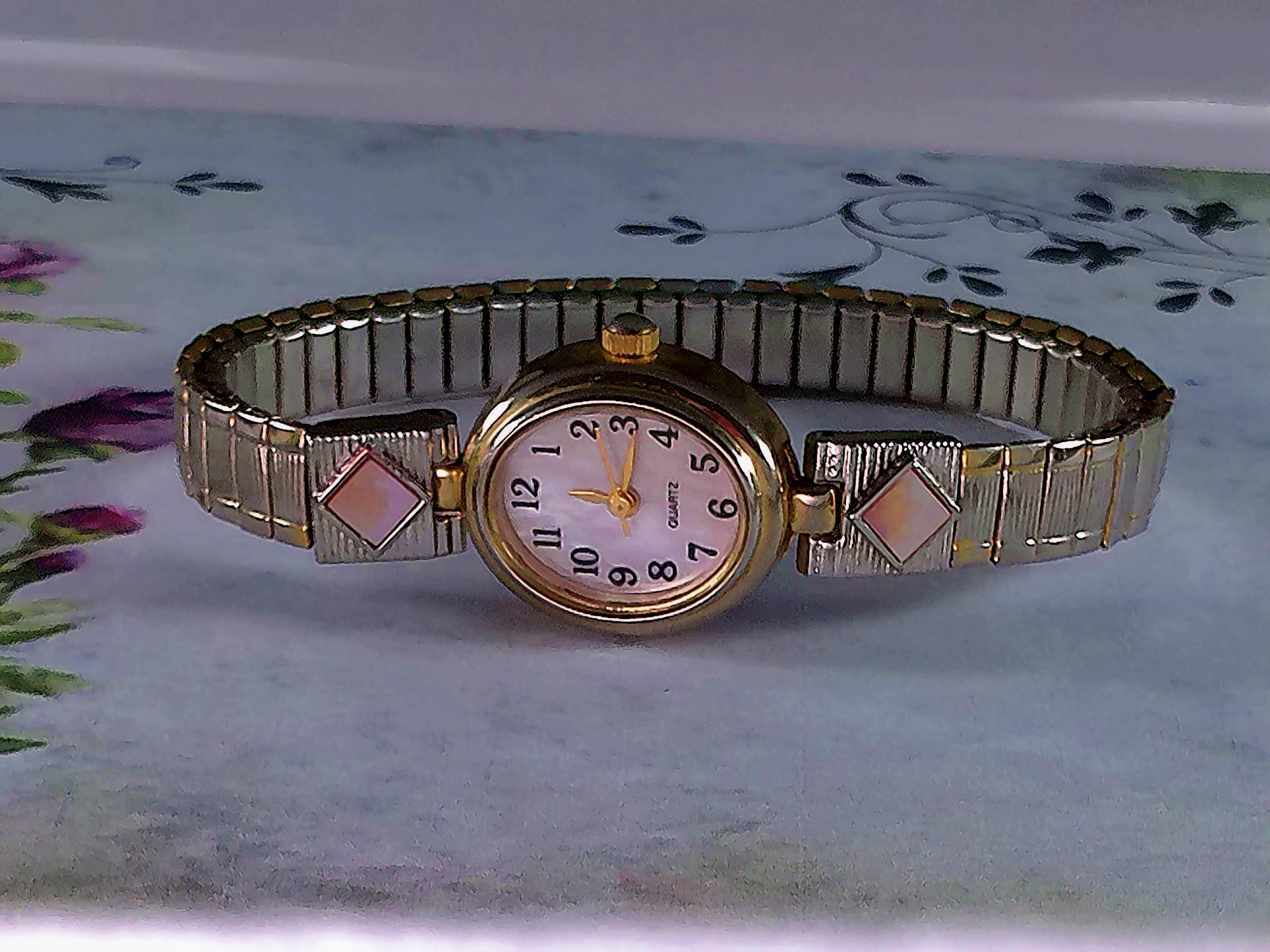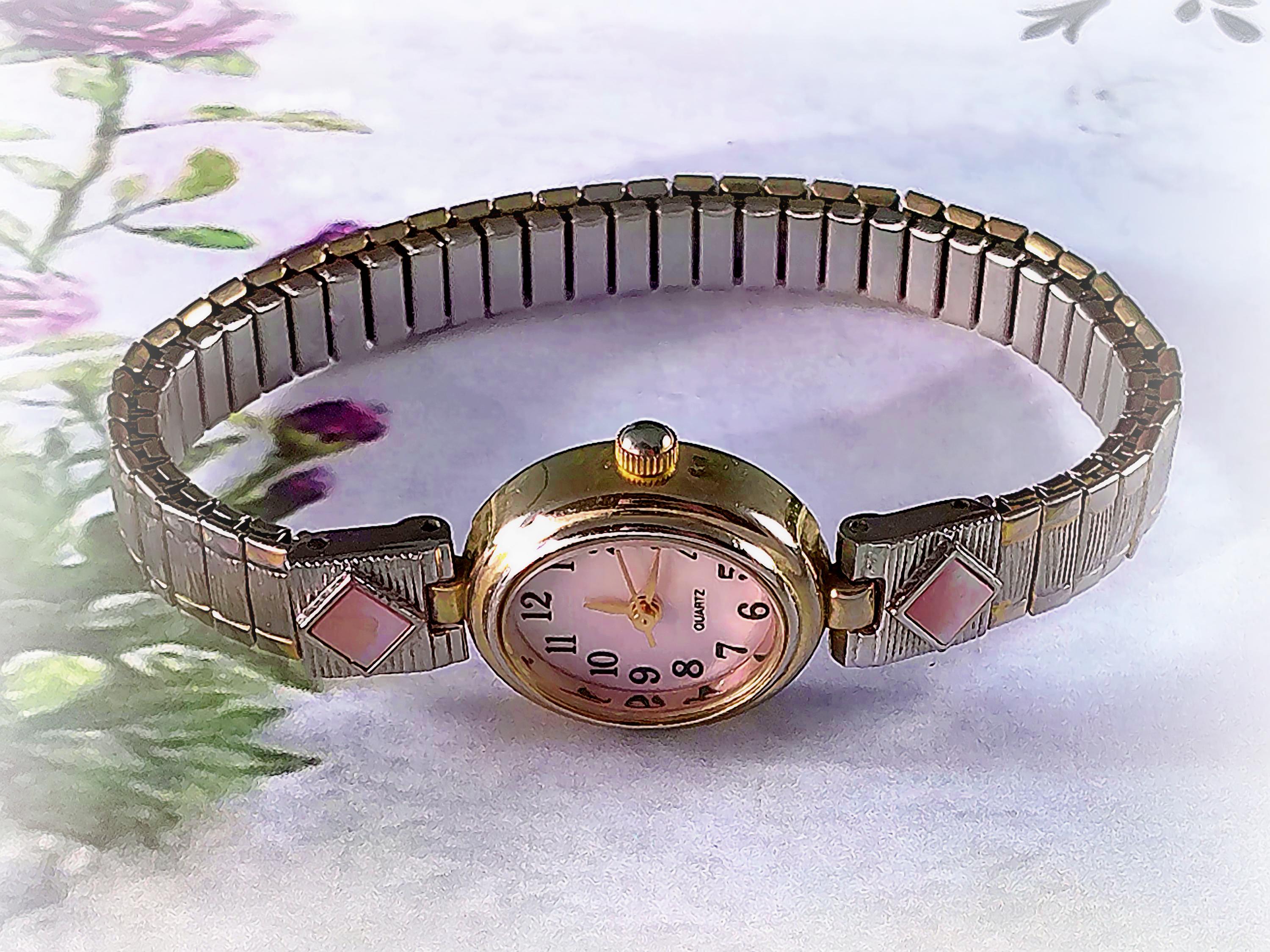 The iridescence of the Mother of Pearl this watch face gives varying shimmers of pastel colors alongside the predominant pink, making this a versatile fashion statement. The elastic expandable band smartly provides a custom and secure fit. Whether it’s chosen to be worn daily or as a special occasion watch, it will provide timeless beauty.