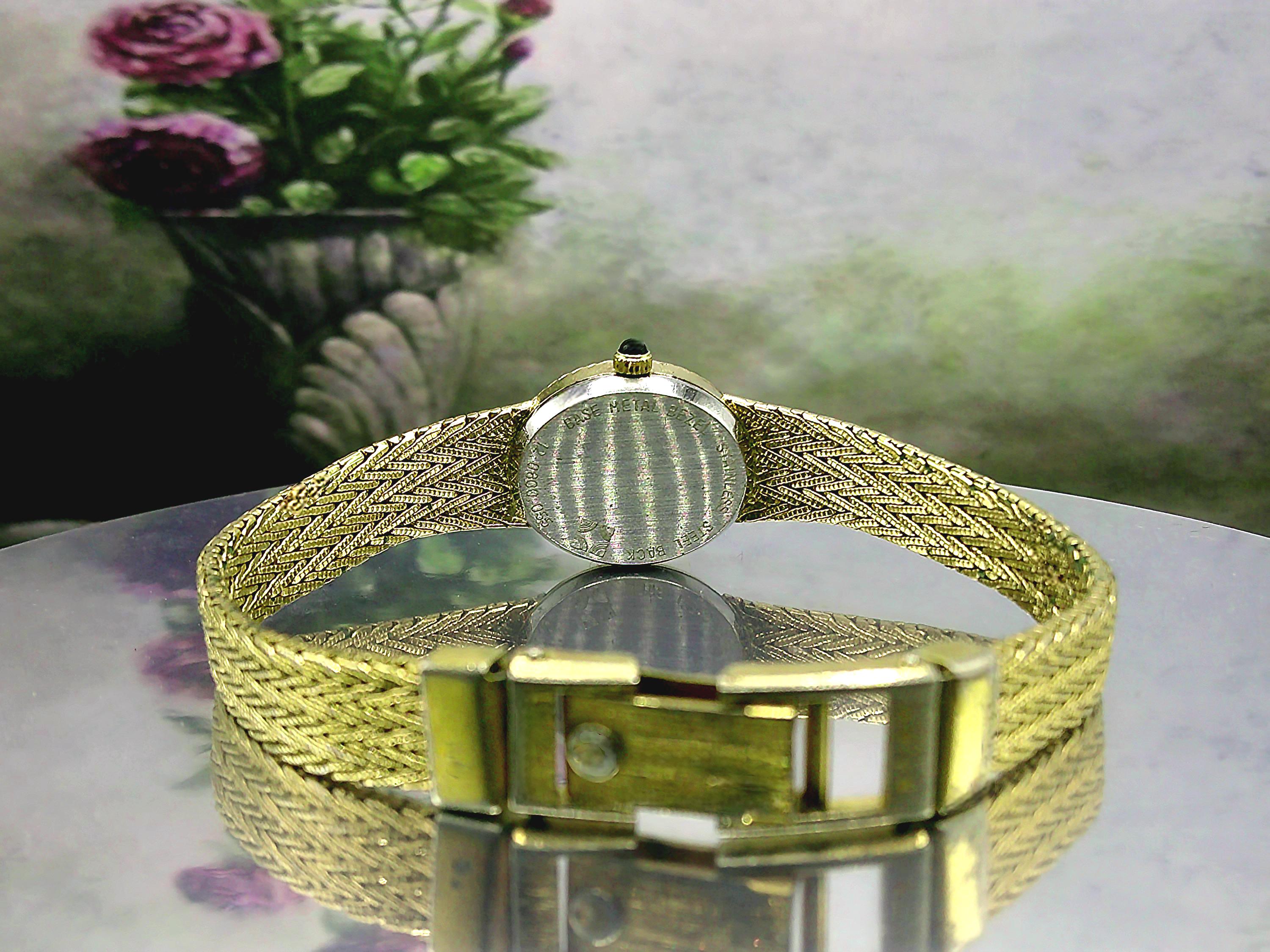 This is a gorgeous gold tone Movado Oval Faced Wrist Watch. Around the face is a lovely, feminine delicately engraved design that matches the band. This watch has a nice fold over clasp that closes securely. The hands of this watch are black with roman numerals at each hour. There is also a nice dark blue cabochon sapphire gem on the crown of this watch. This watch provides a beautiful presentation on your wrist. So very feminine!