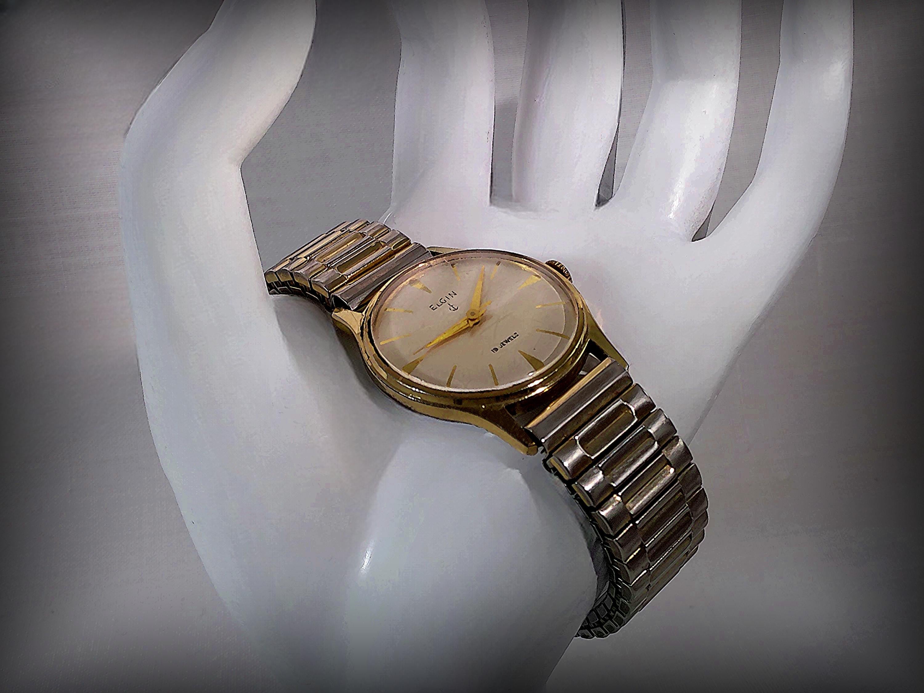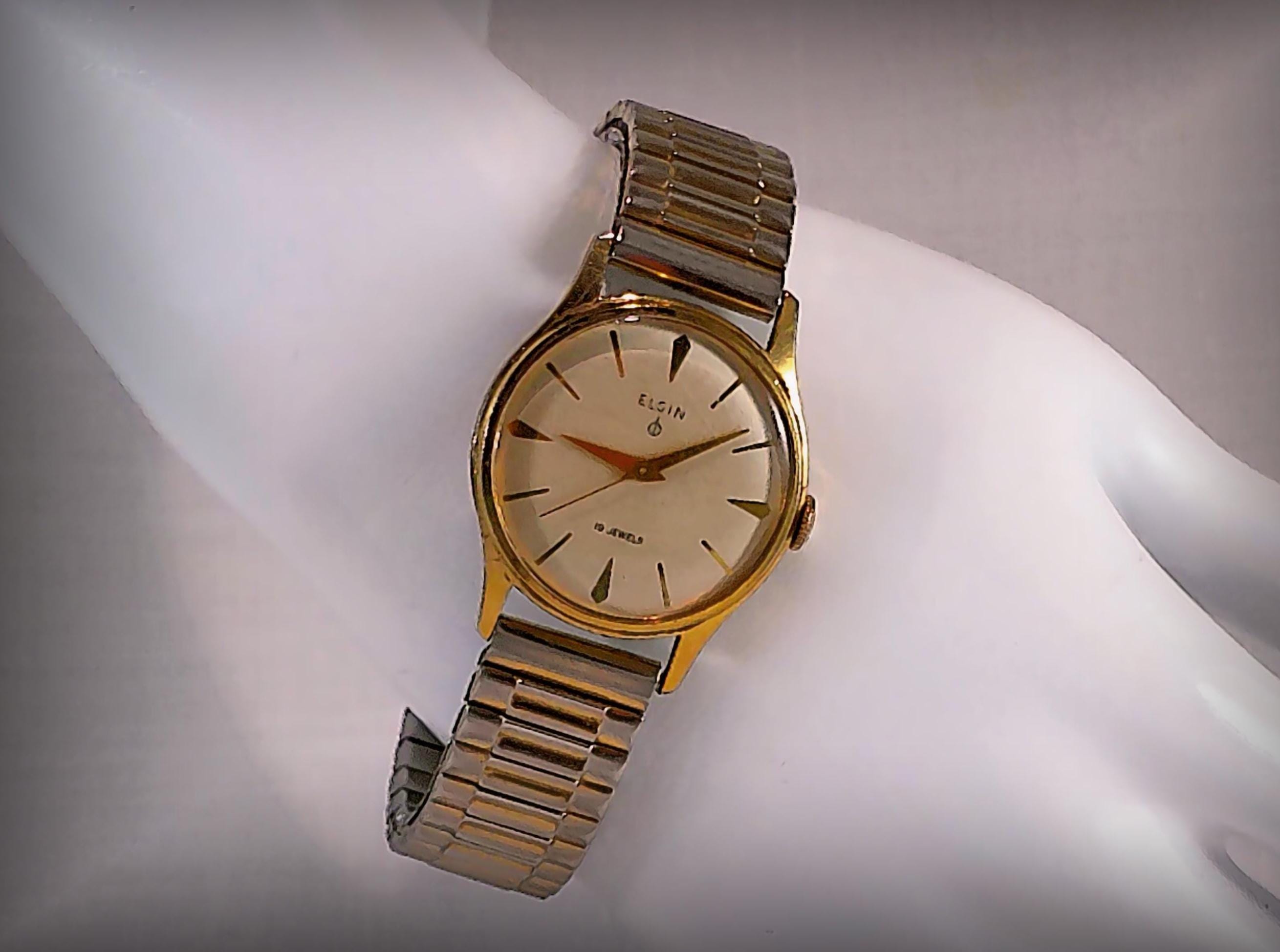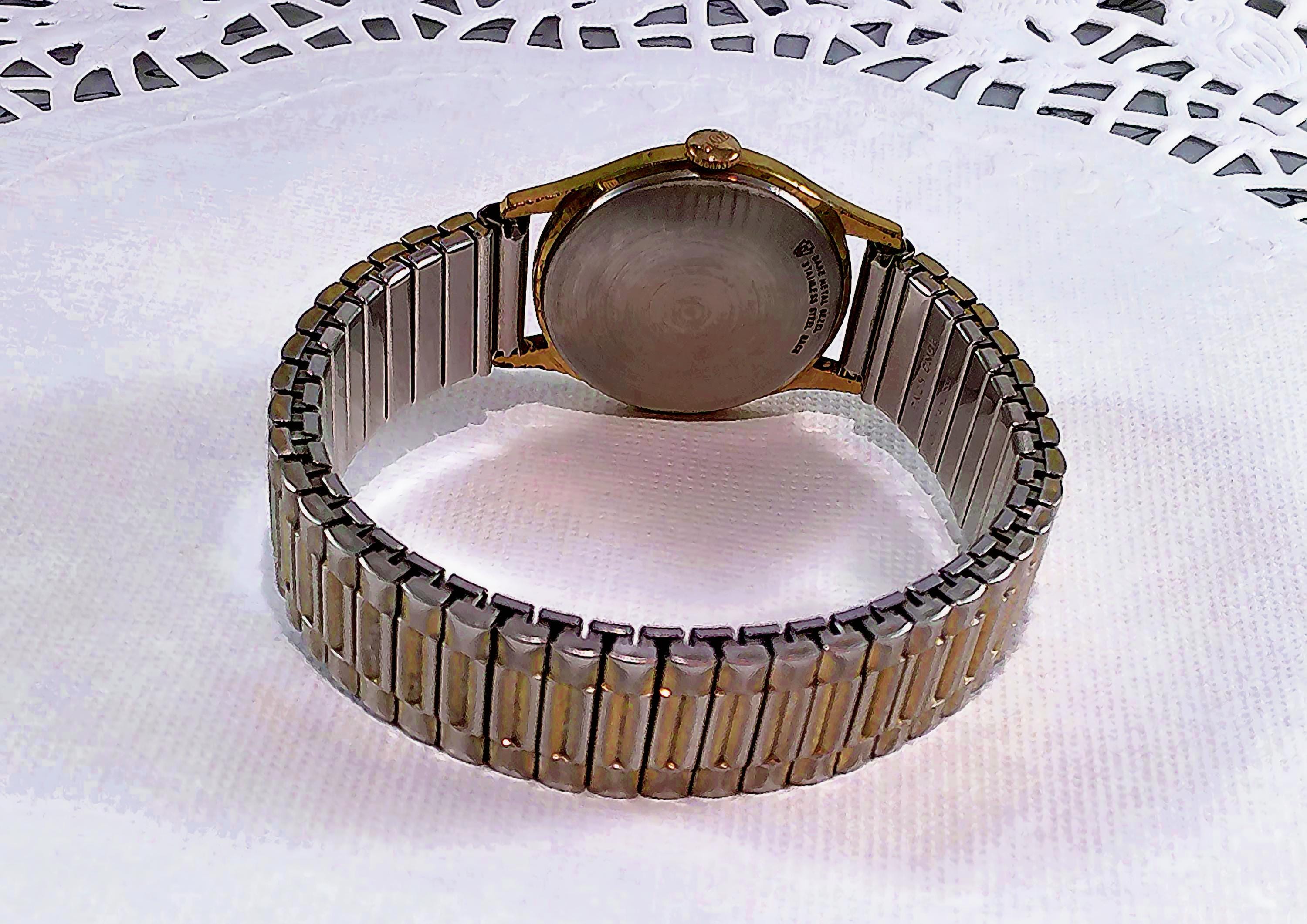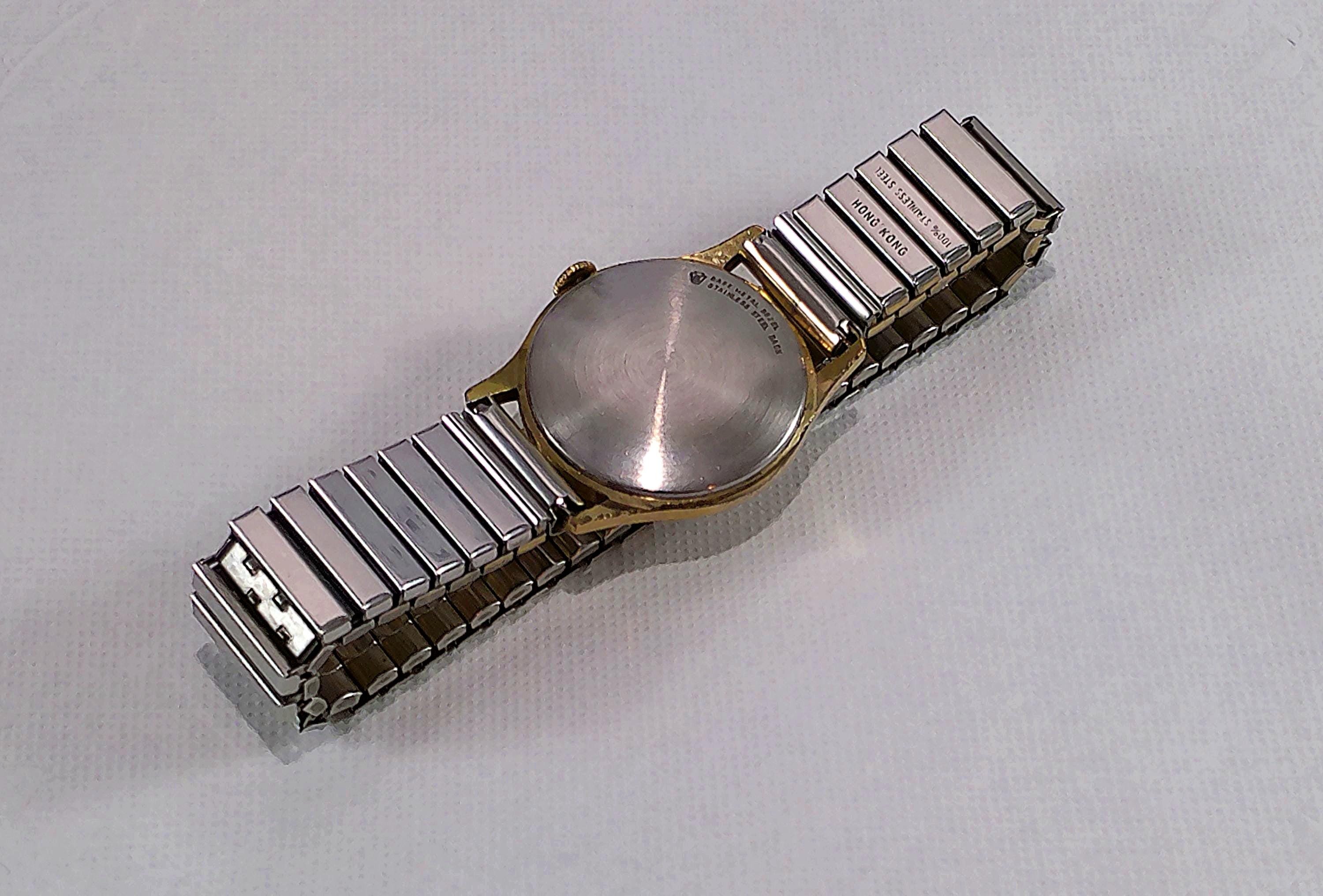 This Elgin Men’s Wrist Watch is an incredible find, with combined DuraBalance and 19 Jewel mechanics, that may be well-sought after by collectors. It truly is an exceptional watch, with its Mid-20th-century innovative American made free-sprung DuraBalance mechanism that rivaled the Swiss-made competitors of the time. Please note that the crystal has some minor vintage scuffing but does not deter from its handsome design nor function. An expandable band provides a comfortable custom fit. This is a mechanical watch that needs to be wound up. It is keeping good time and working smoothly.