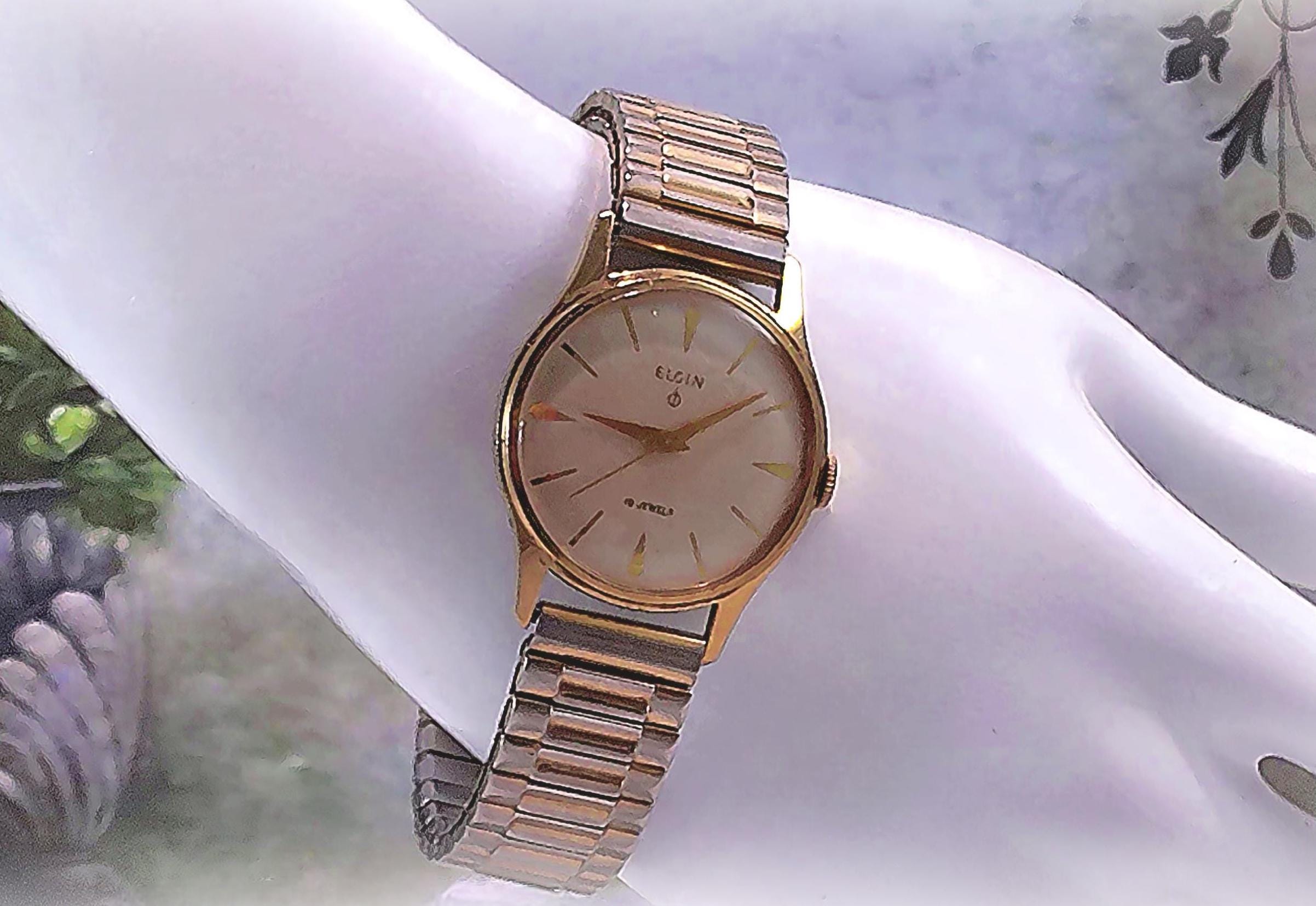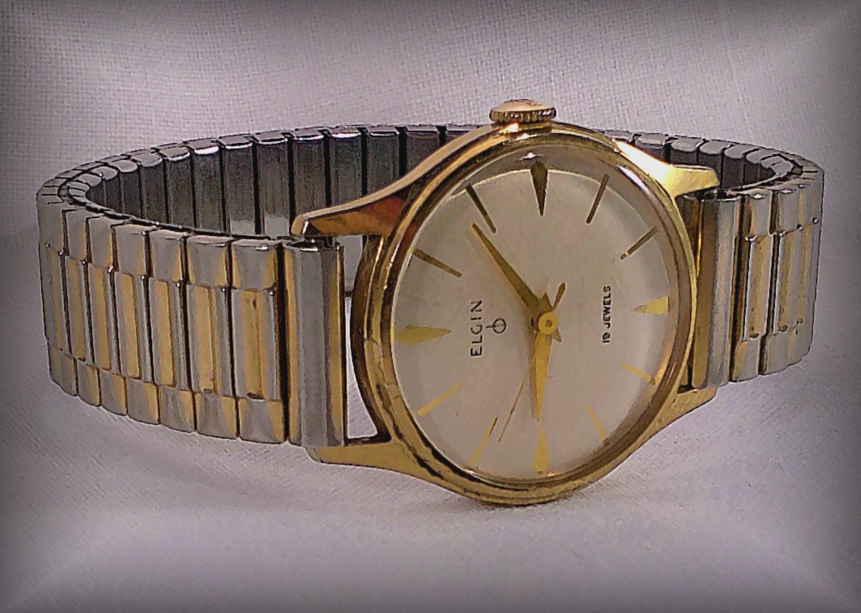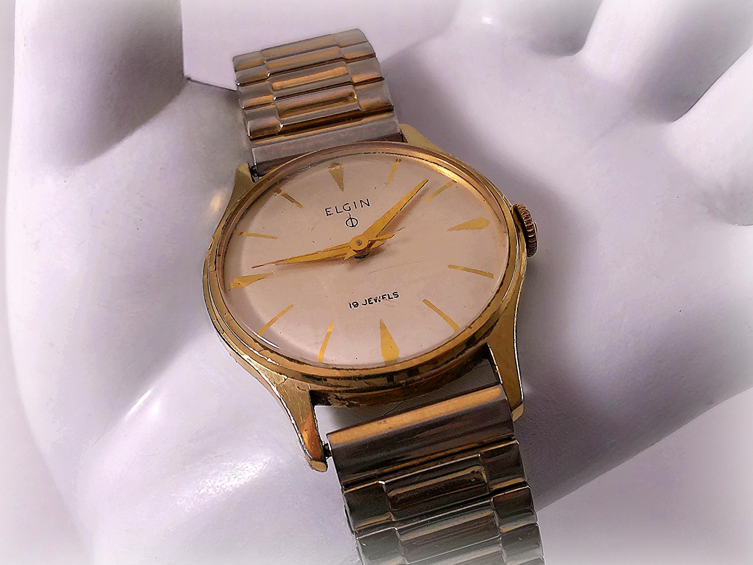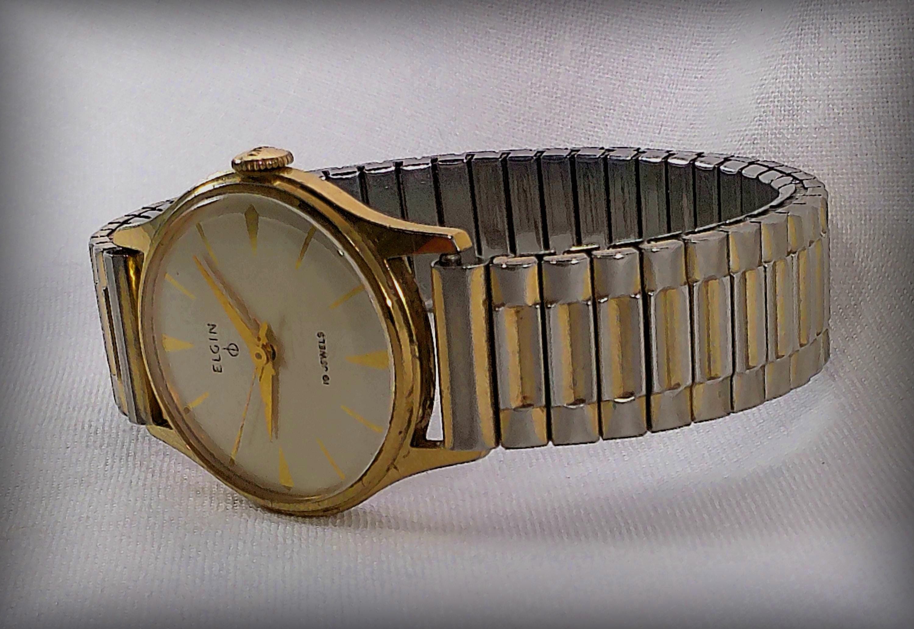 This Elgin Men’s Wrist Watch is an incredible find, with combined DuraBalance and 19 Jewel mechanics, that may be well-sought after by collectors. It truly is an exceptional watch, with its Mid-20th-century innovative American made free-sprung DuraBalance mechanism that rivaled the Swiss-made competitors of the time. Please note that the crystal has some minor vintage scuffing but does not deter from its handsome design nor function. An expandable band provides a comfortable custom fit. This is a mechanical watch that needs to be wound up. It is keeping good time and working smoothly.