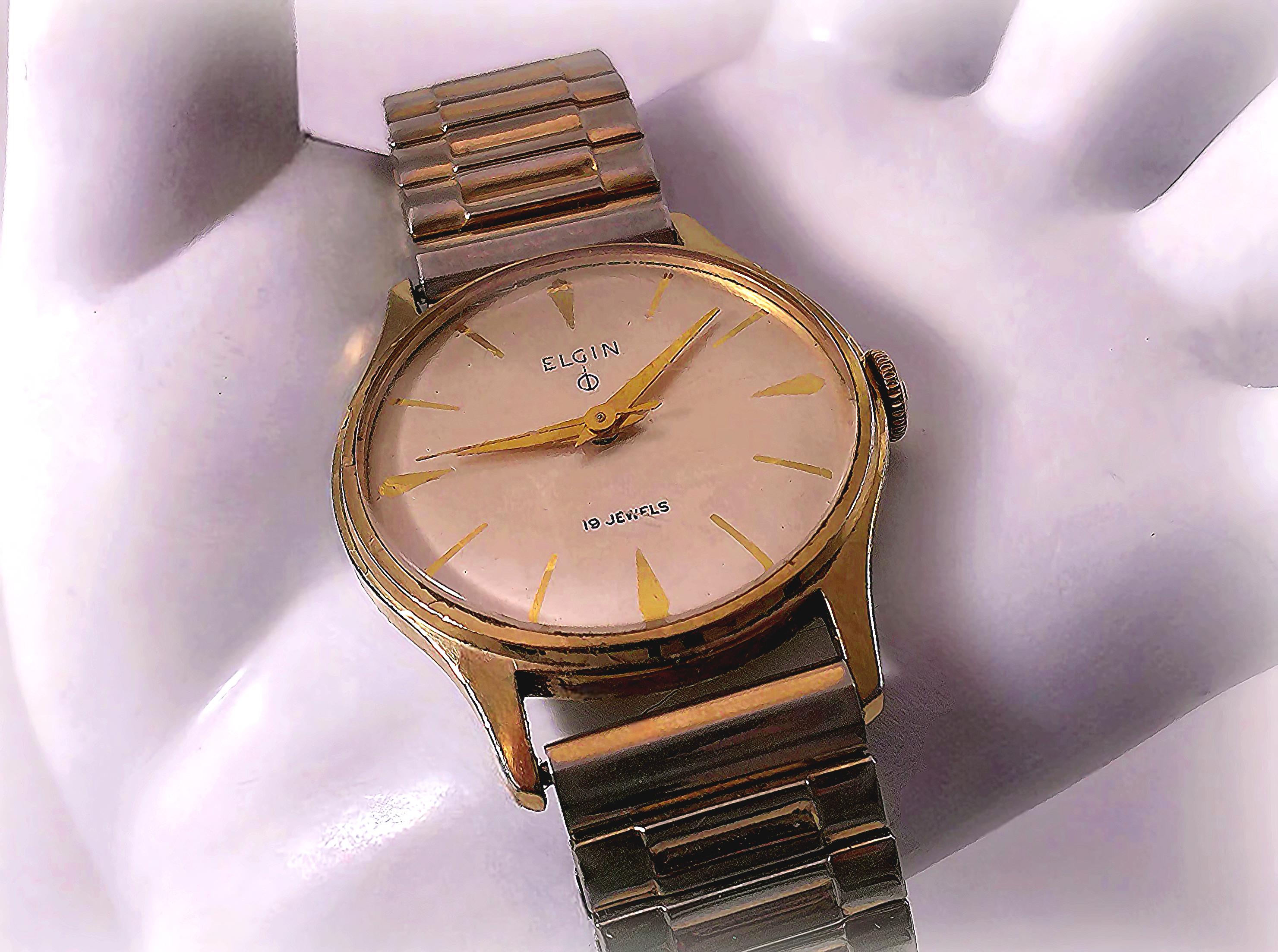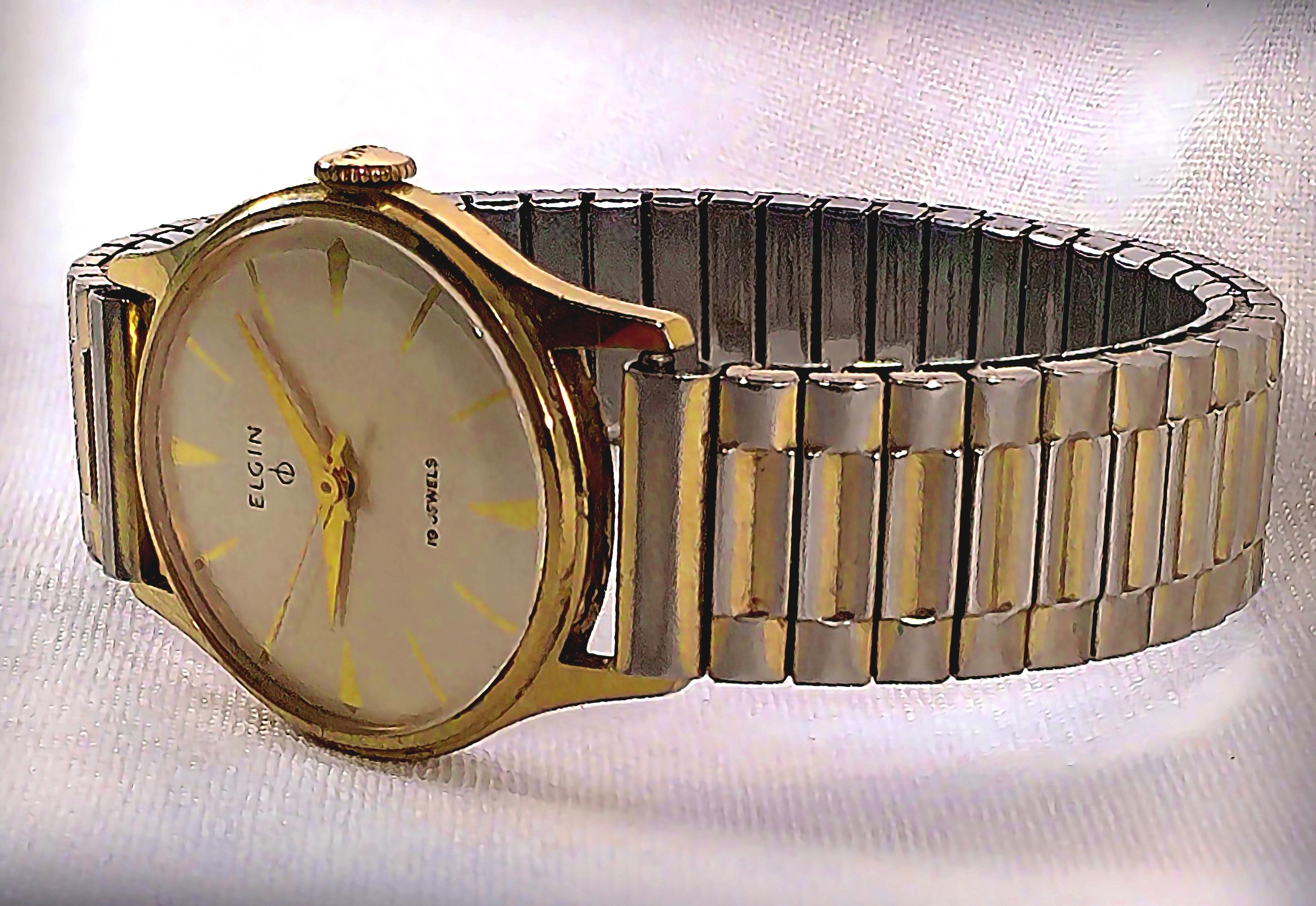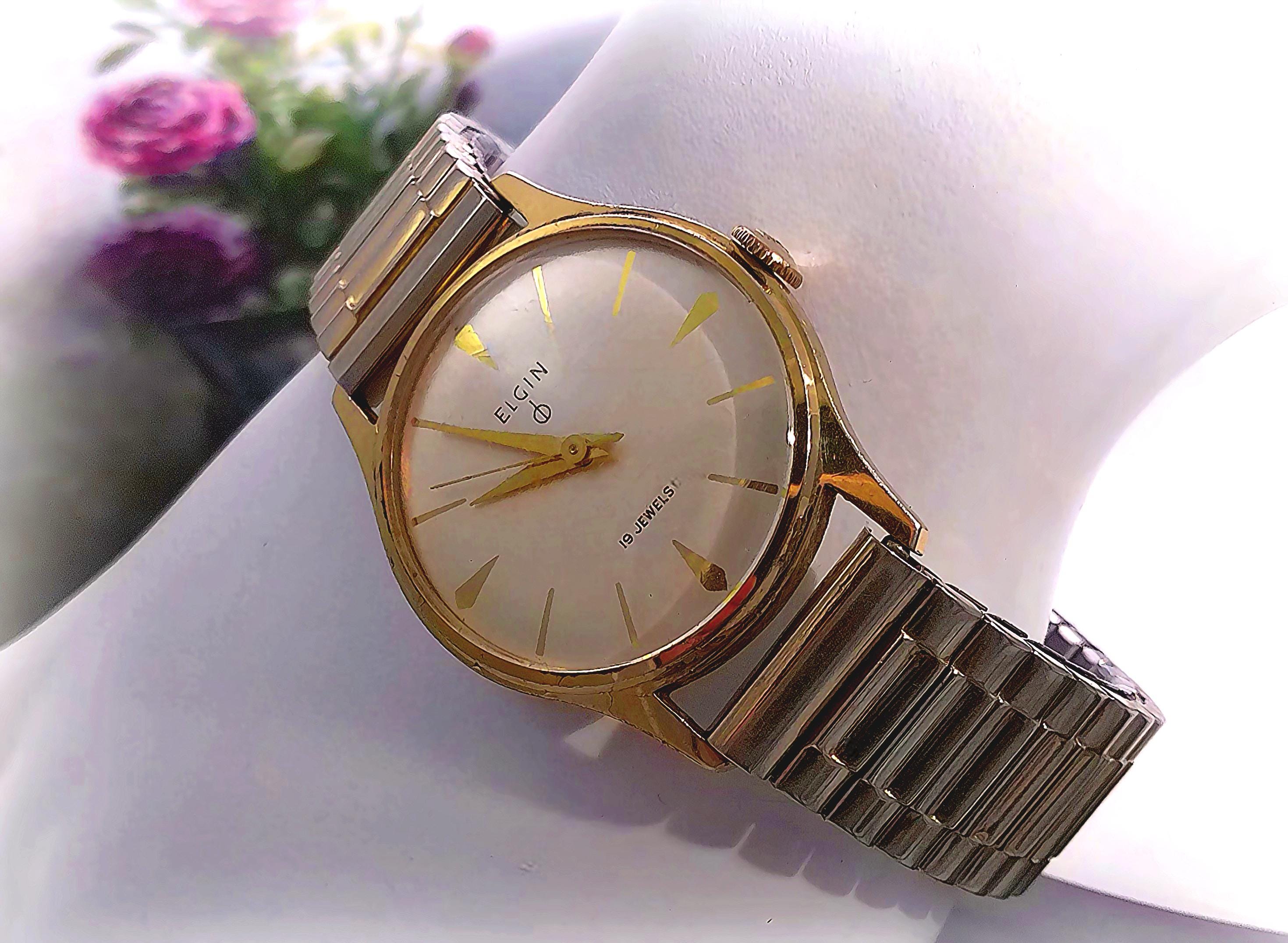 This Elgin Men’s Wrist Watch is an incredible find, with combined DuraBalance and 19 Jewel mechanics, that may be well-sought after by collectors. It truly is an exceptional watch, with its Mid-20th-century innovative American made free-sprung DuraBalance mechanism that rivaled the Swiss-made competitors of the time. Please note that the crystal has some minor vintage scuffing but does not deter from its handsome design nor function. An expandable band provides a comfortable custom fit. This is a mechanical watch that needs to be wound up. It is keeping good time and working smoothly.