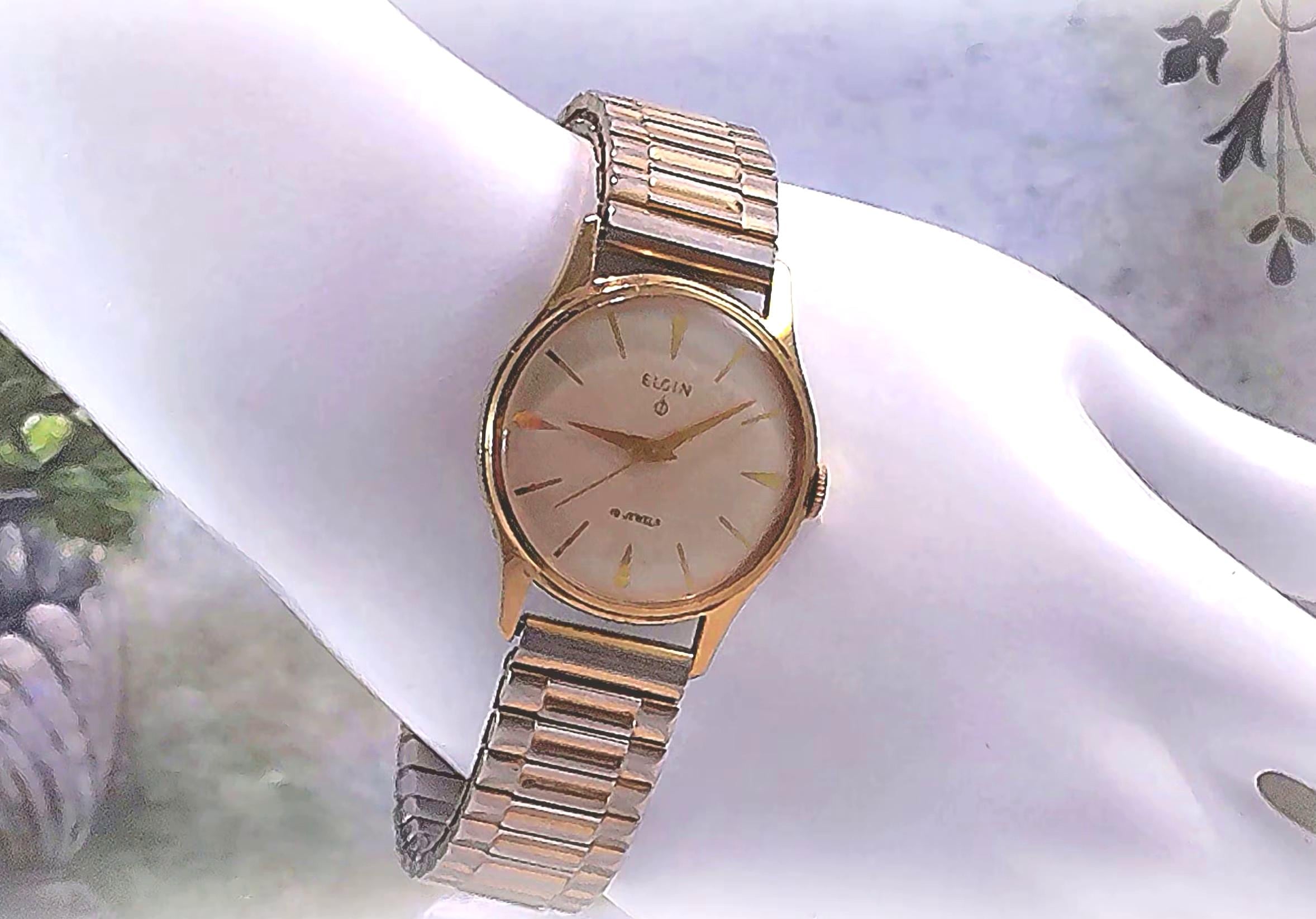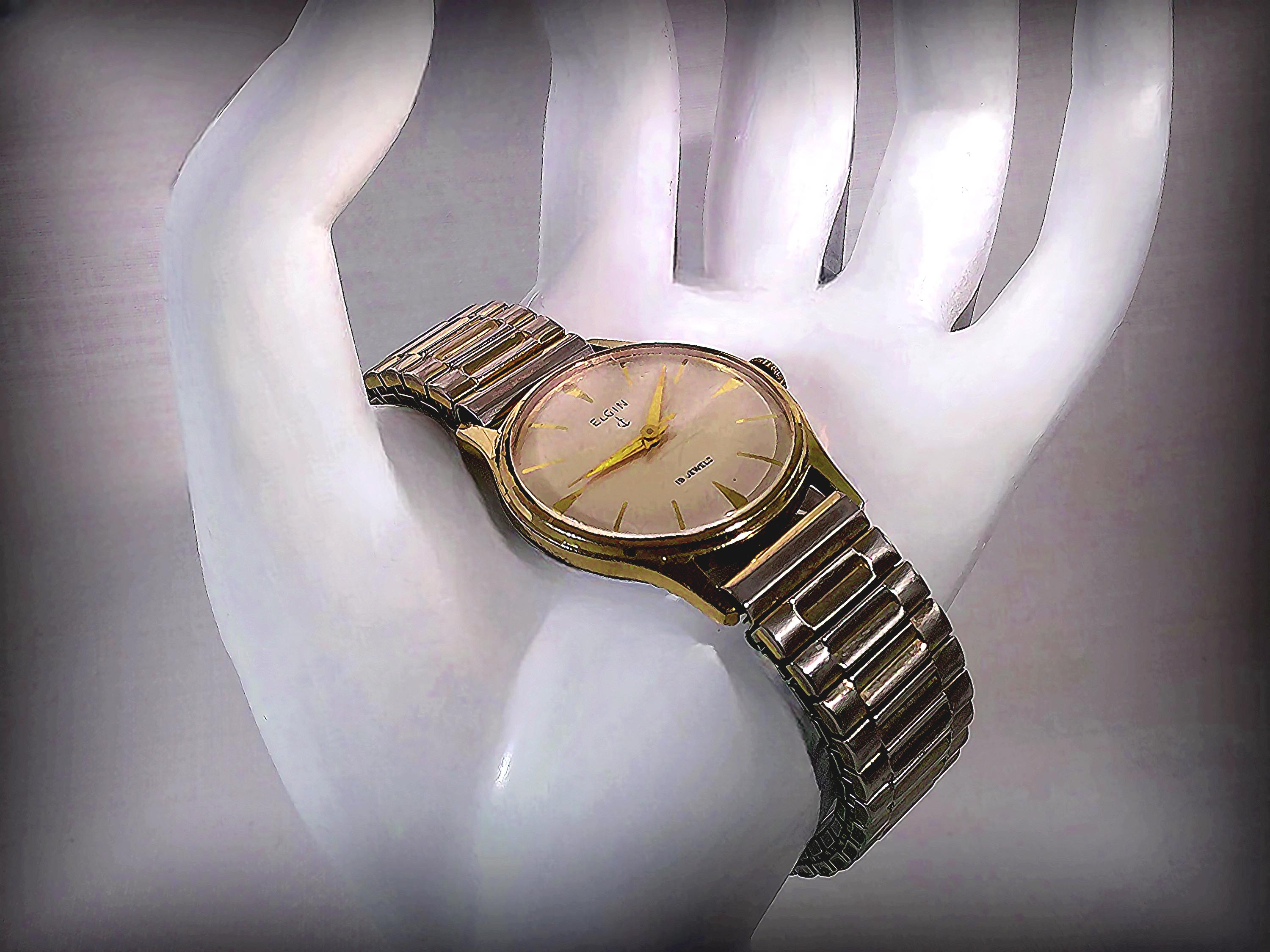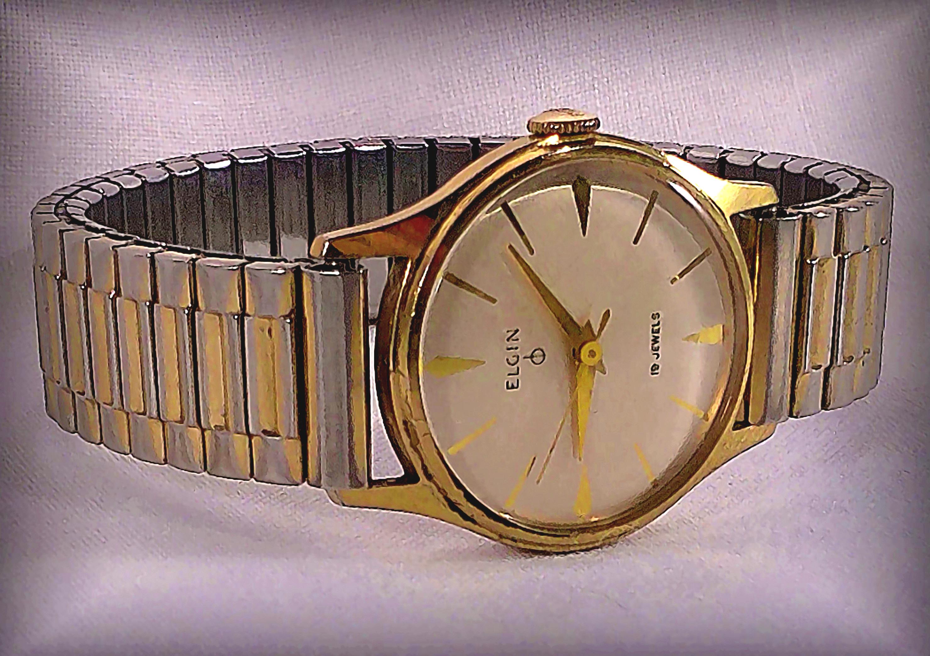 This Elgin Men’s Wrist Watch is an incredible find, with combined DuraBalance and 19 Jewel mechanics, that may be well-sought after by collectors. It truly is an exceptional watch, with its Mid-20th-century innovative American made free-sprung DuraBalance mechanism that rivaled the Swiss-made competitors of the time. Please note that the crystal has some minor vintage scuffing but does not deter from its handsome design nor function. An expandable band provides a comfortable custom fit. This is a mechanical watch that needs to be wound up. It is keeping good time and working smoothly.