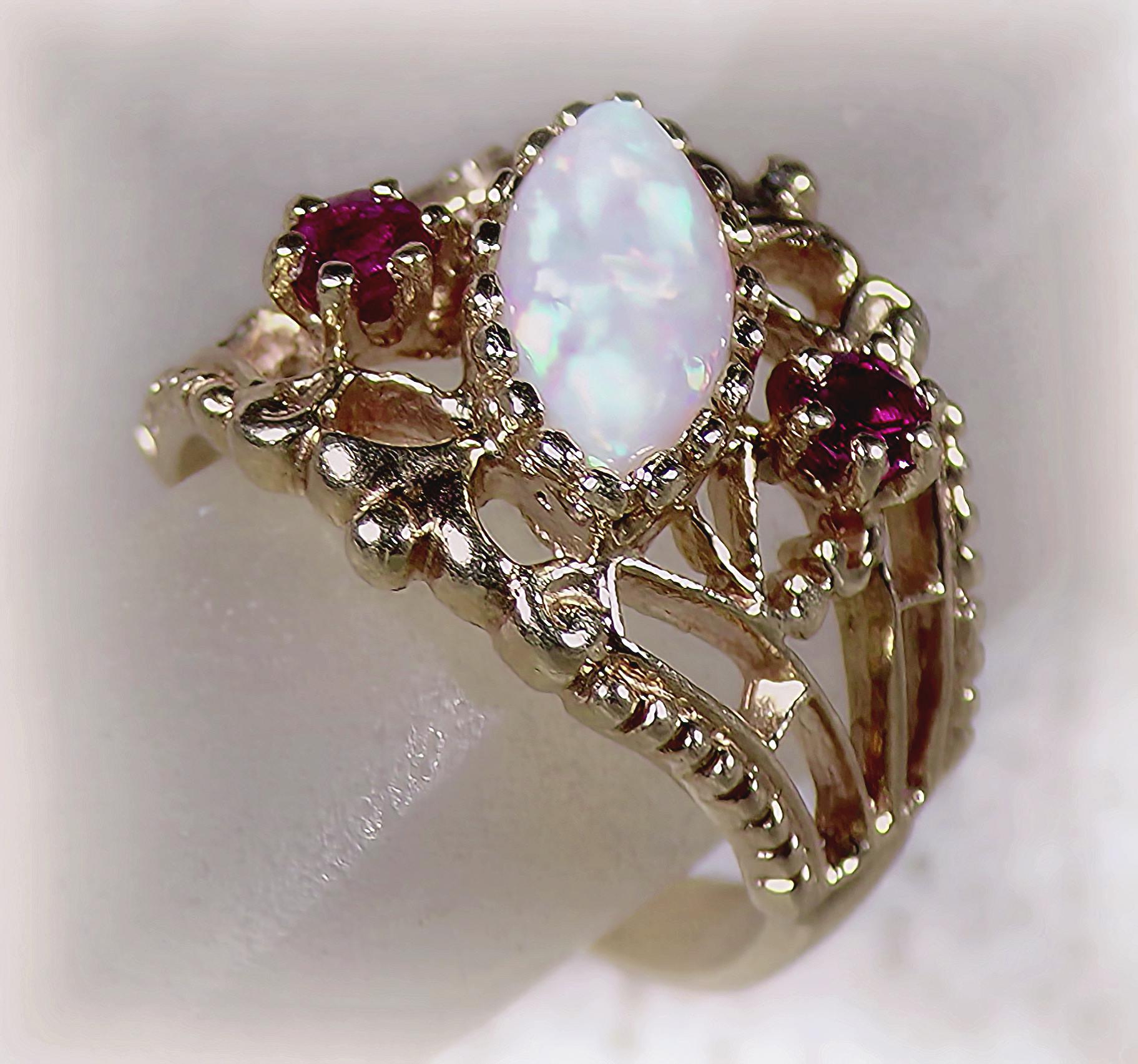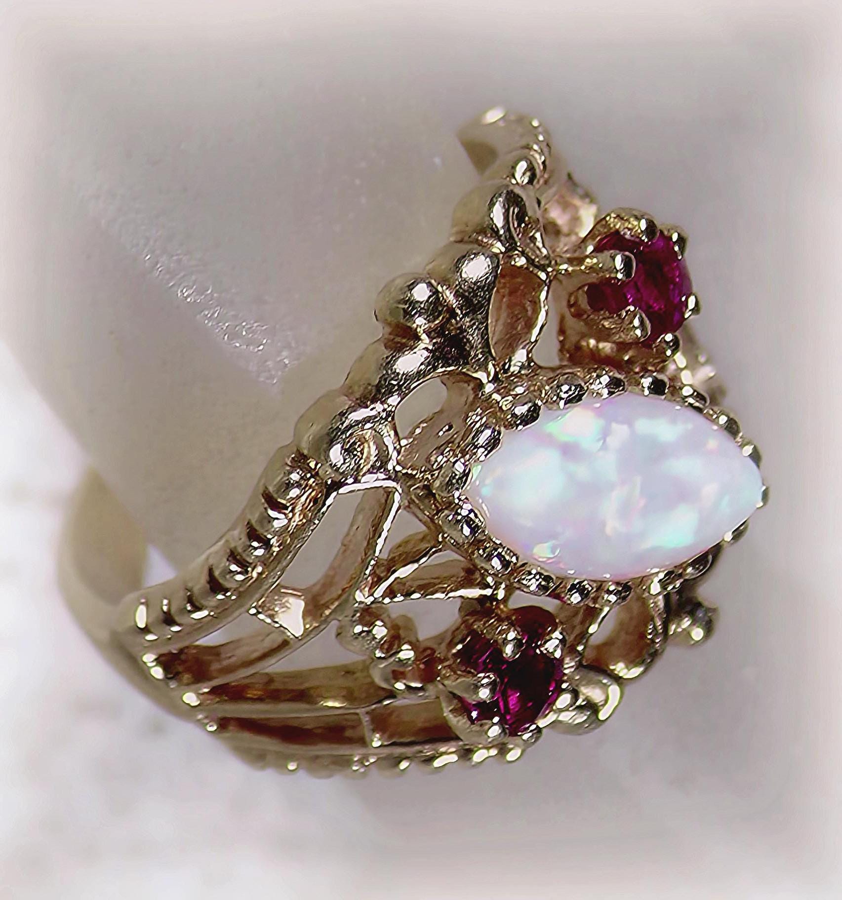 • Gemstones are: 1 Marquise Cabochon Australian Opal and 2 Round Cut Faceted Rubies