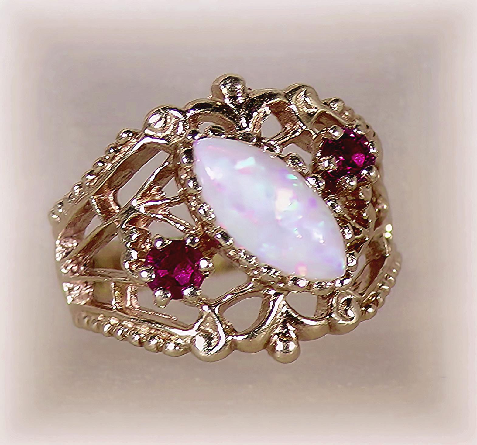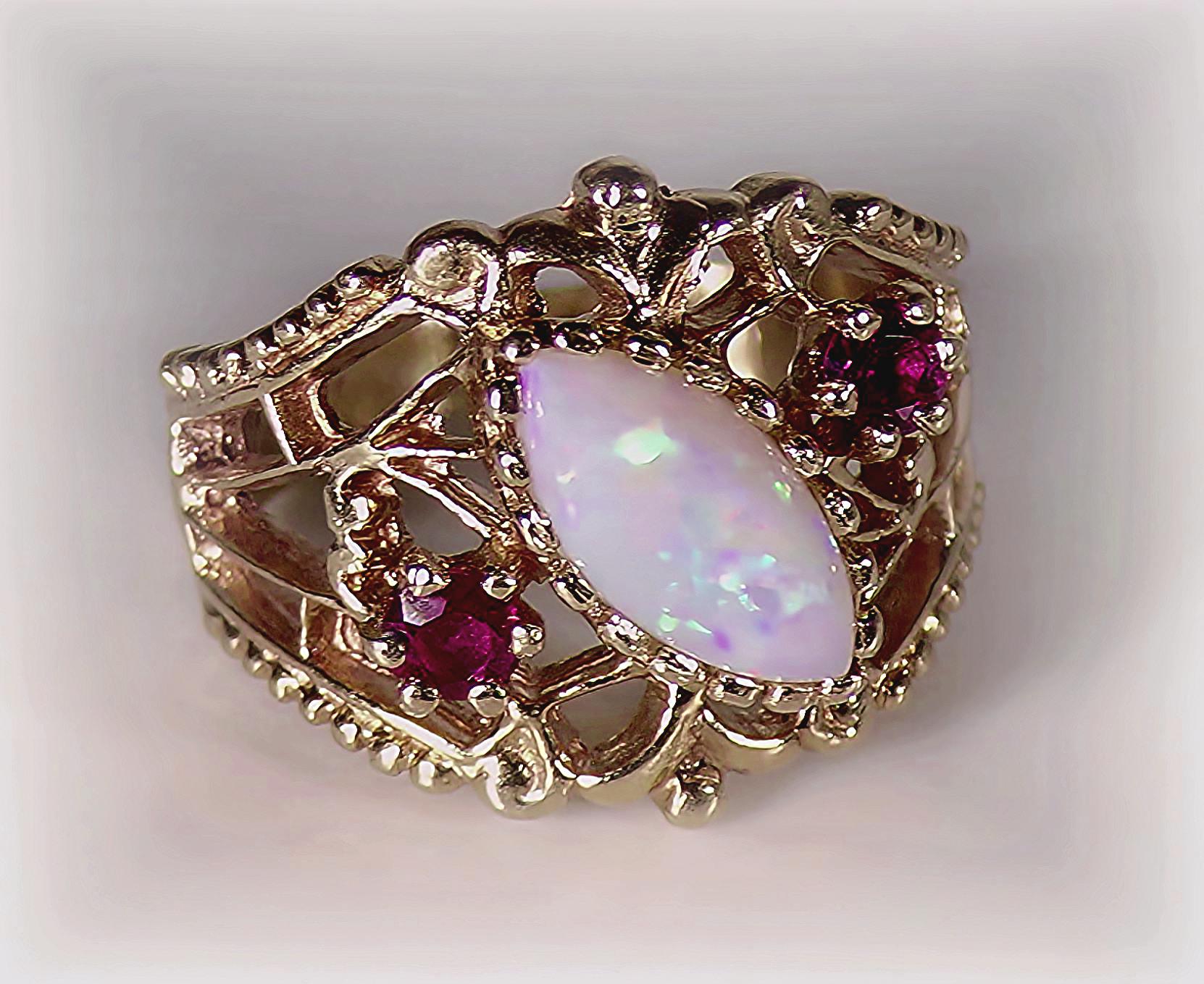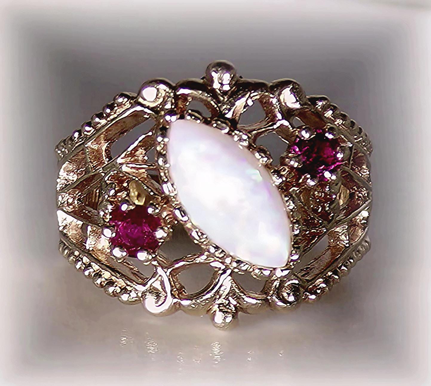 14K Yellow Gold Marquise Australian Opal with 2 Ruby Accents Filigree Ring - Size 5.75 - Free Sizing!!