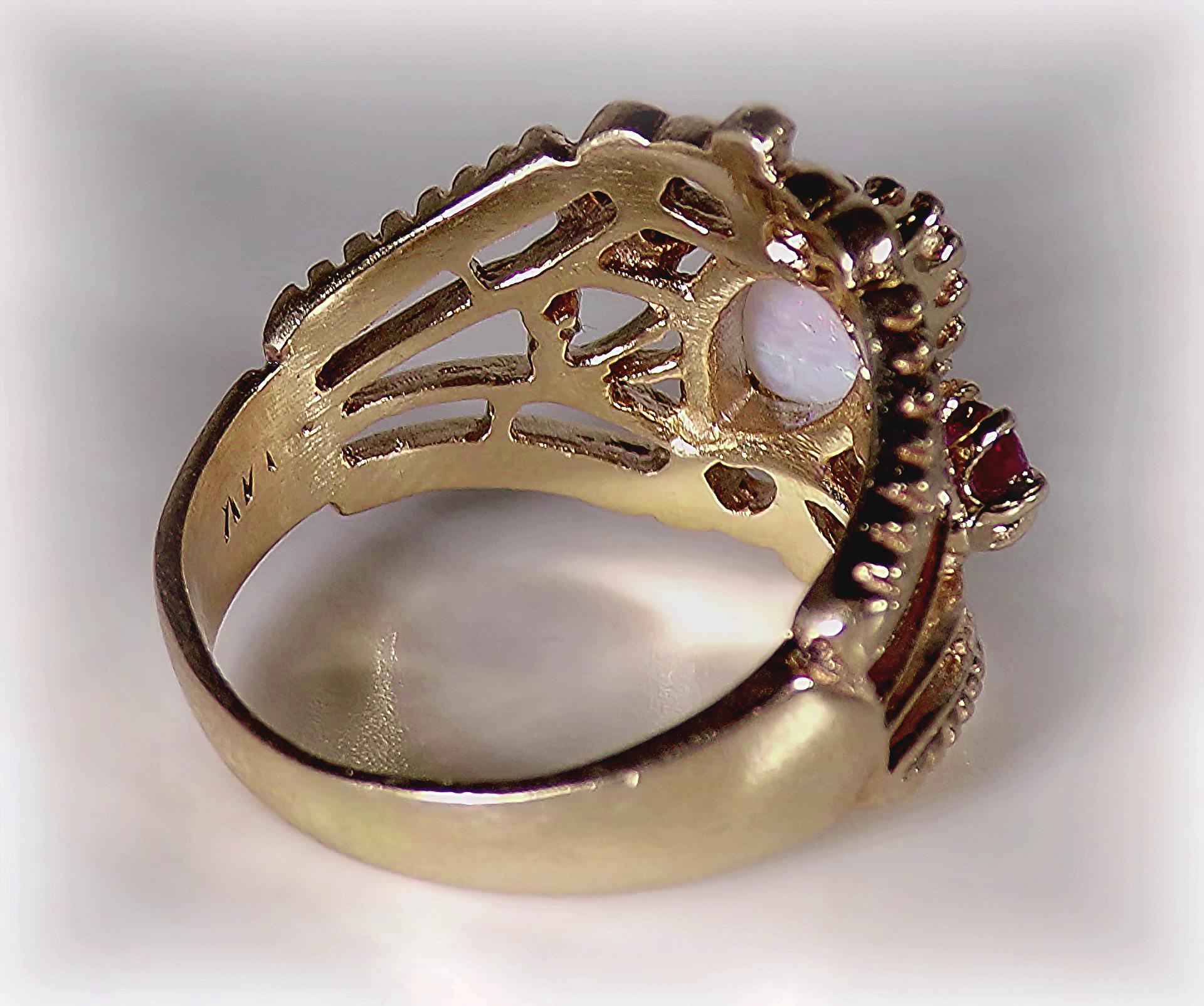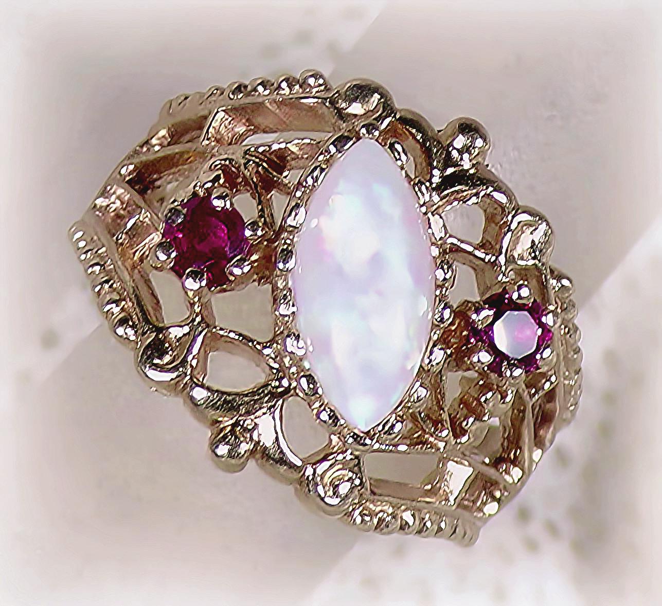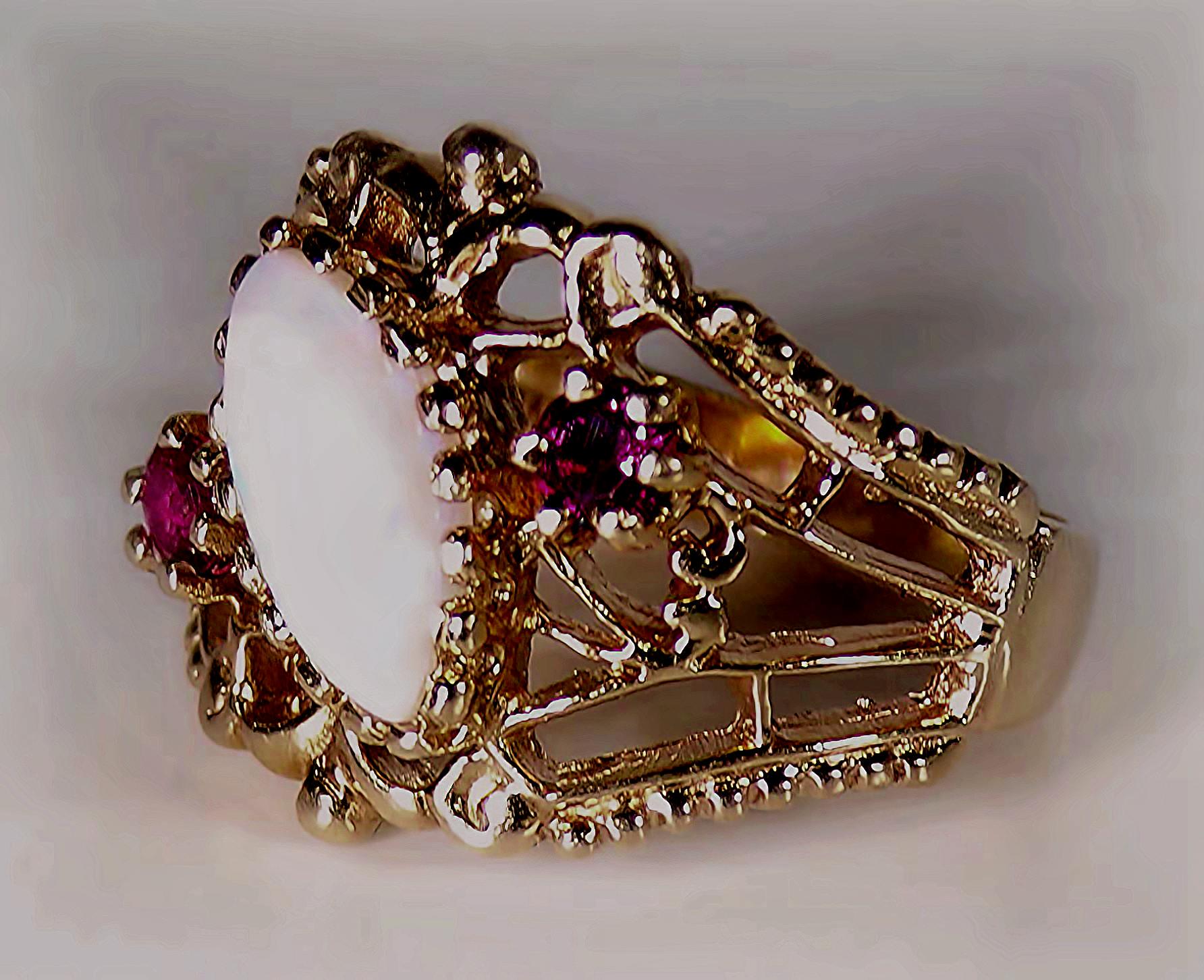 14K Yellow Gold Marquise Australian Opal with 2 Ruby Accents Filigree Ring - Size 5.75 - Free Sizing!!