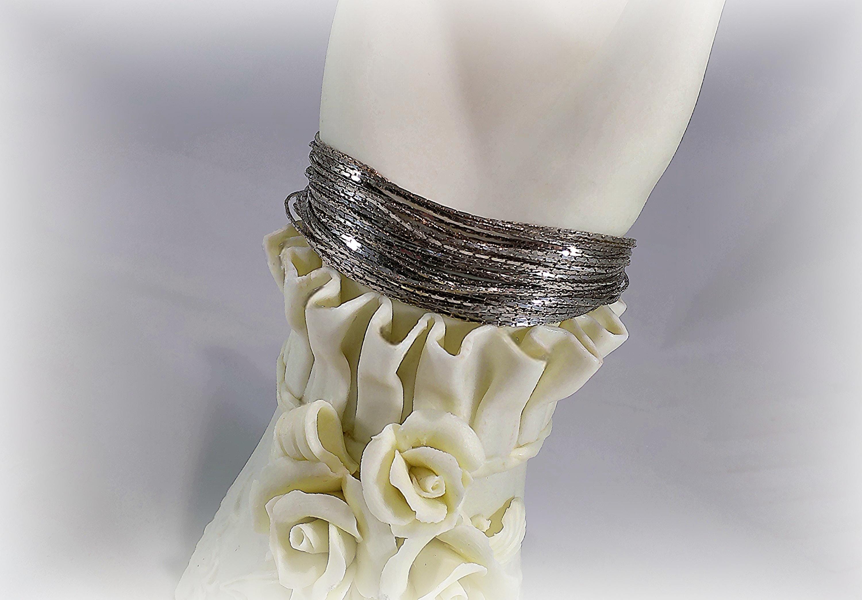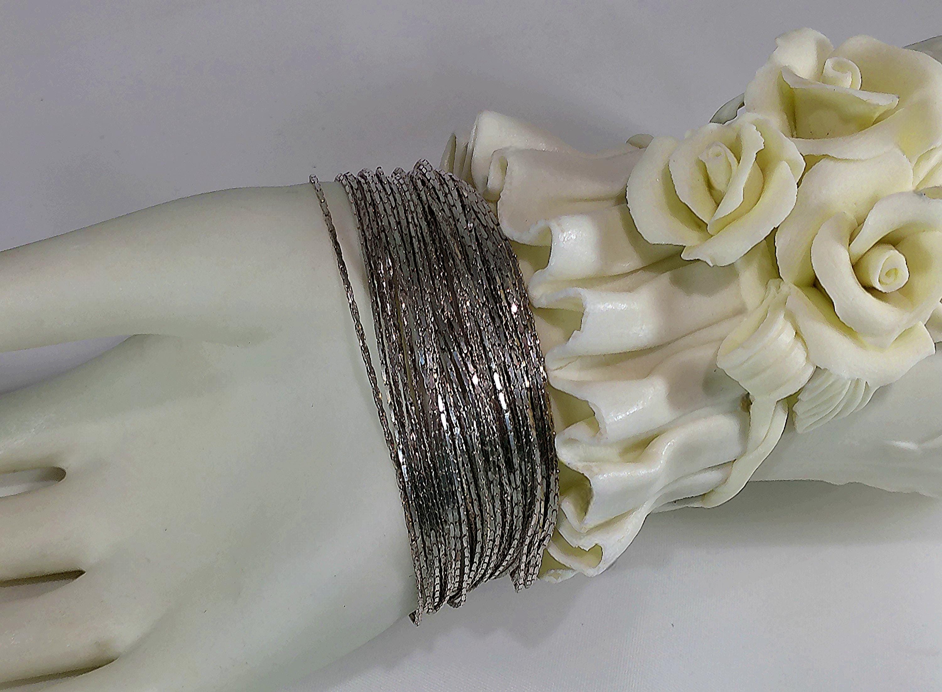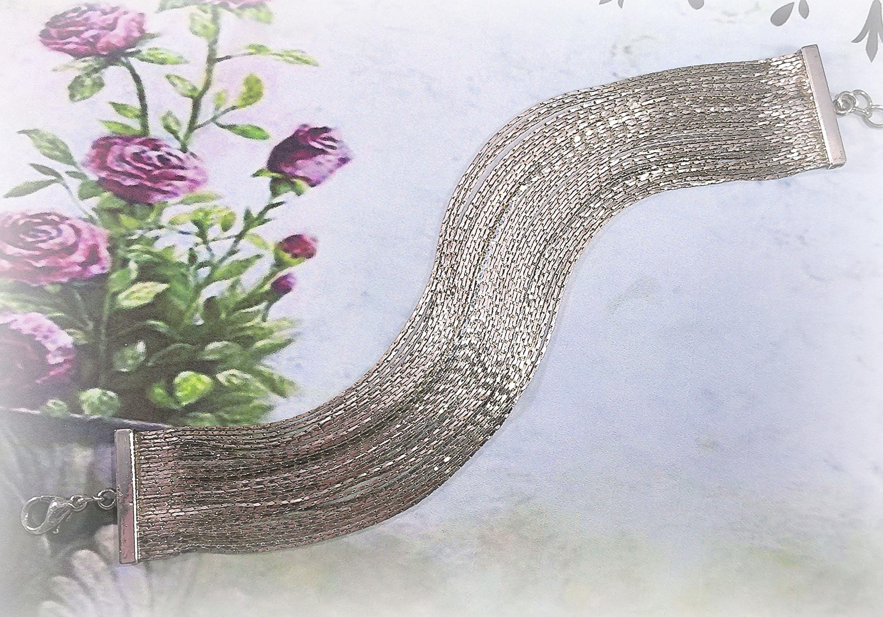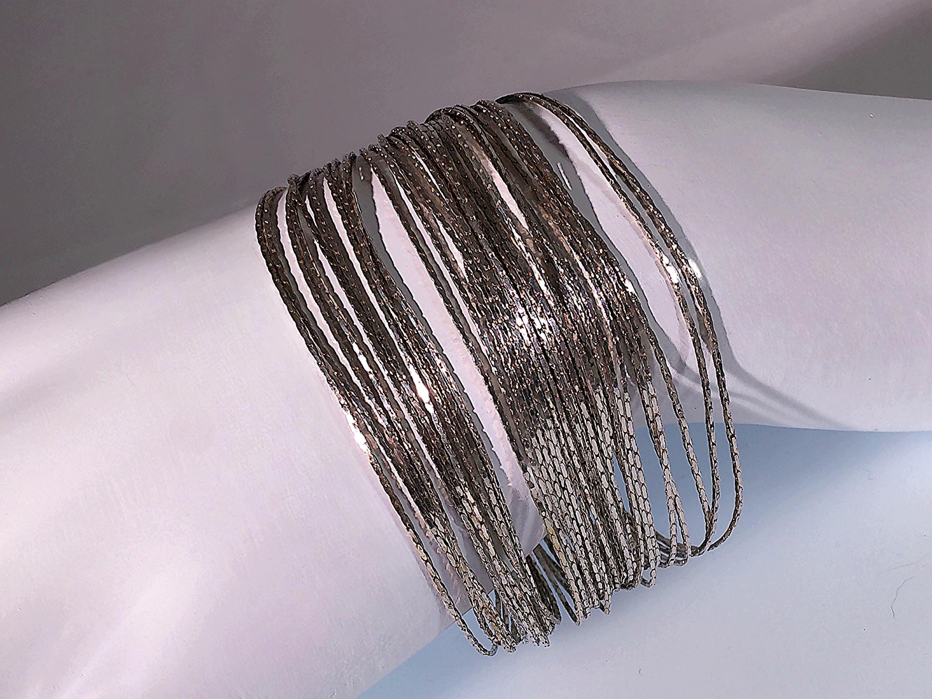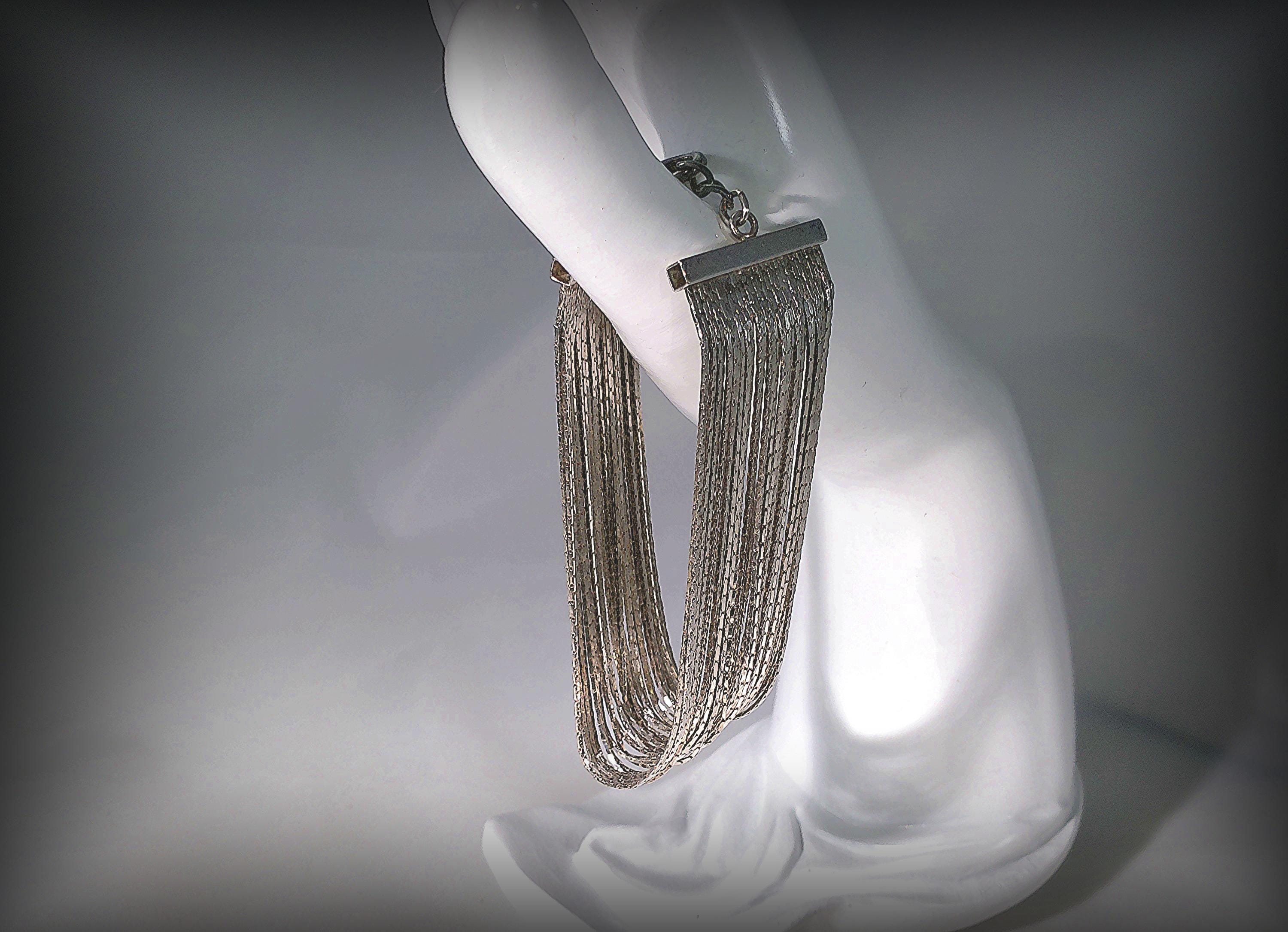 This Women's Sterling Silver Multi Strand Bracelet has 32 shimmering strands to capture the light. Flat bars allow the minute link strands on this bracelet to lay beautifully upon the wrist. Whether the strands clump together or separate into individual strands, it lends ever-changing visual interest that is a delight to wear!