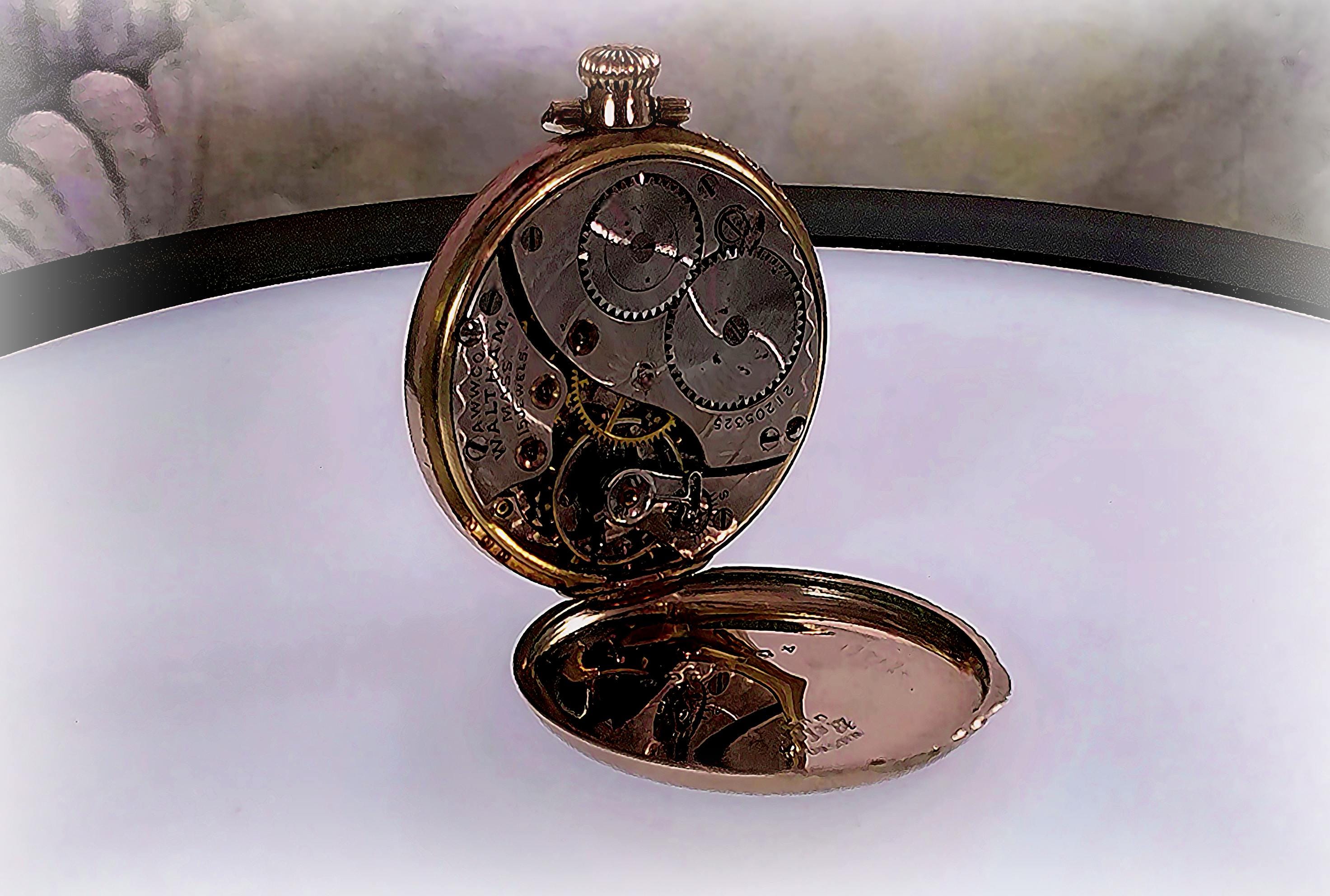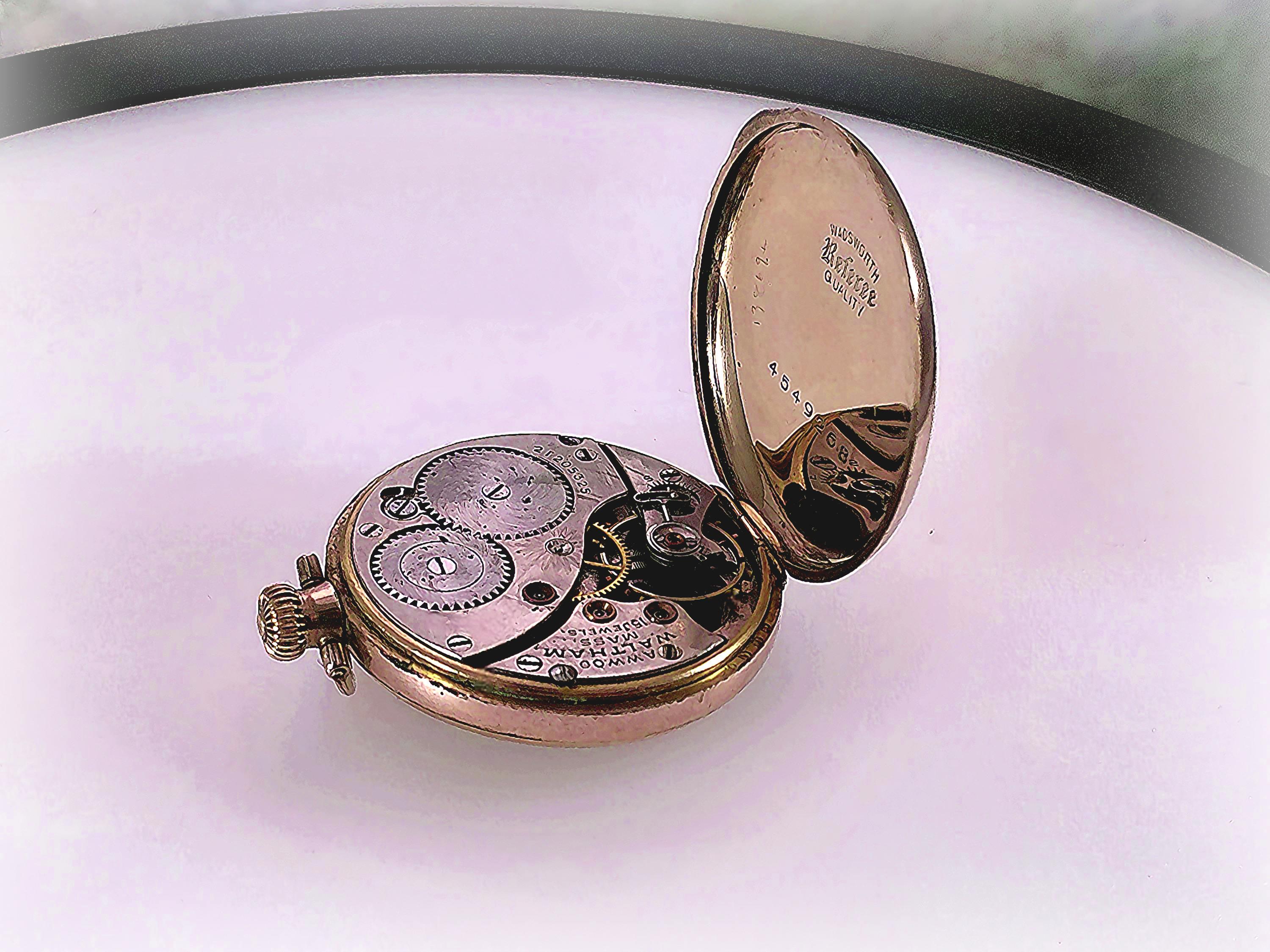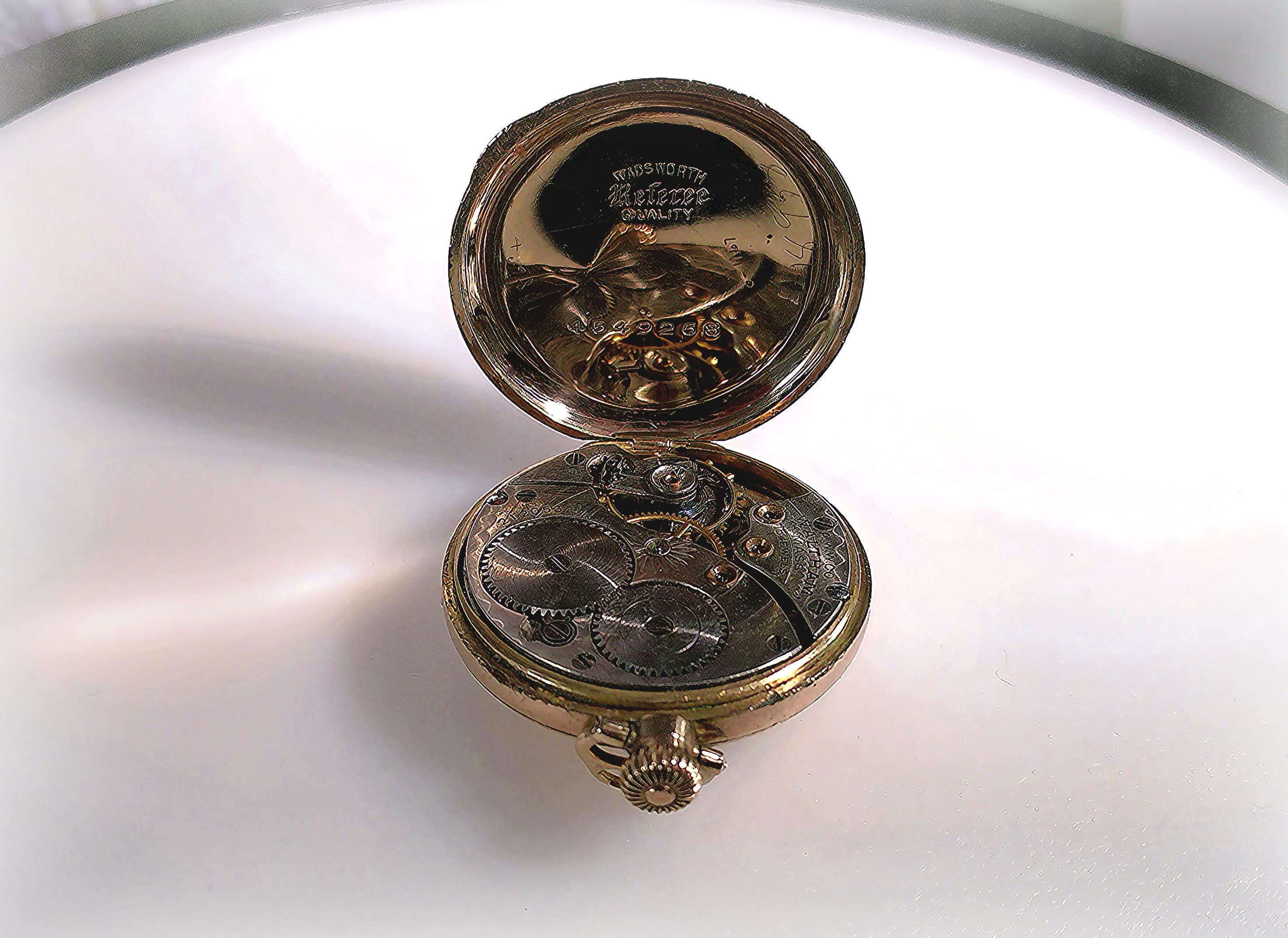 This is lovely Waltham “Referee Quality” Pocket Watch in a Wadsworth Gold Filled case and possesses over a century of stories and secrets. To add a little mystery and intrigue, aside from the professional hallmark engravings, the inside of this pocket watch has multiple personal markings inscribed in the gold by prior owner(s). These markings are a historical account of who serviced the watch and when. Perhaps a treasure hunt is in order, or at the very least a topic of interesting and speculative conversation at your next dinner party. The watch repairman could be a noted and well-known watchman... one never knows...In any case, ownership of this pocket watch involves a legacy of unique and one-of-a-kind history.