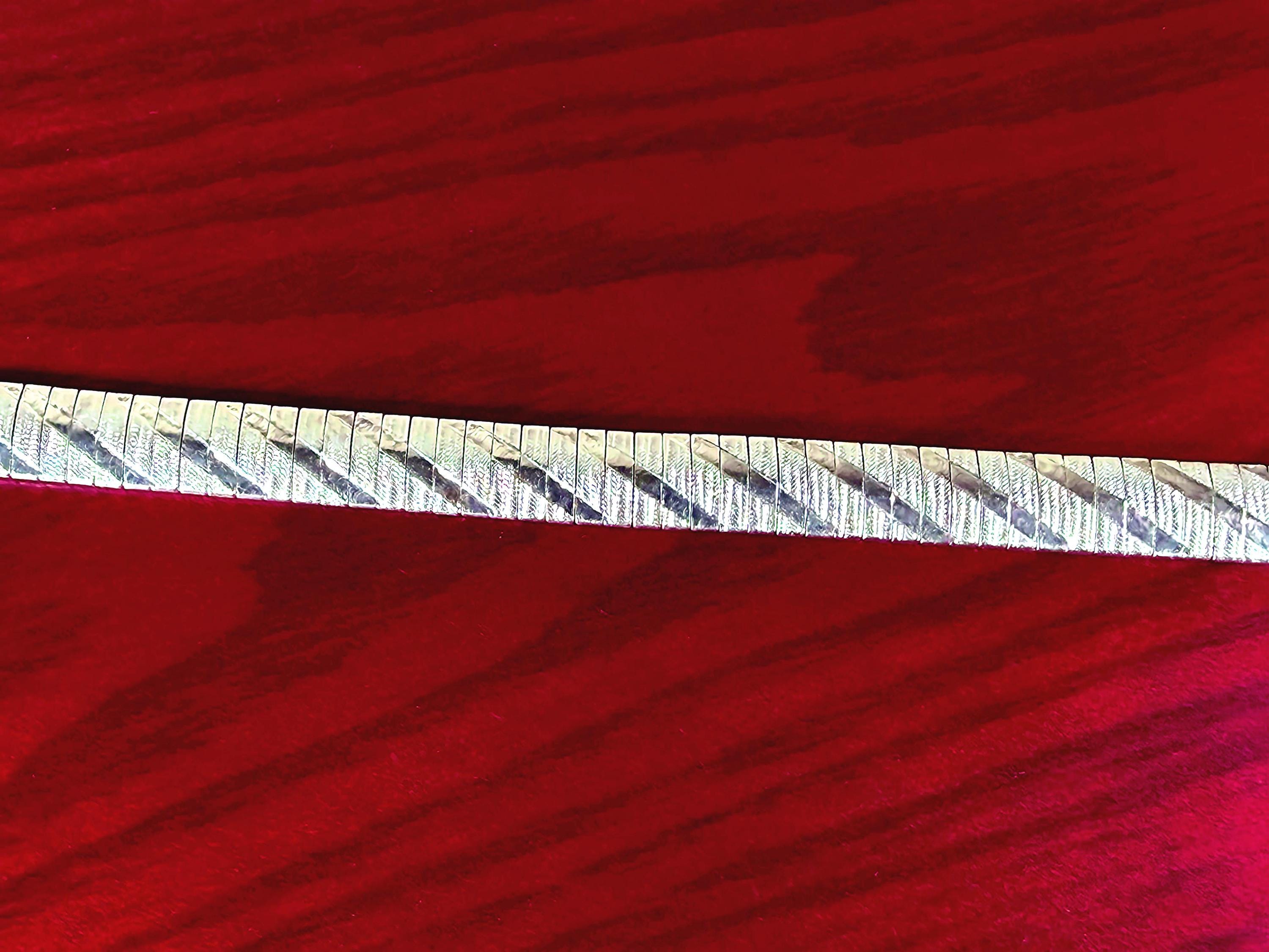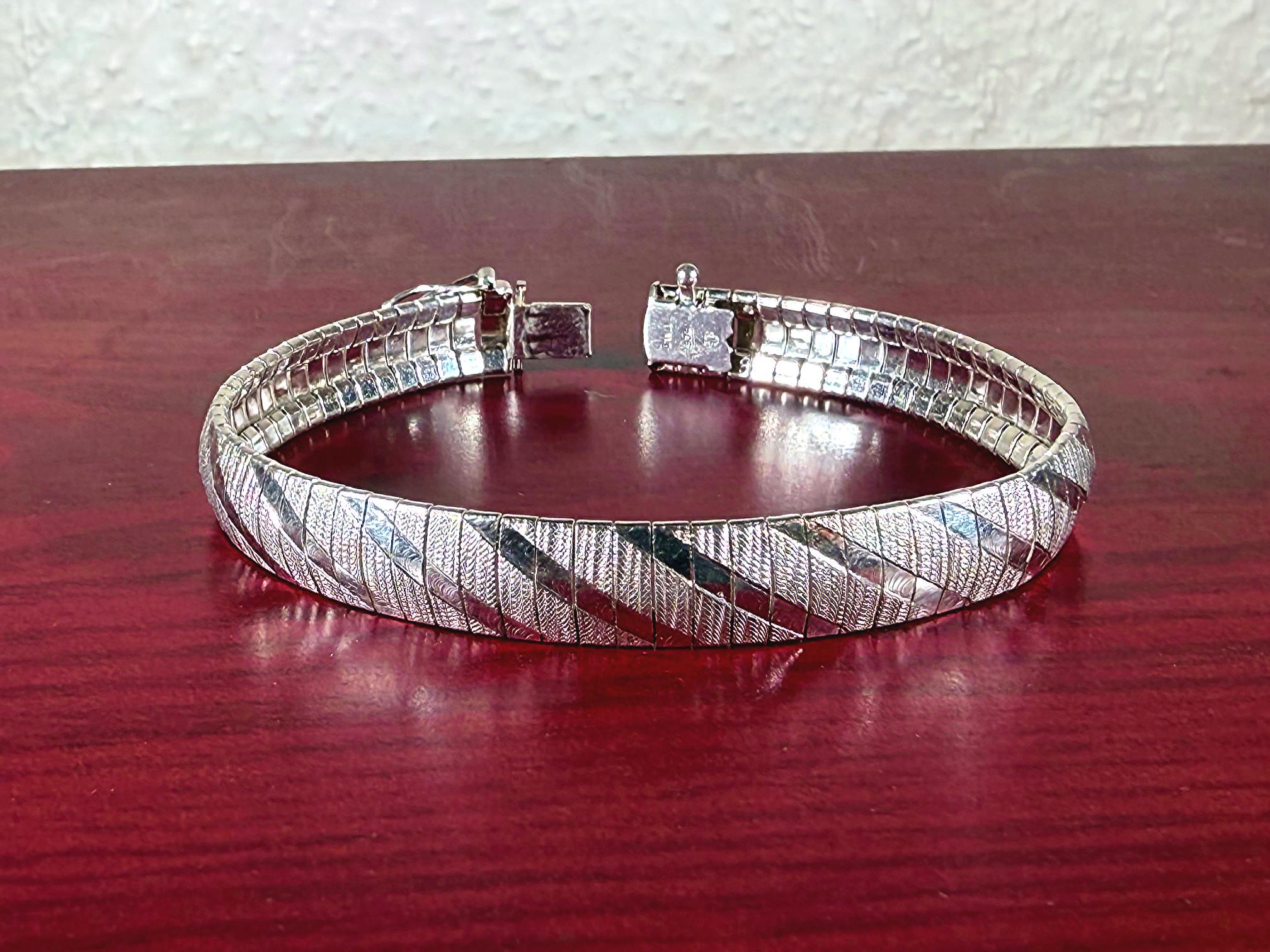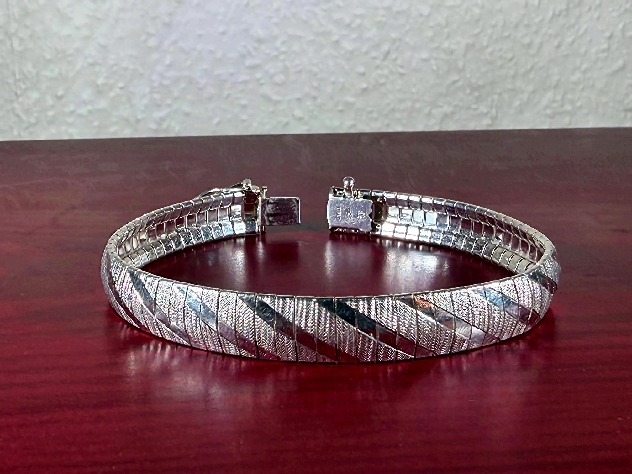 This is a beautiful 925 Sterling Silver Bracelet with uniform textured Omega links, and a contrasting shiny diagonal design crafted by the International Bullion & Metal Brokers of Italy. The Omega is crafted to lie unobtrusively upon the wrist, and this one is perfect as its own focal point or combined with multiple bangles. This exquisite bracelet is a prime example of why the Italian IBB is known for the integrity of their precious metals and quality craftsmanship.