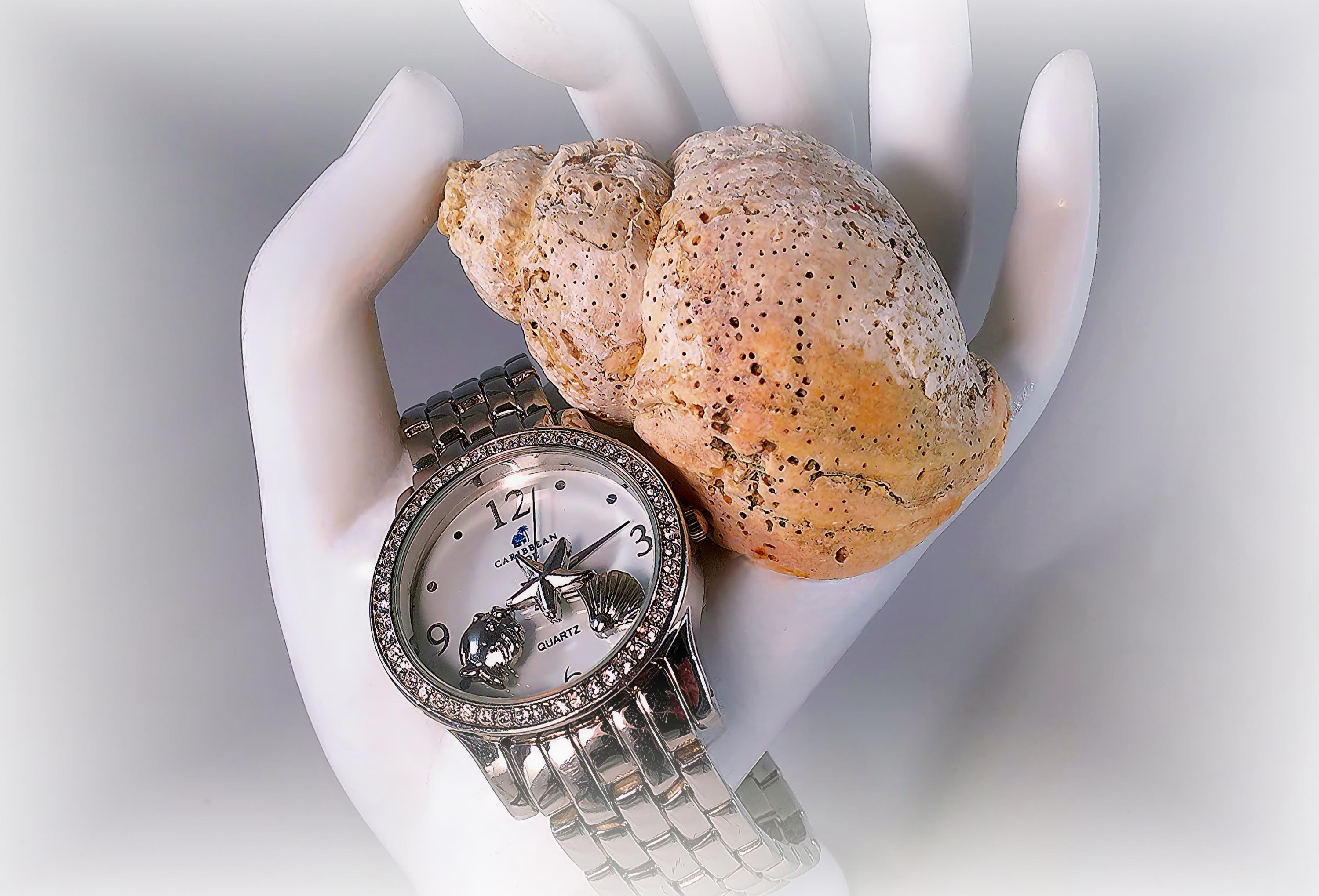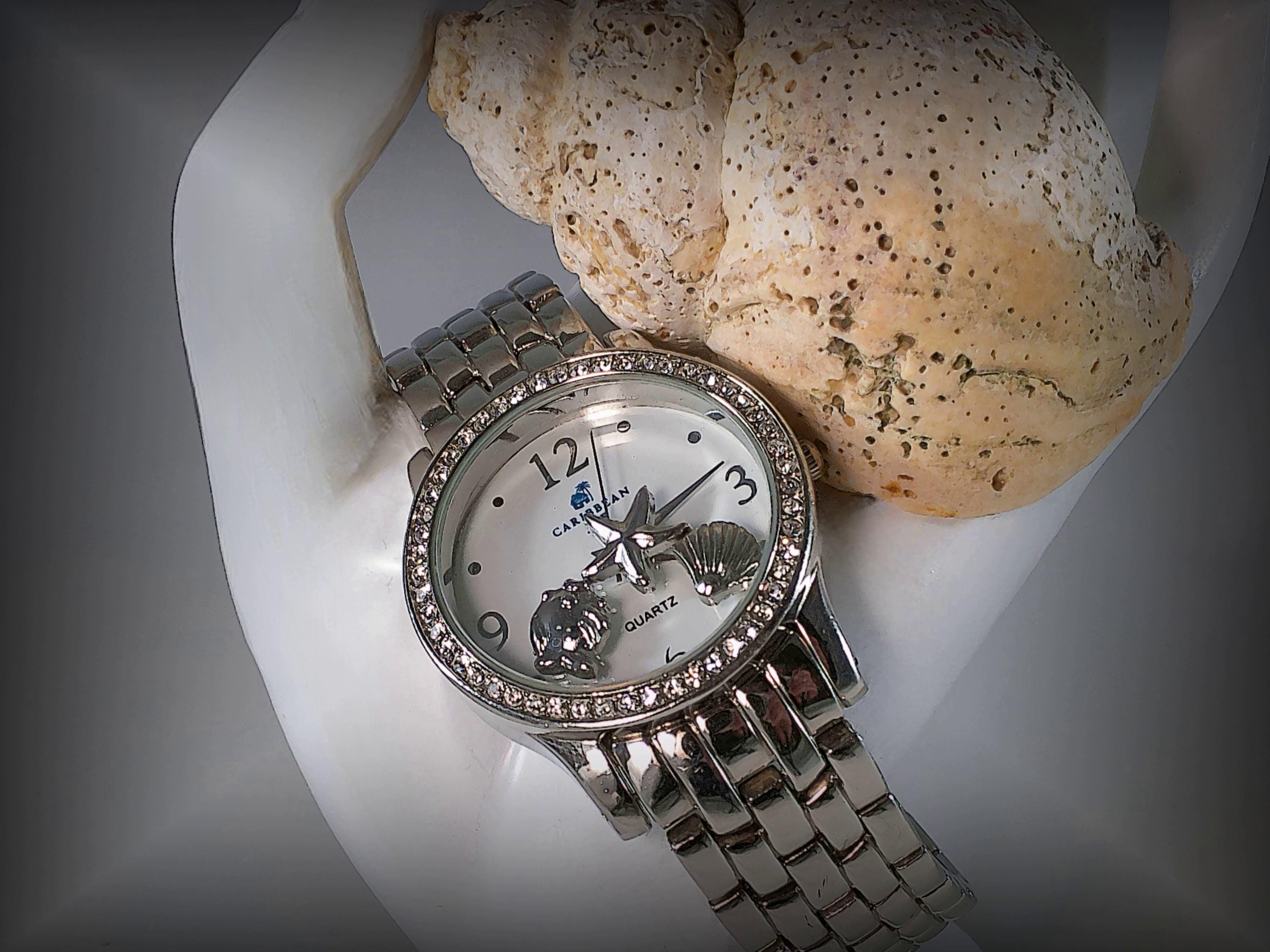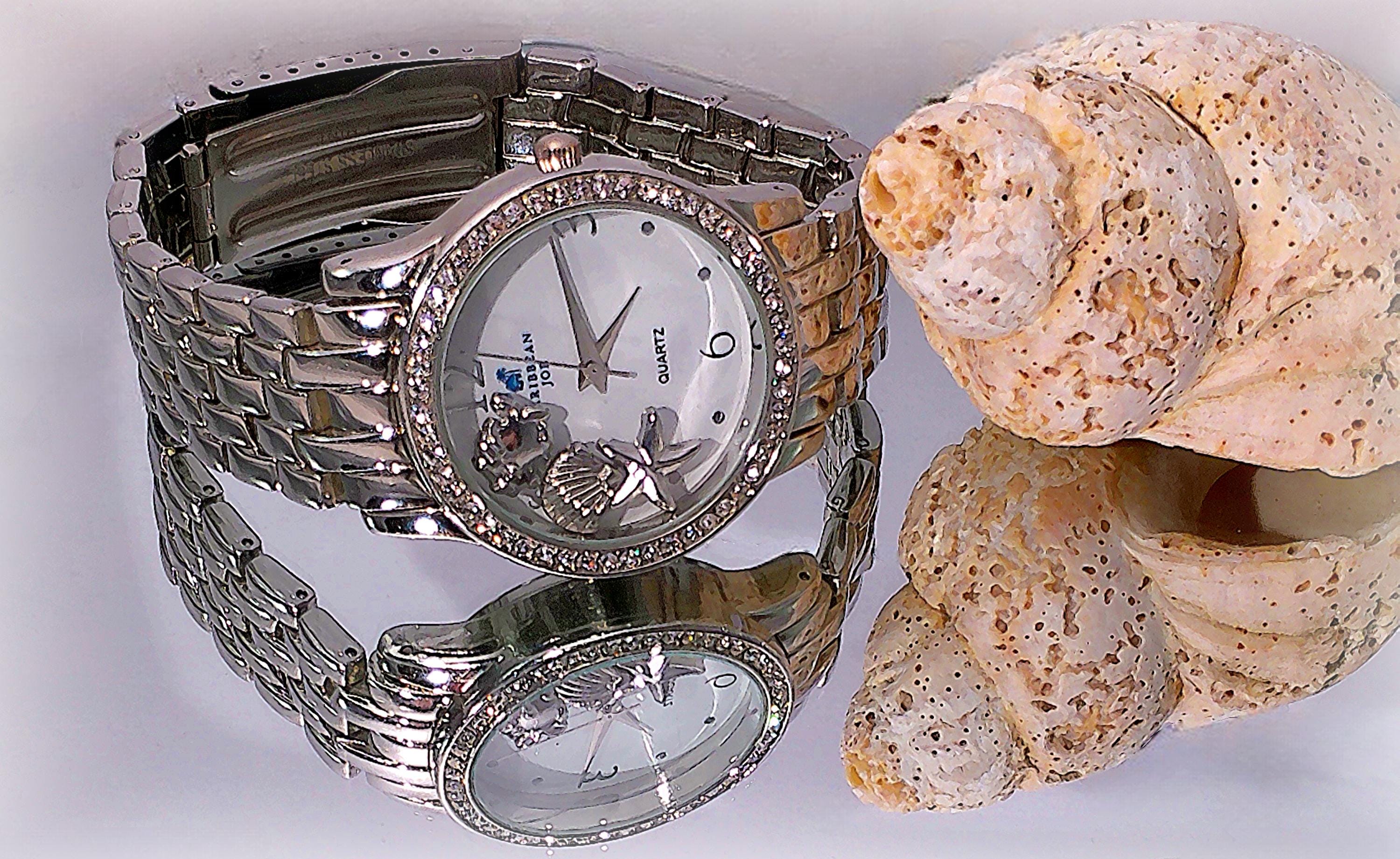 This dramatic oversized Women’s Watch is uniquely detailed with freely encased Seashore charms within the crystal, surrounded by sparkling Rhinestones. Whether representation of timeless fun-loving appreciation for the beach or a reminder of fond Seashore memories, this watch is truly special.