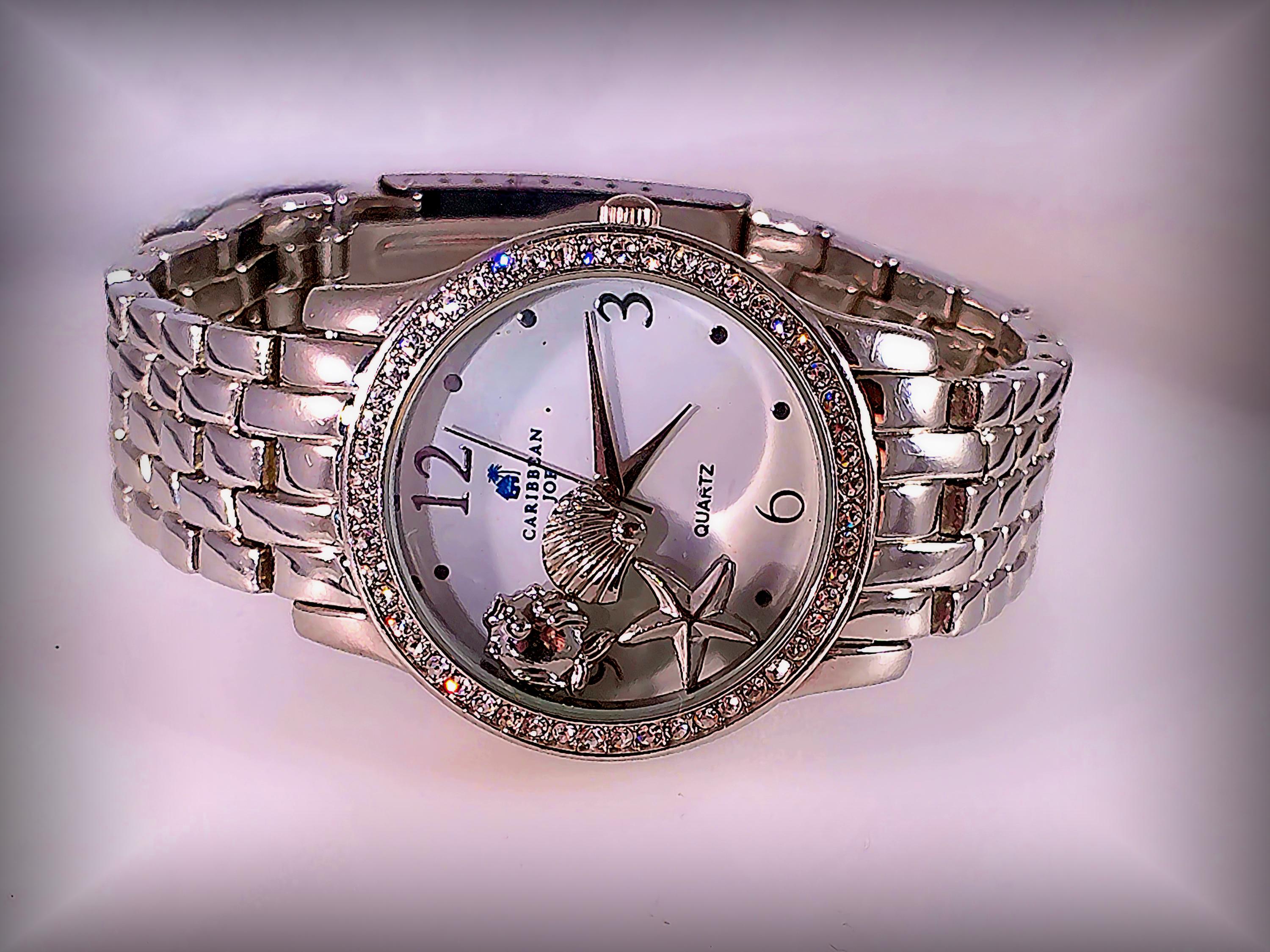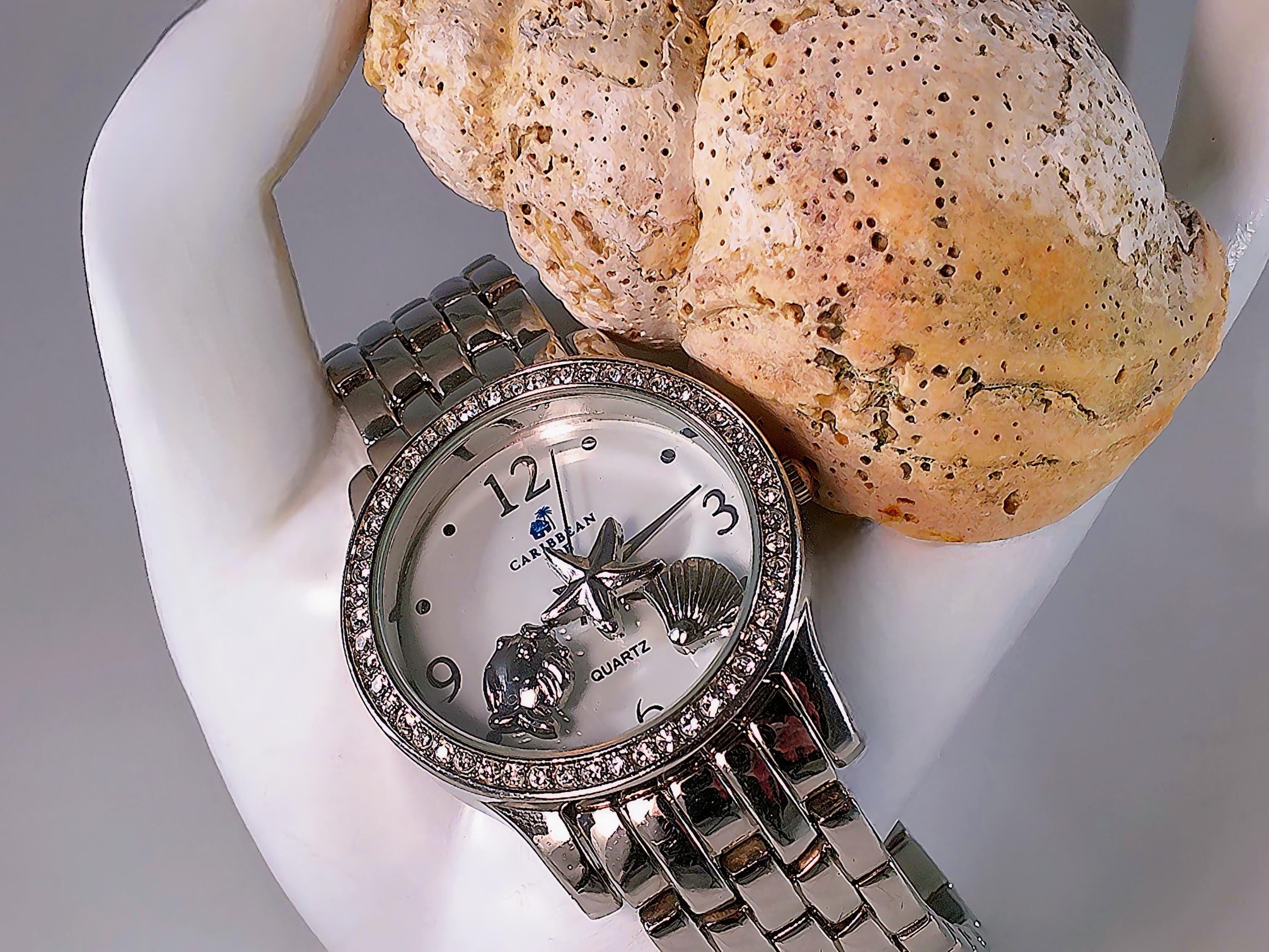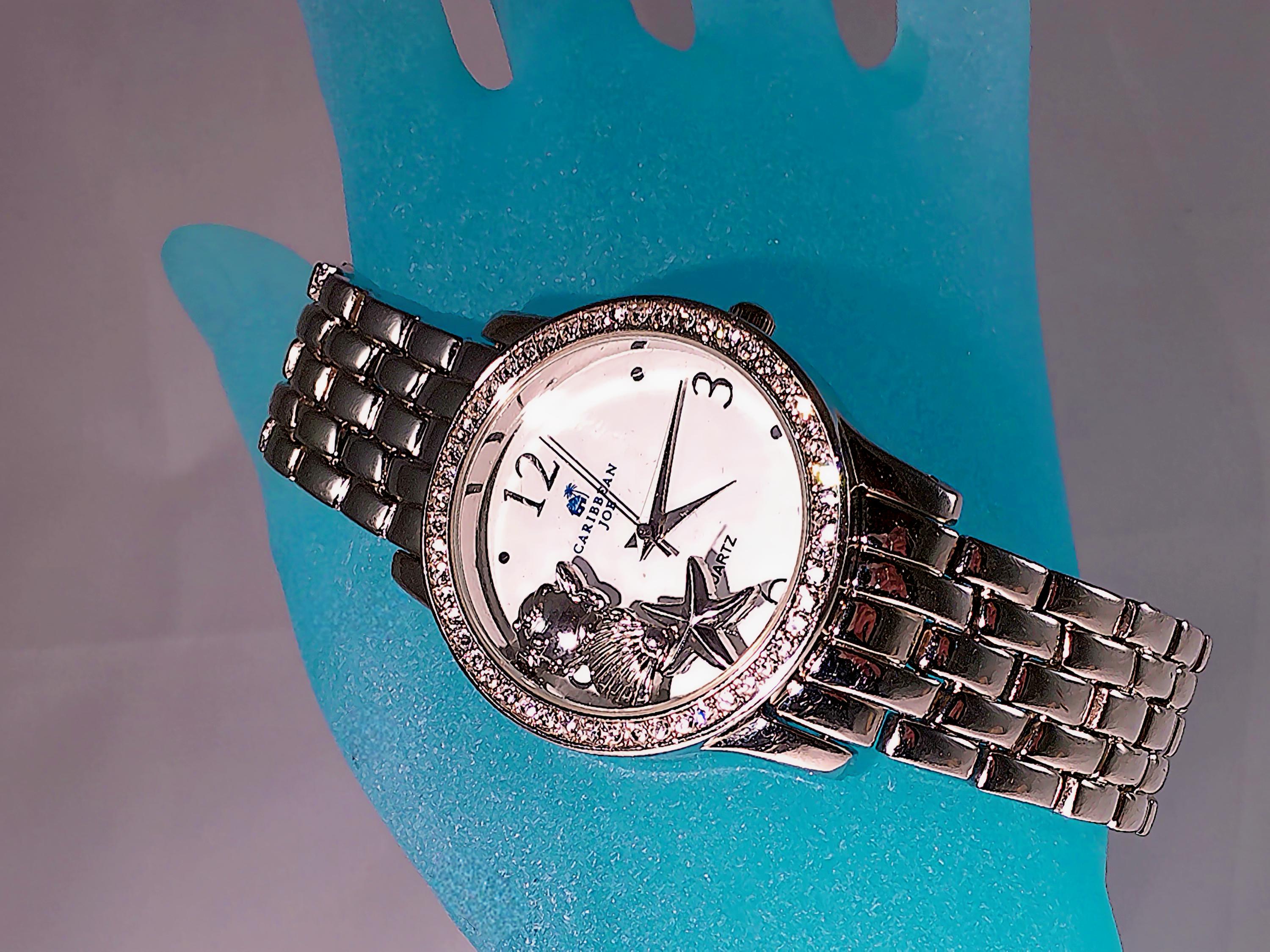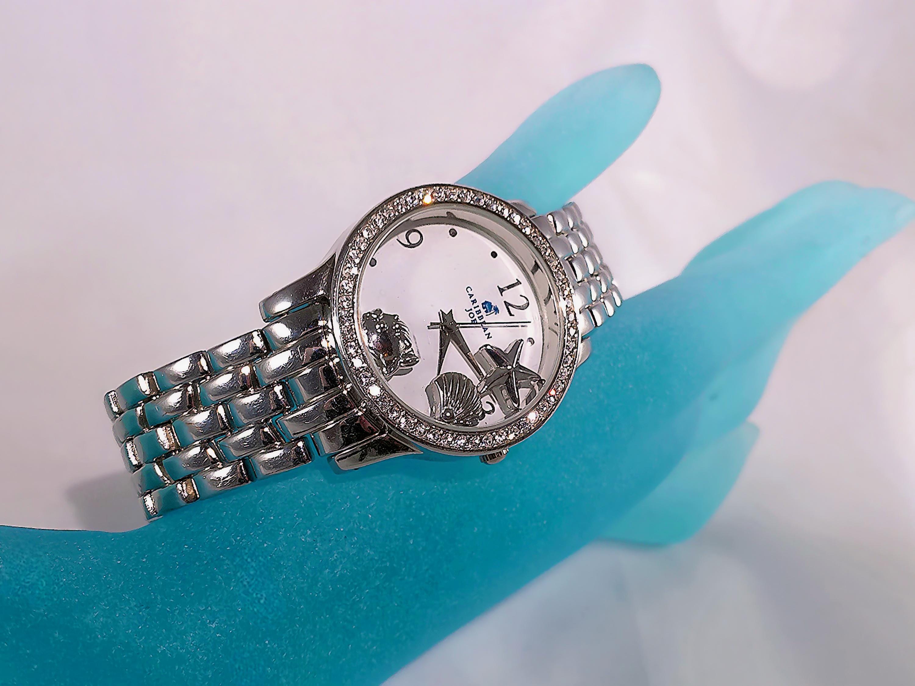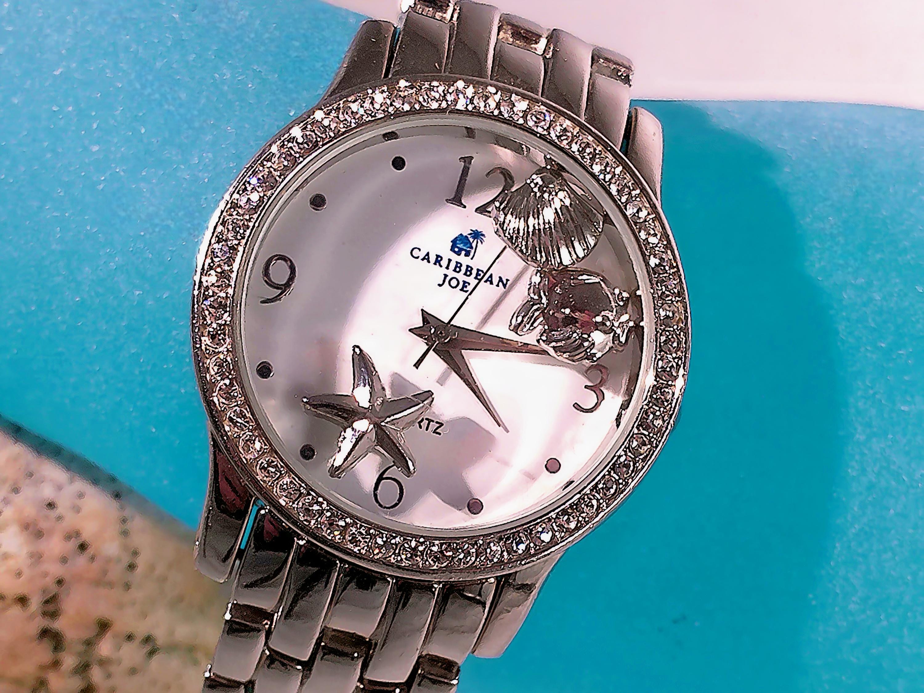 Women’s Caribbean Joe Beach Theme Watch with Sea Shore Charms – Rhinestones – 5 Link Stainless Steel Silver Band - Vintage