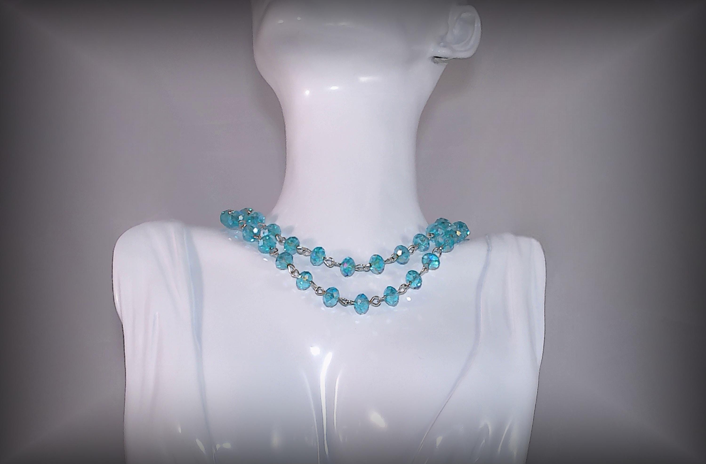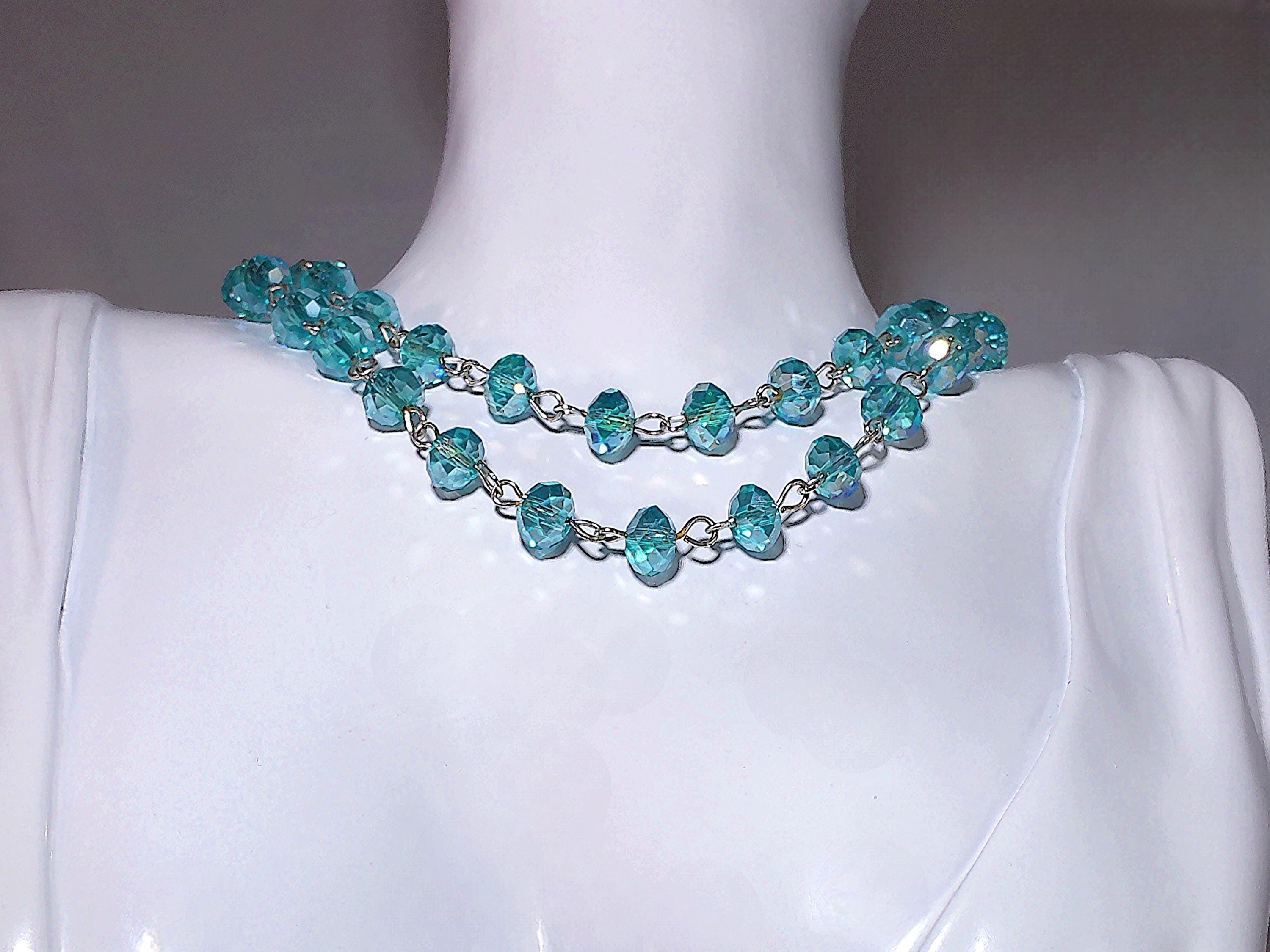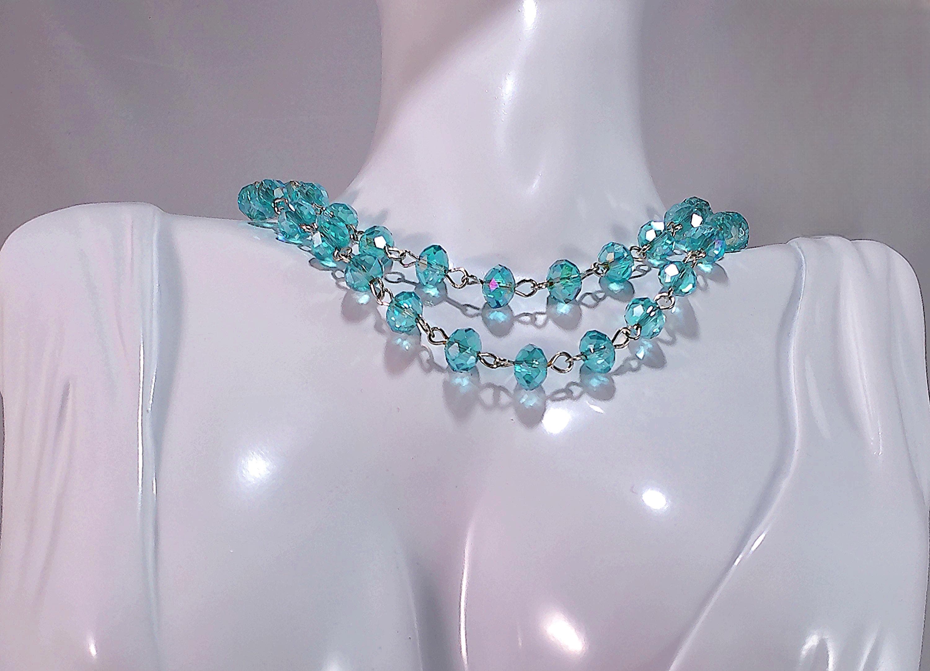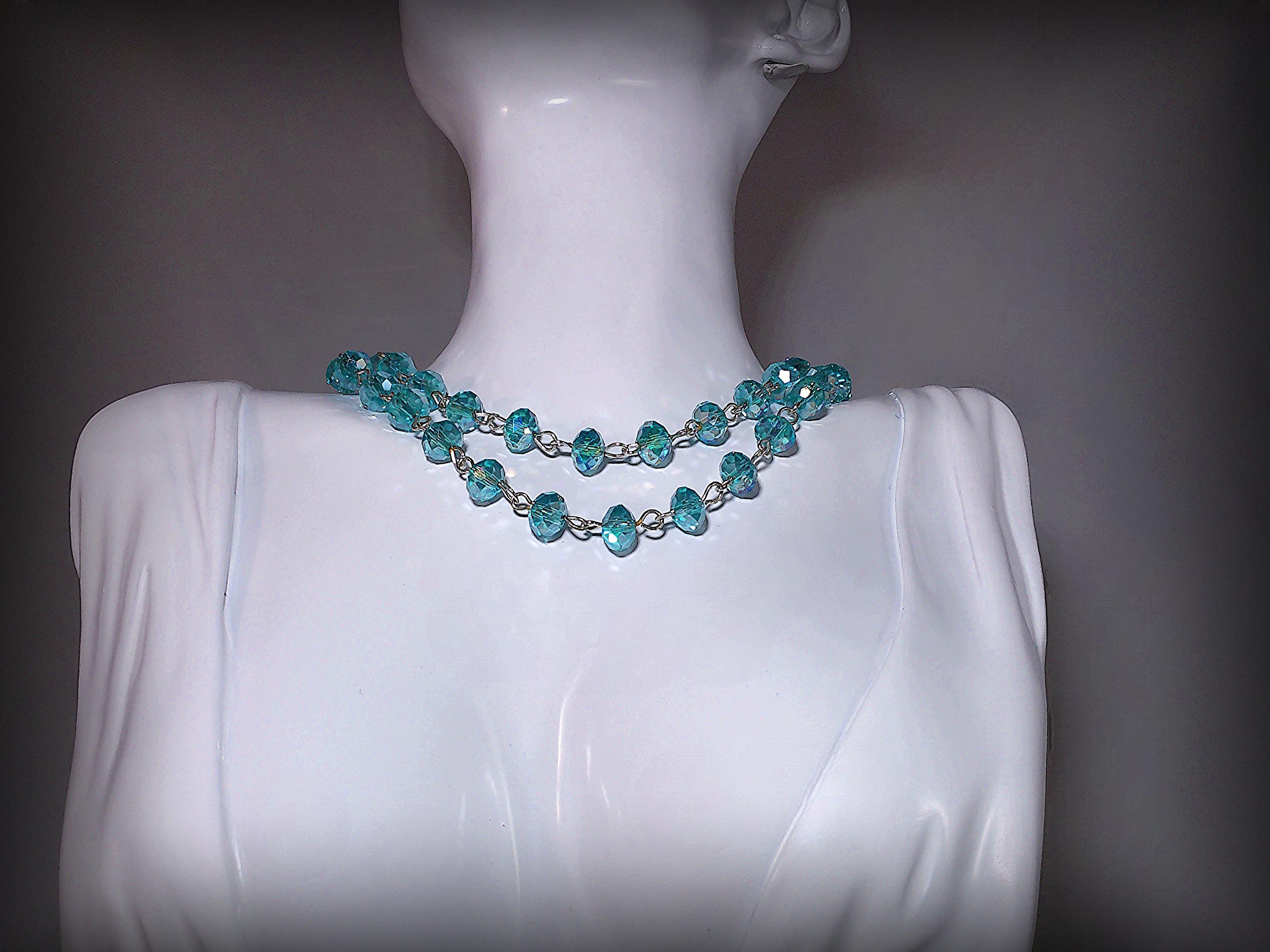 The simplicity of this double strand Necklace with Swiss Blue faceted glass beads accented and connected by the Silver Colored Stainless Steel Links is the creative brilliance of this piece. To Dress up the casual outfit or enhance the fancier fashion ensemble, this necklace will be the one to be sought. A Classic Design and always Elegant and Timeless!!