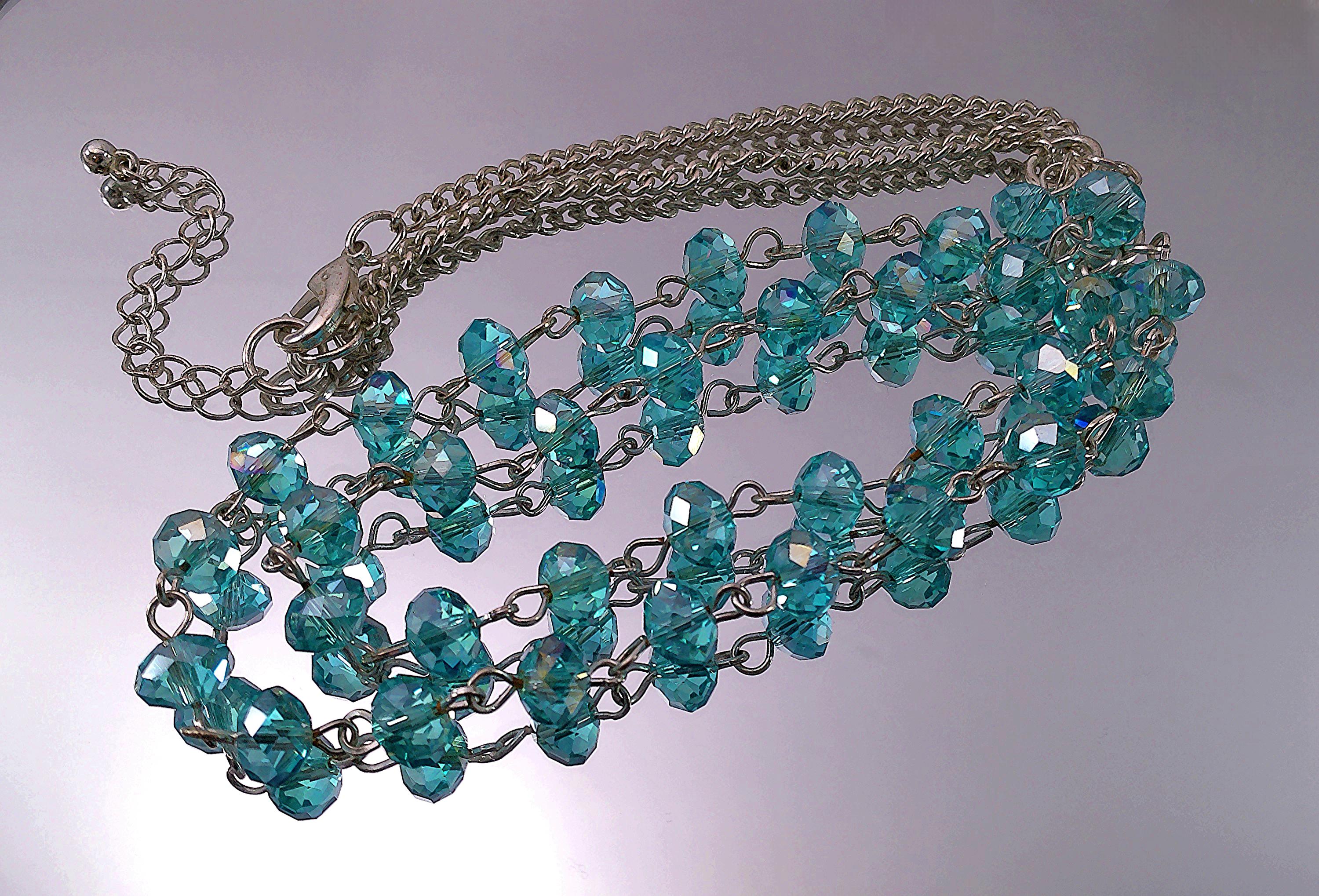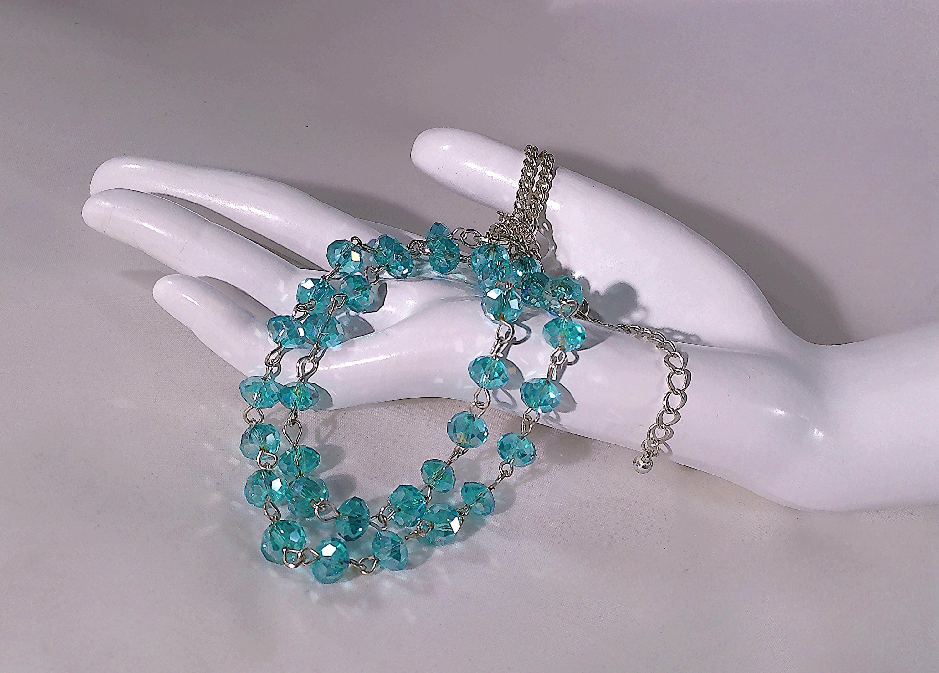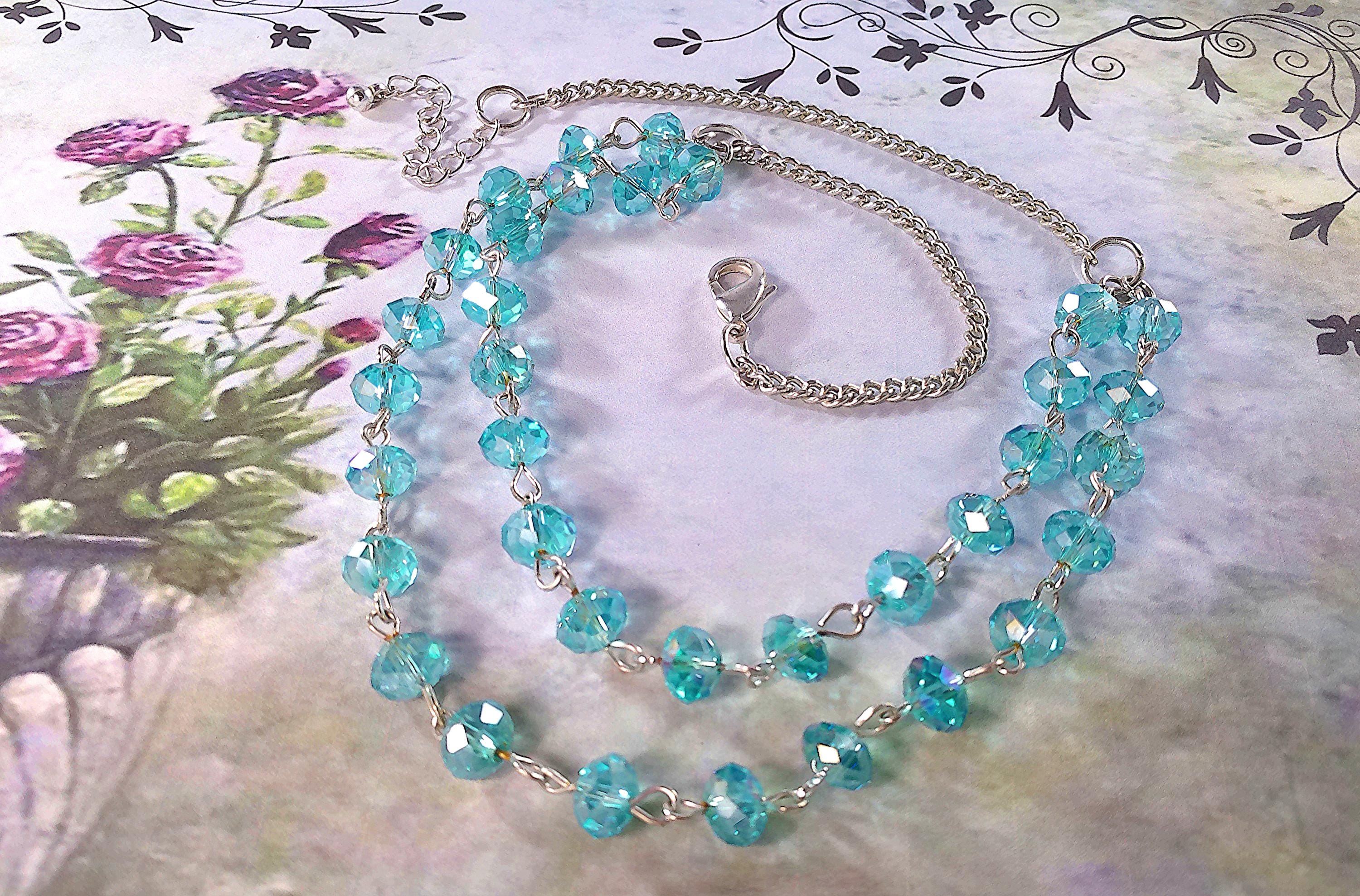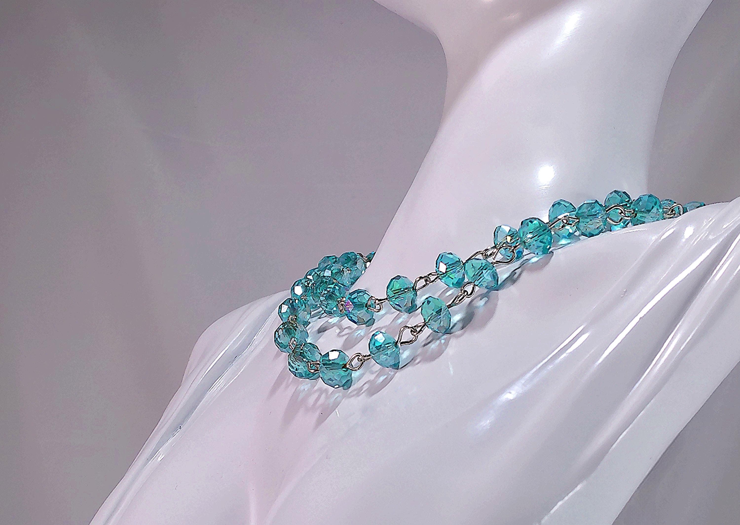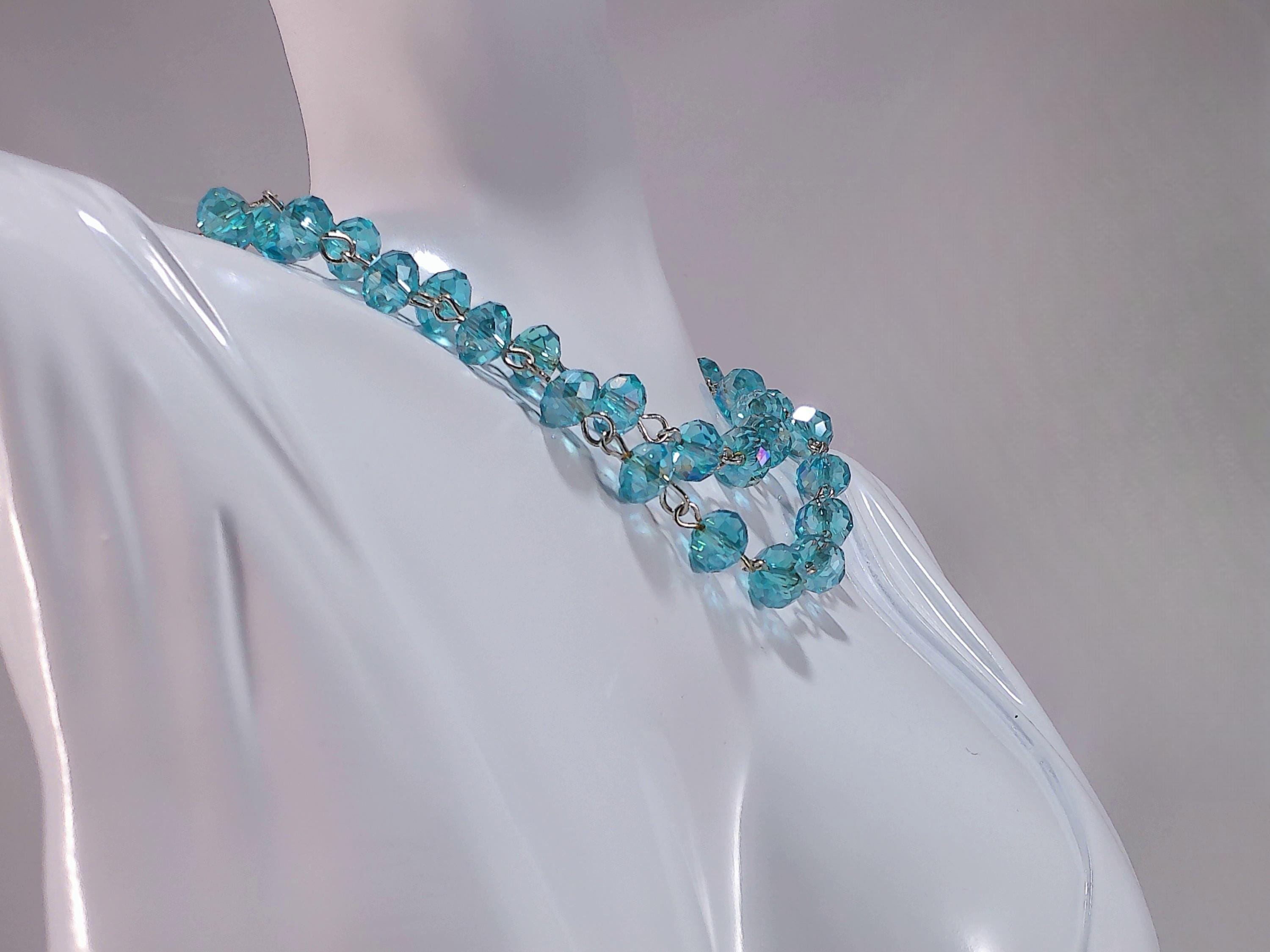 The simplicity of this double strand Necklace with Swiss Blue faceted glass beads accented and connected by the Silver Colored Stainless Steel Links is the creative brilliance of this piece. To Dress up the casual outfit or enhance the fancier fashion ensemble, this necklace will be the one to be sought. A Classic Design and always Elegant and Timeless!!