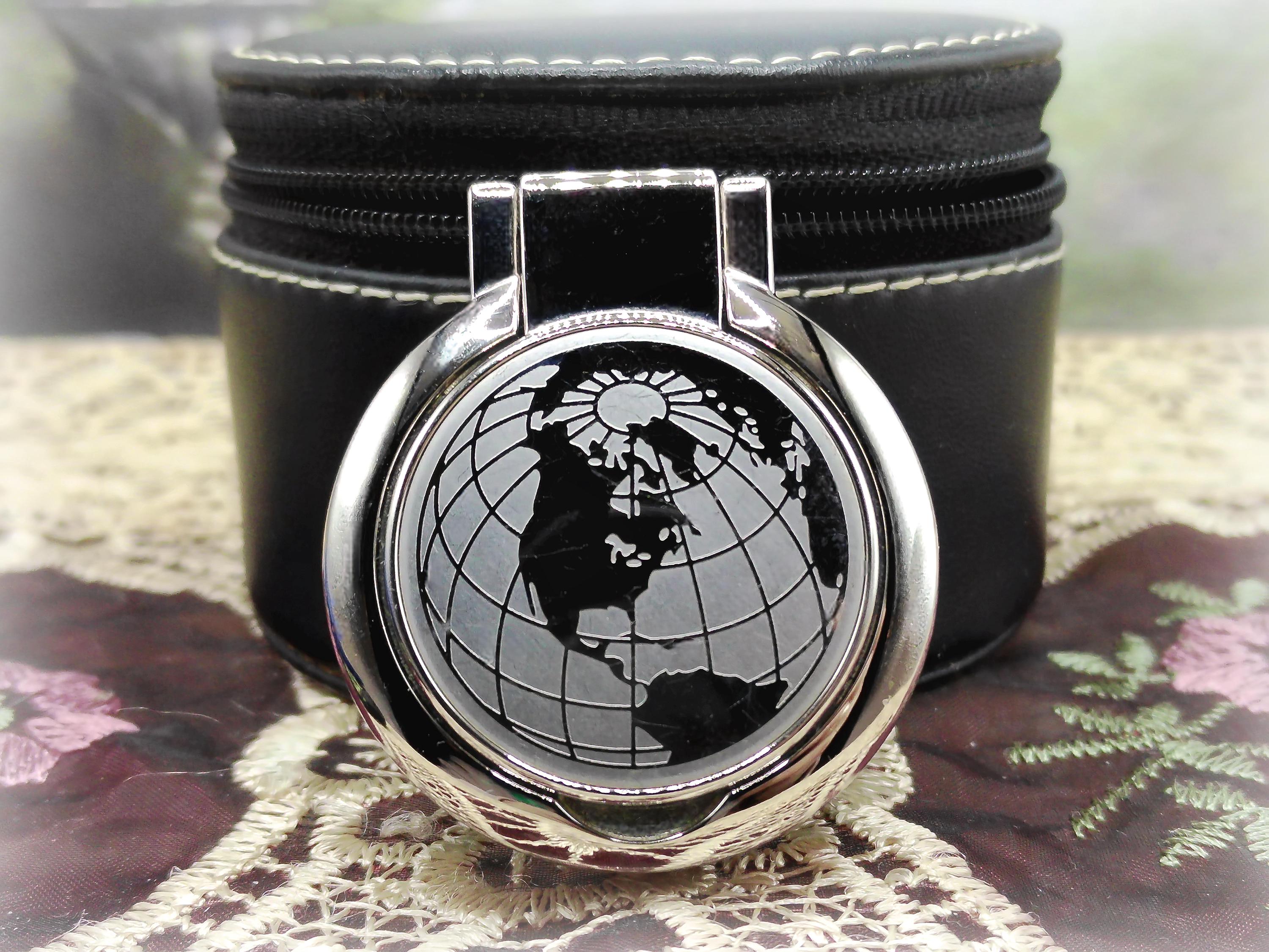 This is a very nice Miniature Travel Alarm Clock that can easily be dropped into your travel bag and take it with you so that you never oversleep!  This clock has a nice Globe picture showing North America and parts of South America and Europe.  The clocks and hands light up so that you can always see the time.  This watch comes in a nice black zip up case and it has a built-in stand so that you can set it up so that it can always be easily seen.  This is a great collectible item!