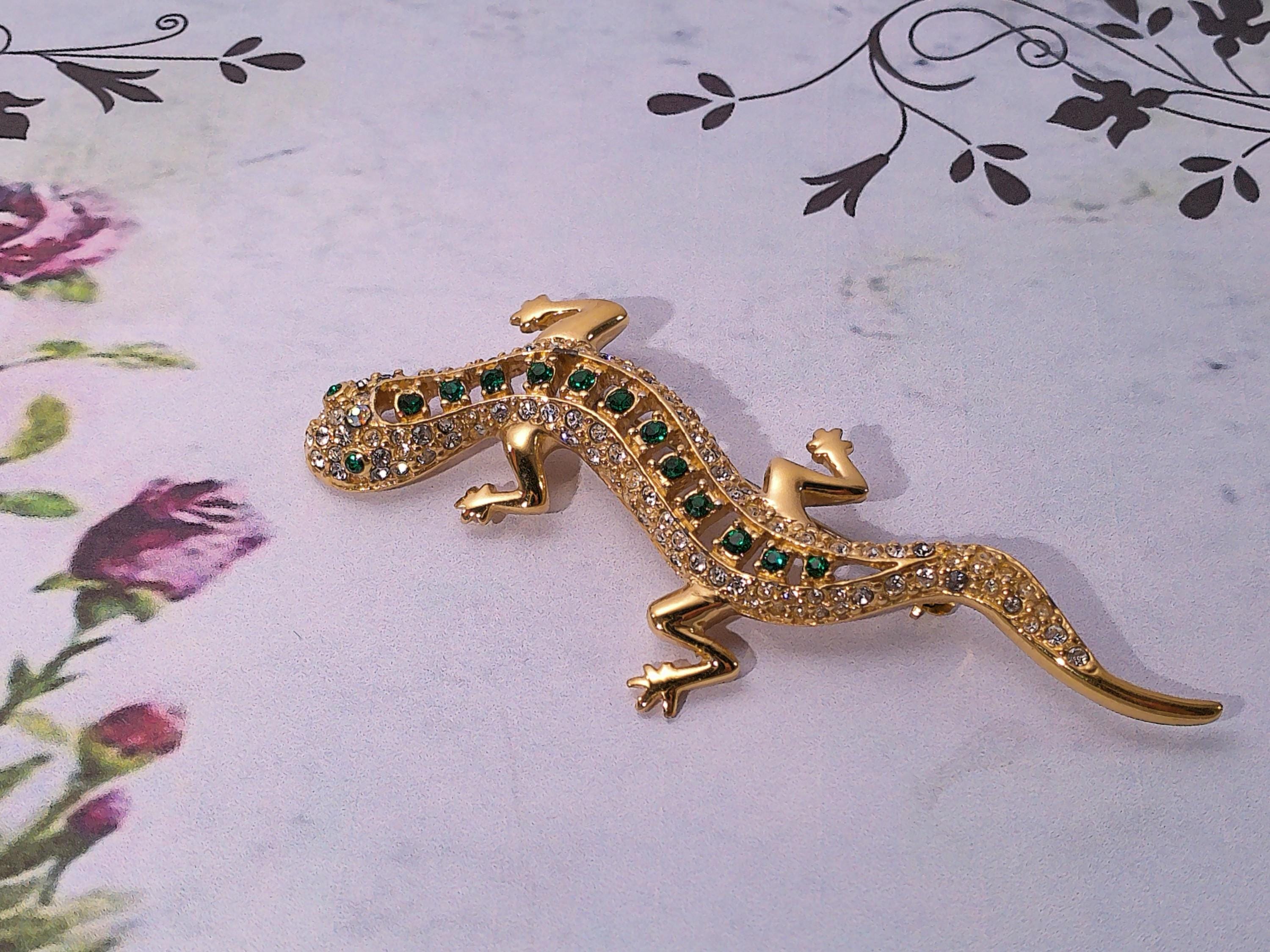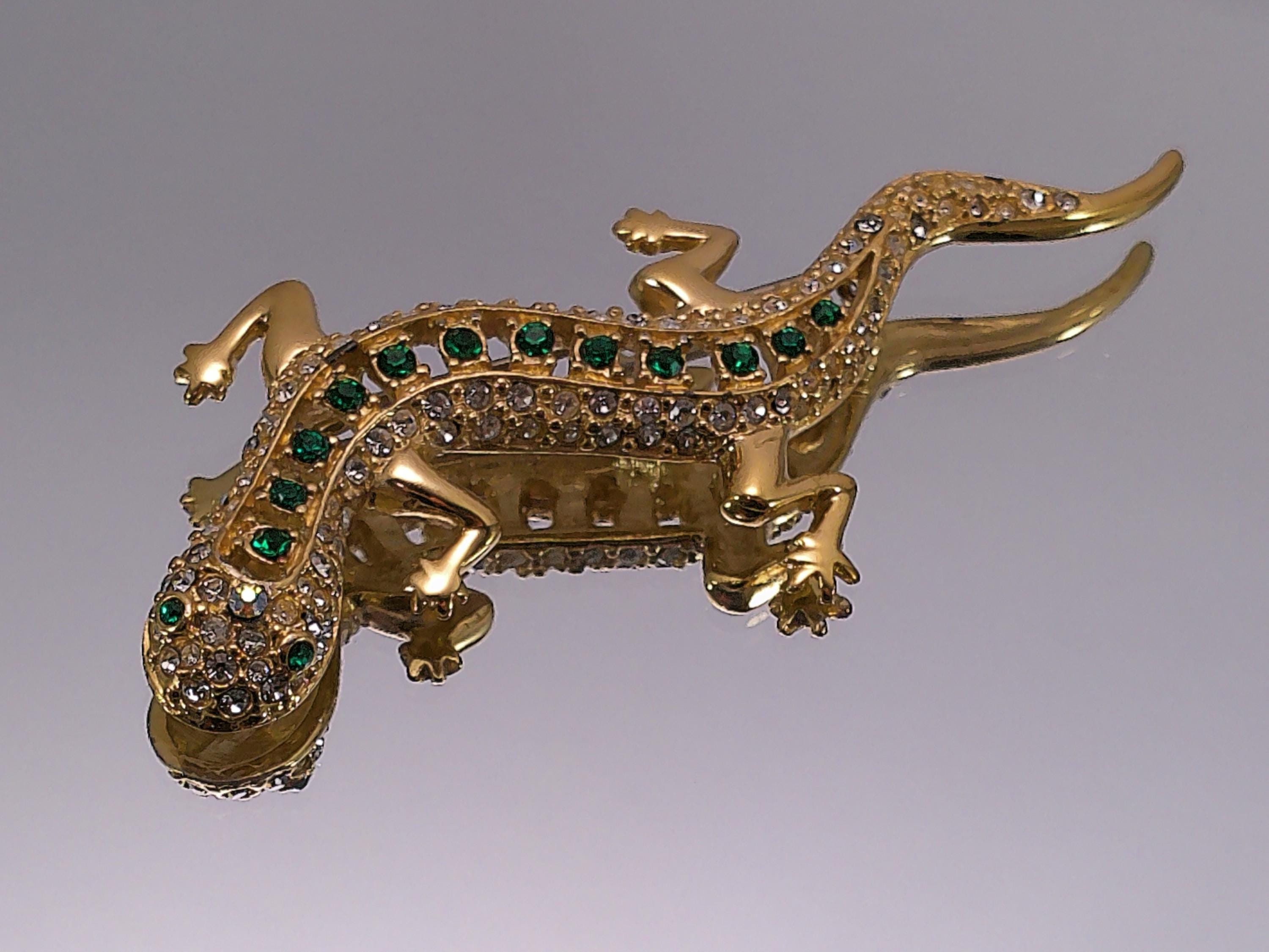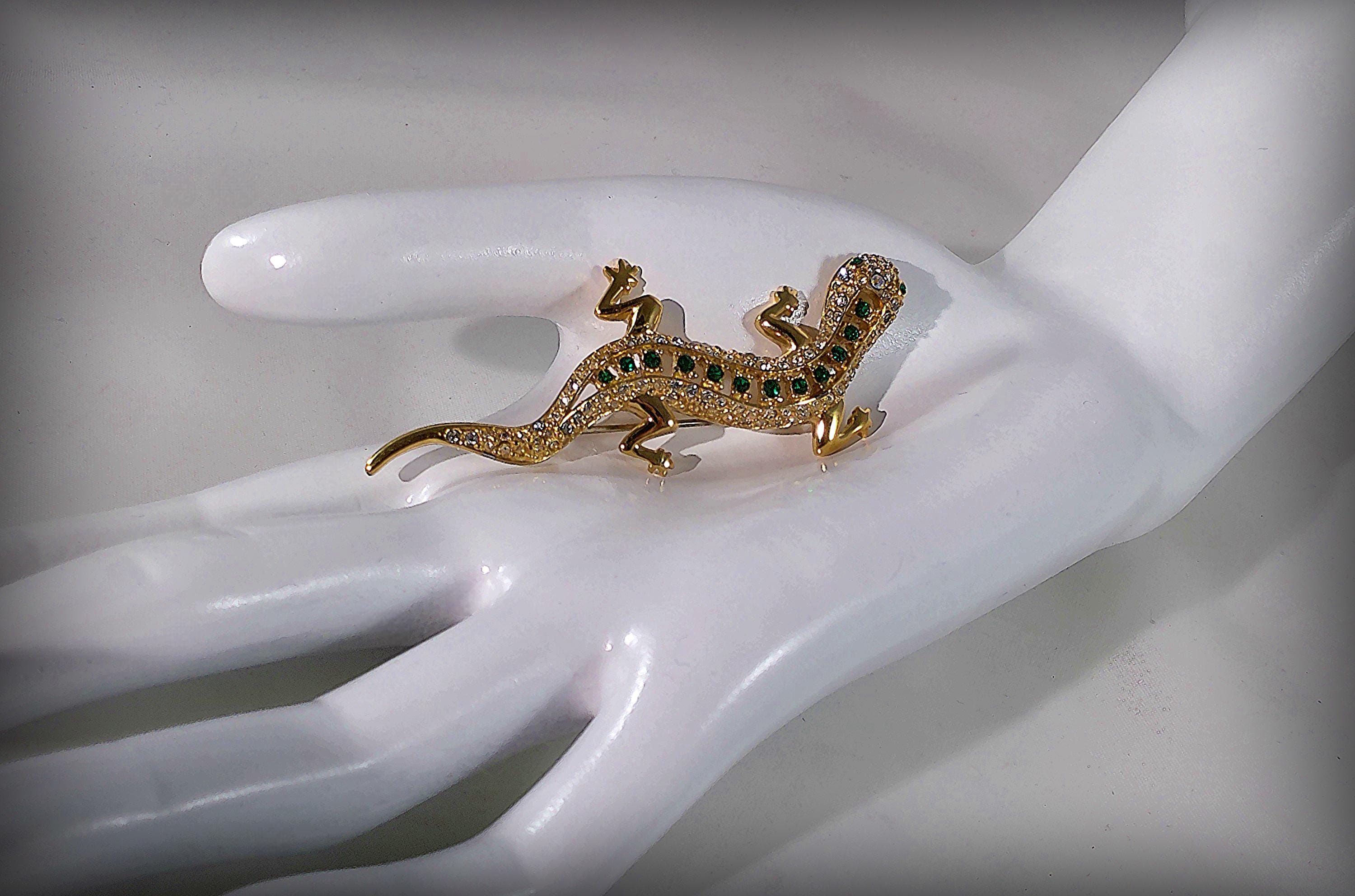 Salamander Brooch – Gold Tone with Emeralds and Rhinestones – 1990s - Vintage