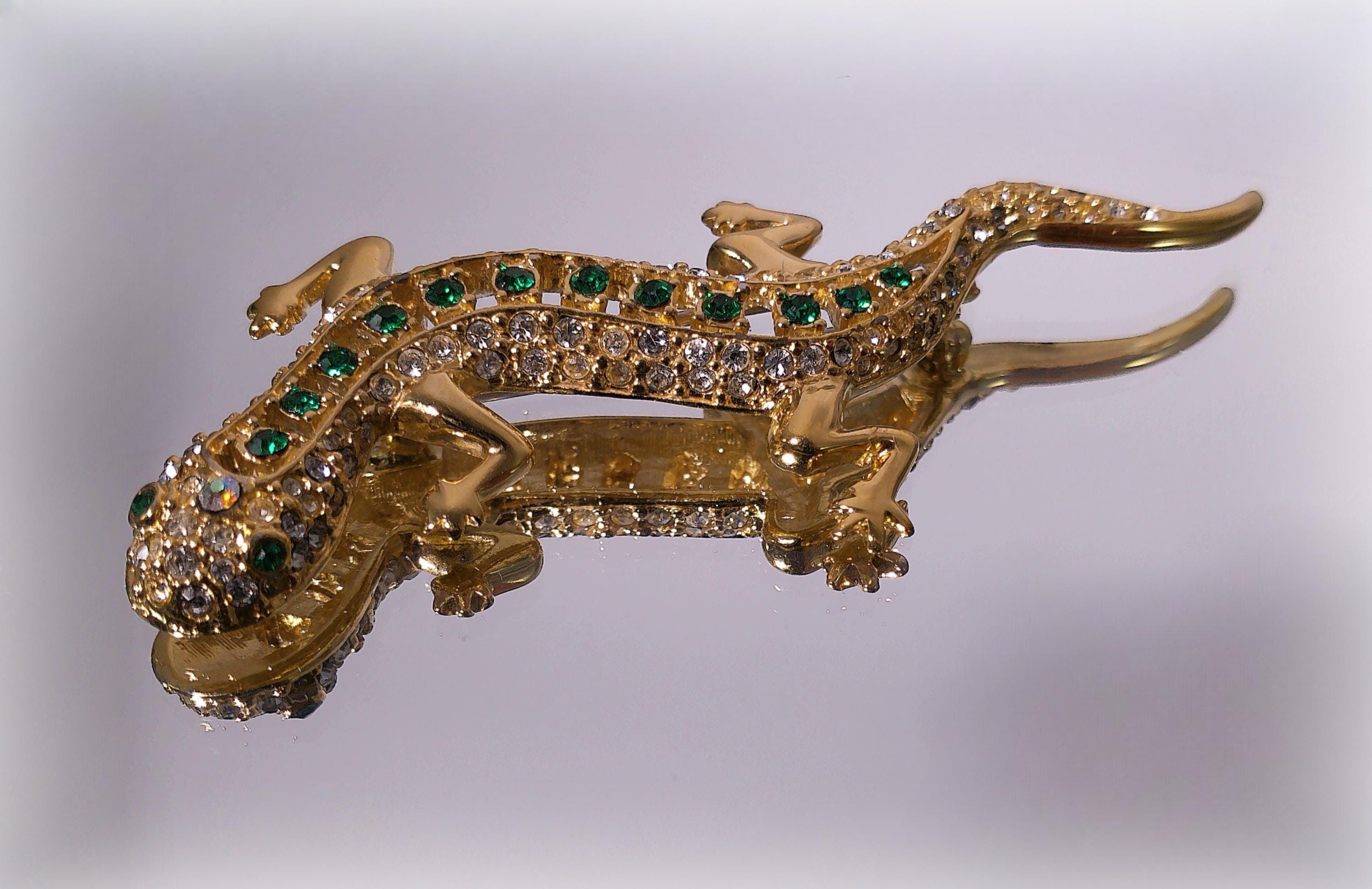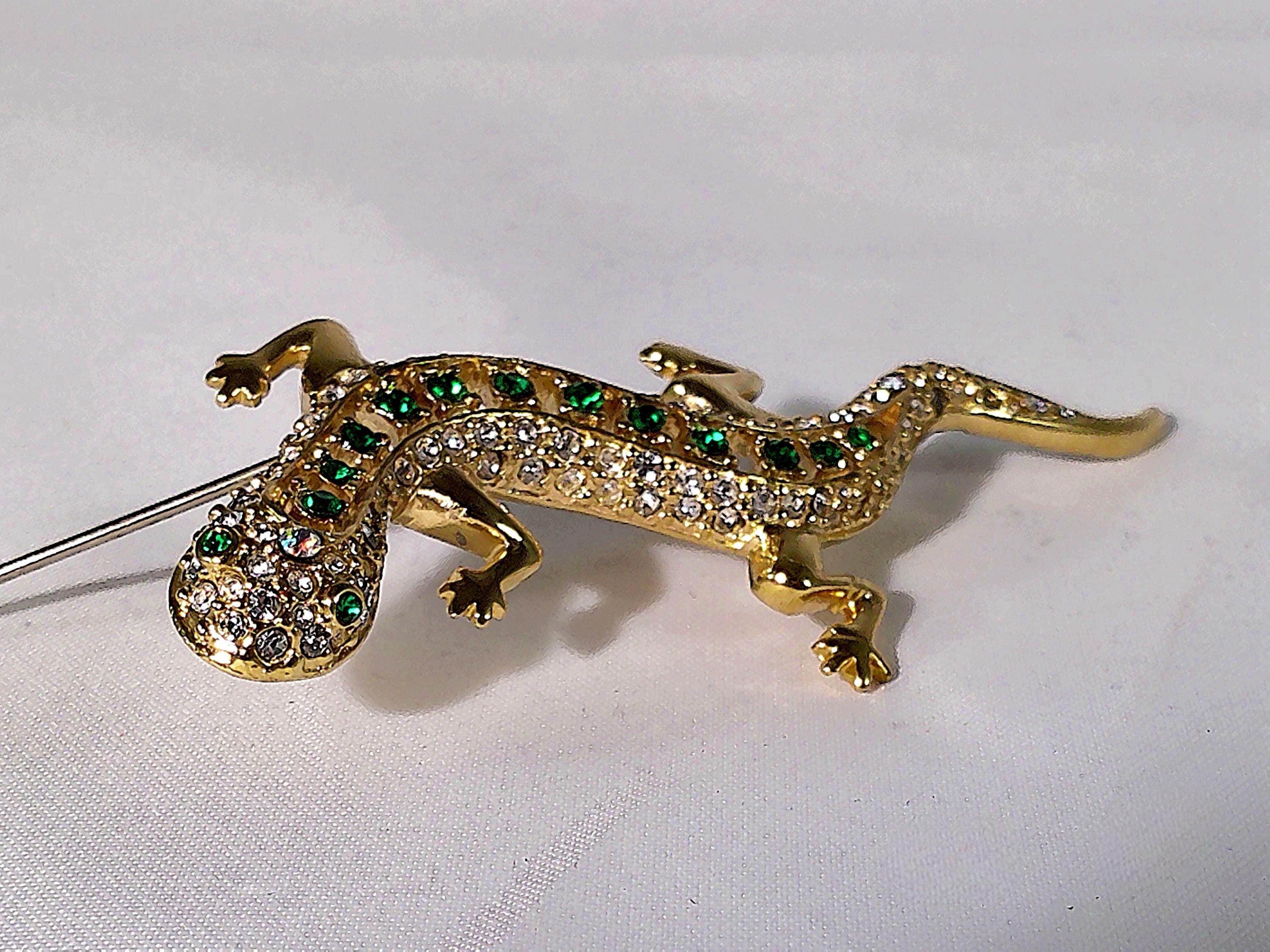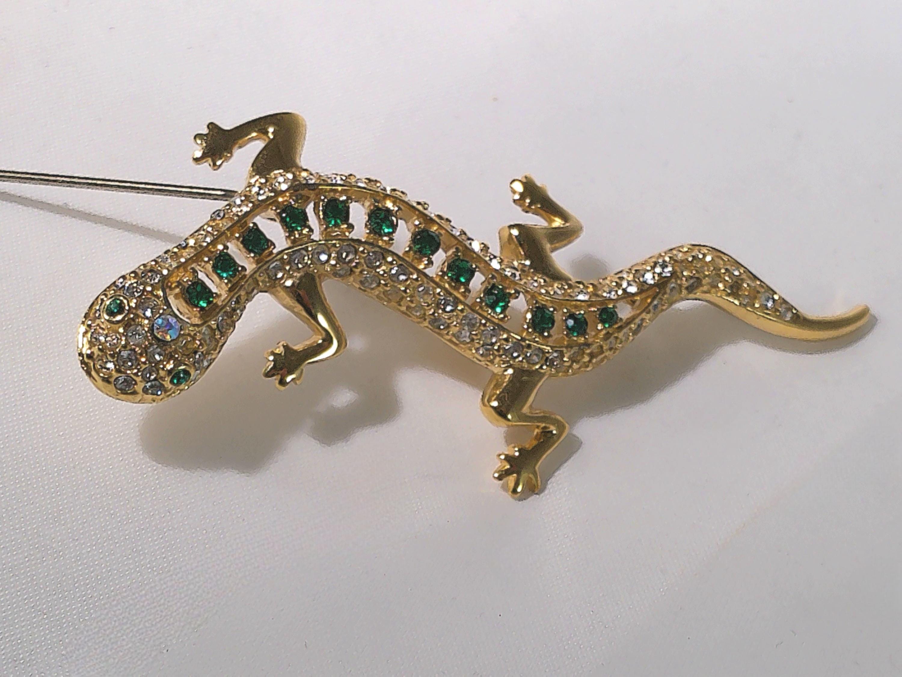 A delightful Gold Tone Salamander Brooch, generously accented with glittering Emerald Crystals and Rhinestones has been found to add a little surprise to your outfit. This little critter can be pinned to perfectly arrange a scarf, or don it on a blazer, coat, dress or shirt to add a bit of excitement with limitless options.