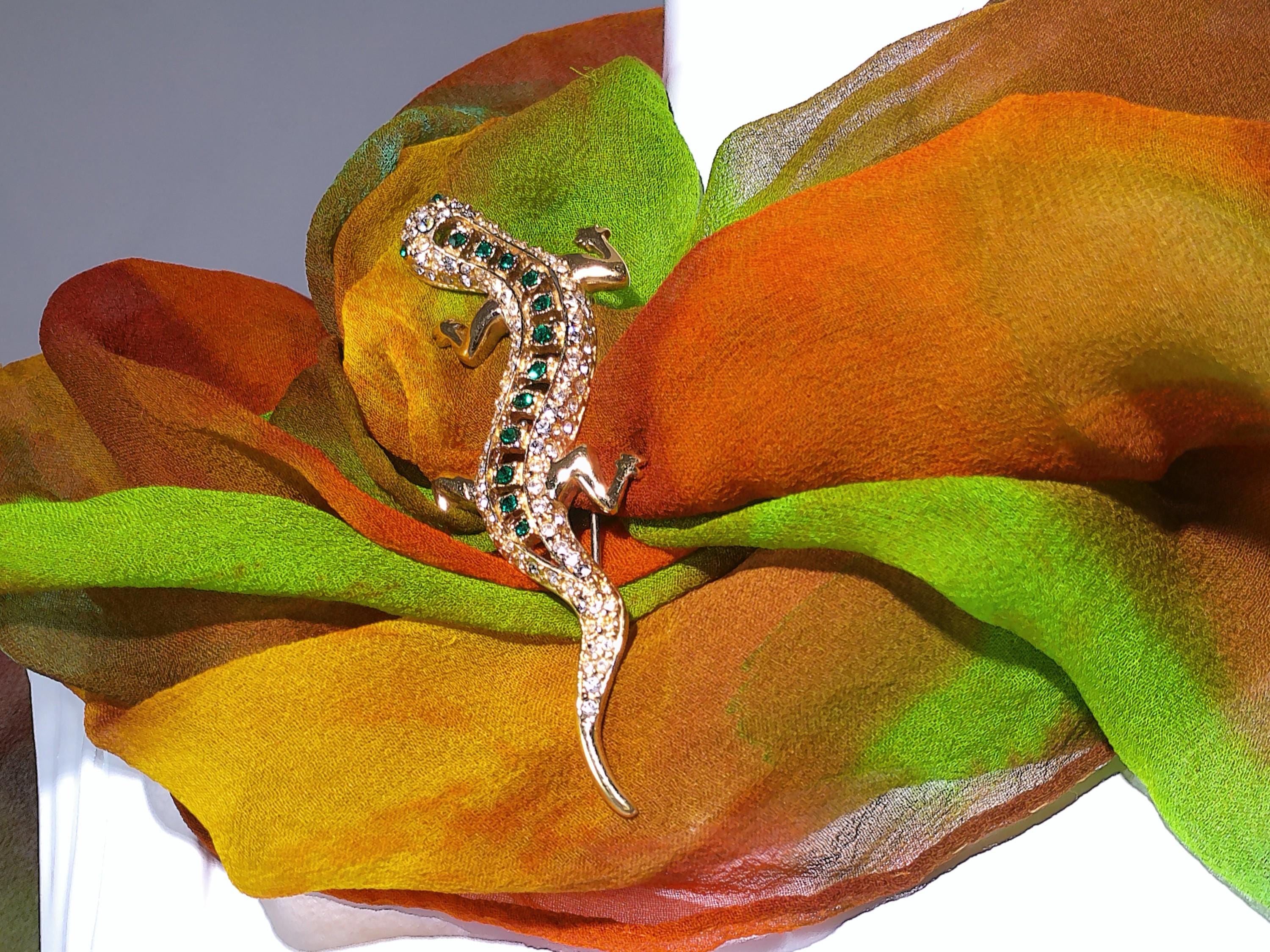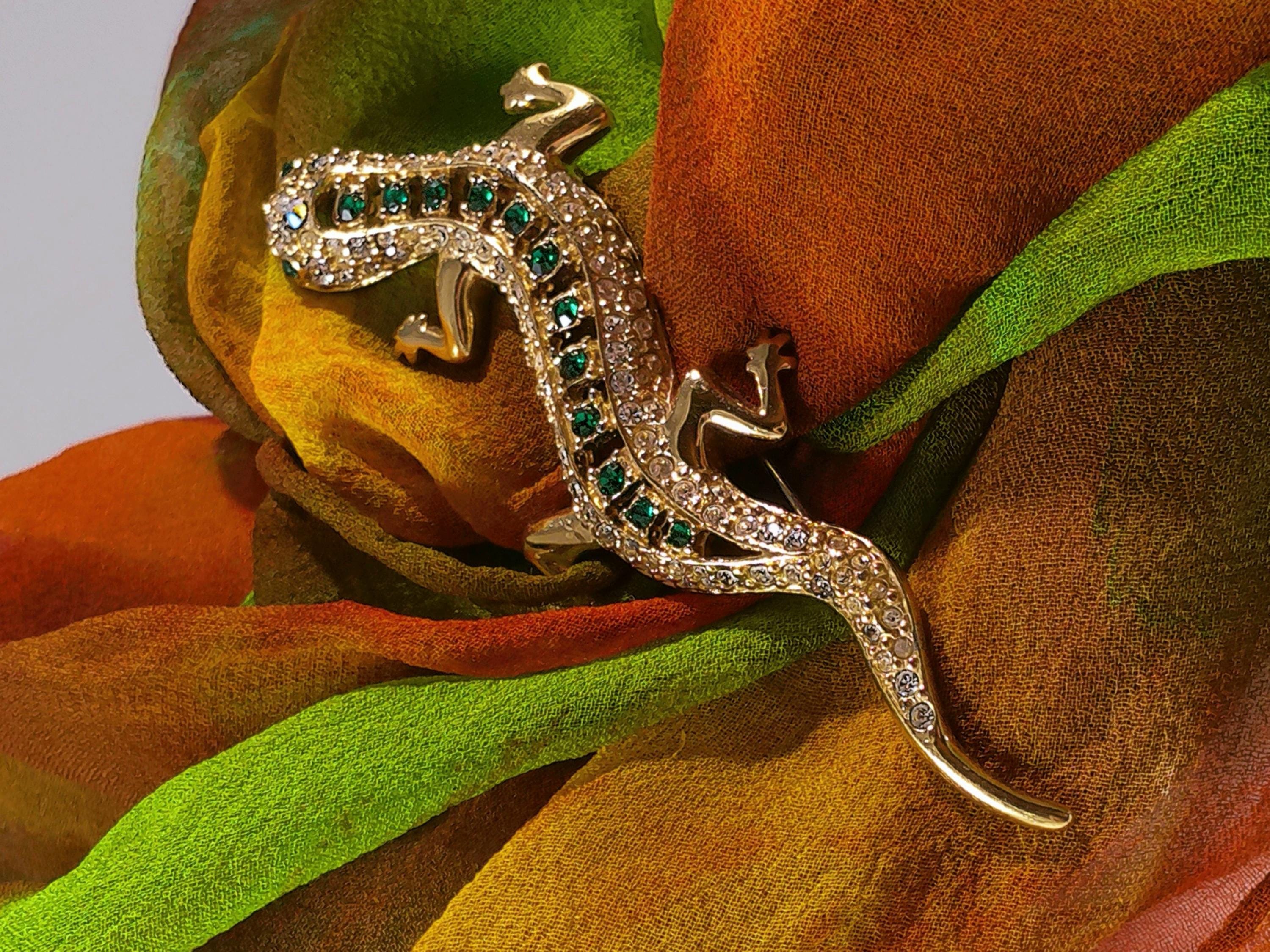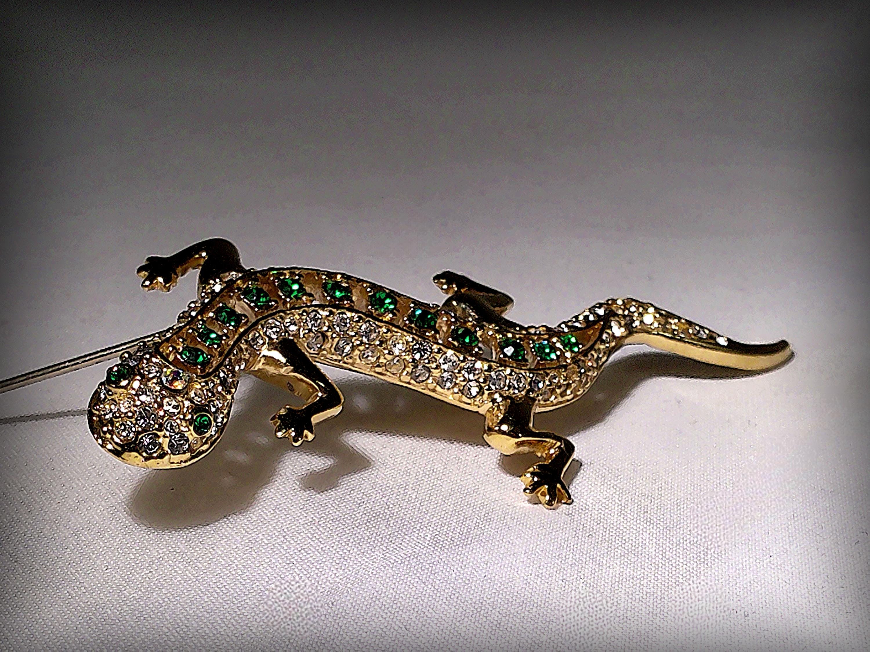 A delightful Gold Tone Salamander Brooch, generously accented with glittering Emerald Crystals and Rhinestones has been found to add a little surprise to your outfit. This little critter can be pinned to perfectly arrange a scarf, or don it on a blazer, coat, dress or shirt to add a bit of excitement with limitless options.