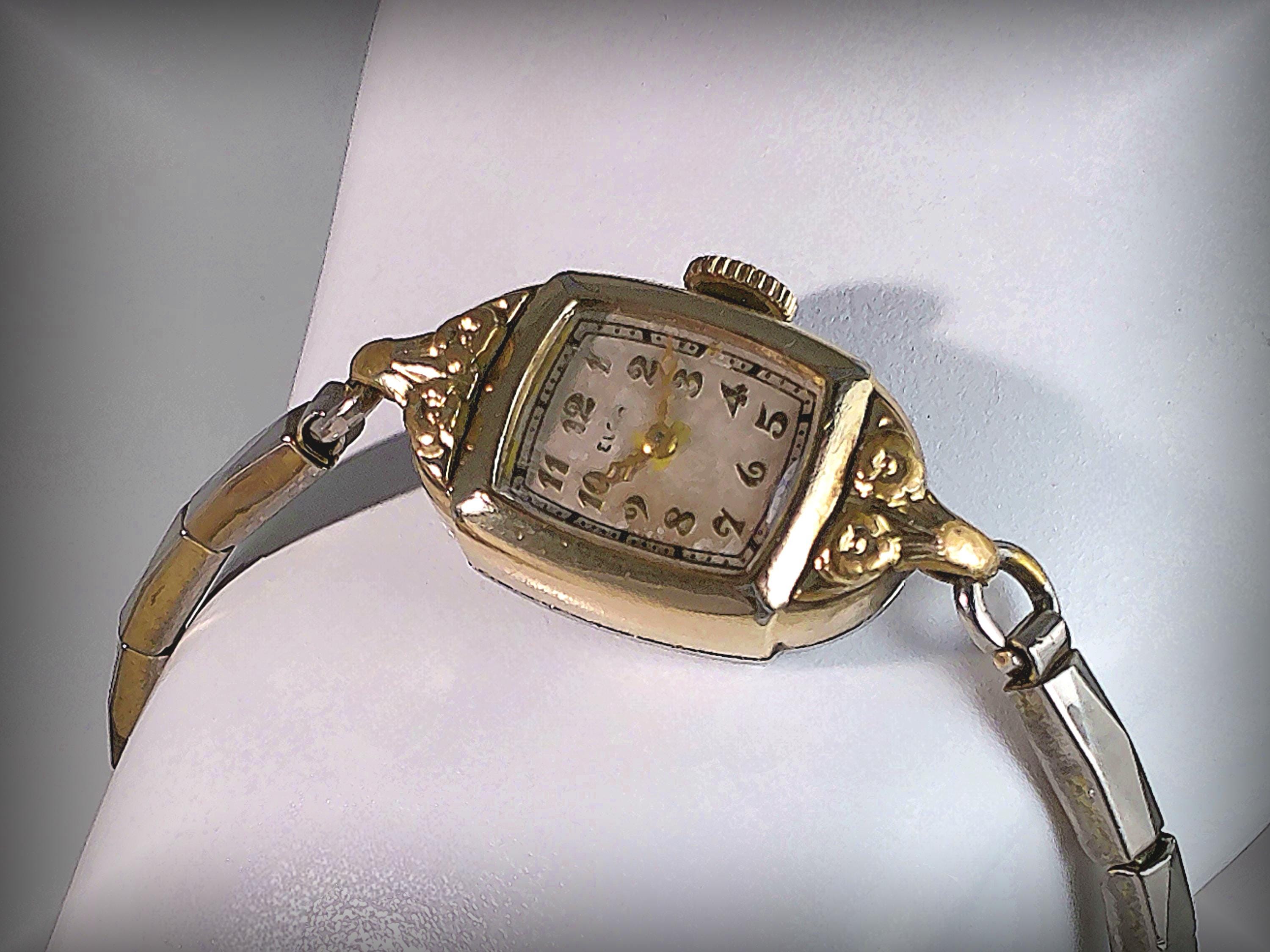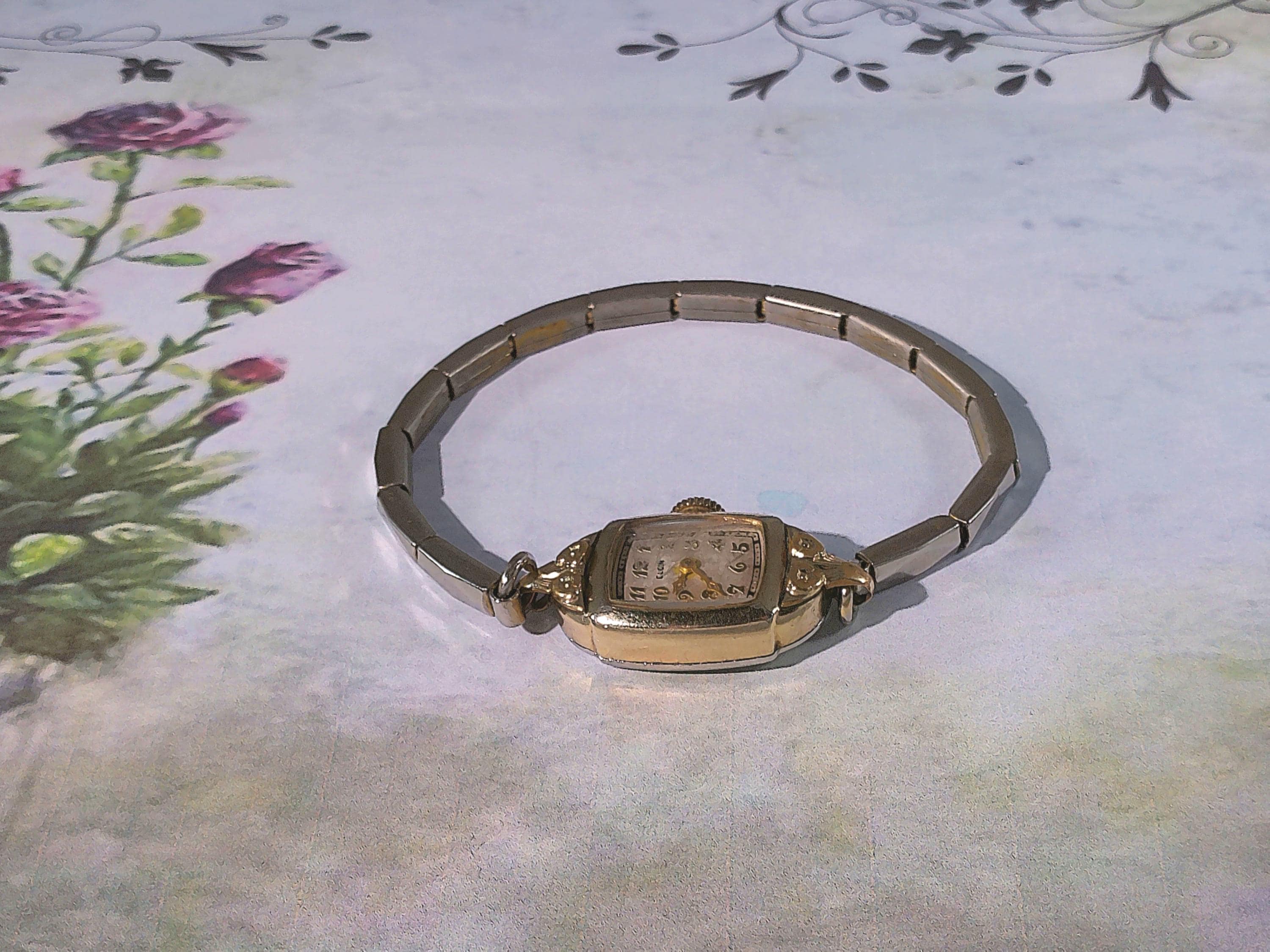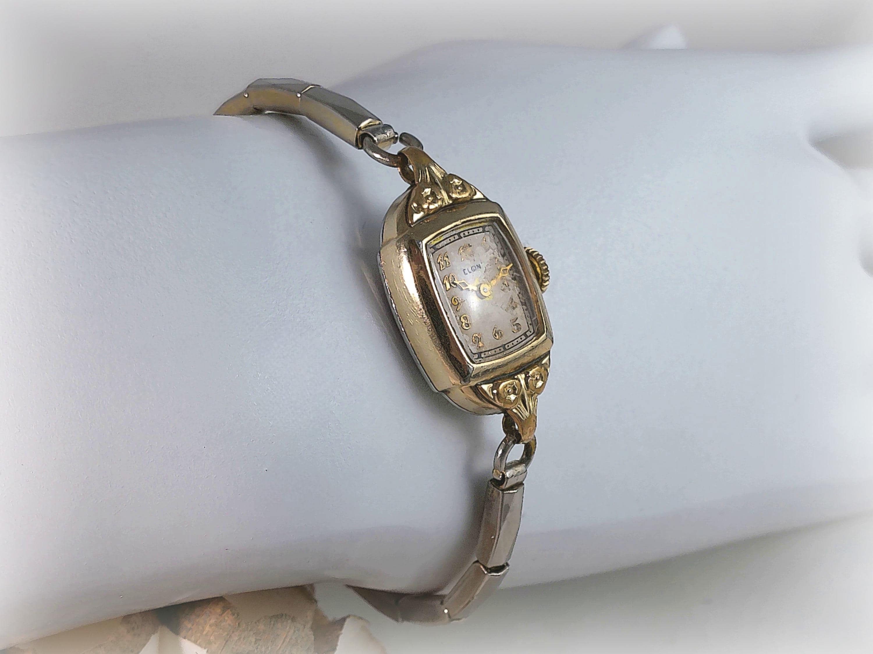 Elgin’s exemplary innovative quality making of Women’s 1940 “Cocktail Watches” with 15 Jewel mechanics, and elegant Mid-Century watch with Victorian Era Design is rendered in this beautiful yellow gold, manual wind-up watch. It is no wonder that Elgin watches, with its horological significance in American watch making and proven longevity, continue to be highly collectible. With rose motifs molded in the gold, this watch is like carrying a piece of history and beauty on the wrist.