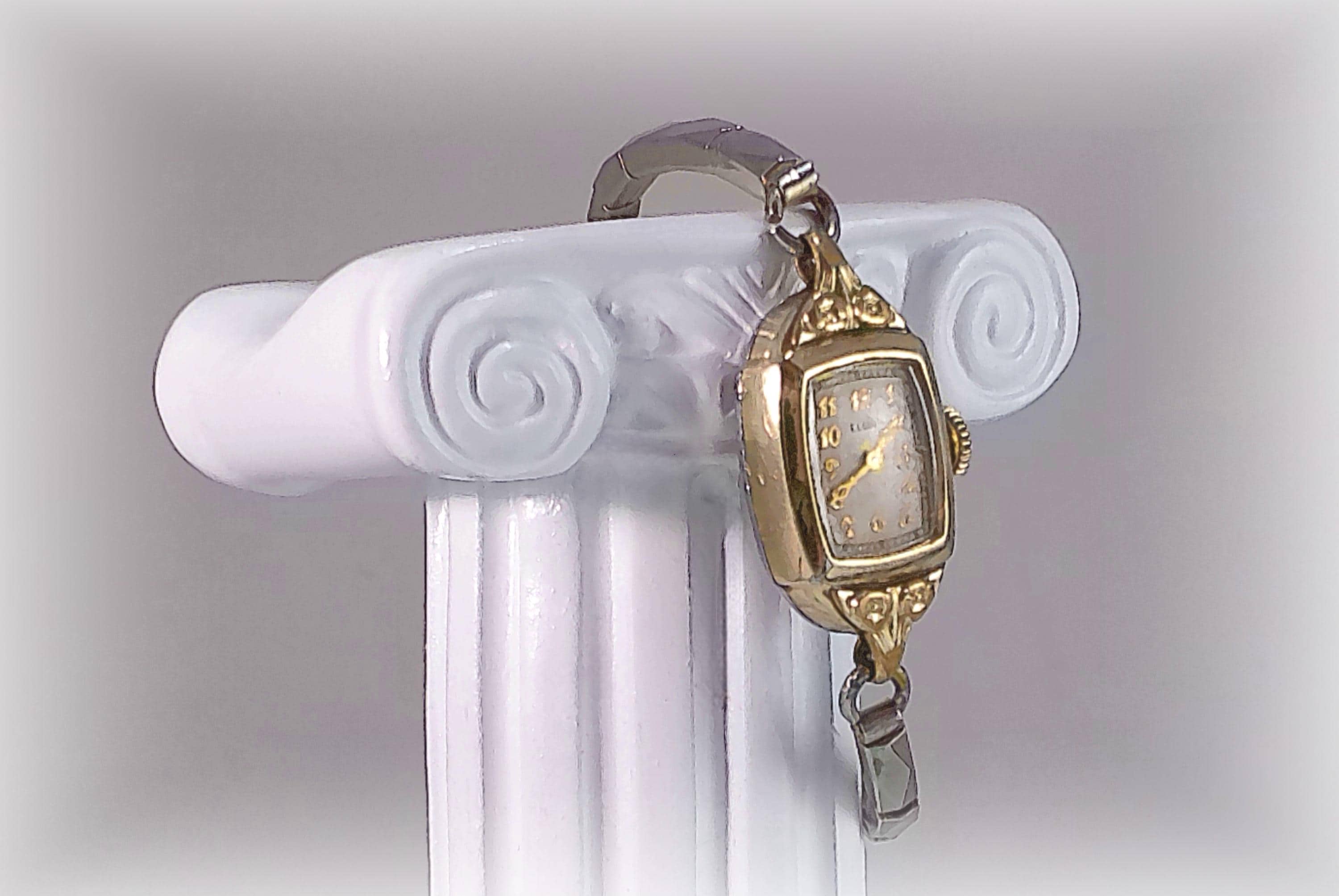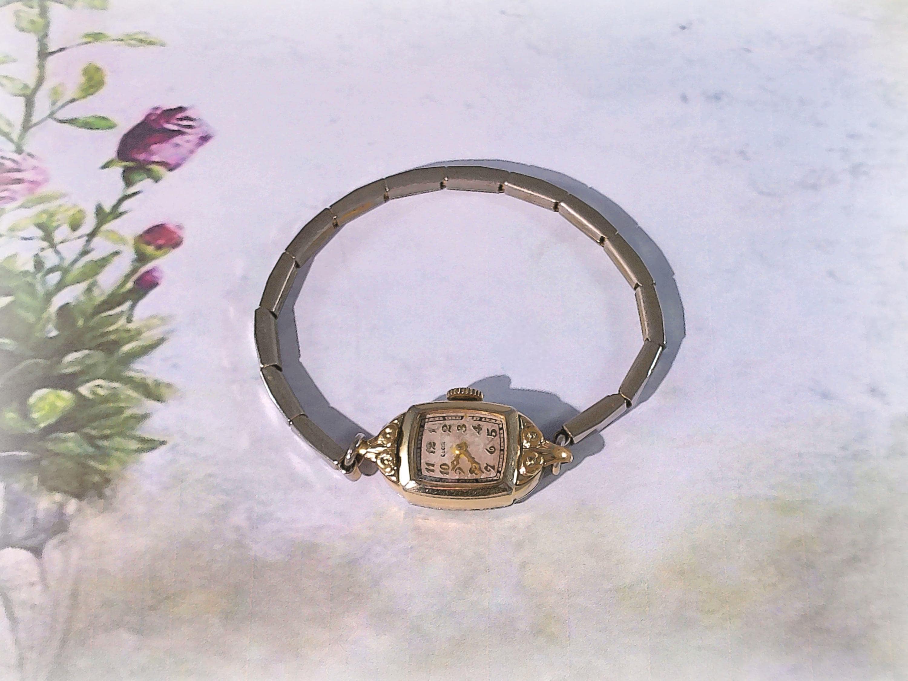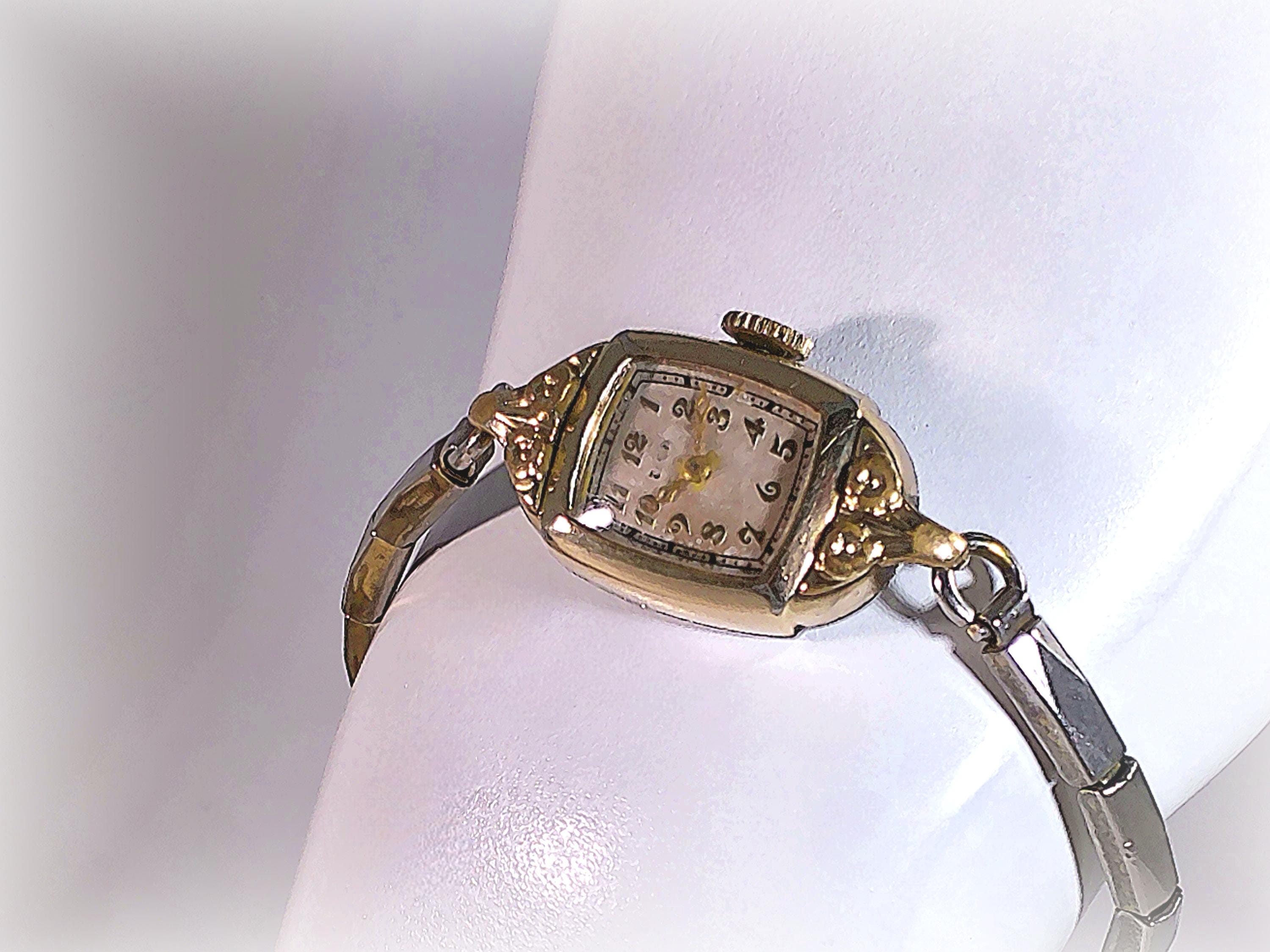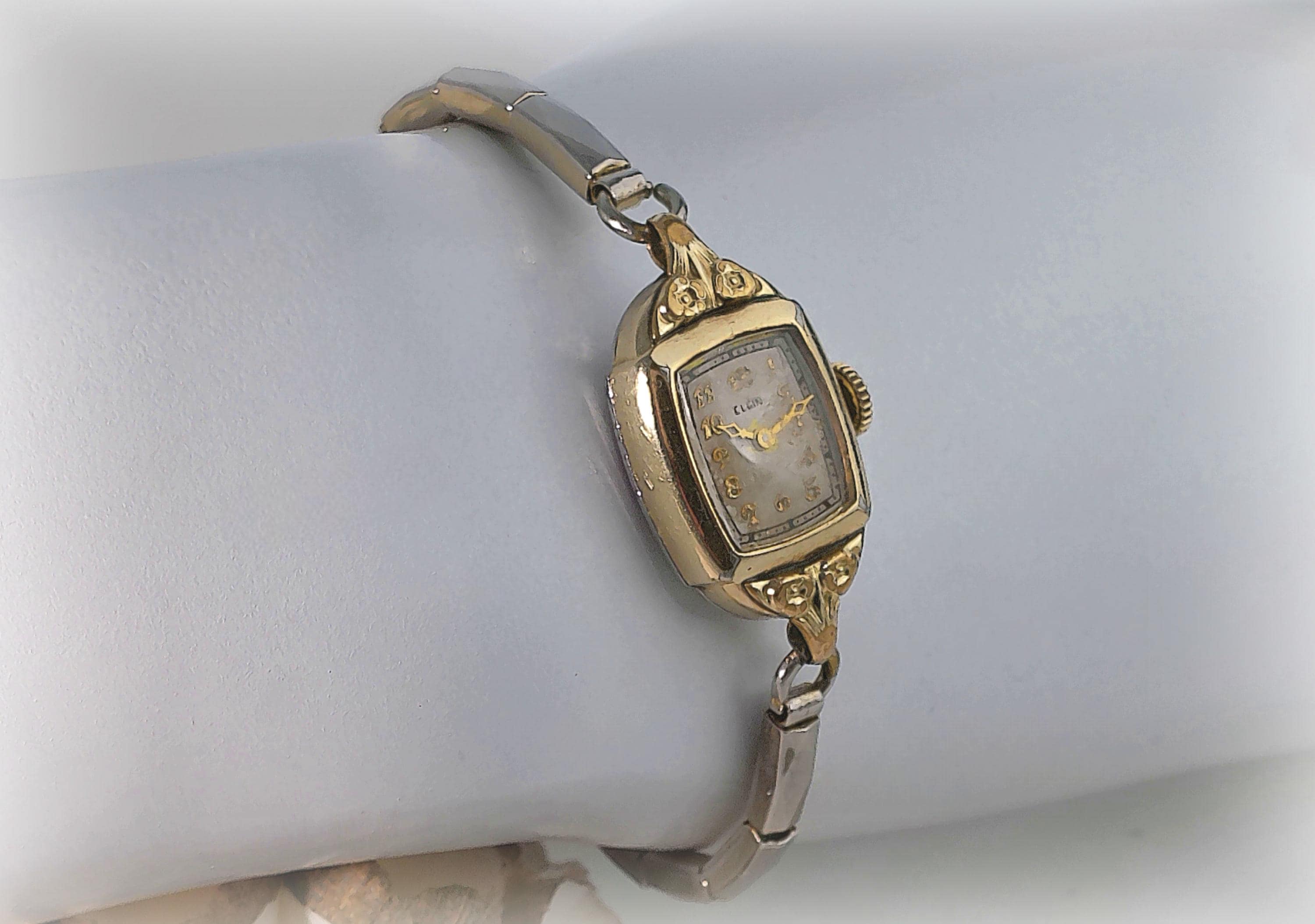 Elgin’s exemplary innovative quality making of Women’s 1940 “Cocktail Watches” with 15 Jewel mechanics, and elegant Mid-Century watch with Victorian Era Design is rendered in this beautiful yellow gold, manual wind-up watch. It is no wonder that Elgin watches, with its horological significance in American watch making and proven longevity, continue to be highly collectible. With rose motifs molded in the gold, this watch is like carrying a piece of history and beauty on the wrist.