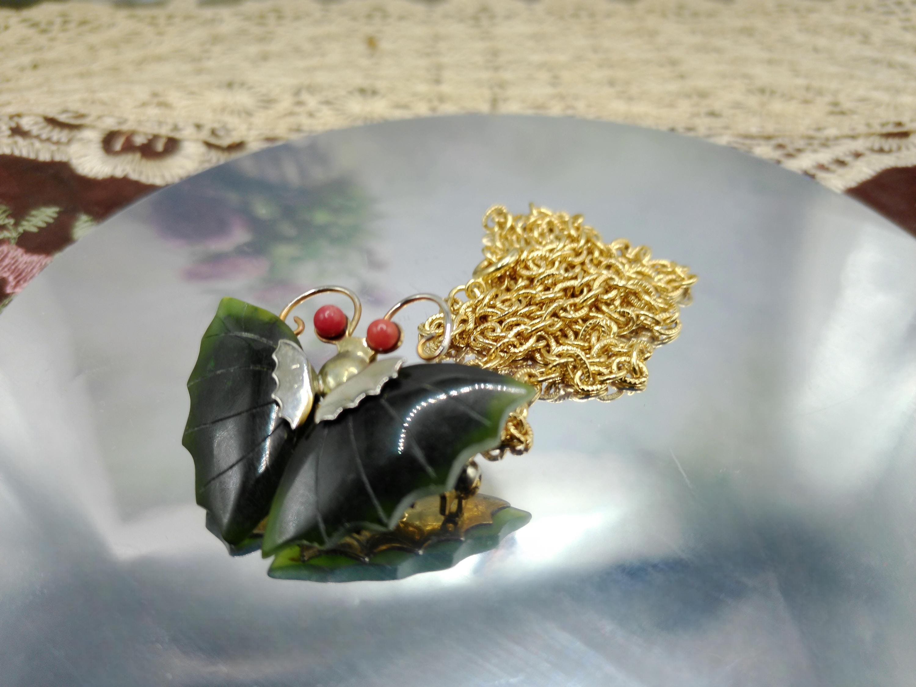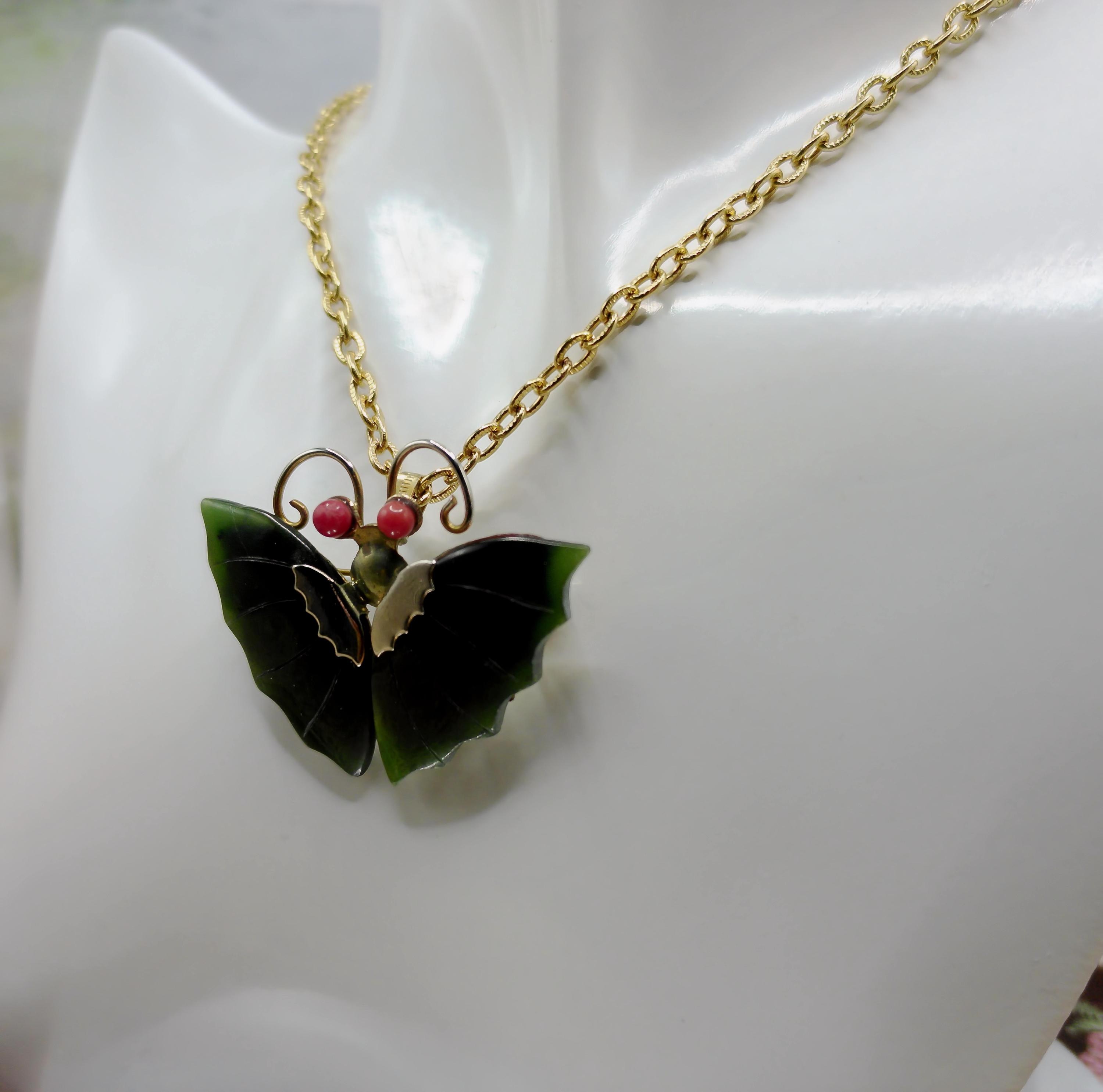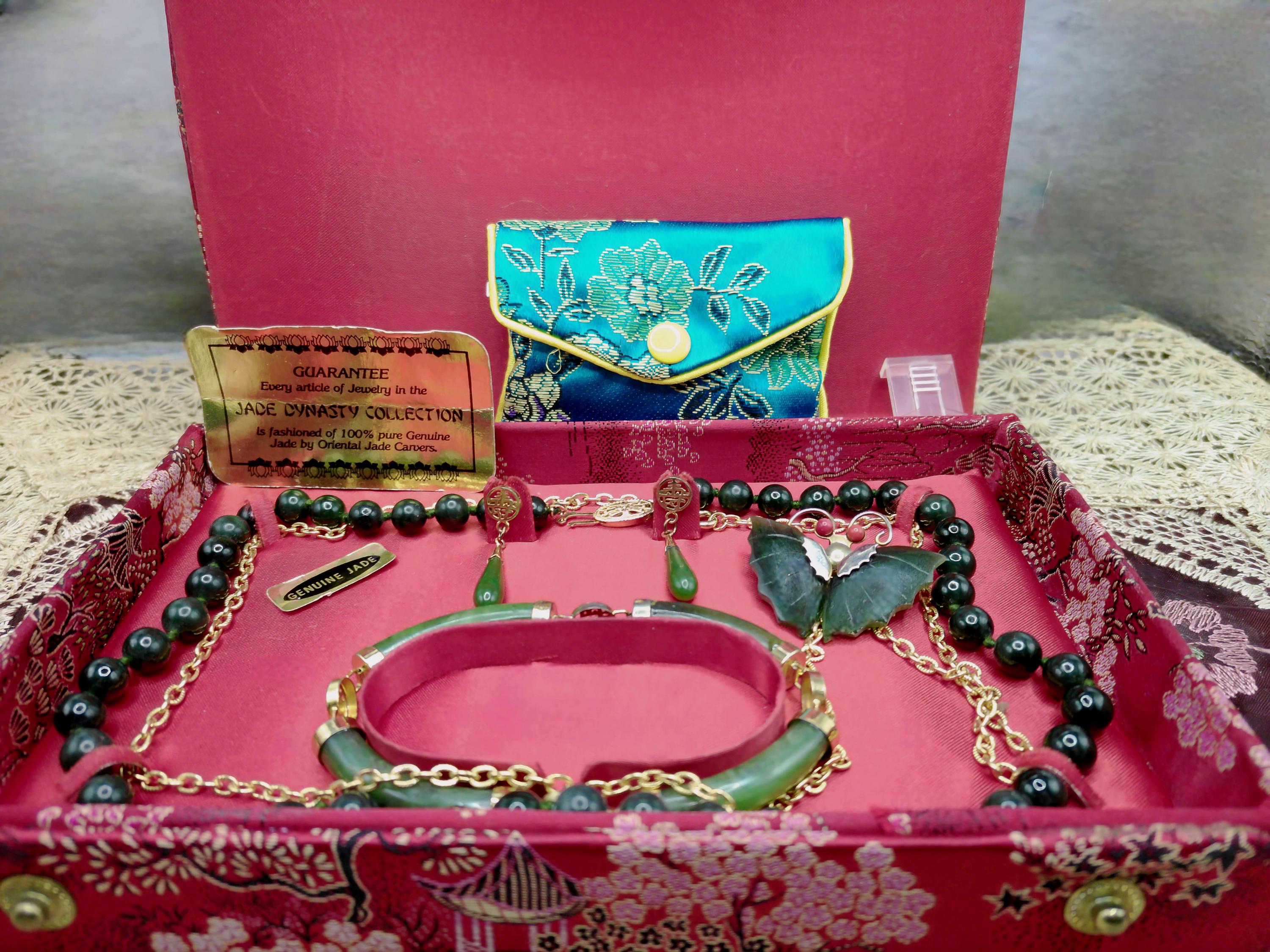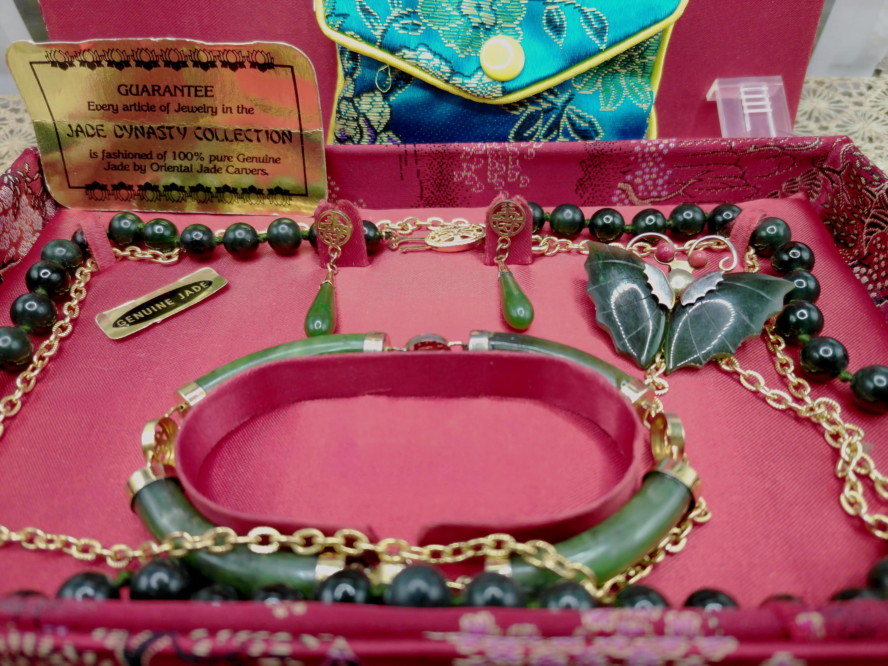 Inside, you will find a lovely collection consisting of a hand knotted medium spinach green 8mm jade beaded necklace that is 18 inches in length with a gold filled clasp, a pair of gold tone dangle medium green jade earrings with Chinese markings at the top; I believe they may be the signs for prosperity. A beautiful jade tube bracelet with round Chinese emblems set in between each jade tube. This bracelet is closer to a dark spinach green color with some variations of color in the jade. And finally, a wonderful convertible butterfly brooch that has bright red eyes and dark green jade wings with gold trim.