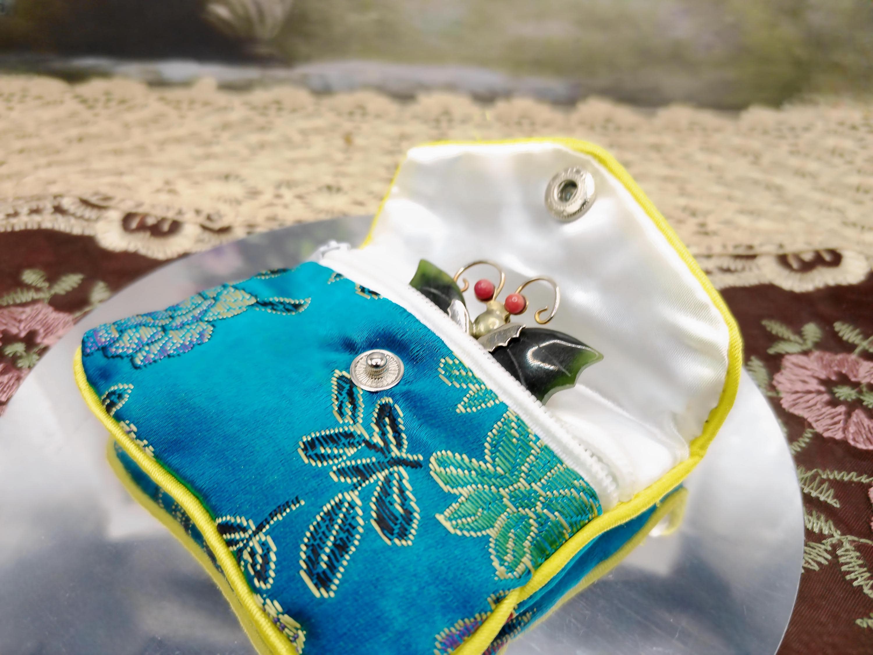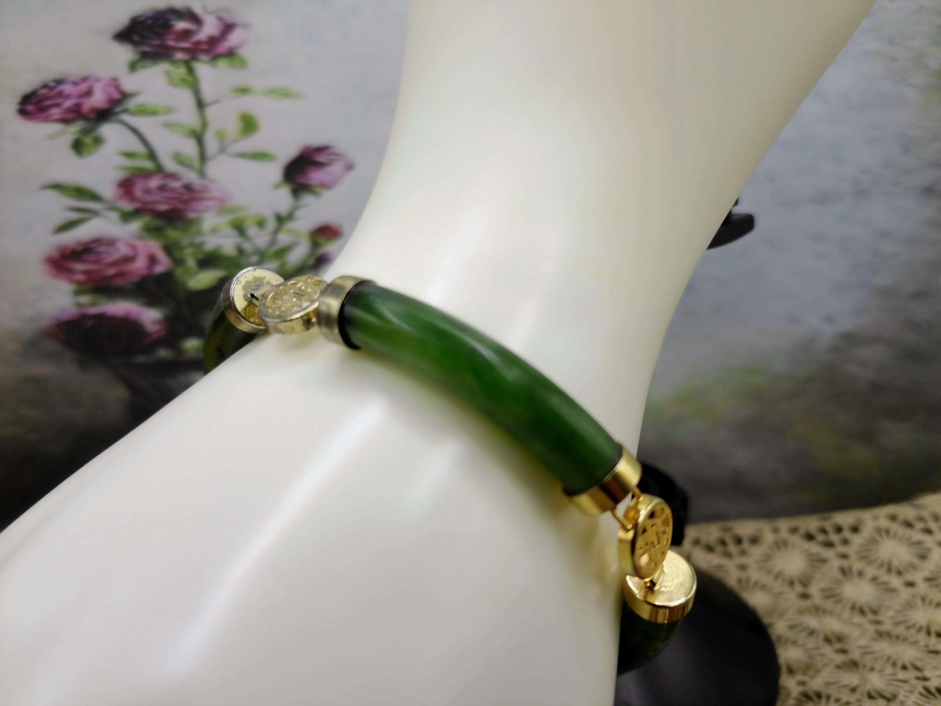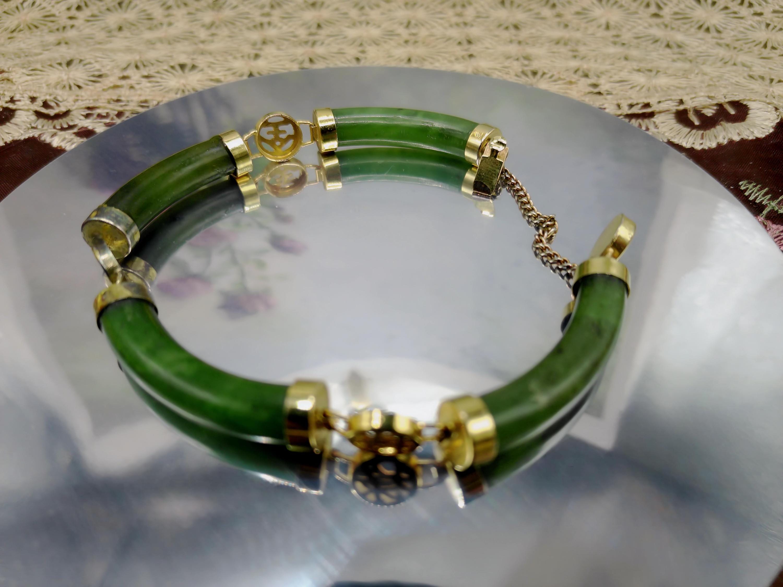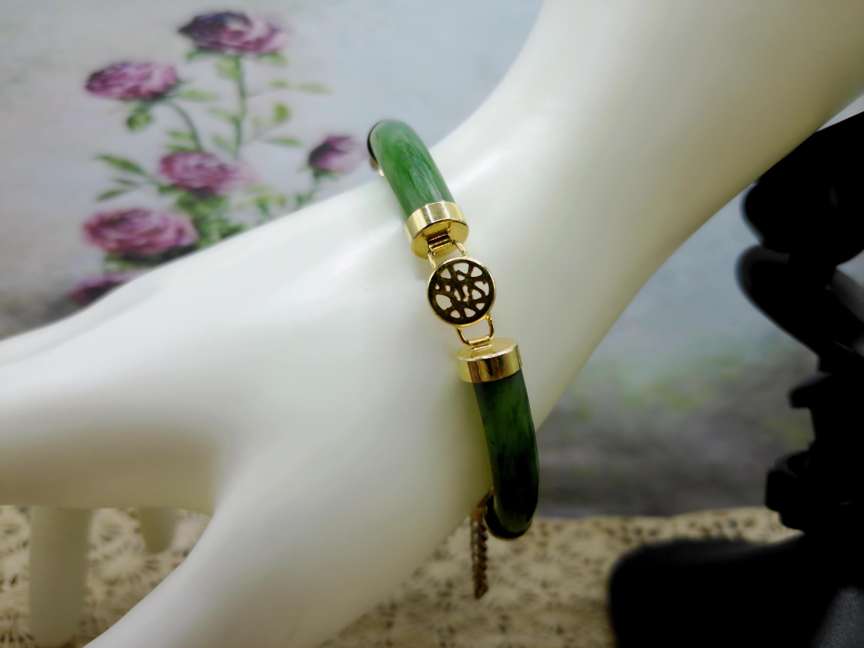 Inside, you will find a lovely collection consisting of a hand knotted medium spinach green 8mm jade beaded necklace that is 18 inches in length with a gold filled clasp, a pair of gold tone dangle medium green jade earrings with Chinese markings at the top; I believe they may be the signs for prosperity. A beautiful jade tube bracelet with round Chinese emblems set in between each jade tube. This bracelet is closer to a dark spinach green color with some variations of color in the jade. And finally, a wonderful convertible butterfly brooch that has bright red eyes and dark green jade wings with gold trim.