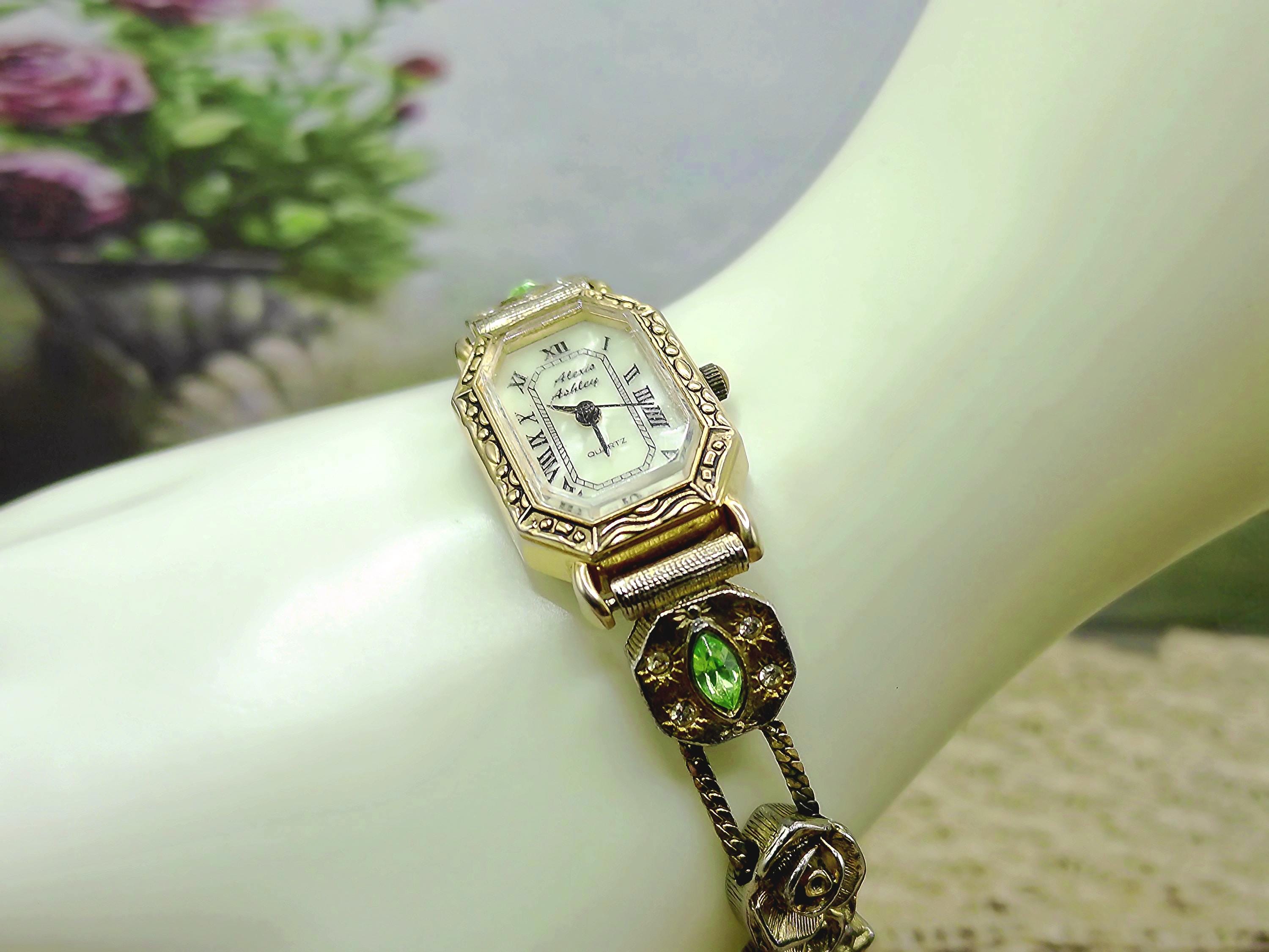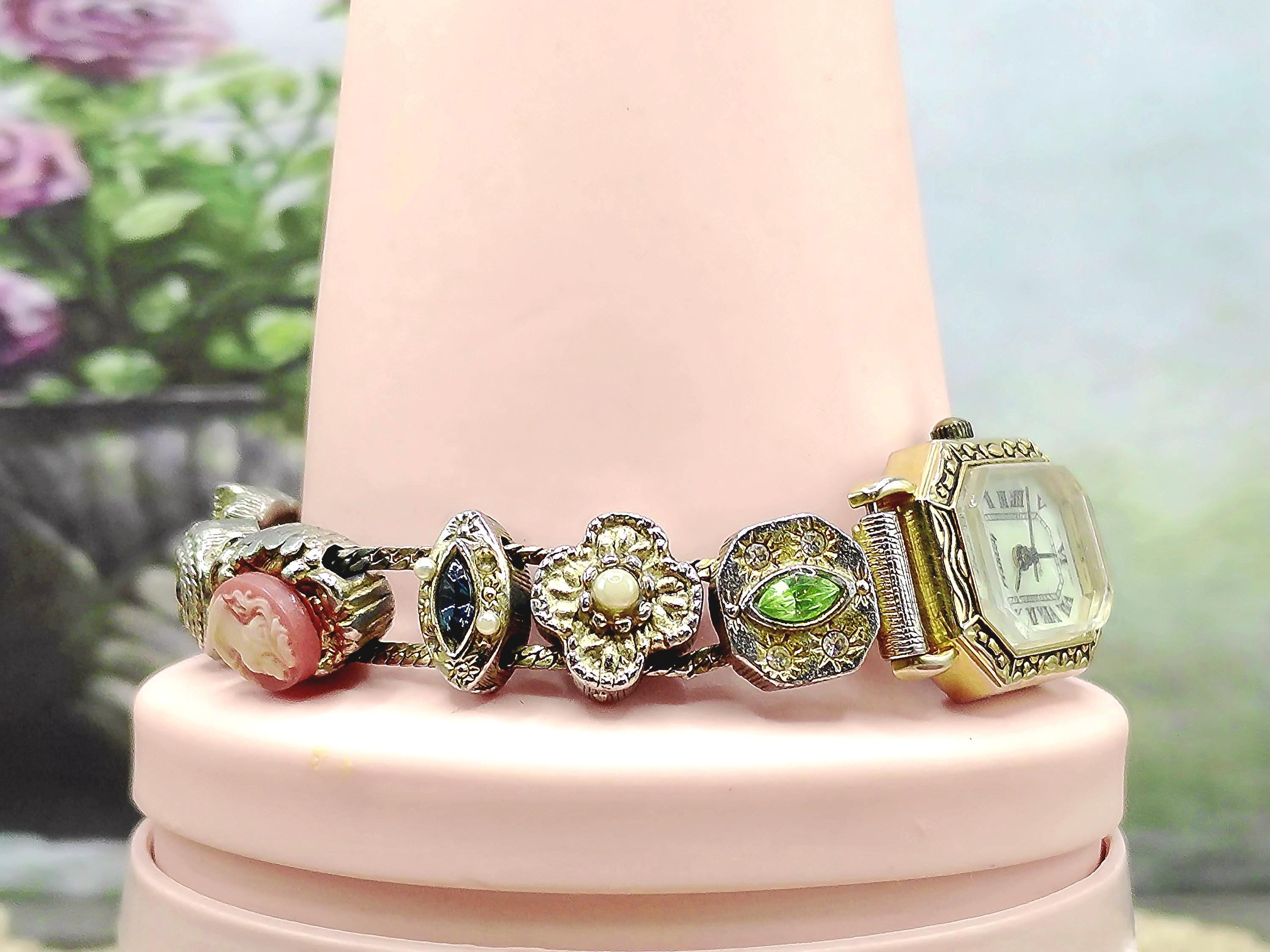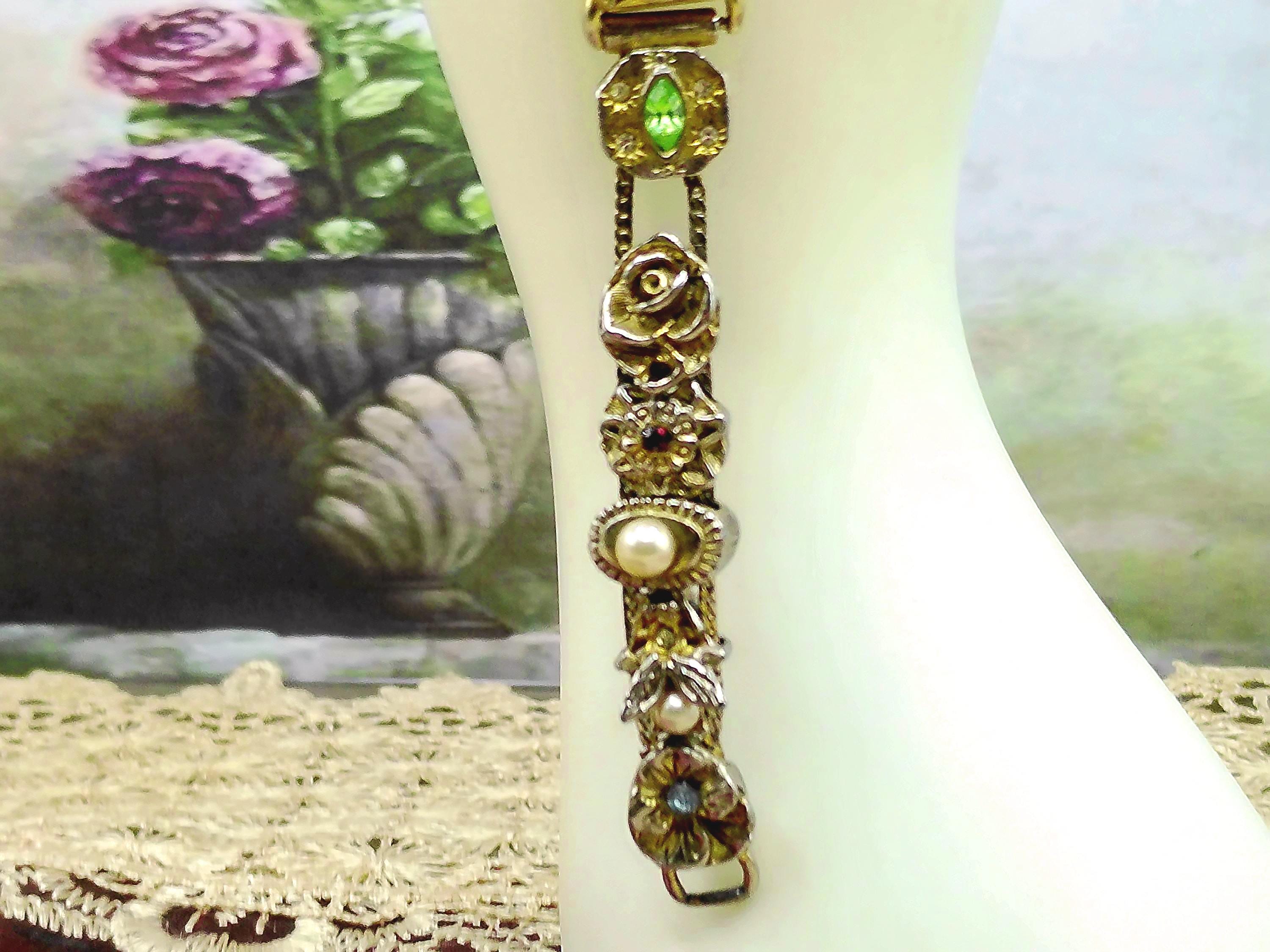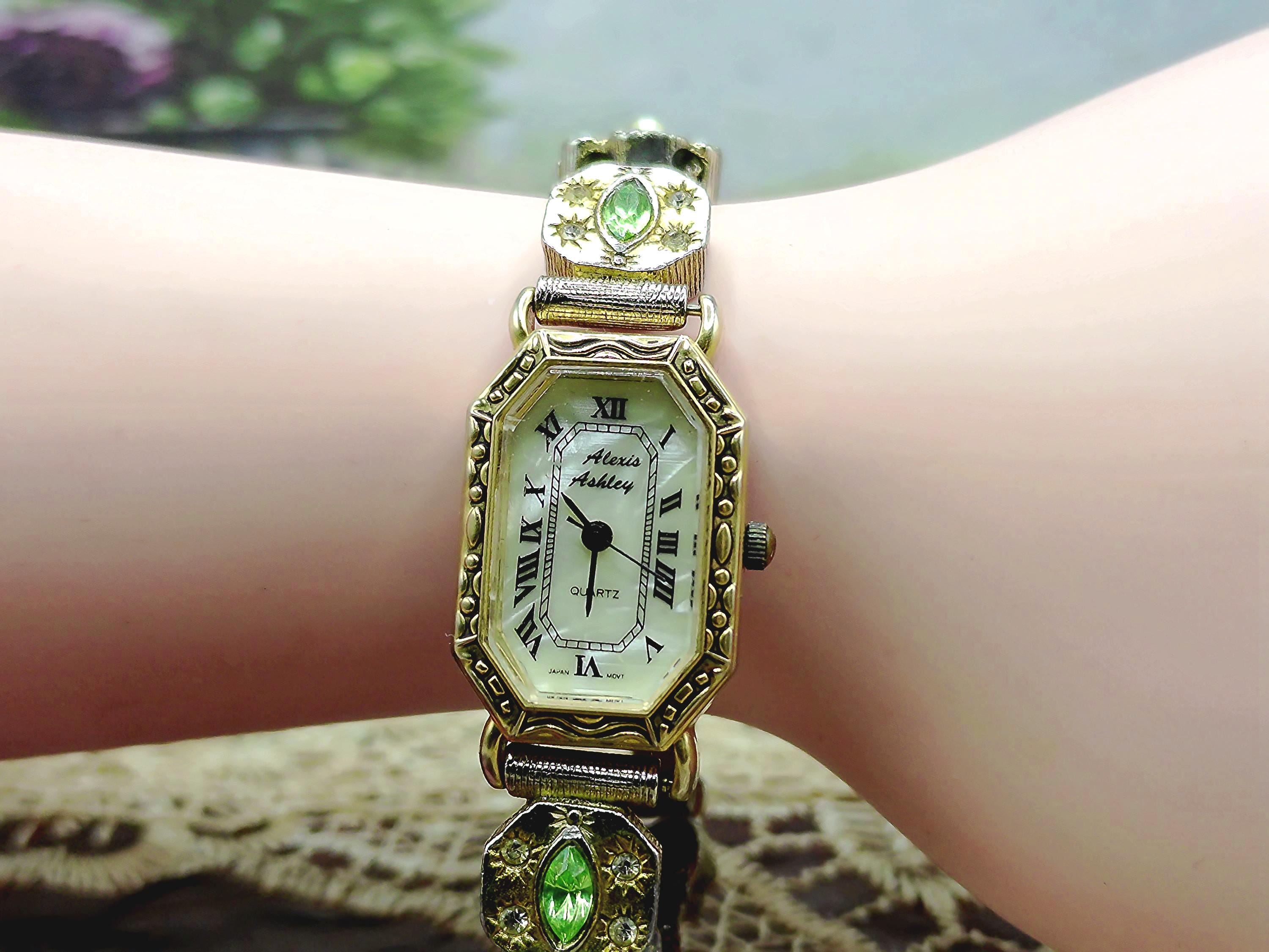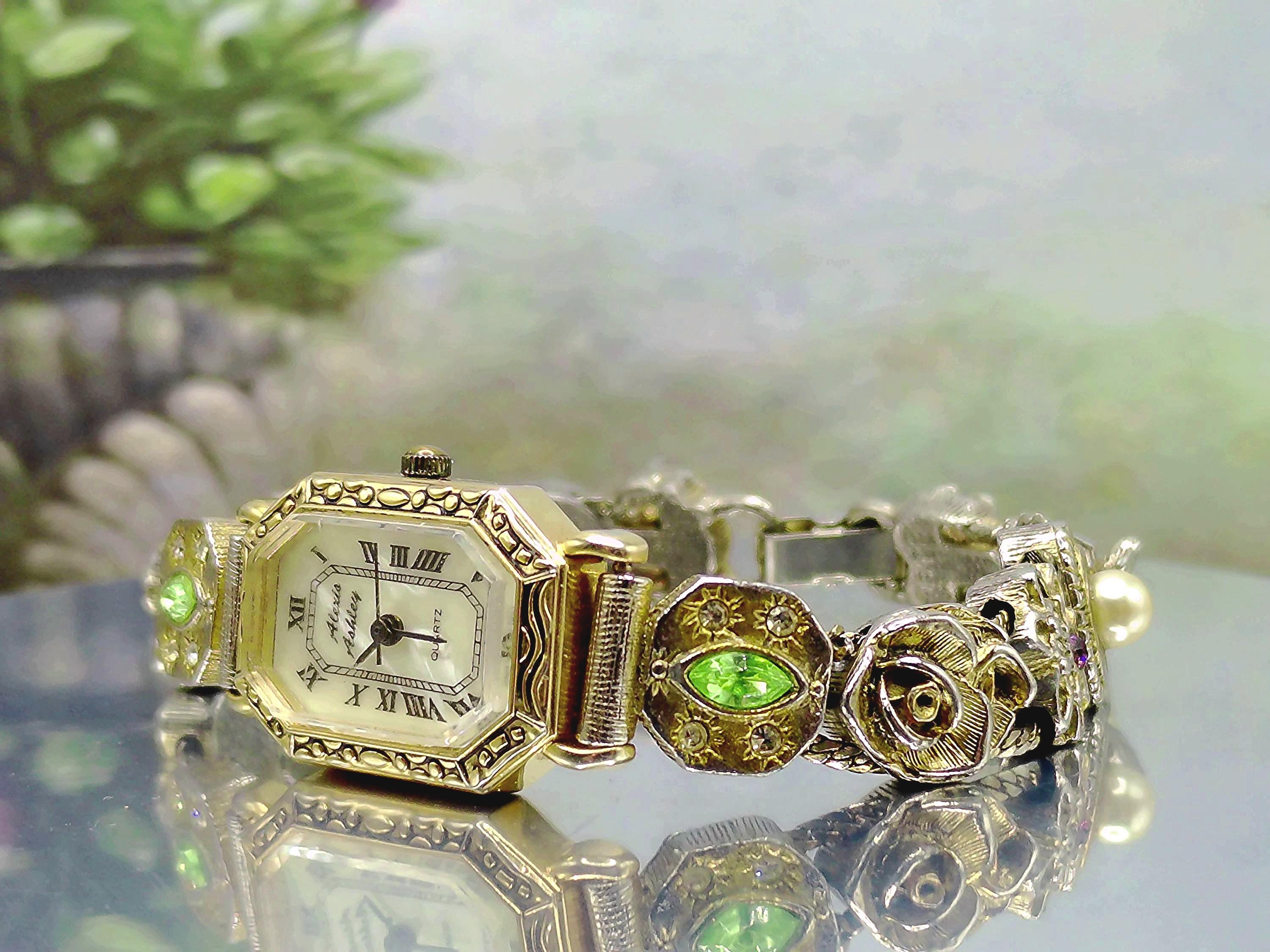This is a lovely vintage antiqued golden Alexis Ashley wrist watch and it is in very nice condition. The slide charm band has a total of 12 charms (6 on each side of the watch case) and all gemstones and pearls are intact. This watch measures 7 inches in length. It is a quartz wristwatch with a Japanese Movement. The hands are black as well as the hourly numbers and the face has a lovely mother of pearl background. This is a beautiful, detailed wristwatch that is quite stunning!!