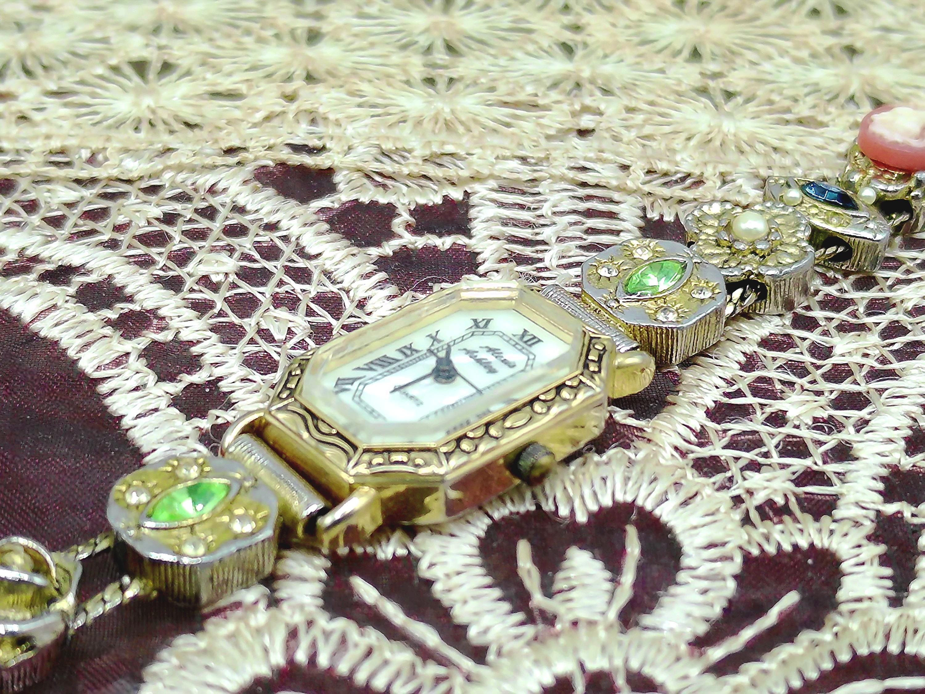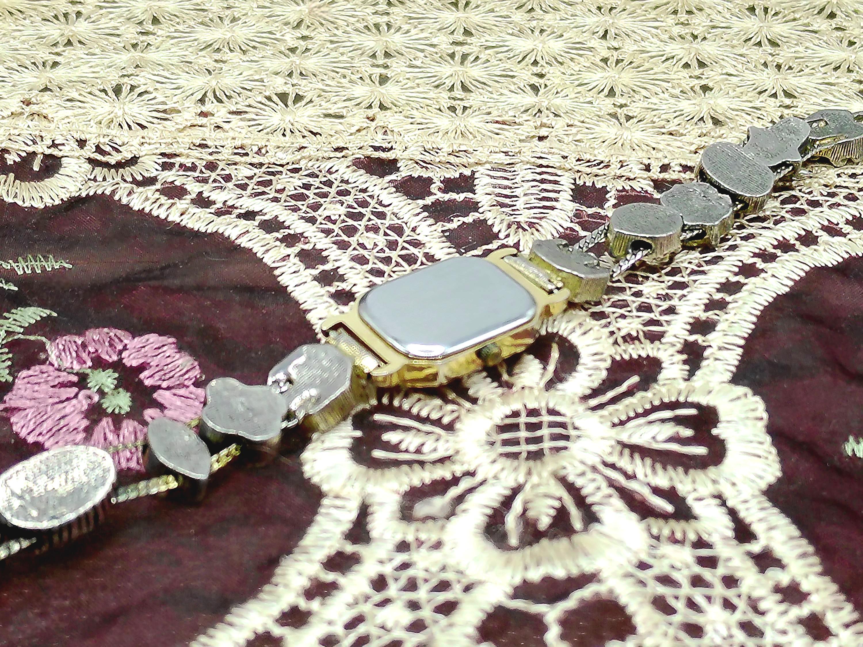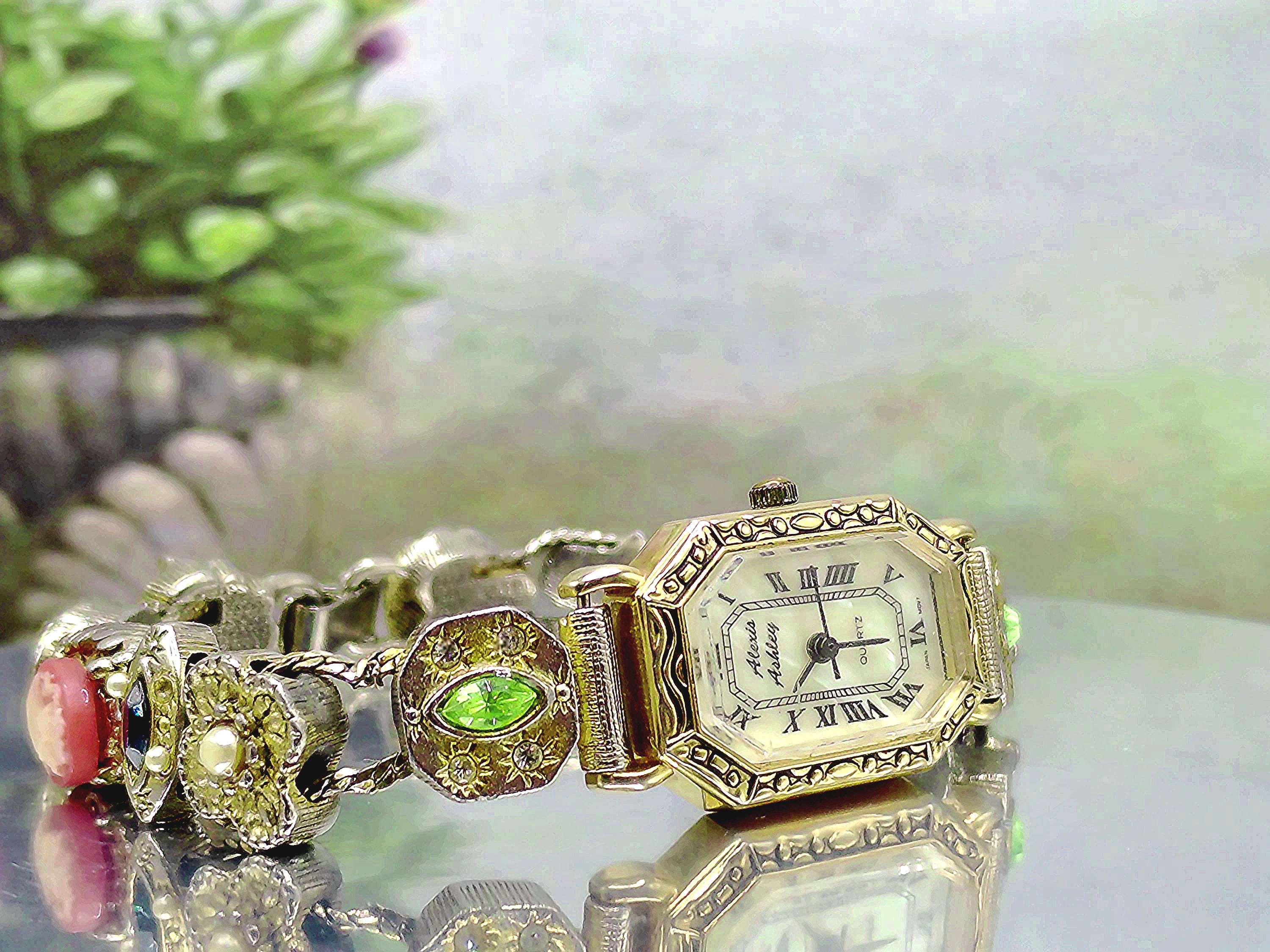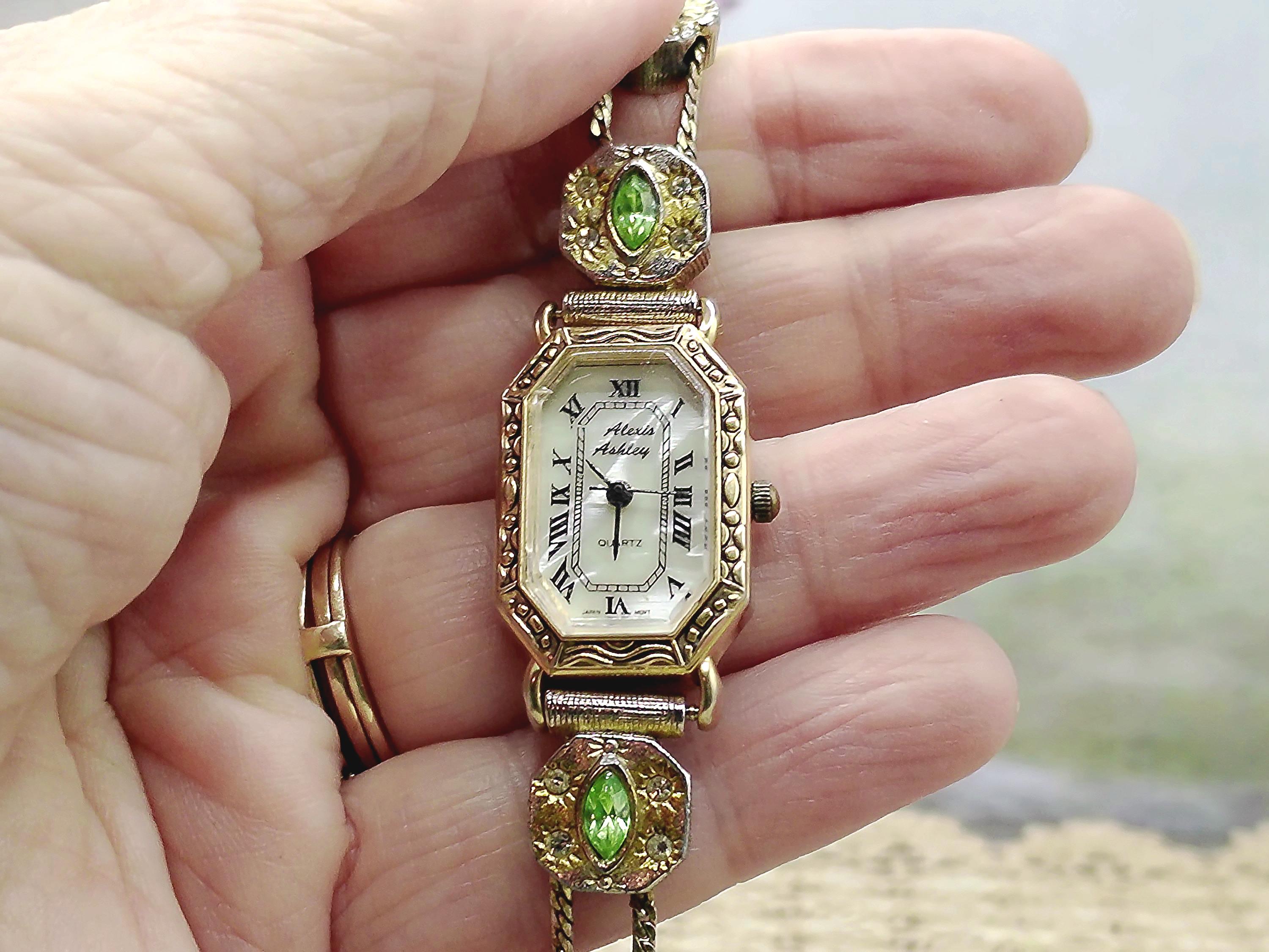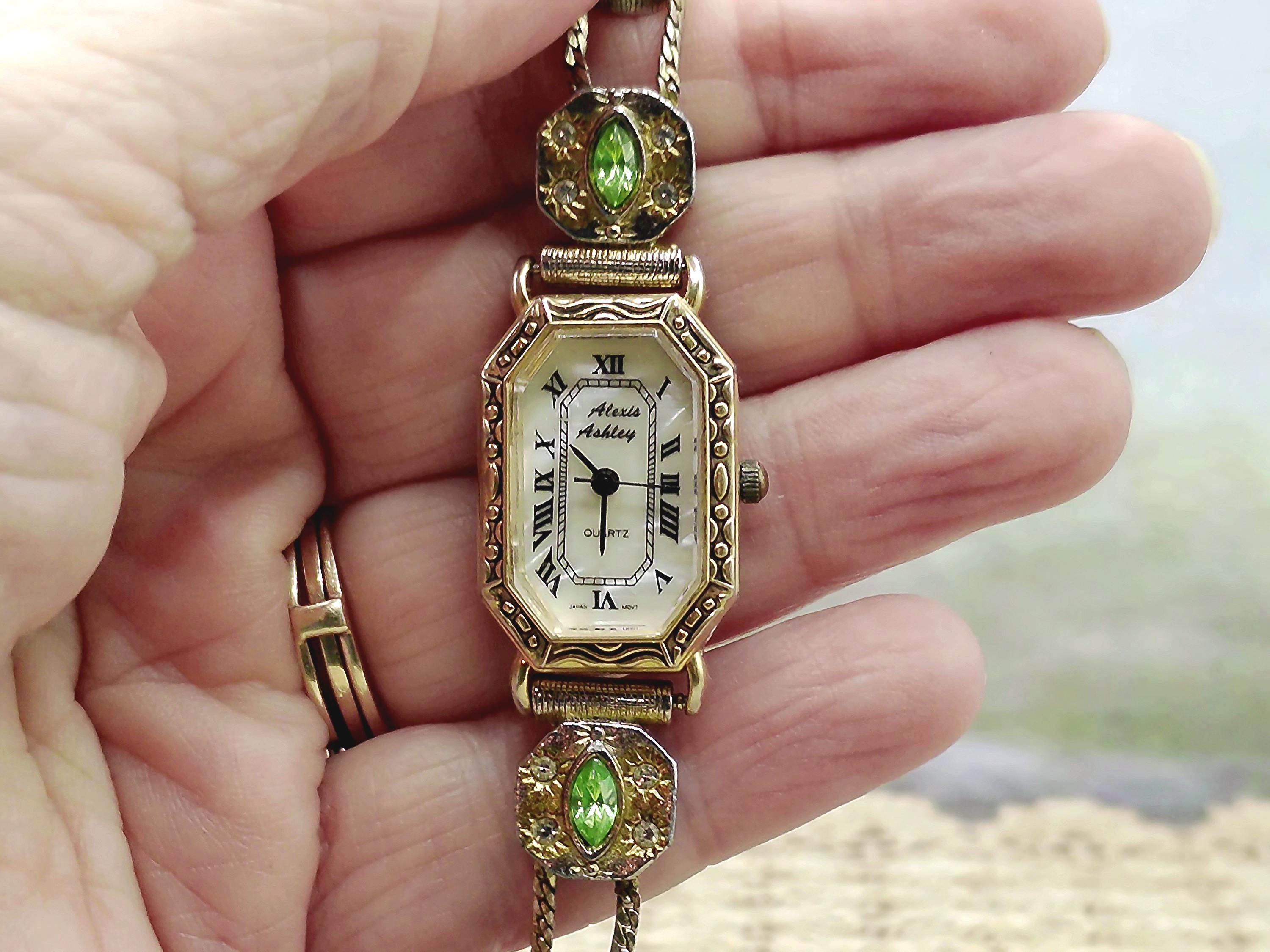 This is a lovely vintage antiqued golden Alexis Ashley wrist watch and it is in very nice condition. The slide charm band has a total of 12 charms (6 on each side of the watch case) and all gemstones and pearls are intact. This watch measures 7 inches in length. It is a quartz wristwatch with a Japanese Movement. The hands are black as well as the hourly numbers and the face has a lovely mother of pearl background. This is a beautiful, detailed wristwatch that is quite stunning!!