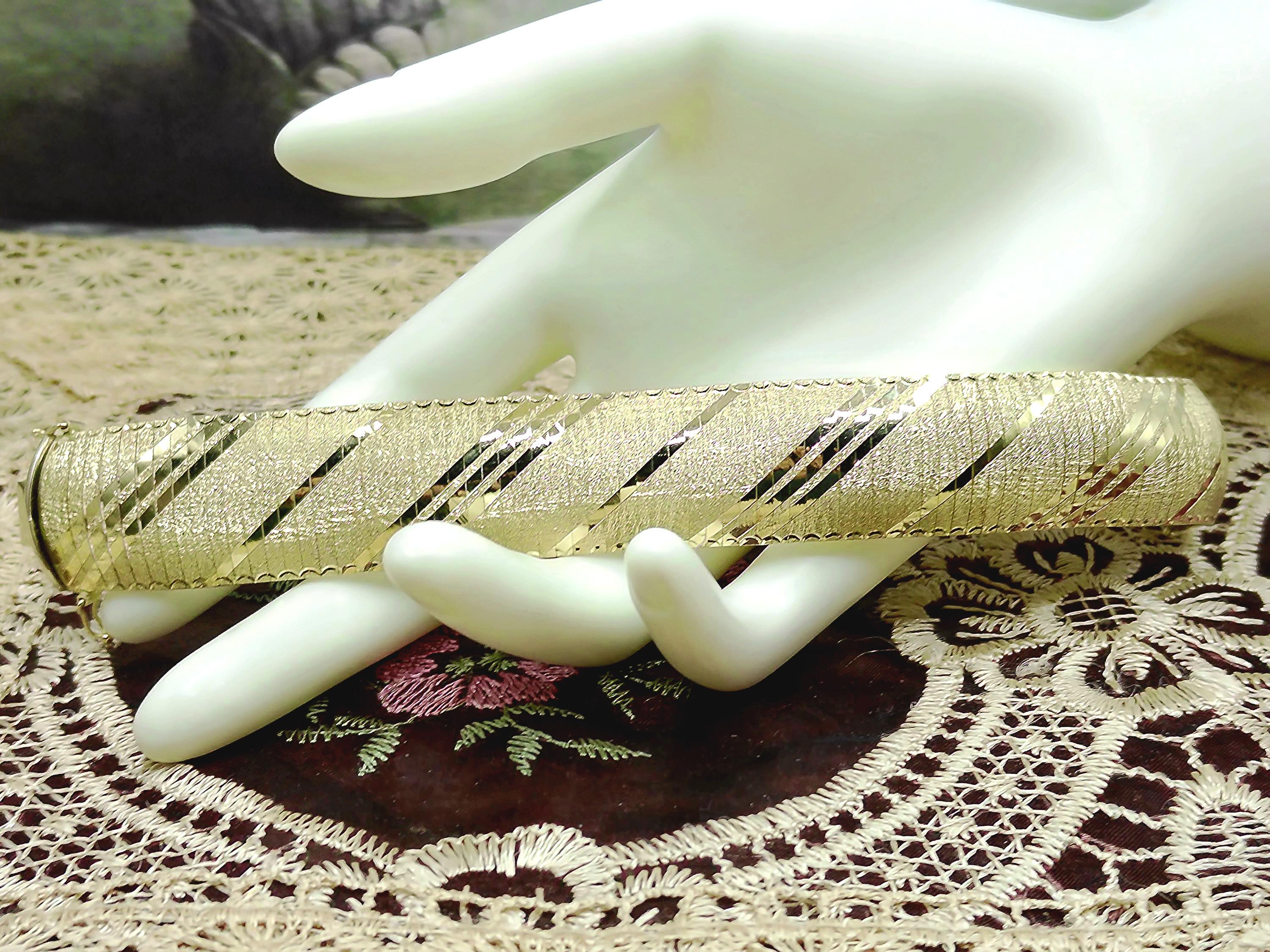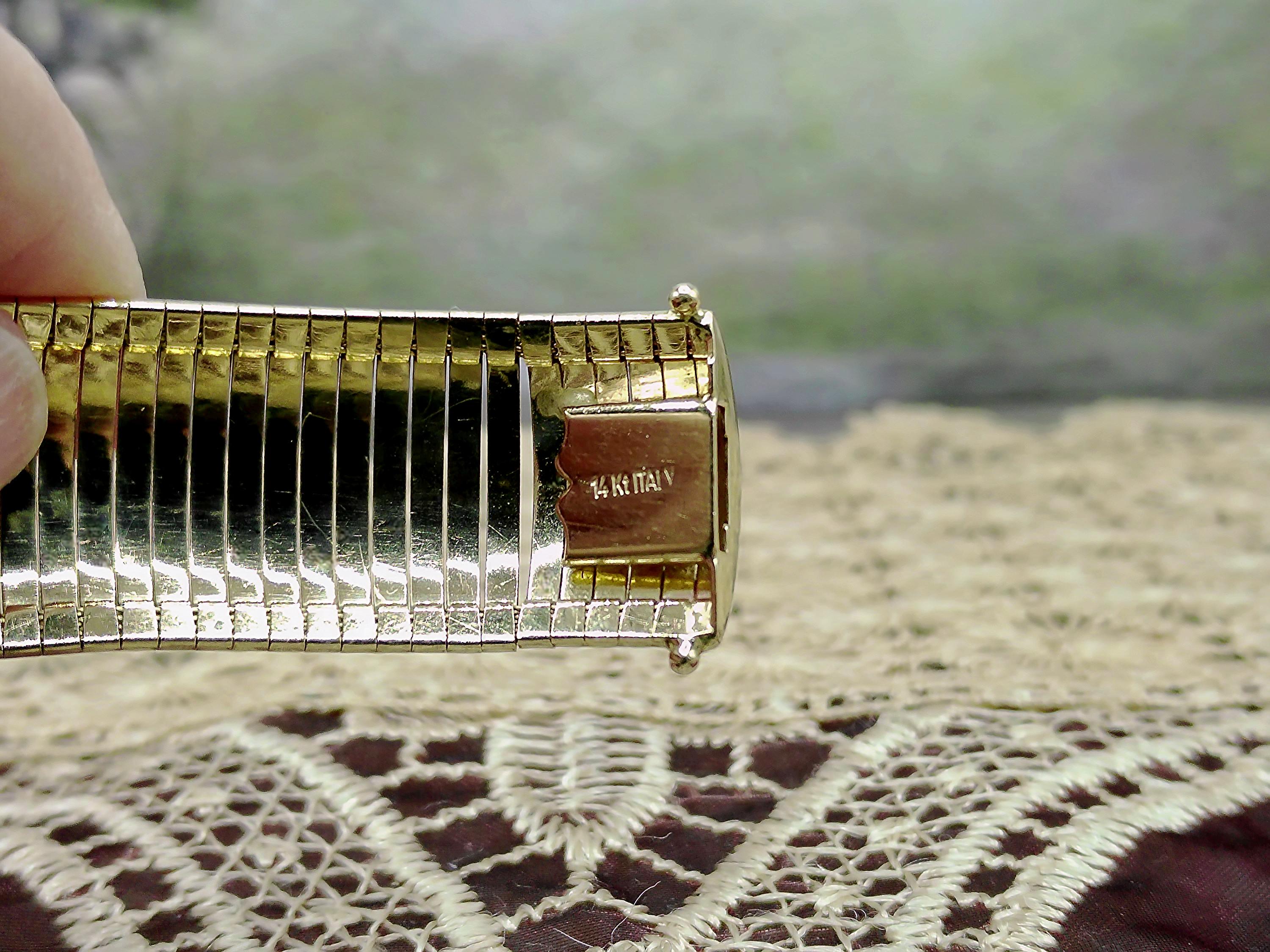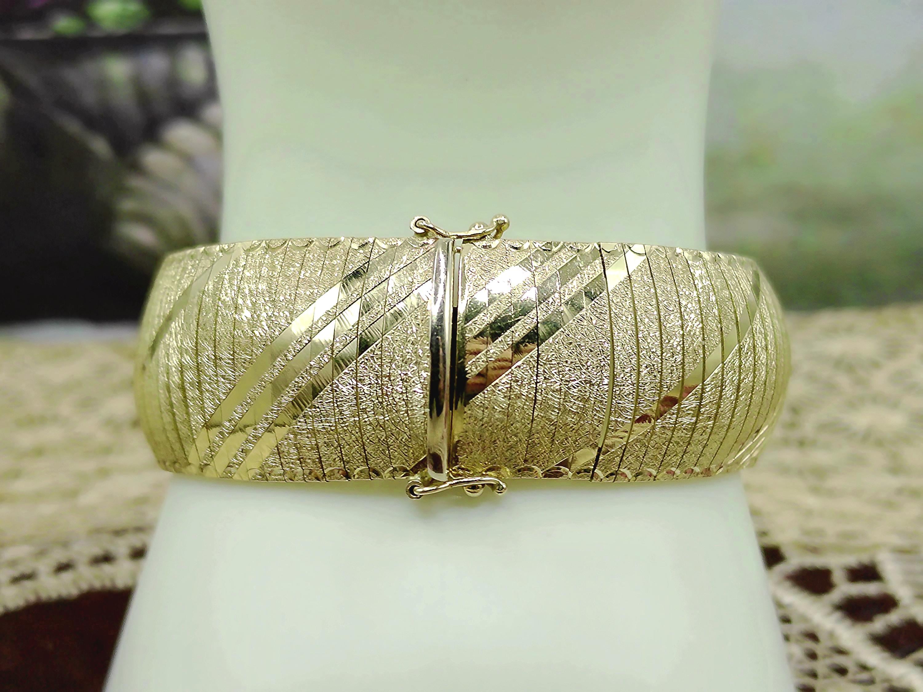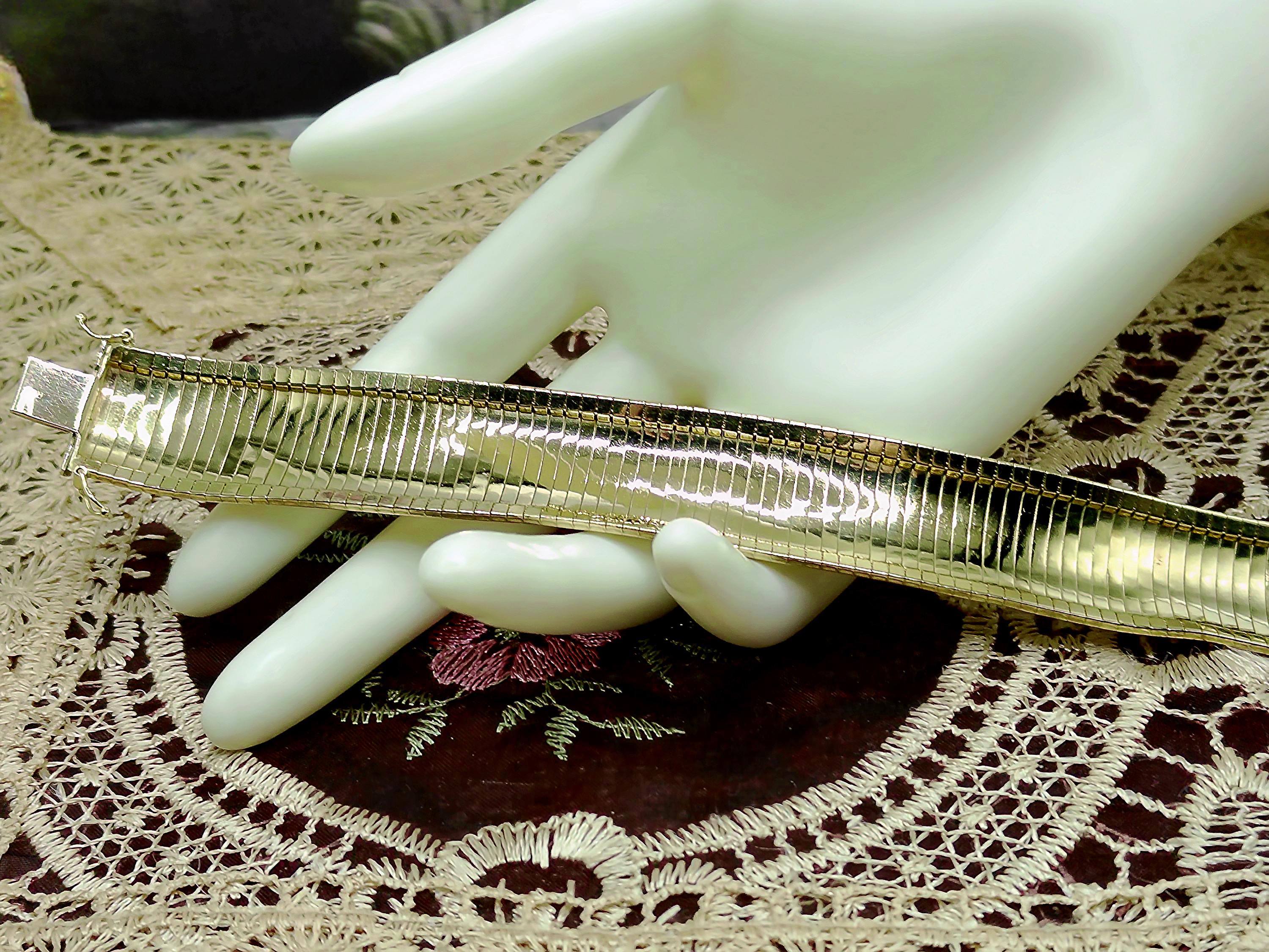 This is a gorgeous and elegant wide 14K Yellow Gold Italian Bracelet that has a beautiful geometric pattern throughout. This bracelet has tight thin links that are tightly held together with hidden connectors. The clasp also has a hidden clasp that slides into the bracelet with 2 snap lock closures that ensures a secure fit. This is a wonderful bracelet that is sure to compliment any outfit or accessory! Very unique! Great Condition!