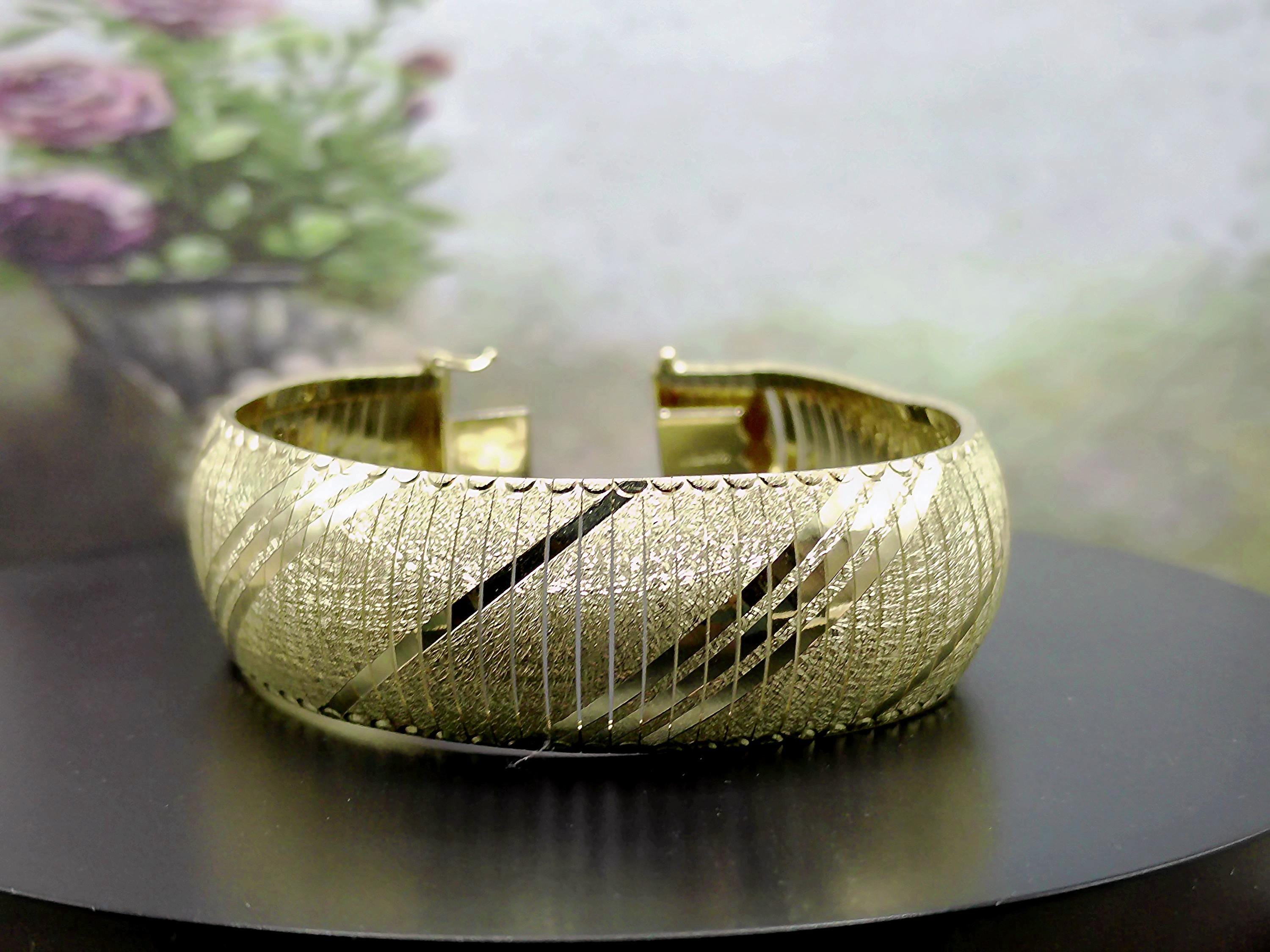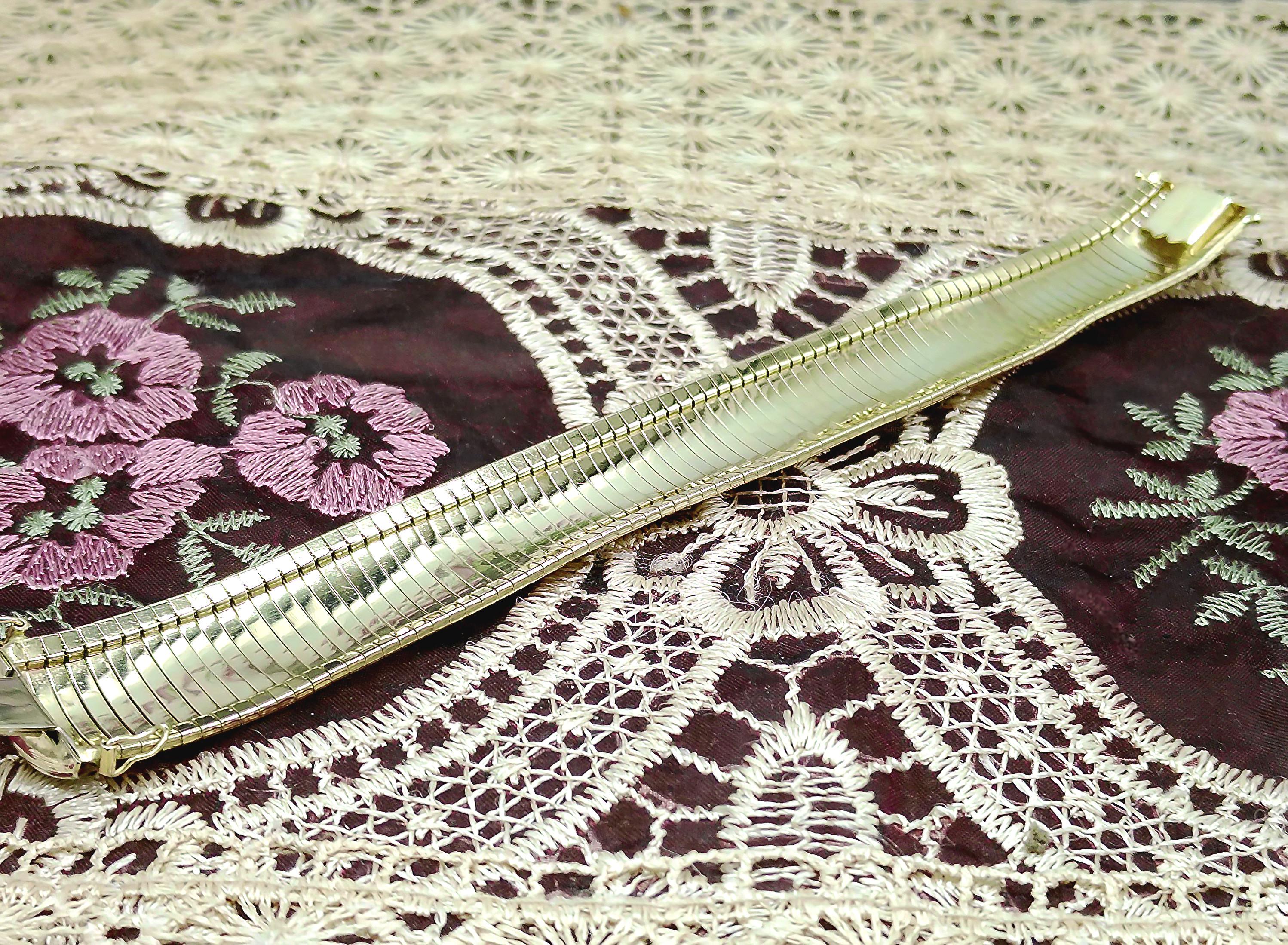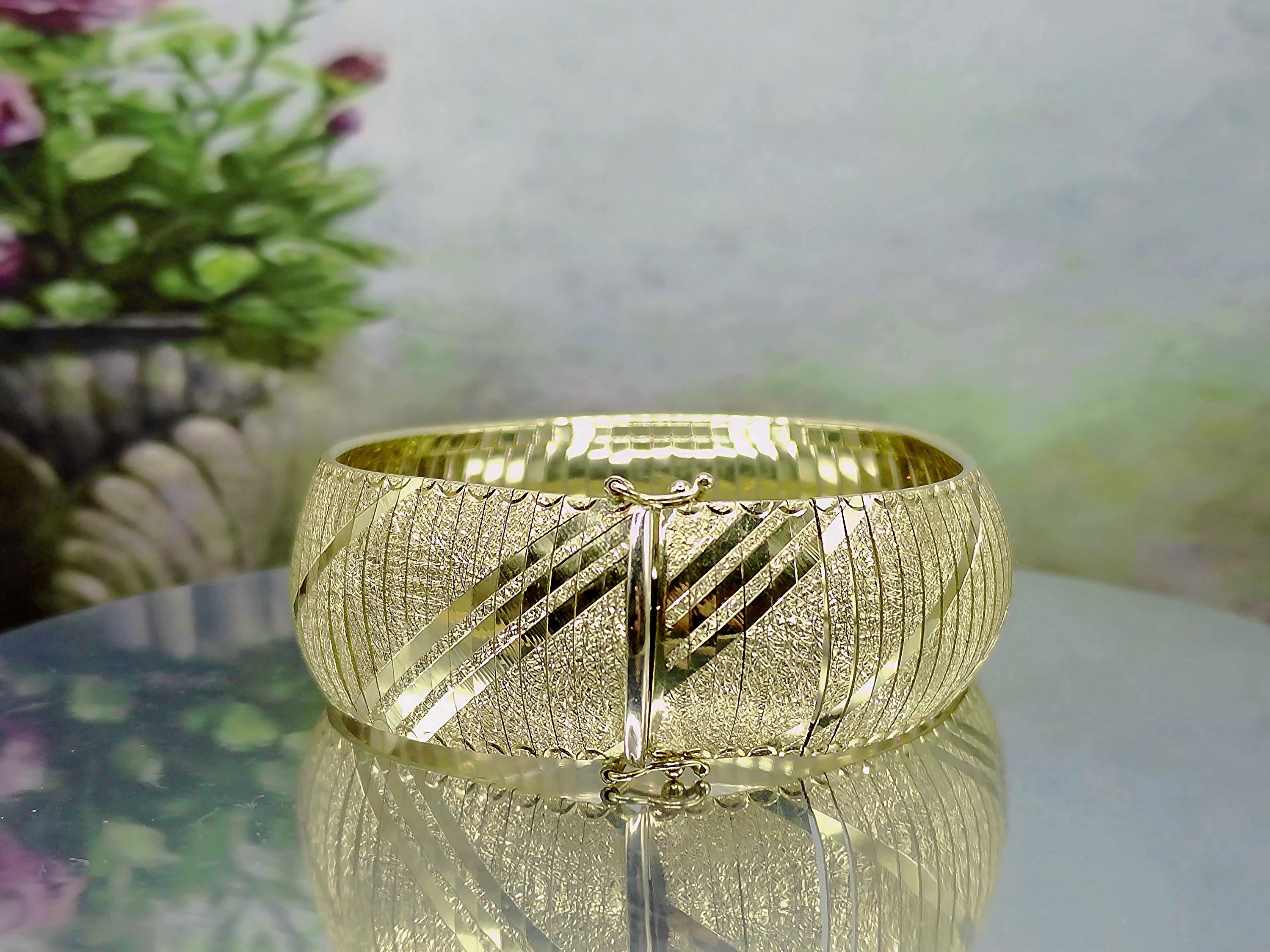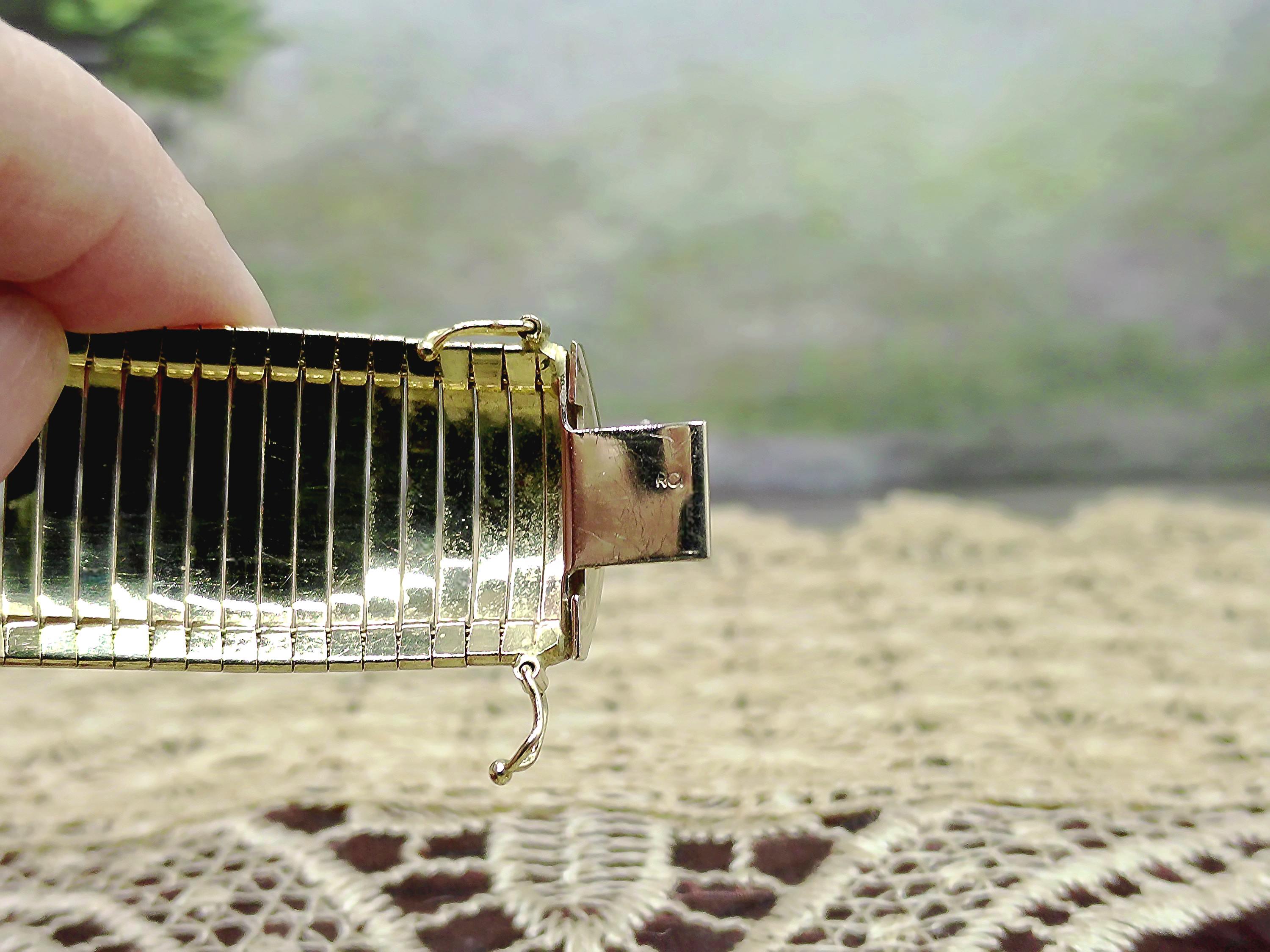 This is a gorgeous and elegant wide 14K Yellow Gold Italian Bracelet that has a beautiful geometric pattern throughout. This bracelet has tight thin links that are tightly held together with hidden connectors. The clasp also has a hidden clasp that slides into the bracelet with 2 snap lock closures that ensures a secure fit. This is a wonderful bracelet that is sure to compliment any outfit or accessory! Very unique! Great Condition!