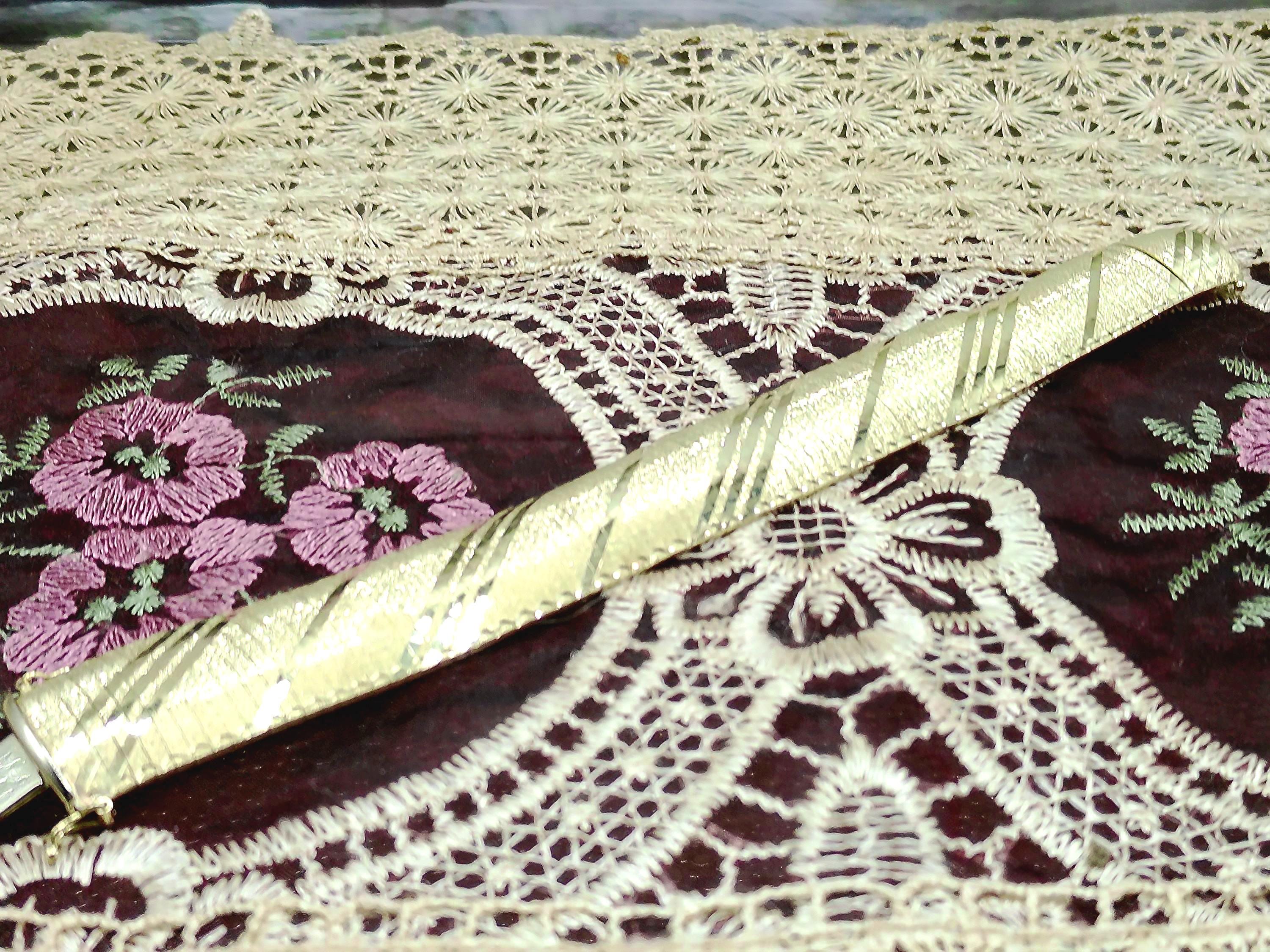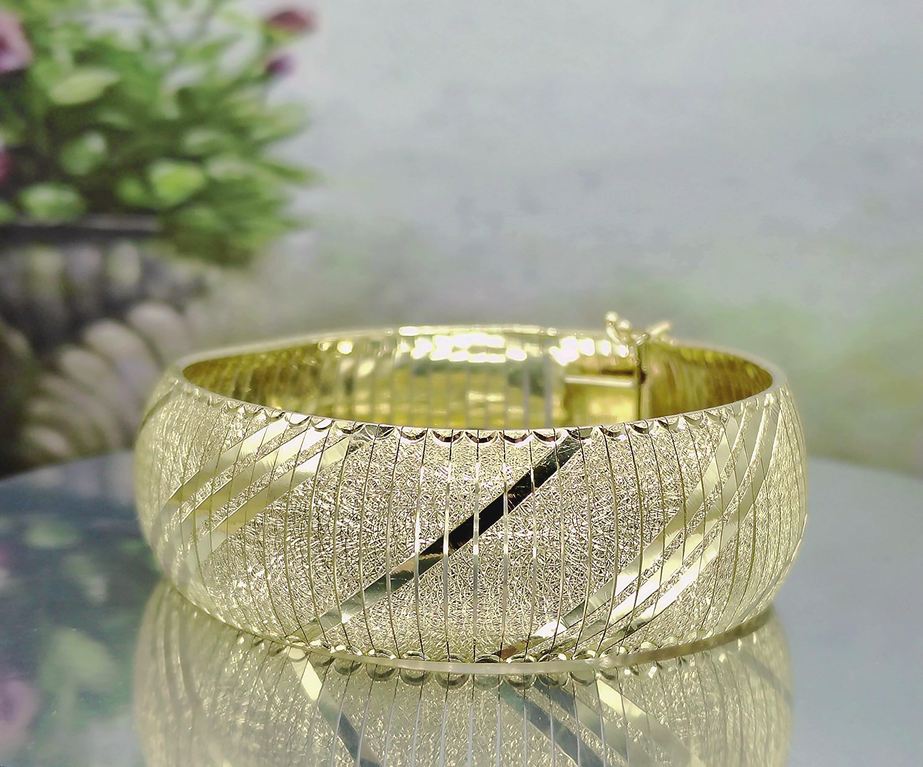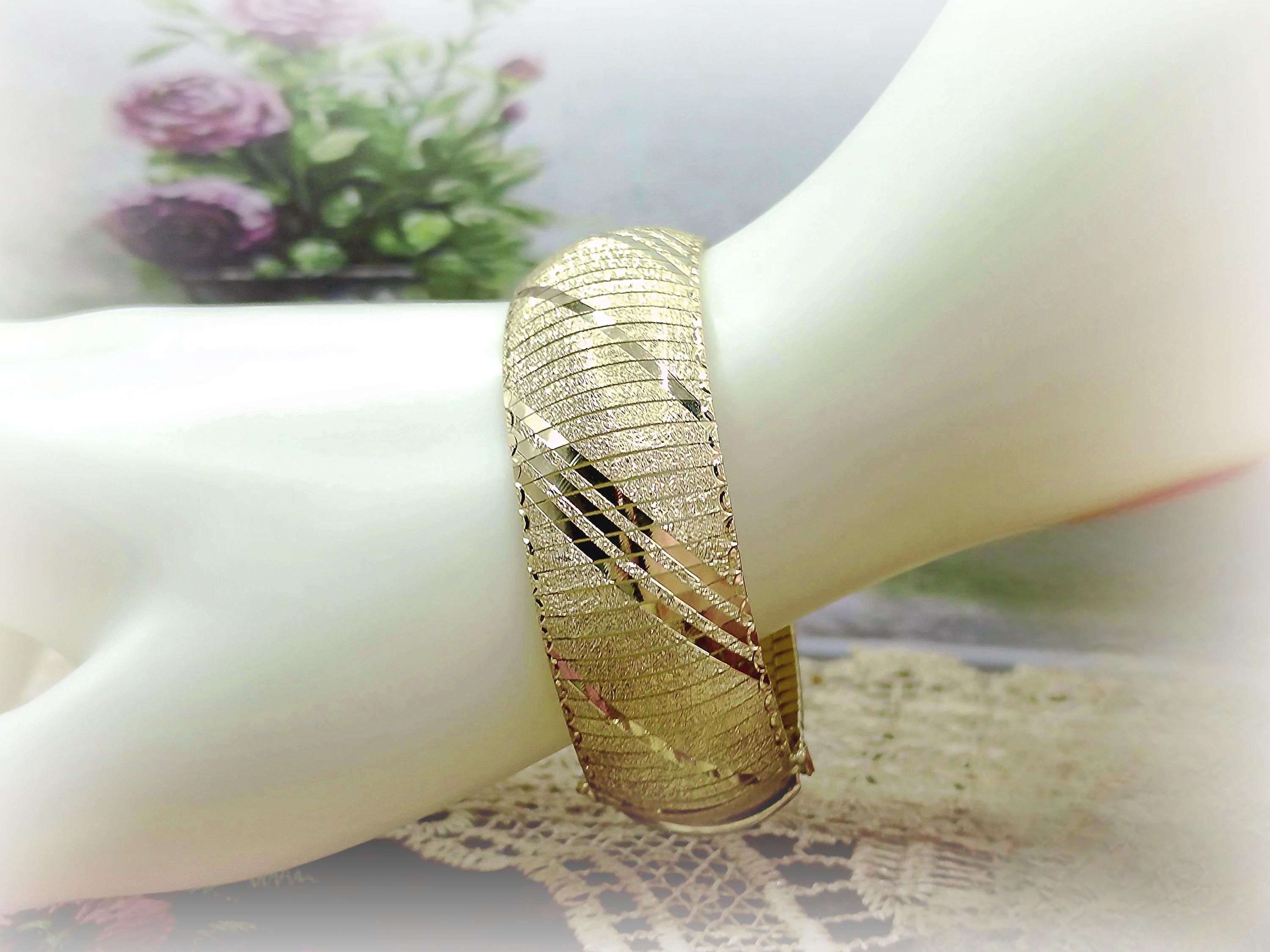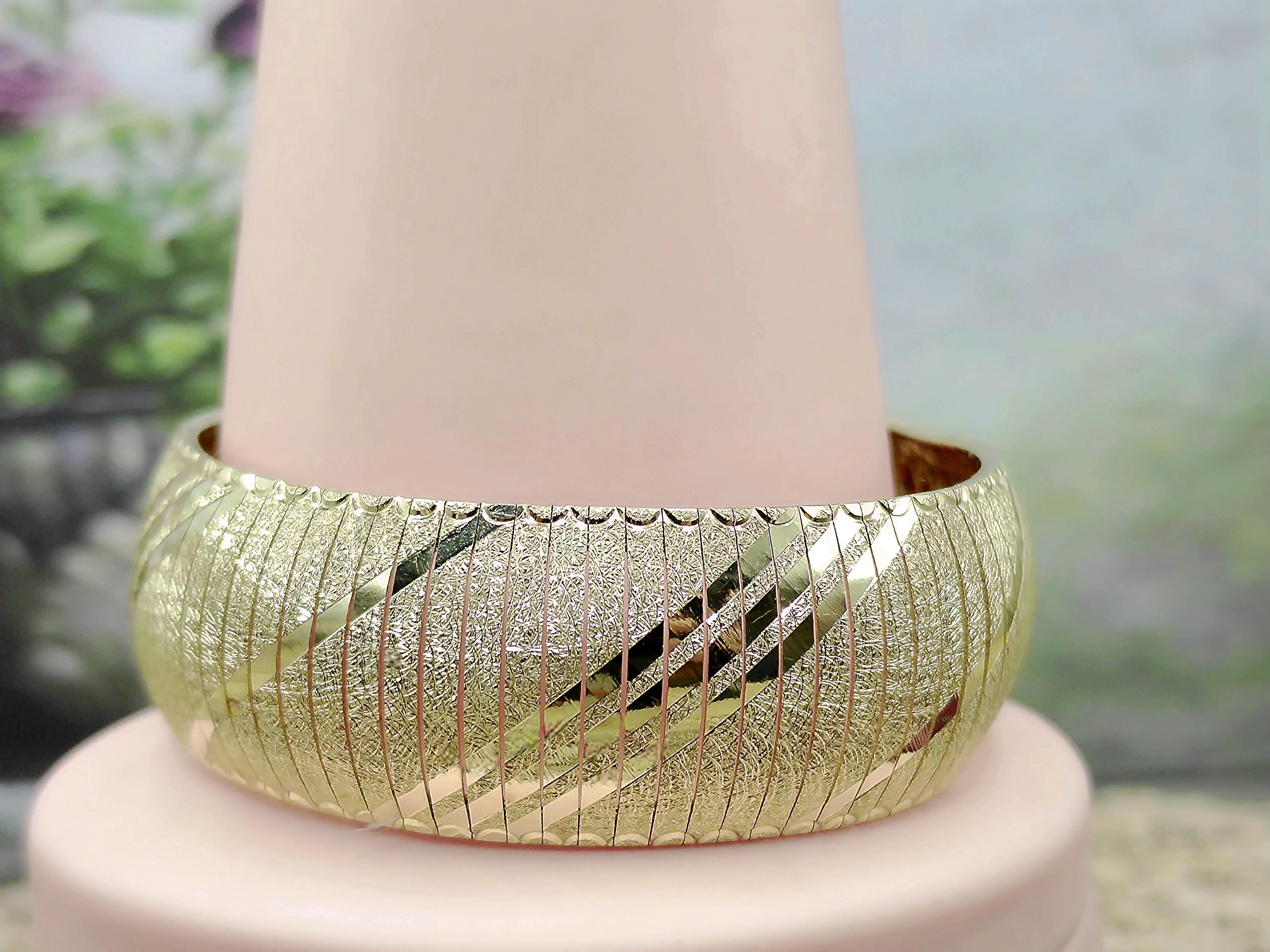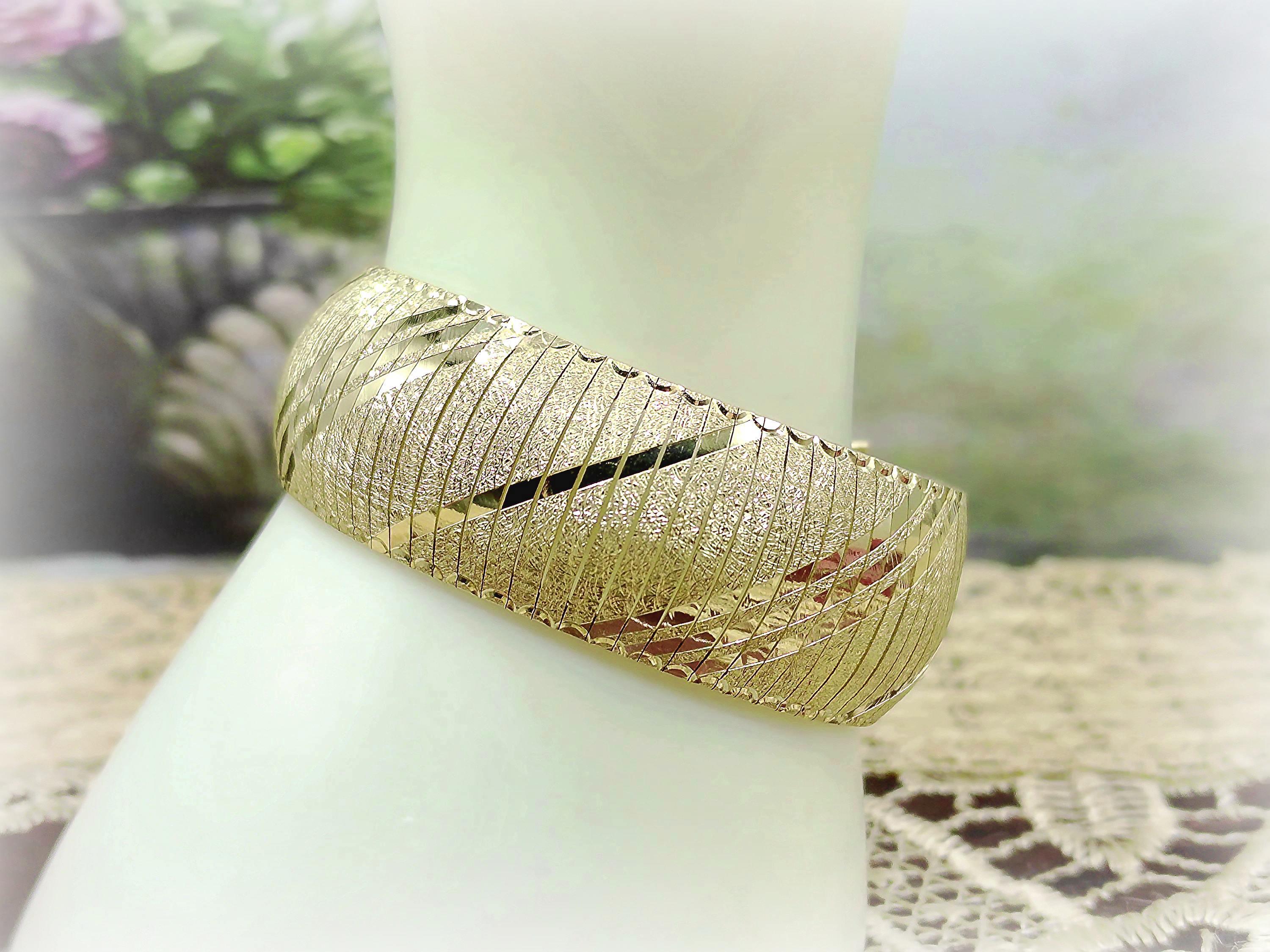 This is a gorgeous and elegant wide 14K Yellow Gold Italian Bracelet that has a beautiful geometric pattern throughout. This bracelet has tight thin links that are tightly held together with hidden connectors. The clasp also has a hidden clasp that slides into the bracelet with 2 snap lock closures that ensures a secure fit. This is a wonderful bracelet that is sure to compliment any outfit or accessory! Very unique! Great Condition!