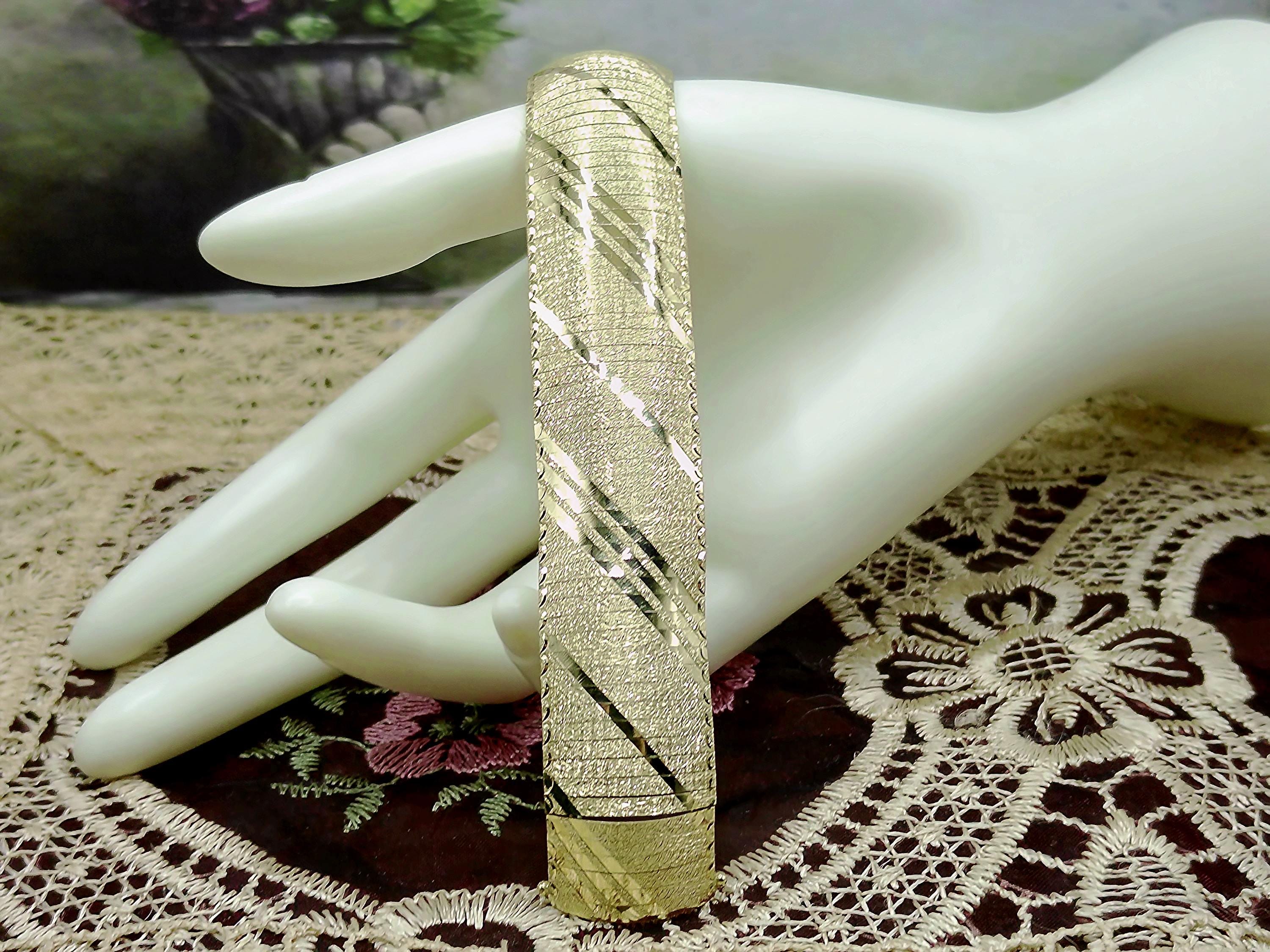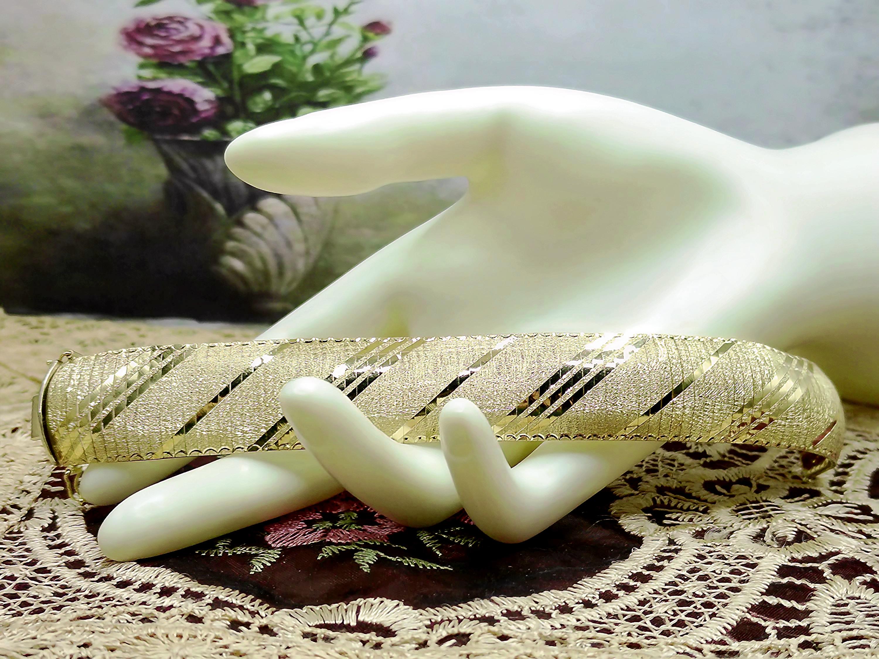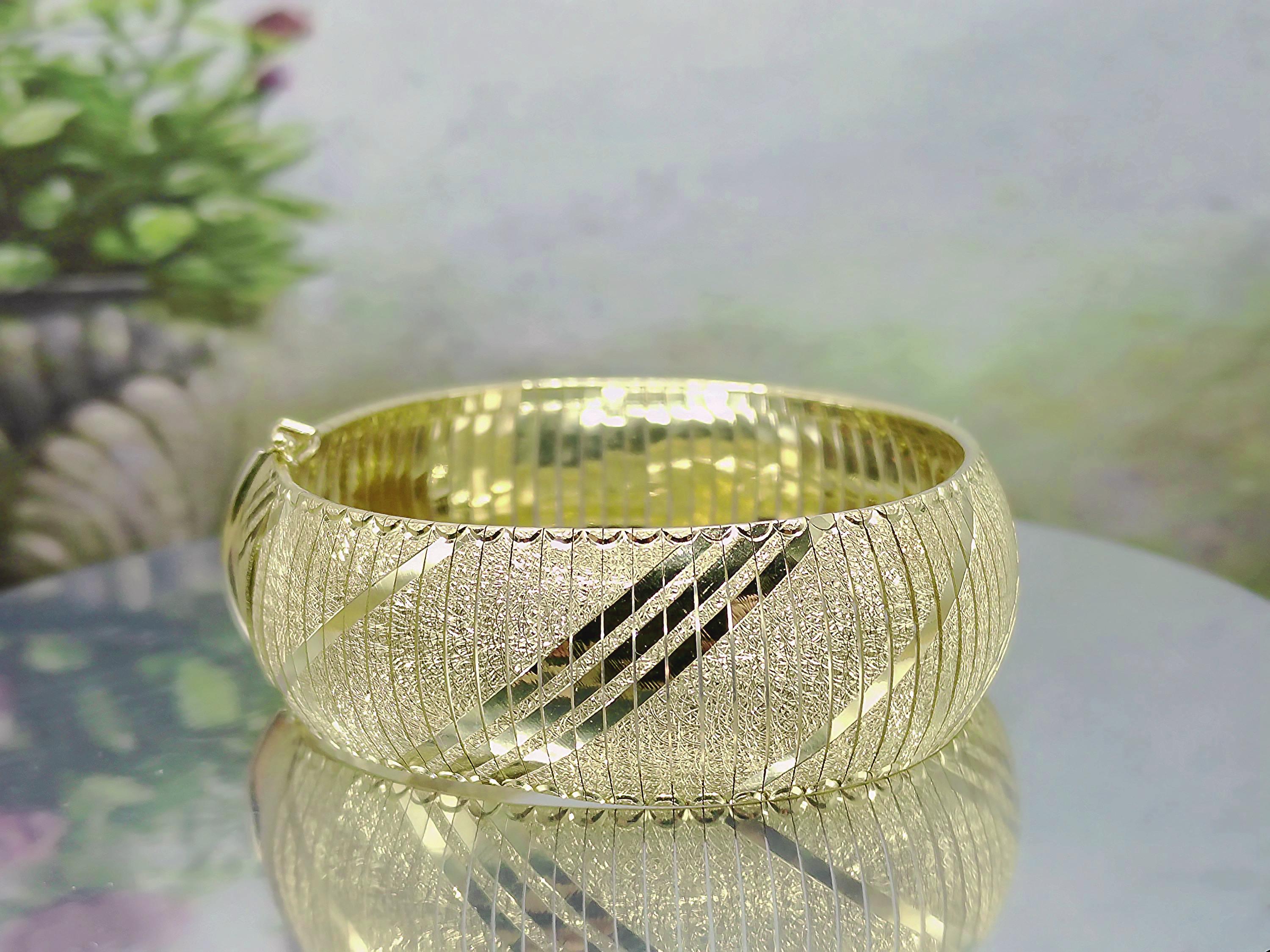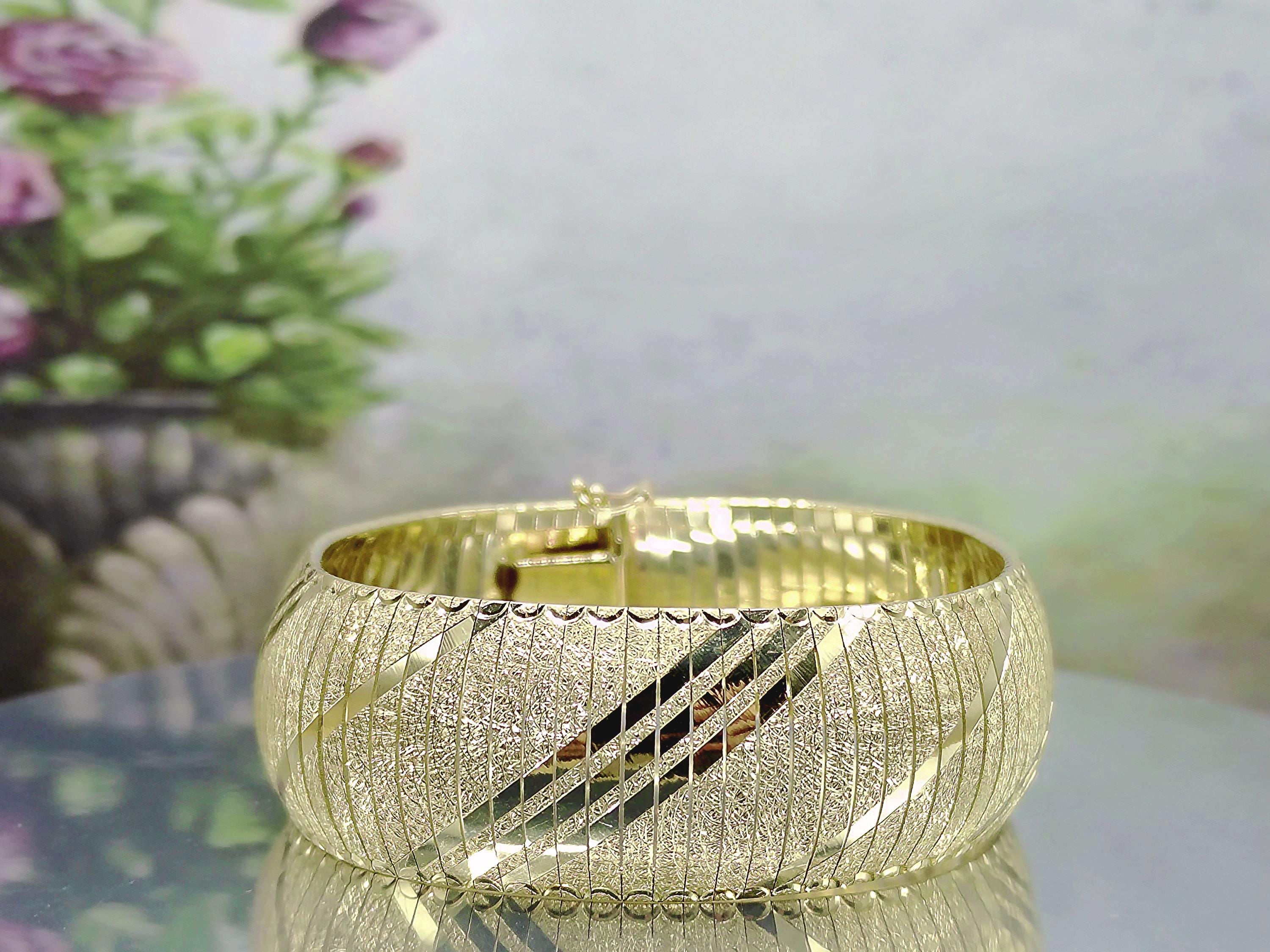 This is a gorgeous and elegant wide 14K Yellow Gold Italian Bracelet that has a beautiful geometric pattern throughout. This bracelet has tight thin links that are tightly held together with hidden connectors. The clasp also has a hidden clasp that slides into the bracelet with 2 snap lock closures that ensures a secure fit. This is a wonderful bracelet that is sure to compliment any outfit or accessory! Very unique! Great Condition!