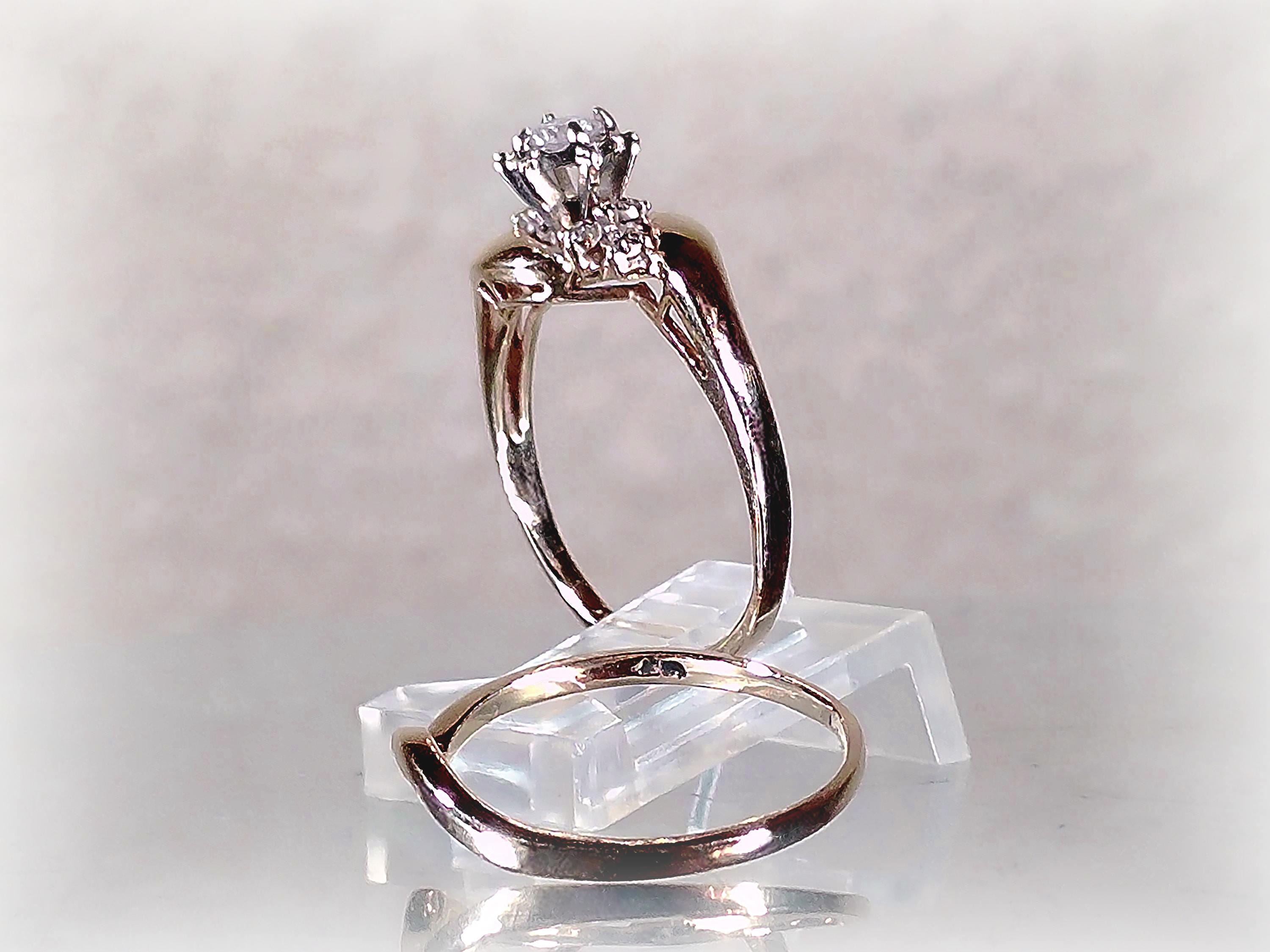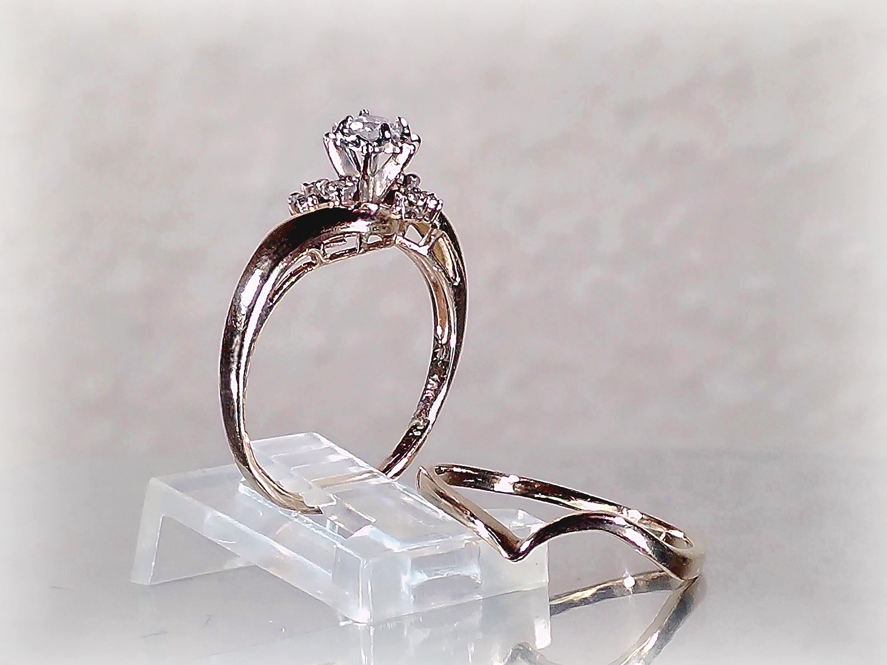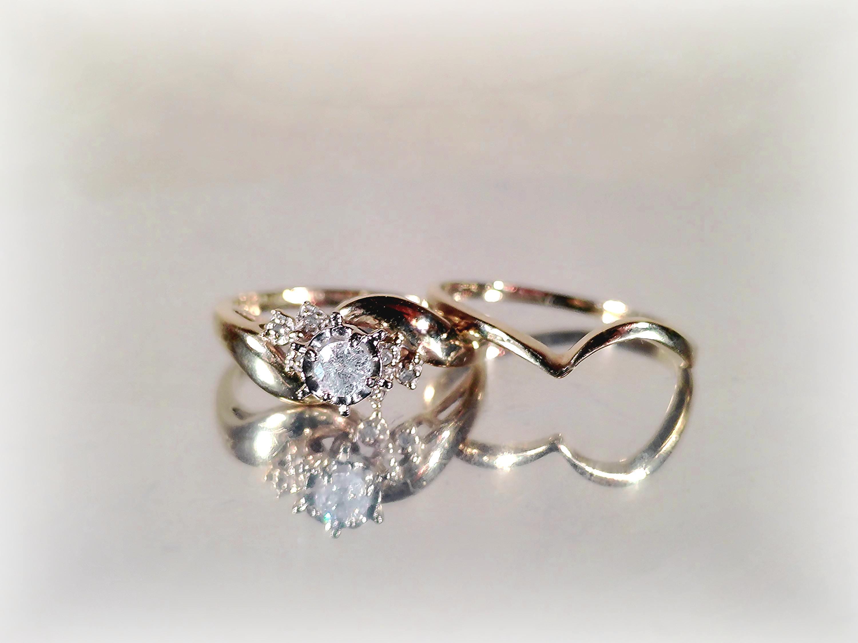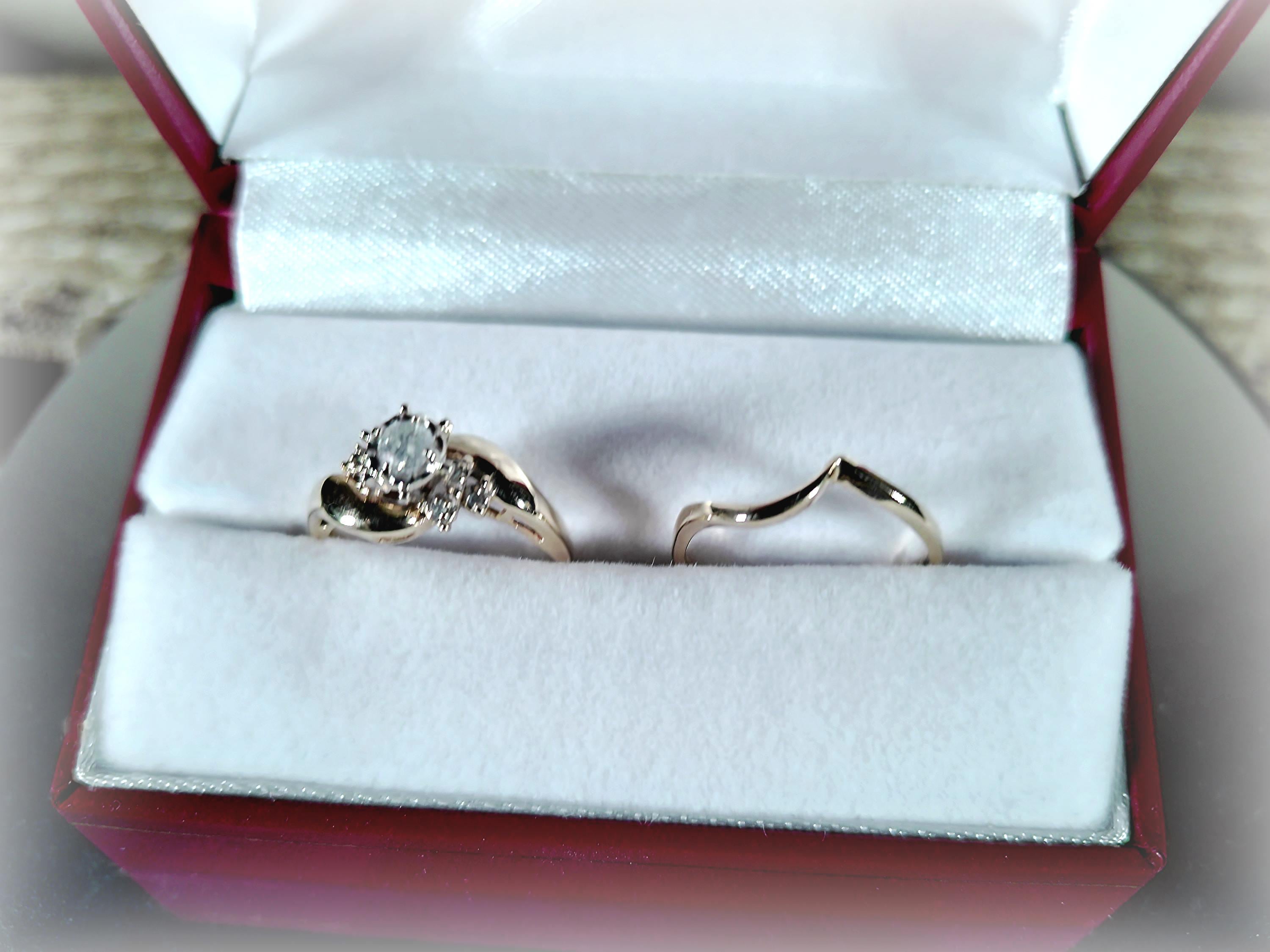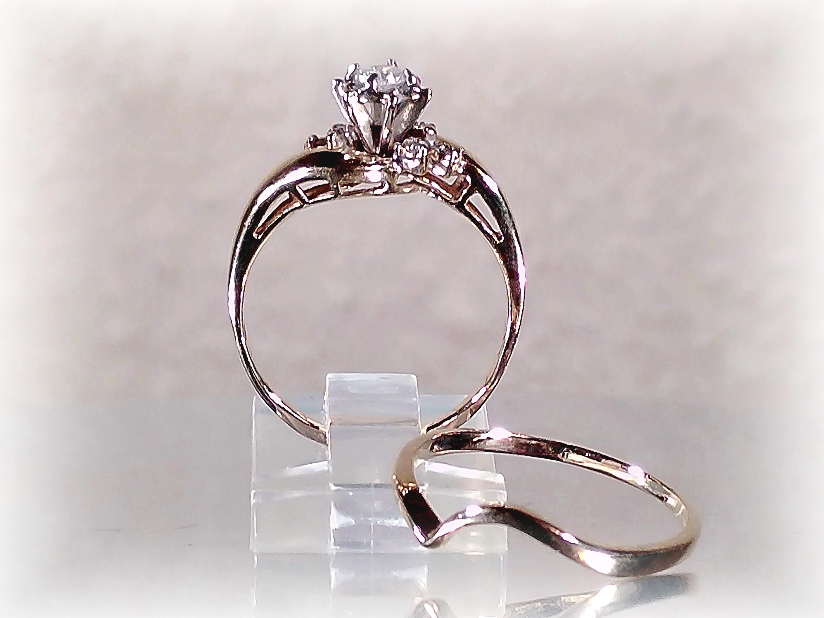 Vintage Bridal Ring Set – Seven Genuine Diamond Engagement Ring with Contour Wedding Band – 10 Kt Gold