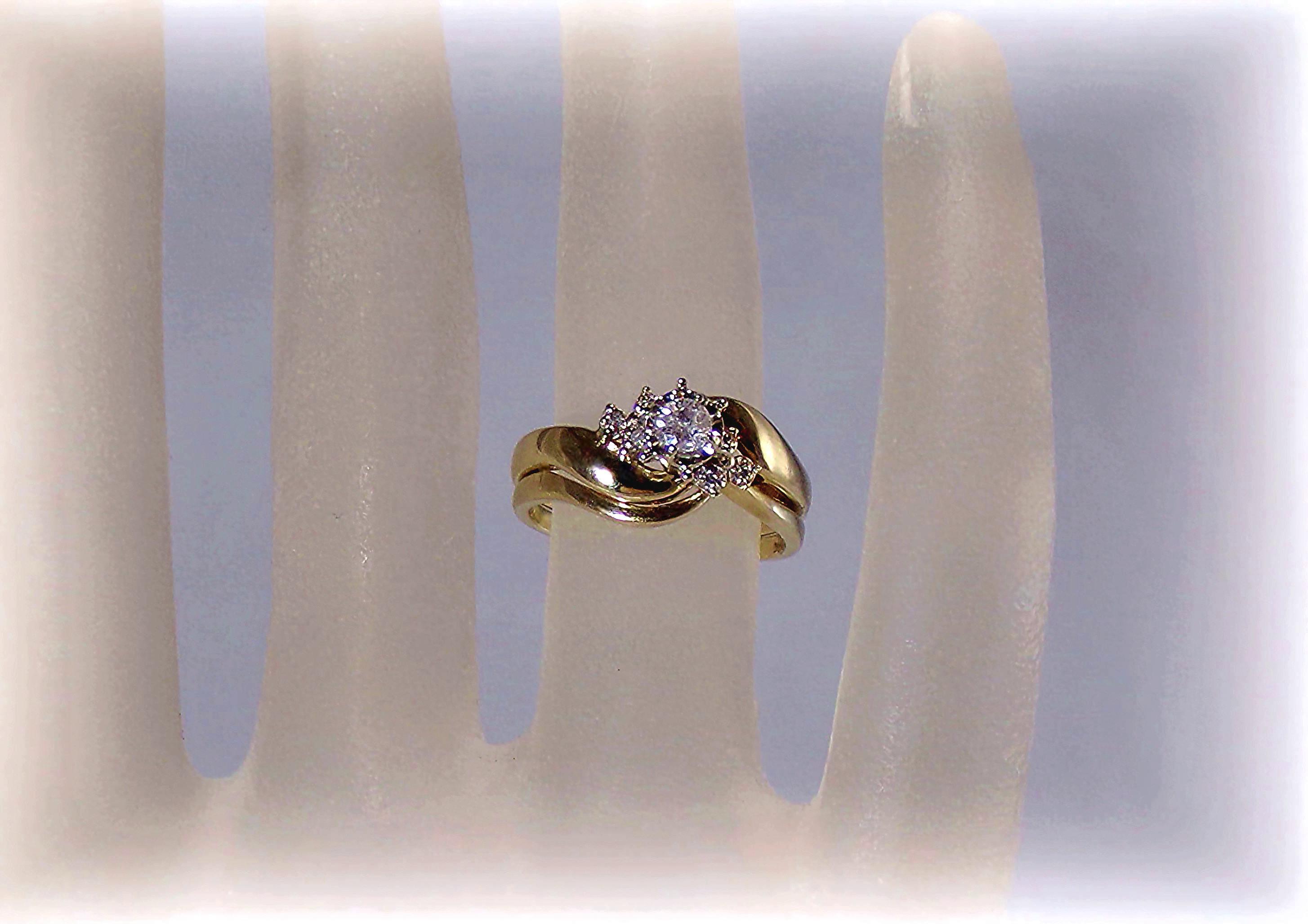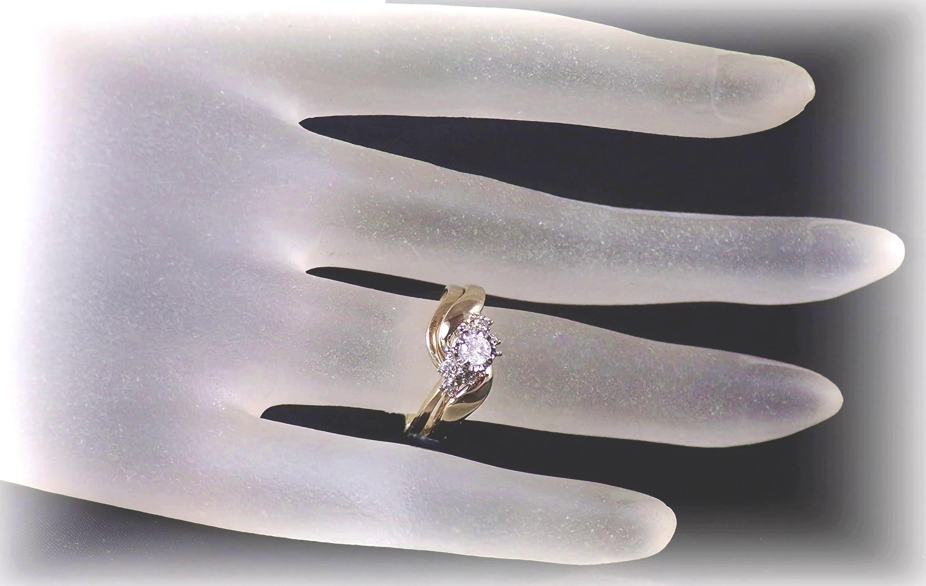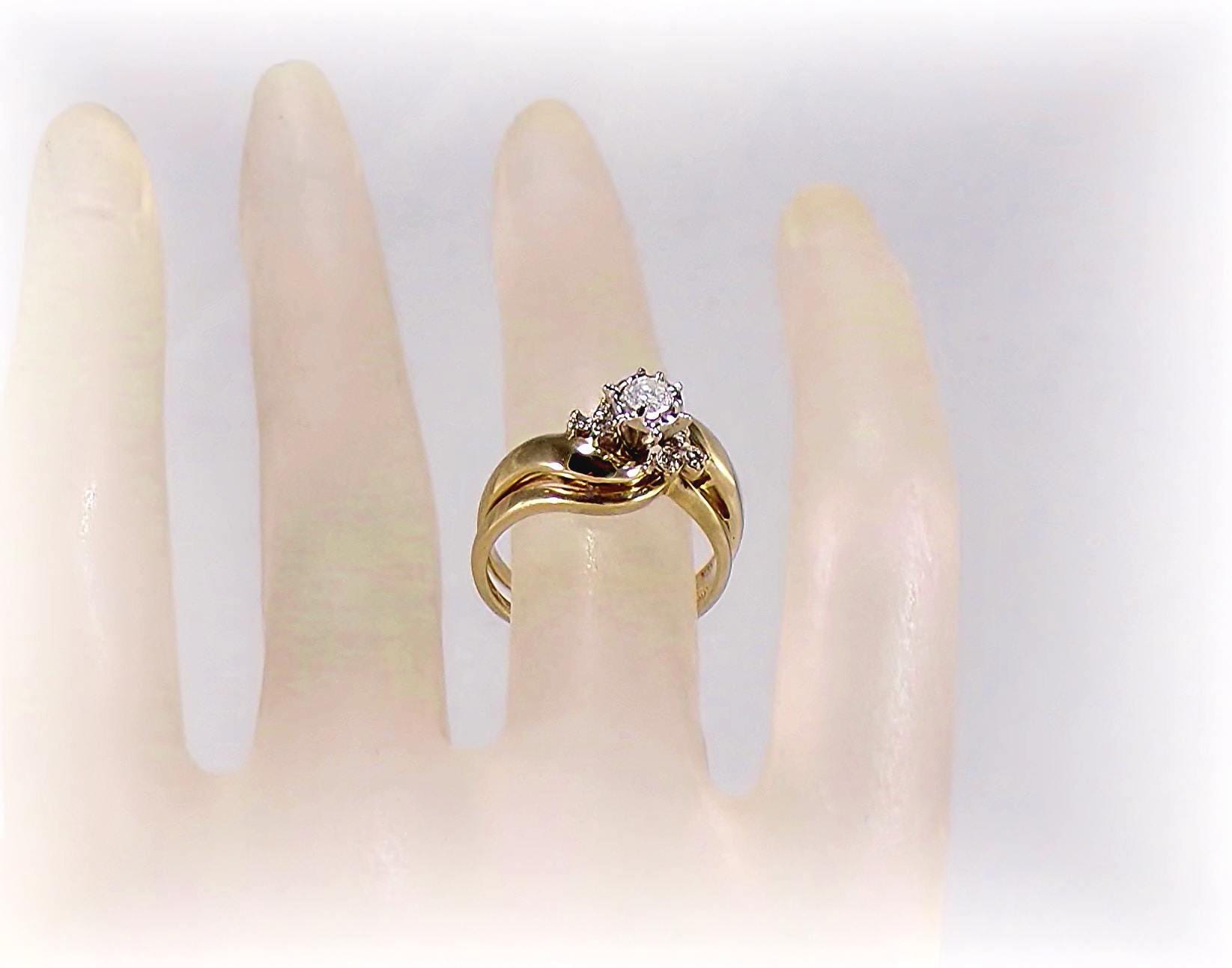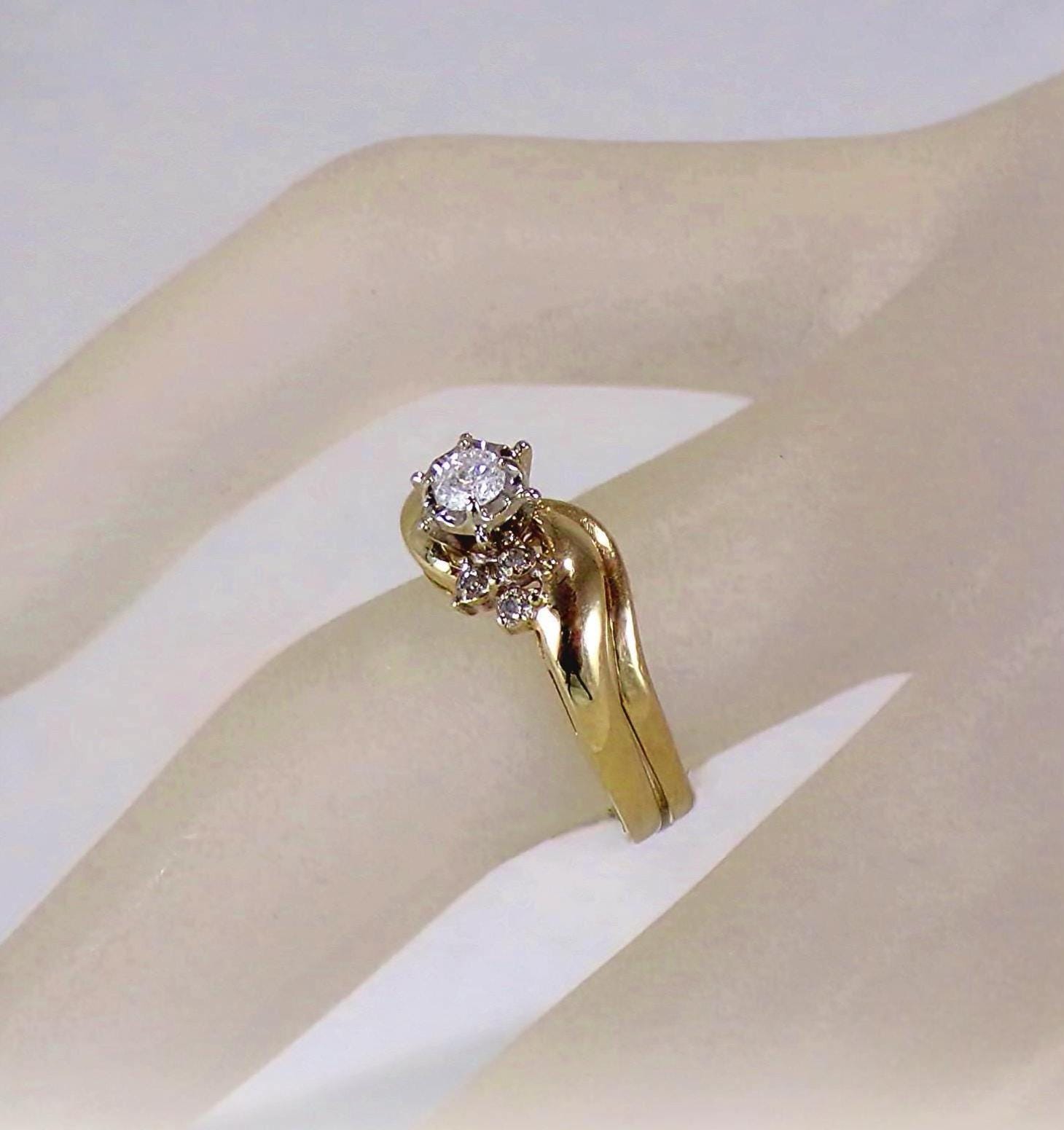 Vintage Bridal Ring Set – Seven Genuine Diamond Engagement Ring with Contour Wedding Band – 10 Kt Gold