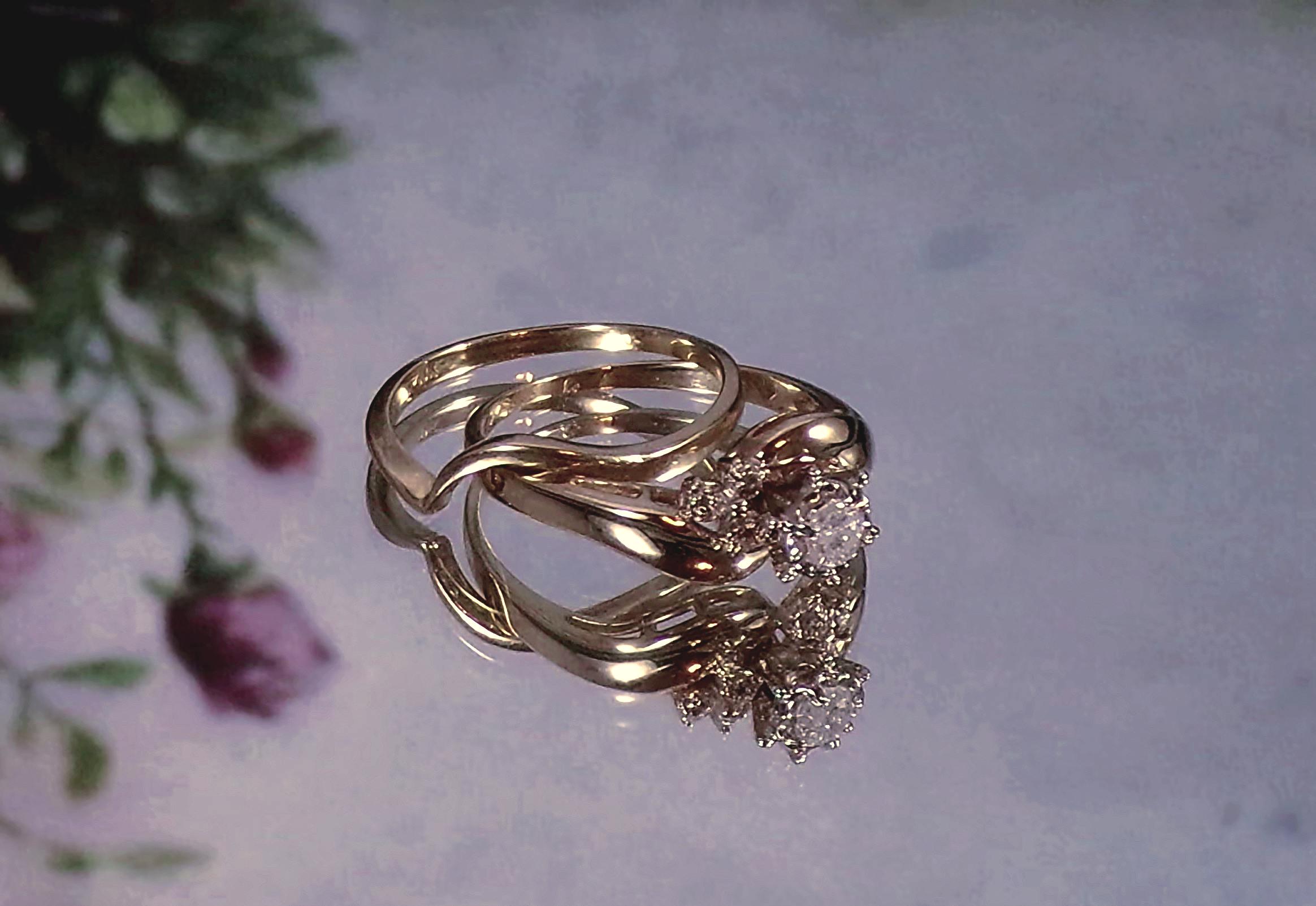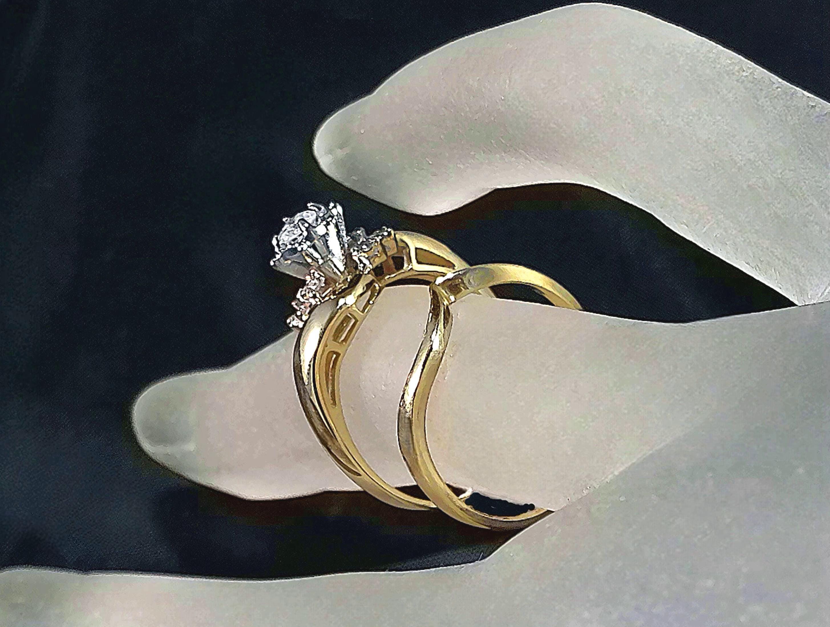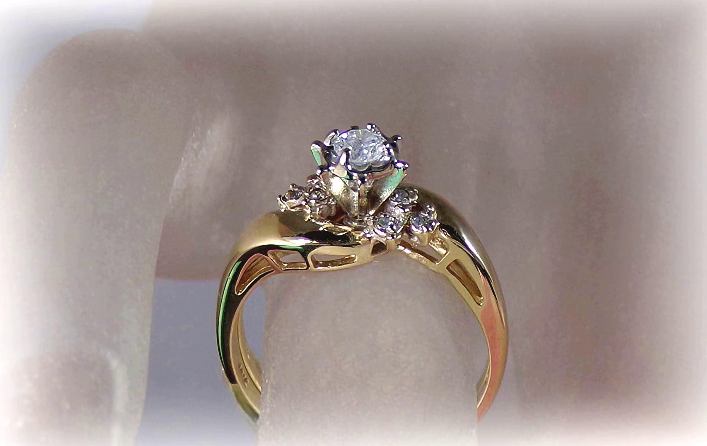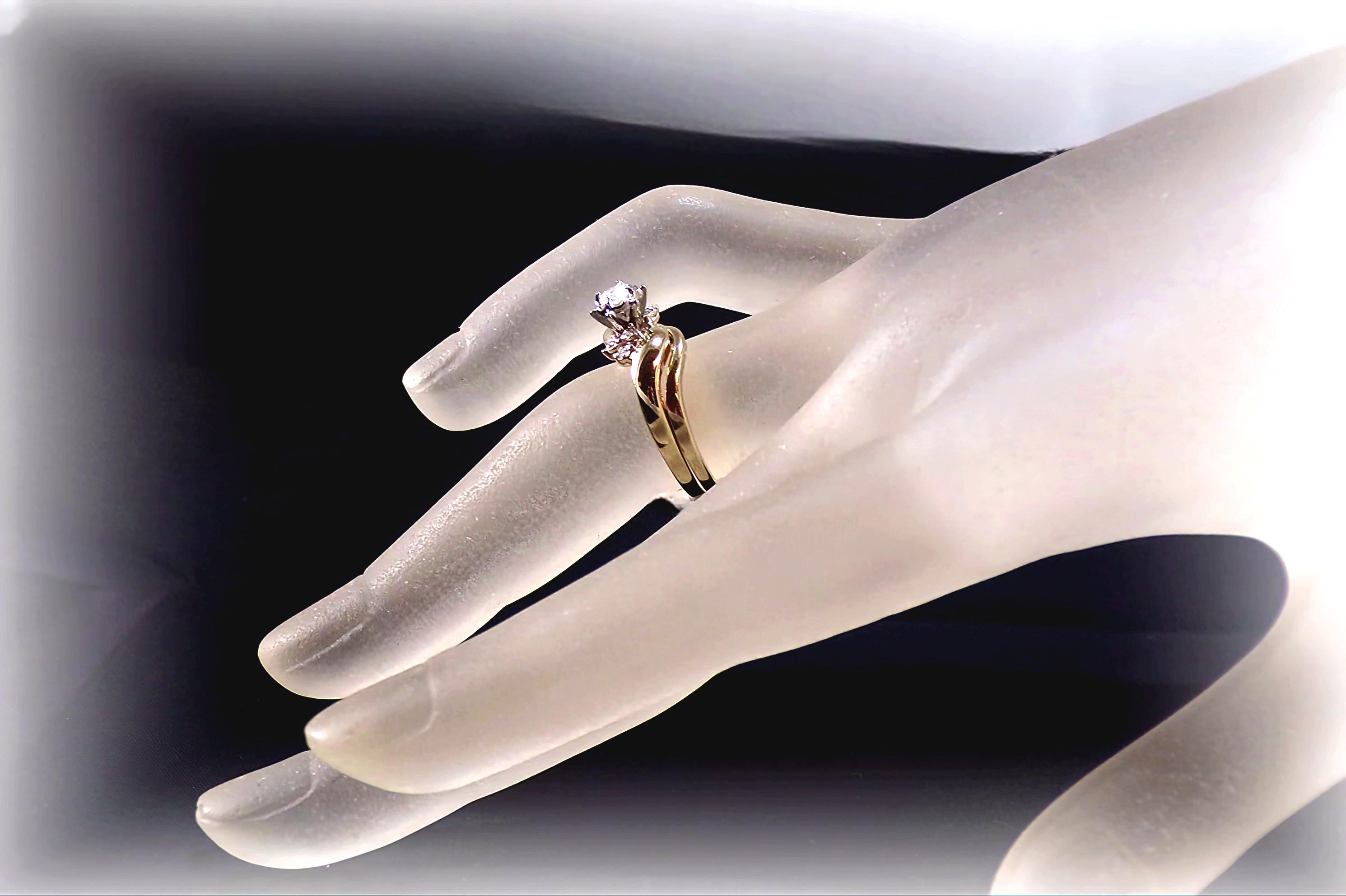 Vintage Bridal Ring Set – Seven Genuine Diamond Engagement Ring with Contour Wedding Band – 10 Kt Gold