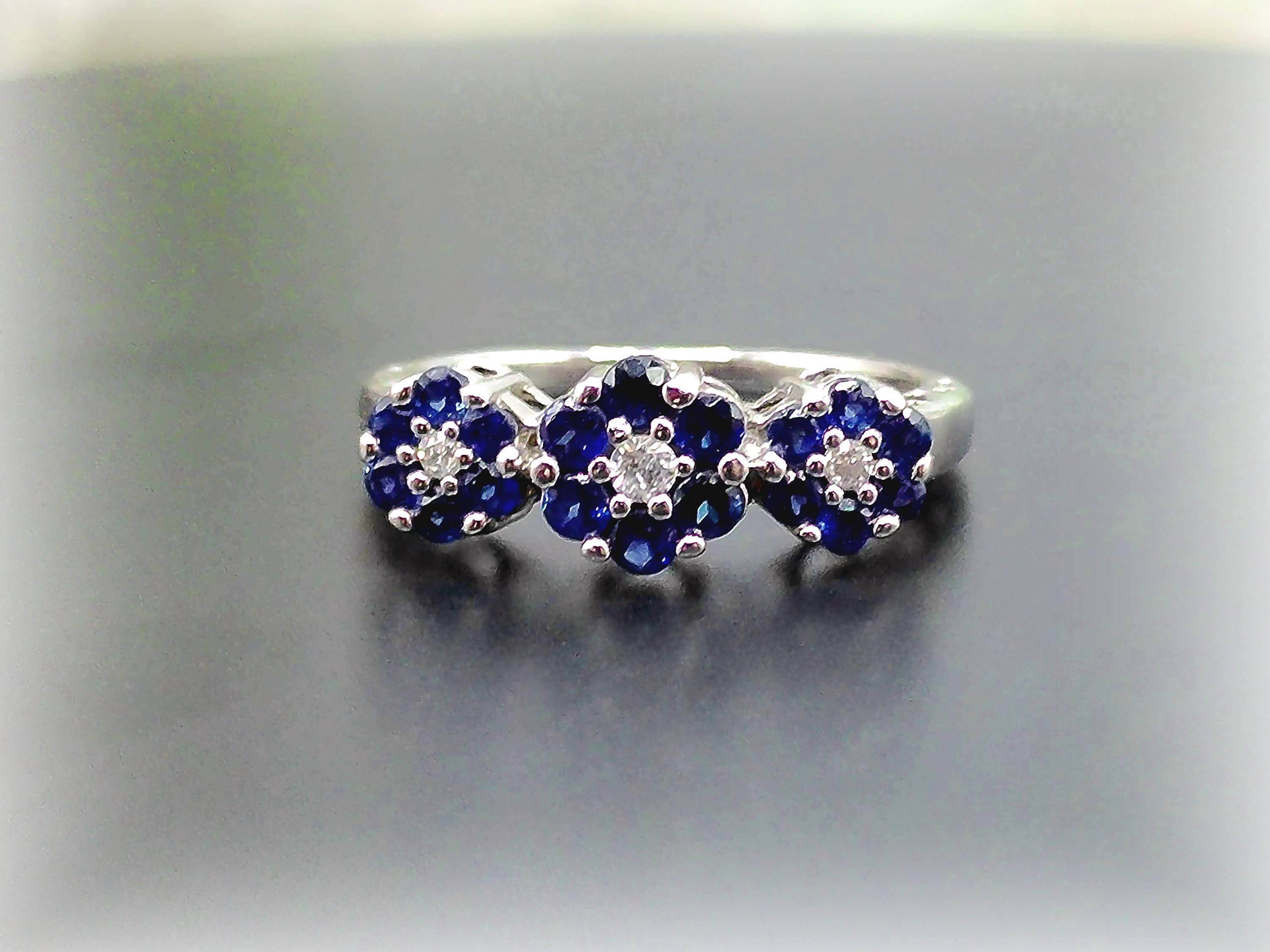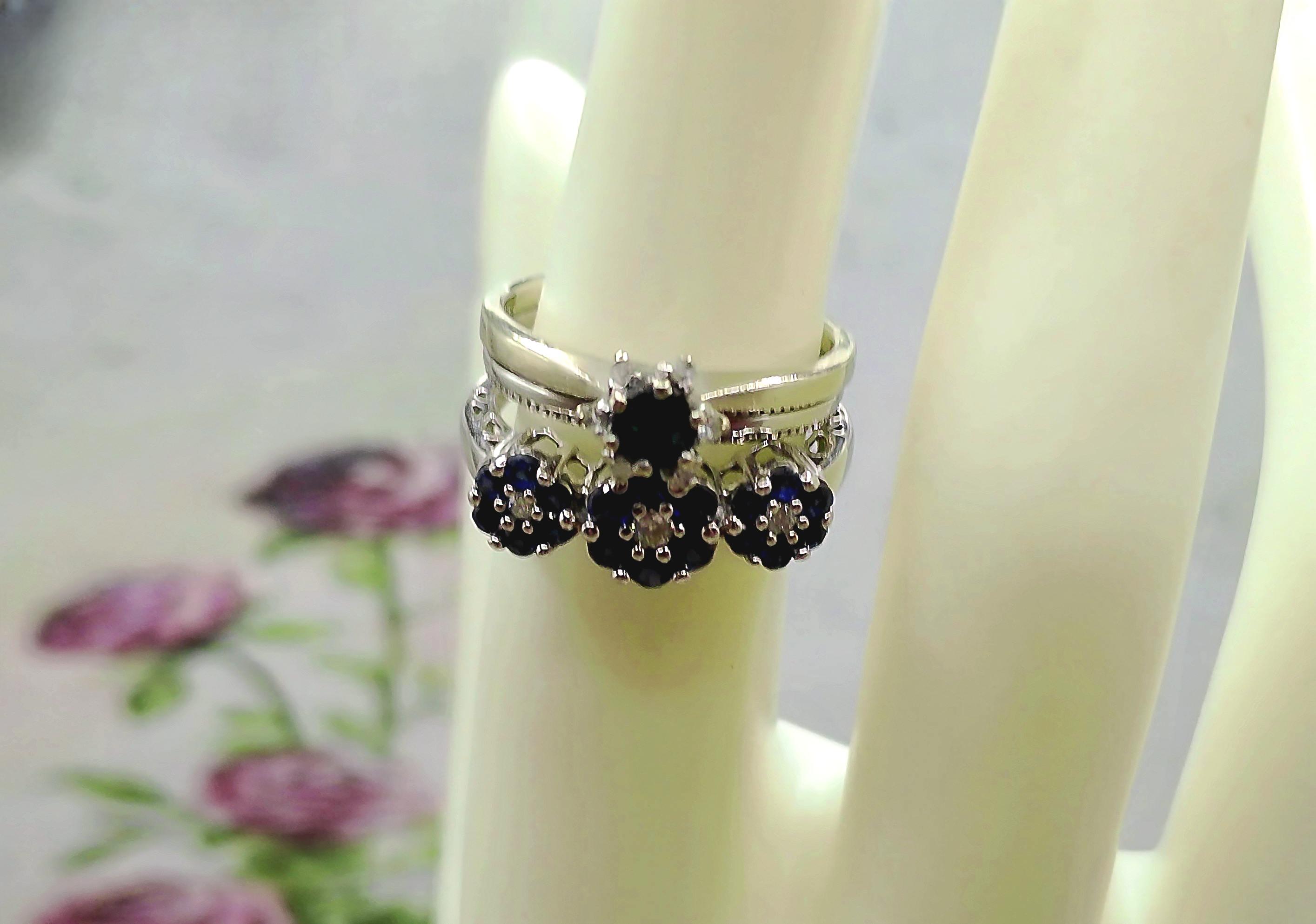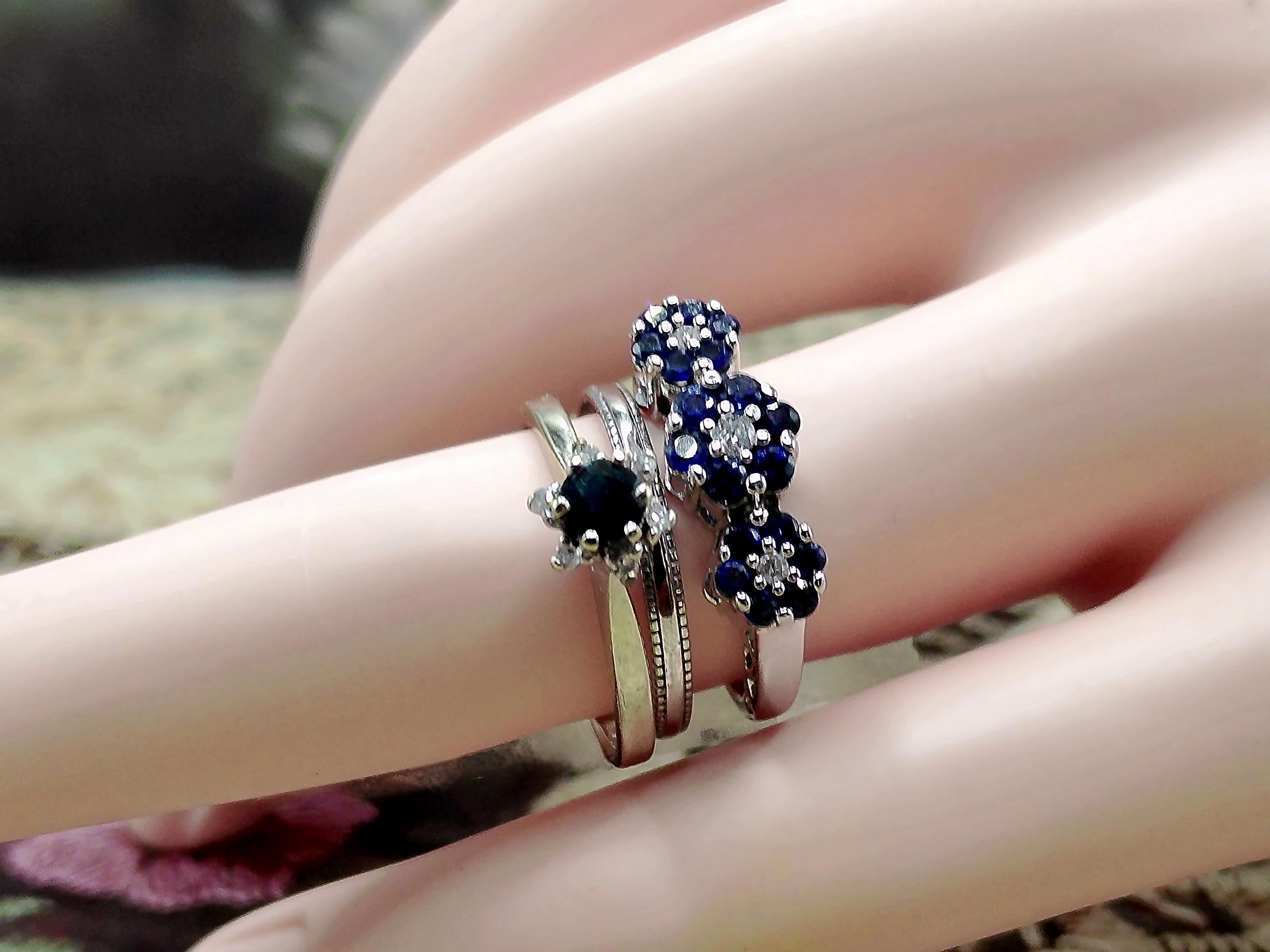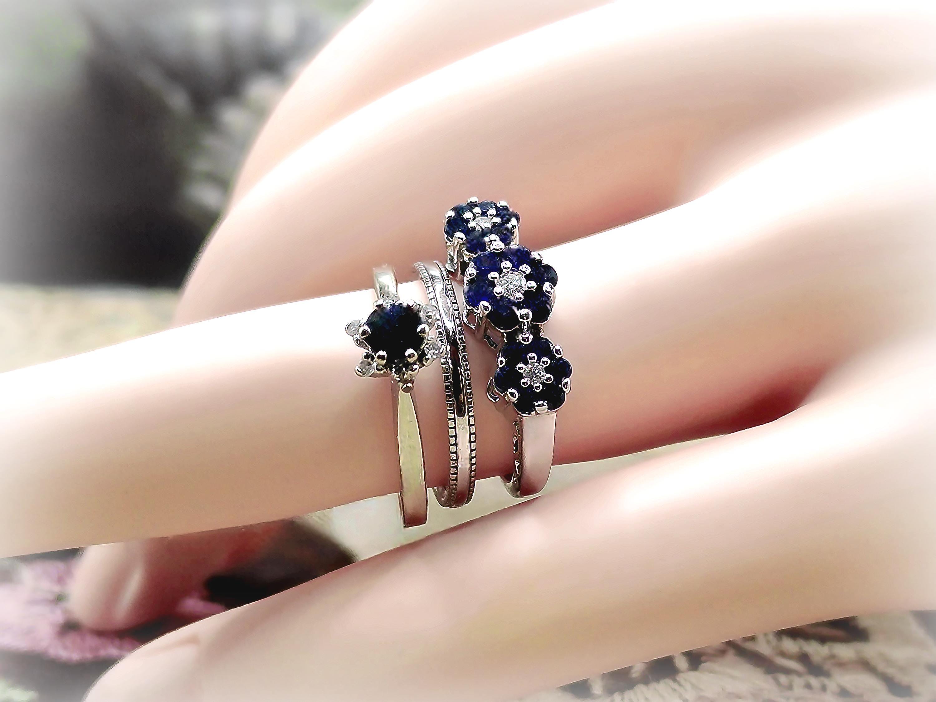 This is a gorgeous 10K White Gold Bridal Ring Set that consists of Blue Sapphires and Genuine Diamonds. This ring set consists of three rings. There is an Engagement Ring with a high cathedral mounting, a thin wedding band that has caviar beading along each edge of the band and a lovely blue sapphire and diamond band where the gems are set in a flower pattern. The anniversary band has 3 flowers; the center flower is larger than the 2 side flowers. The petals are blue sapphires with a center diamond and the Engagement Ring the motif is the opposite with a dark blue sapphire as the middle gem with genuine diamonds surrounding the center gemstone. Just a beautiful feminine ring set that can be worn together, stacked or as individual rings. The set provides great versatility to enhance any look!