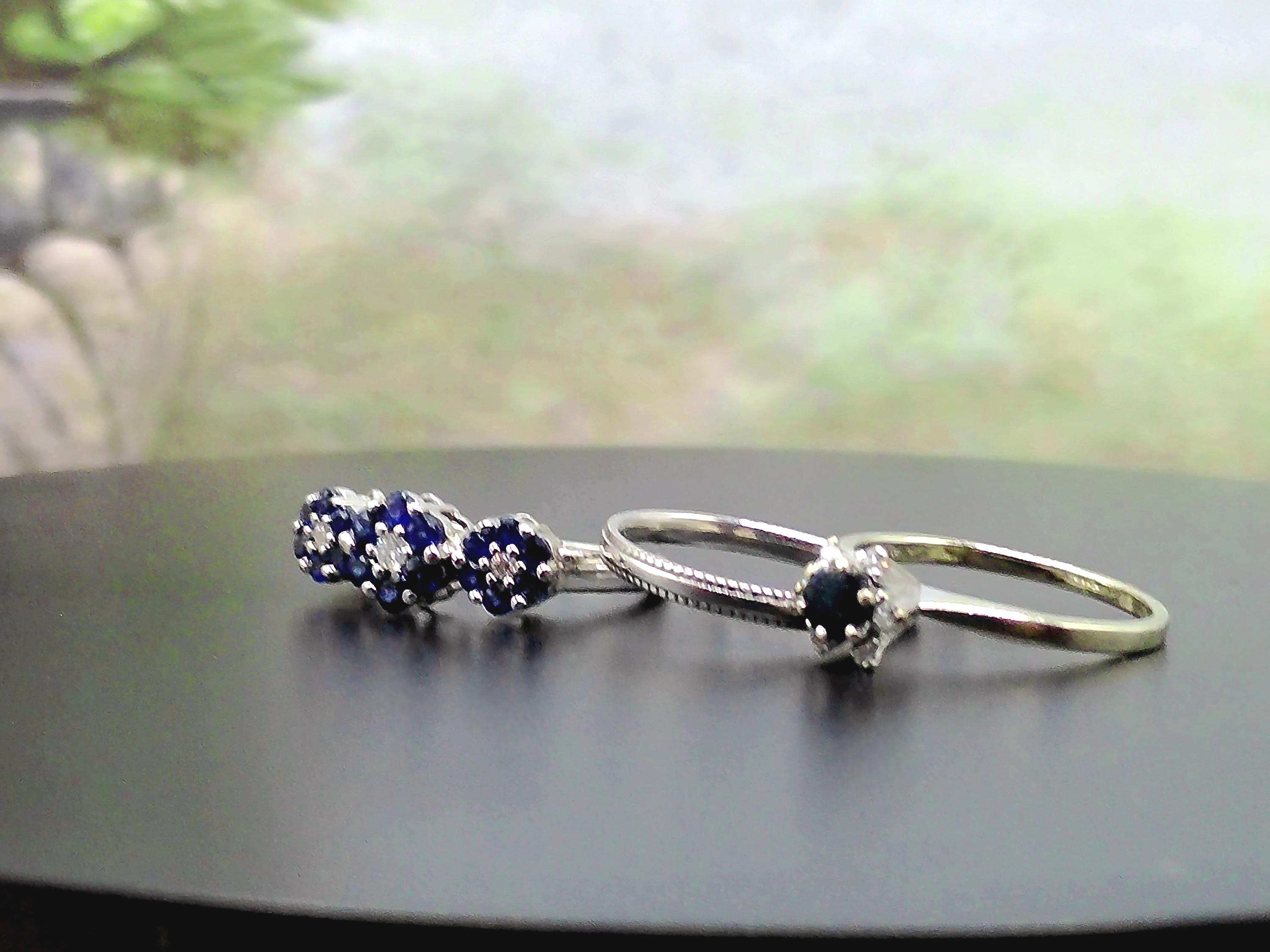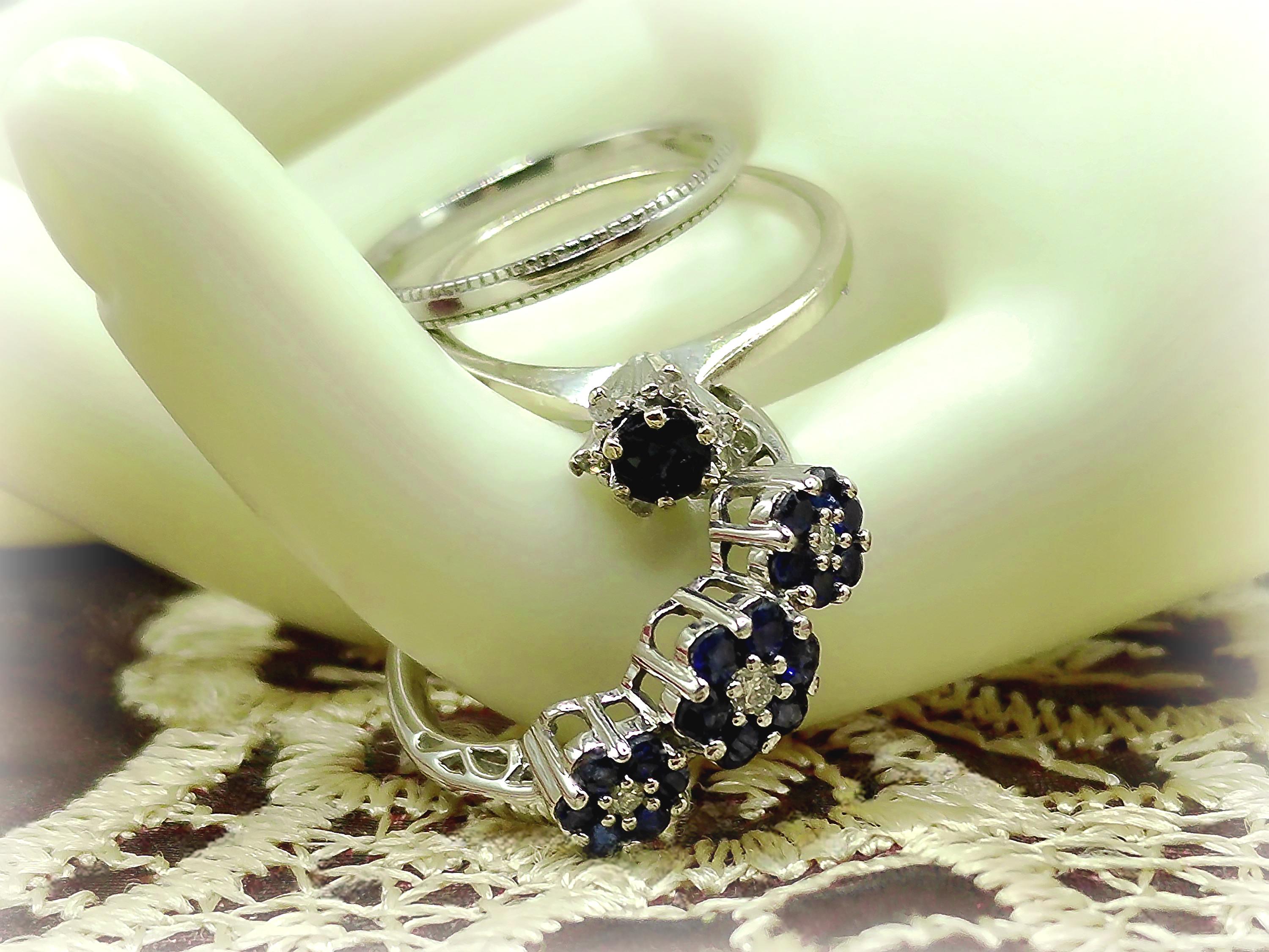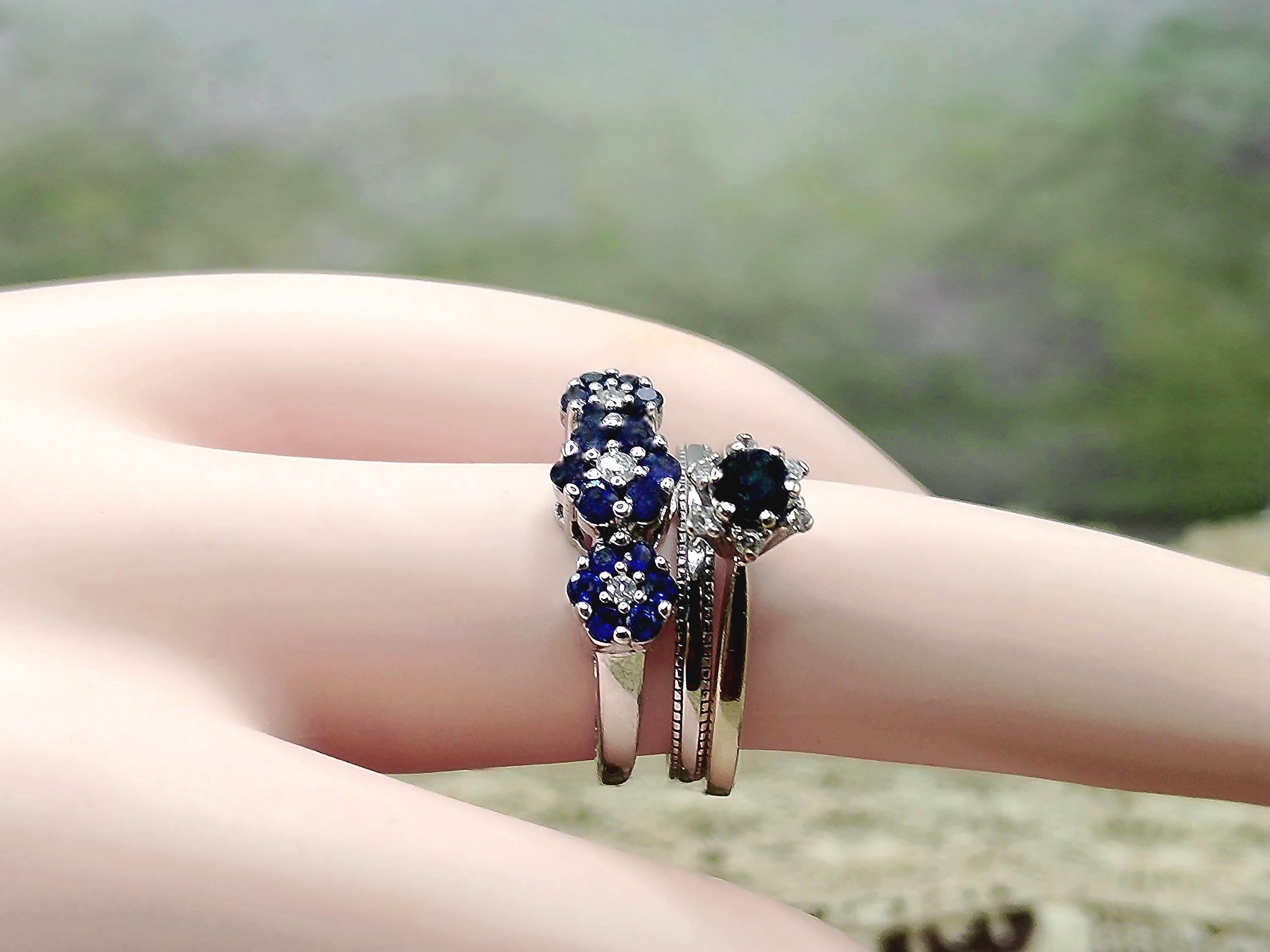 • Gemstones: Genuine Diamonds and blue sapphires – there are slight differences in color of the sapphires in the Engagement Ring and the Anniversary Band. Not always noticeable when worn together