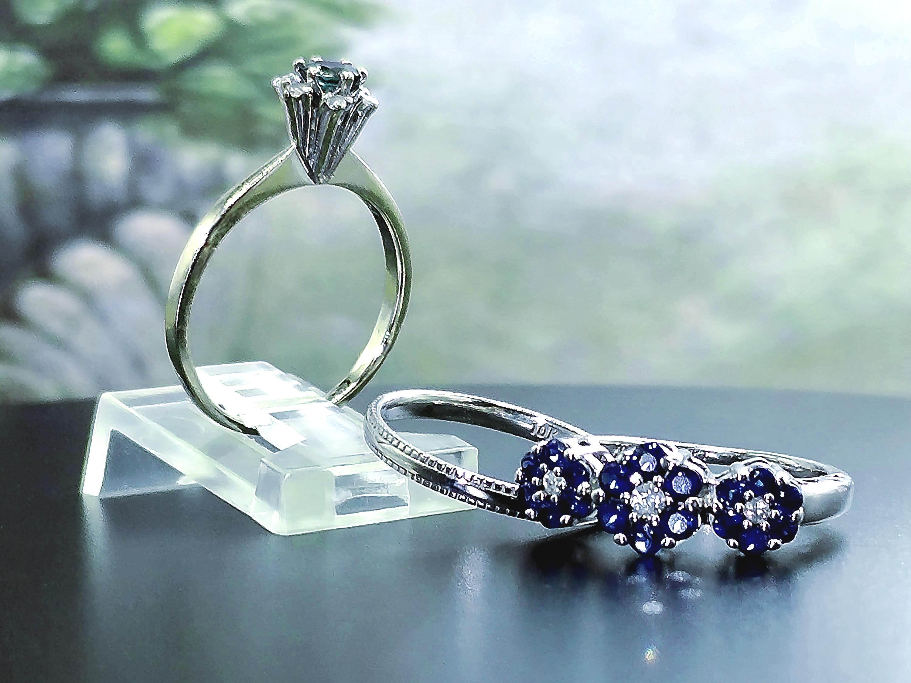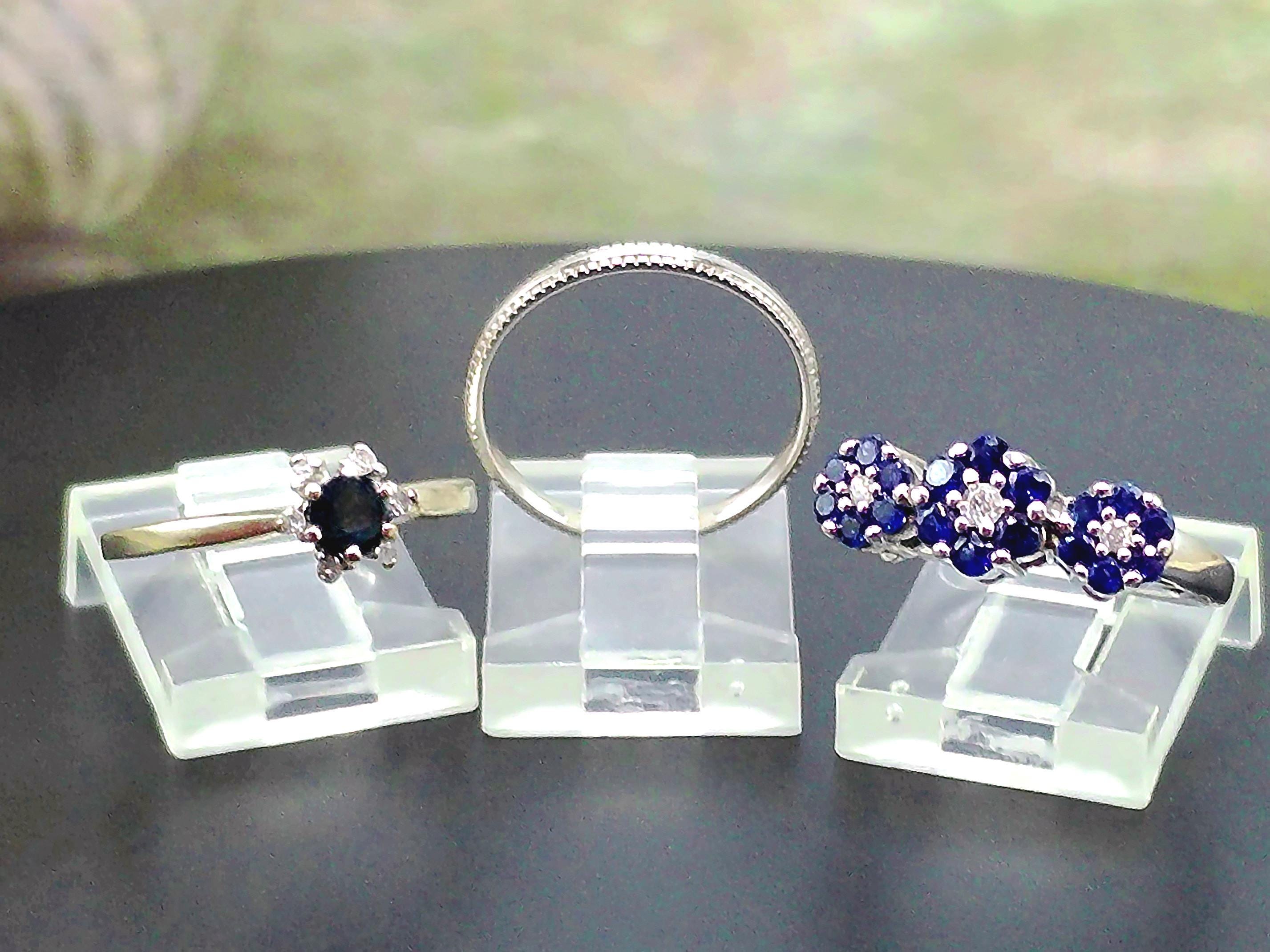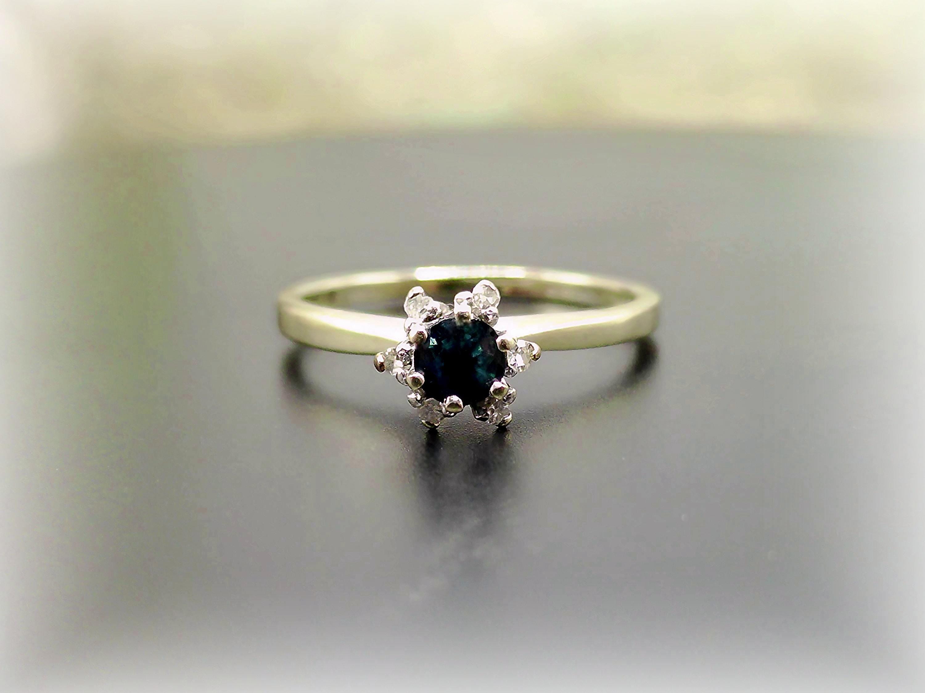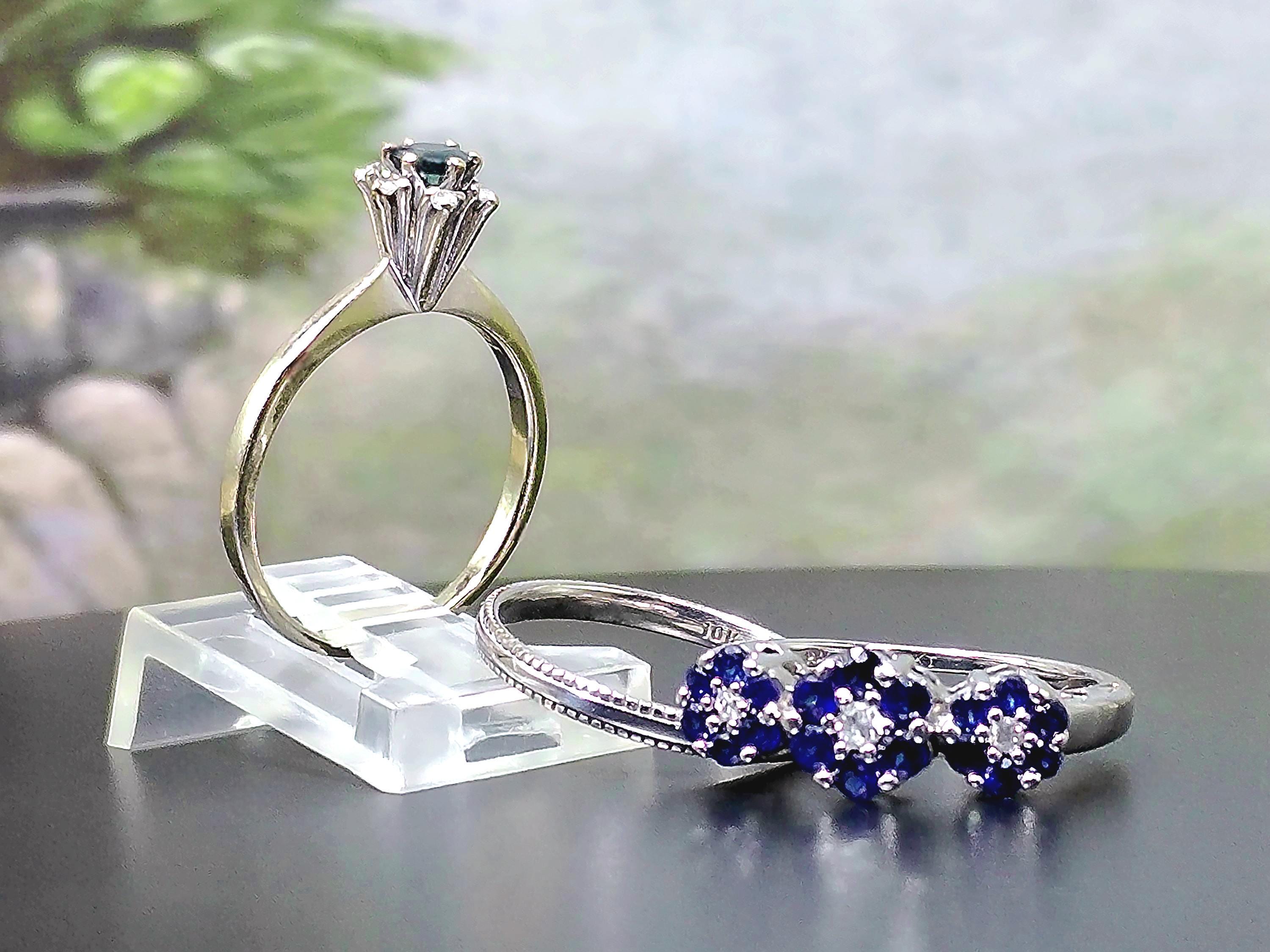 • Gemstones: Genuine Diamonds and blue sapphires – there are slight differences in color of the sapphires in the Engagement Ring and the Anniversary Band. Not always noticeable when worn together
