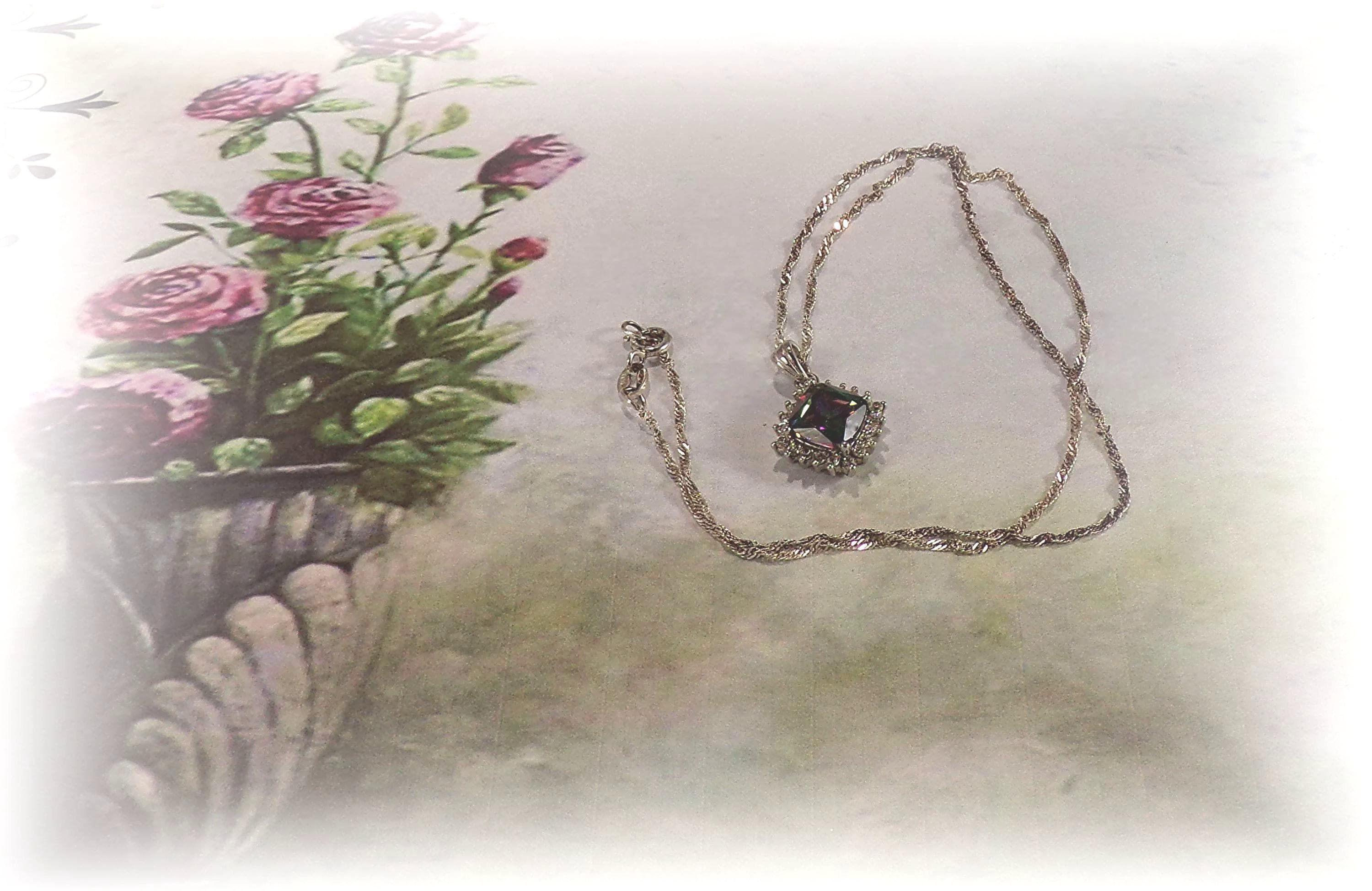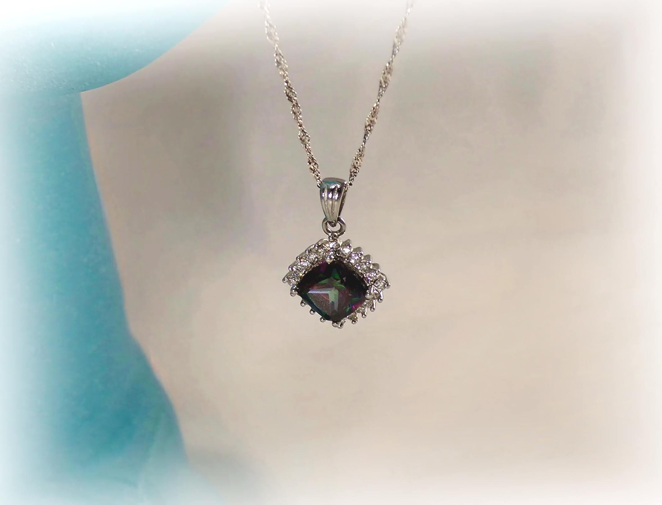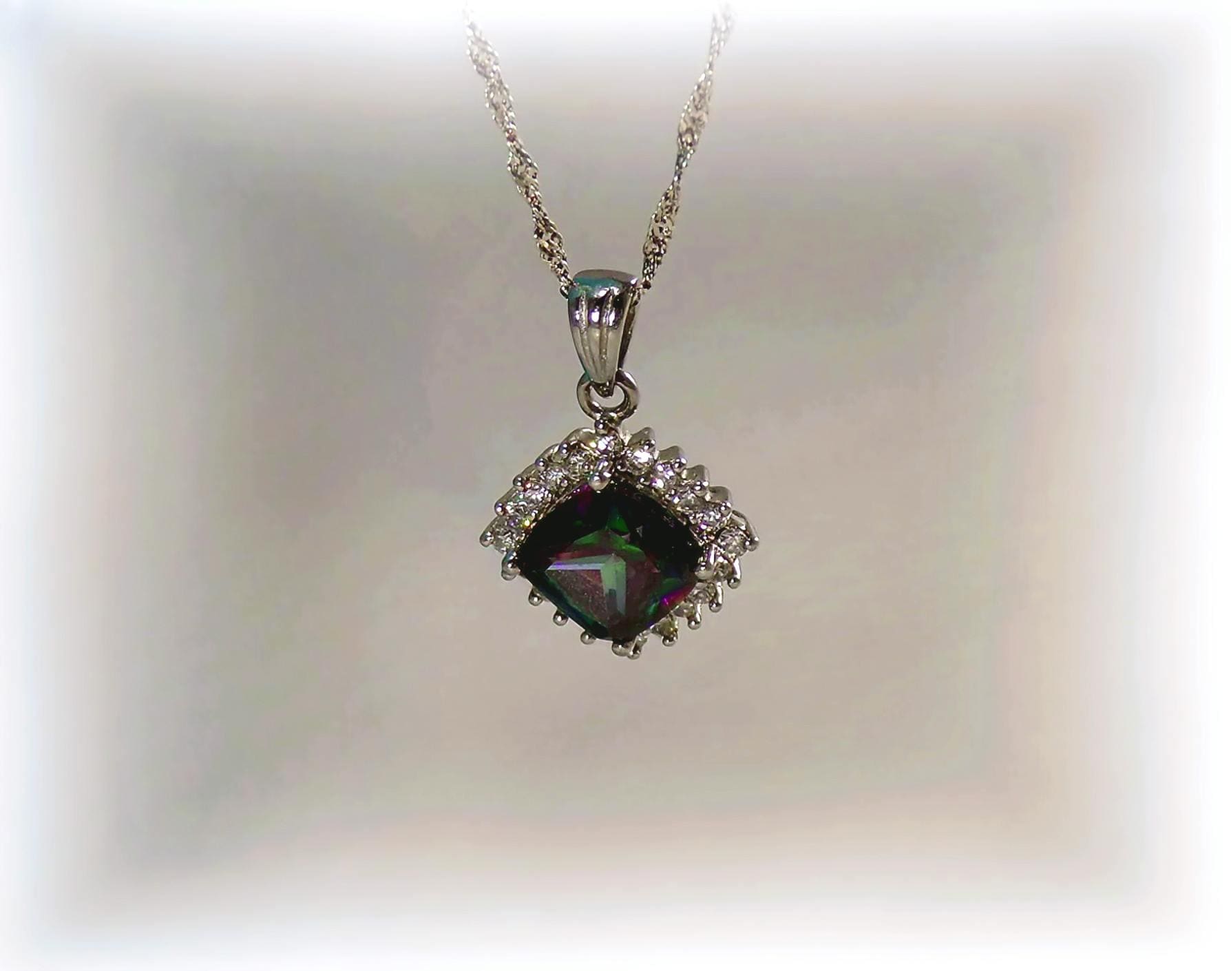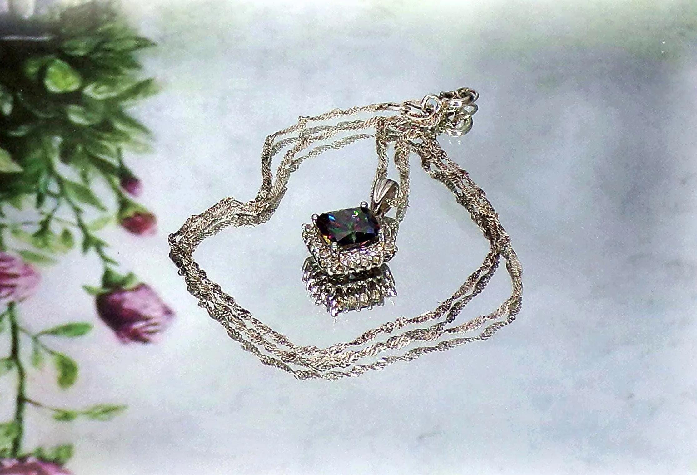 This Vintage Necklace is a pendant of 925 Sterling Silver with a princess cut CZ Mystic Topaz that is haloed by clear round Rhinestones. This necklace also has a glittering twisted Singapore chain that is made of Italian 925 Sterling Silver. The Mystic Stone's shifting colors symbolize Transformation and Life Transitions. Some believe it manifests bringing desires and intentions into reality, while shielding from negativity. The multi-faceted colors are simply beautiful, and it is a very versatile necklace to enhance a multitude of outfits.