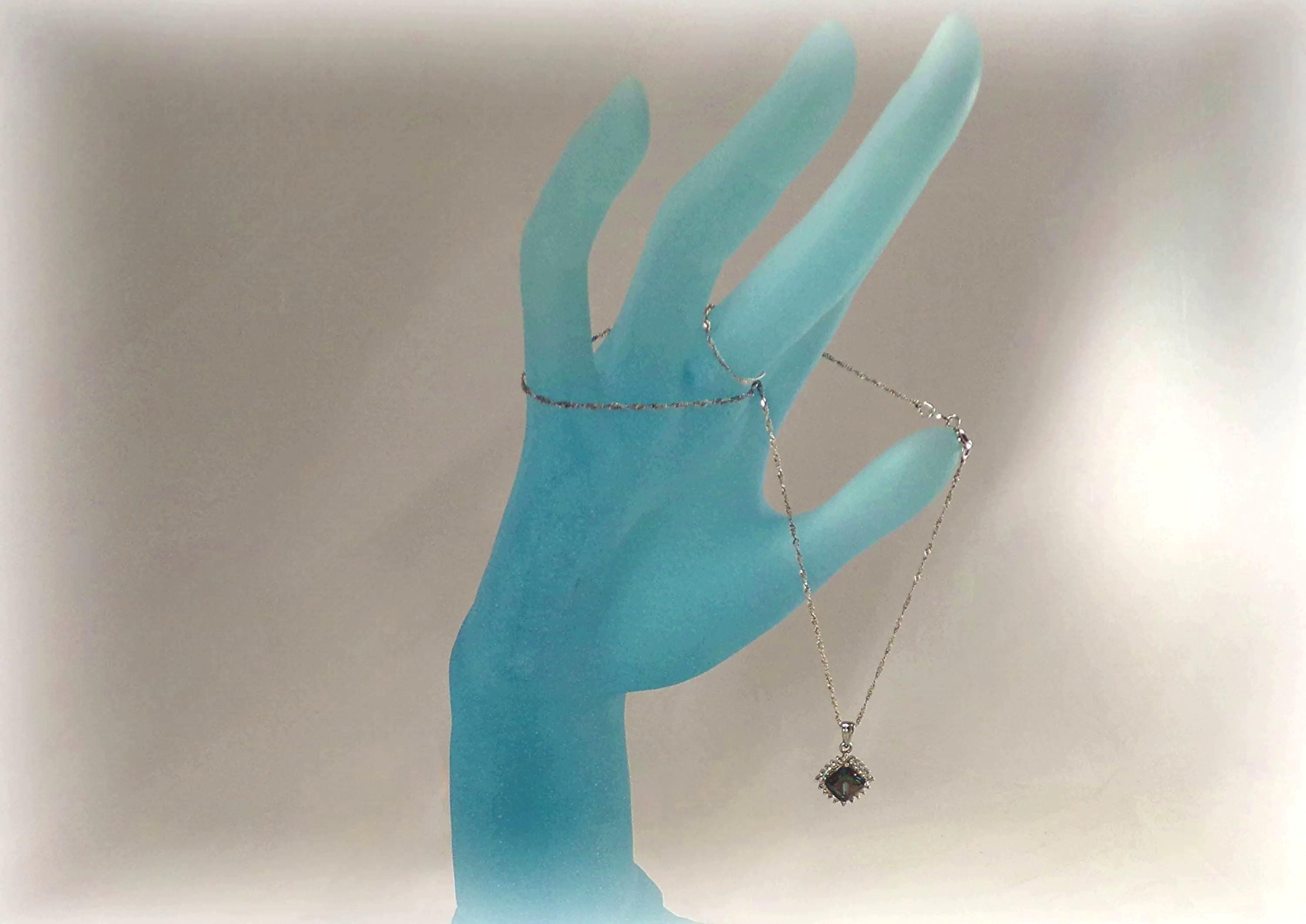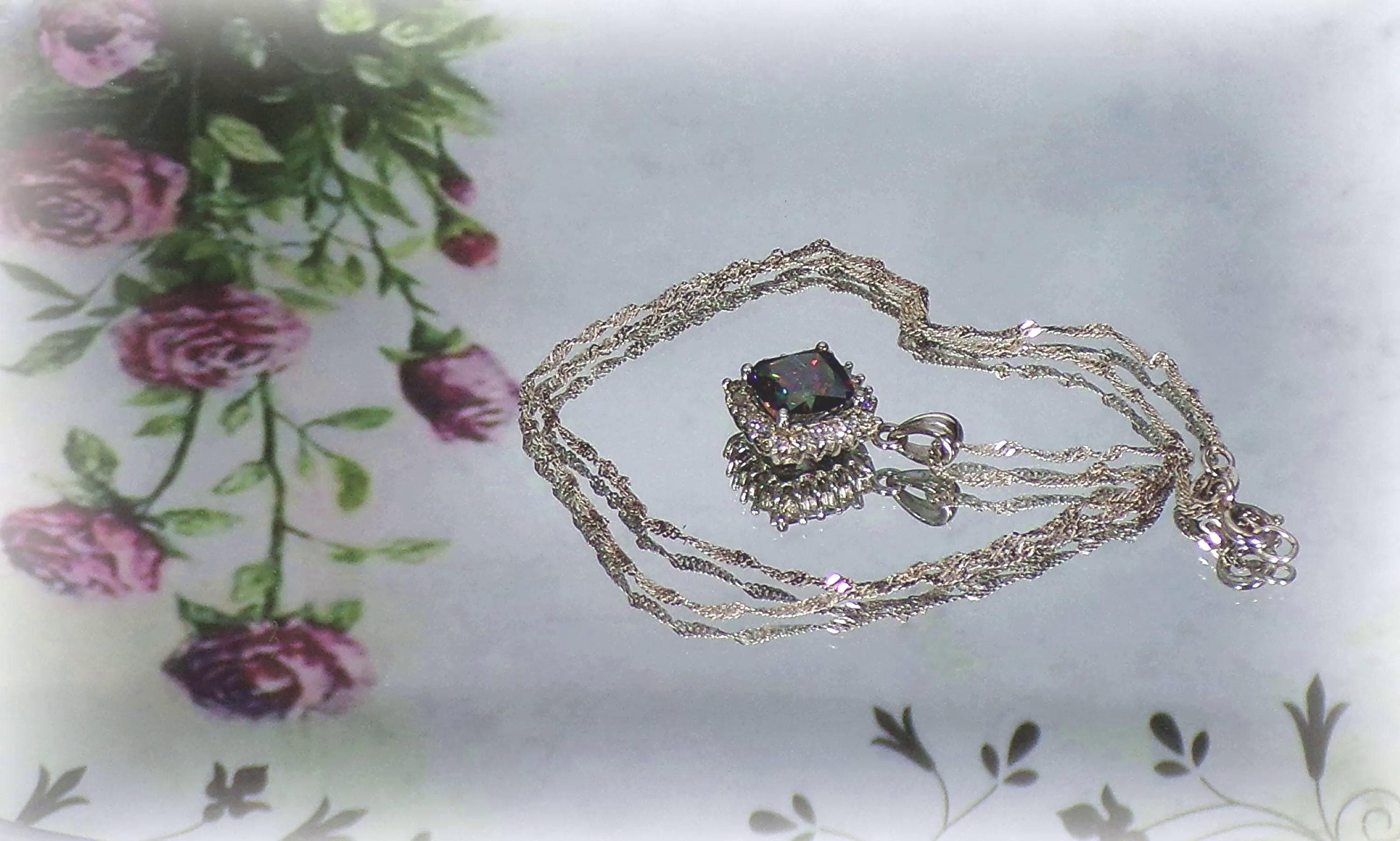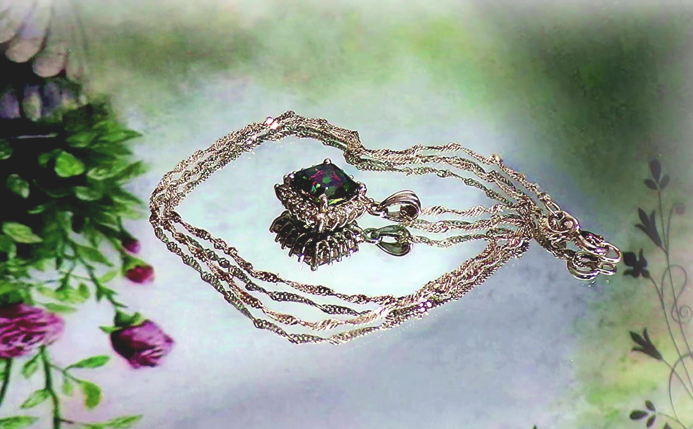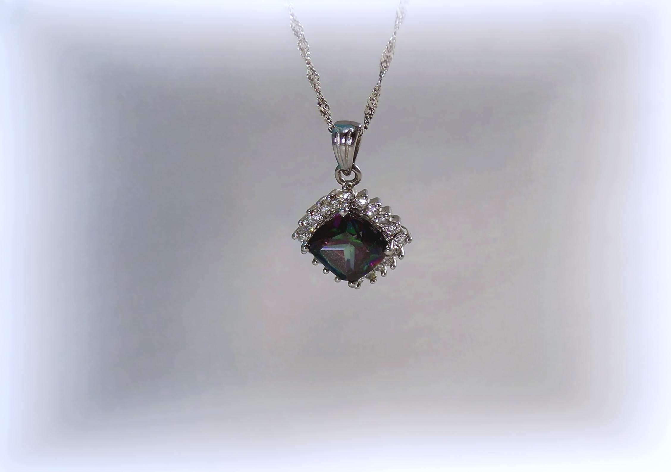 This Vintage Necklace is a pendant of 925 Sterling Silver with a princess cut CZ Mystic Topaz that is haloed by clear round Rhinestones. This necklace also has a glittering twisted Singapore chain that is made of Italian 925 Sterling Silver. The Mystic Stone's shifting colors symbolize Transformation and Life Transitions. Some believe it manifests bringing desires and intentions into reality, while shielding from negativity. The multi-faceted colors are simply beautiful, and it is a very versatile necklace to enhance a multitude of outfits.