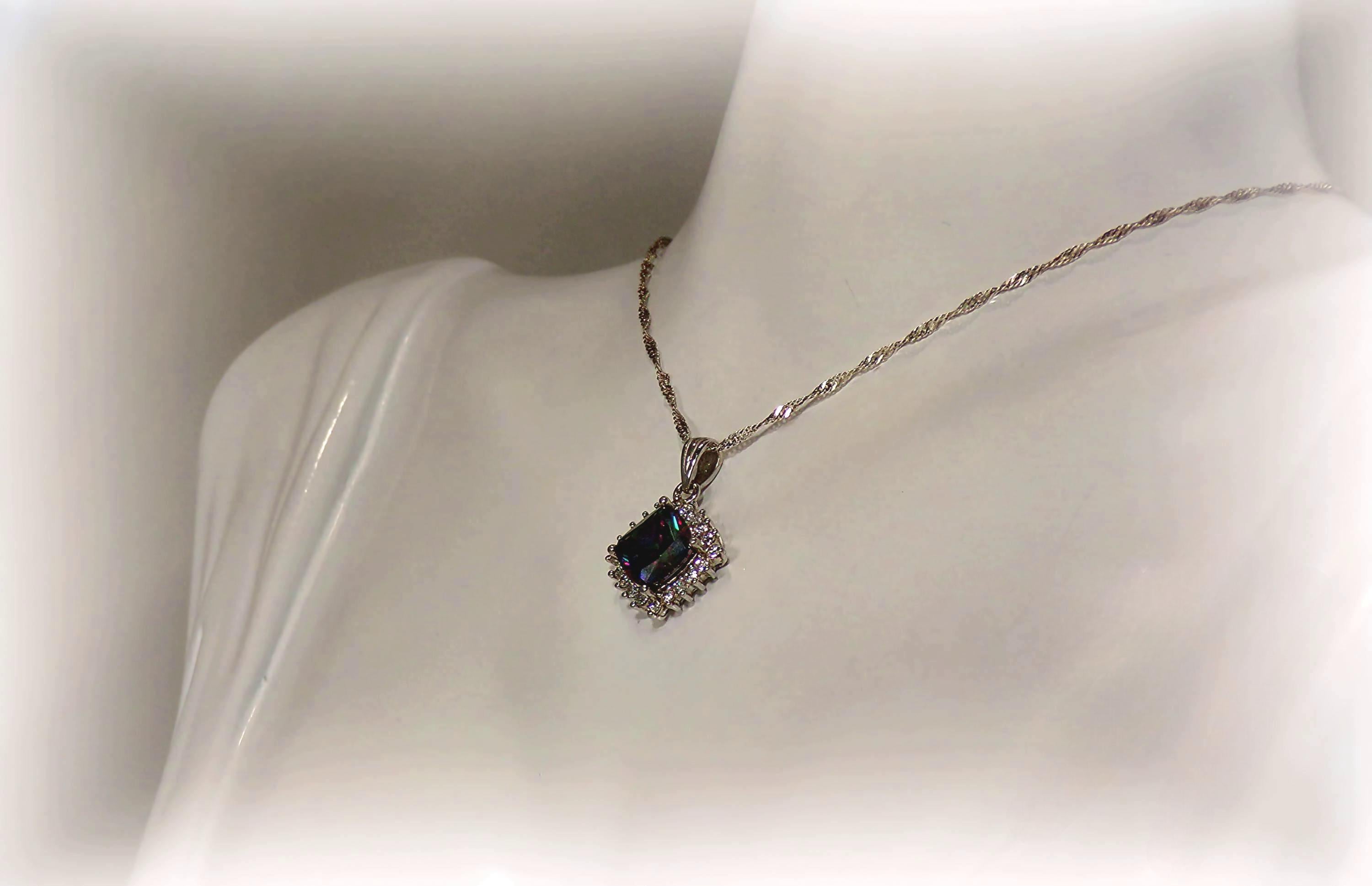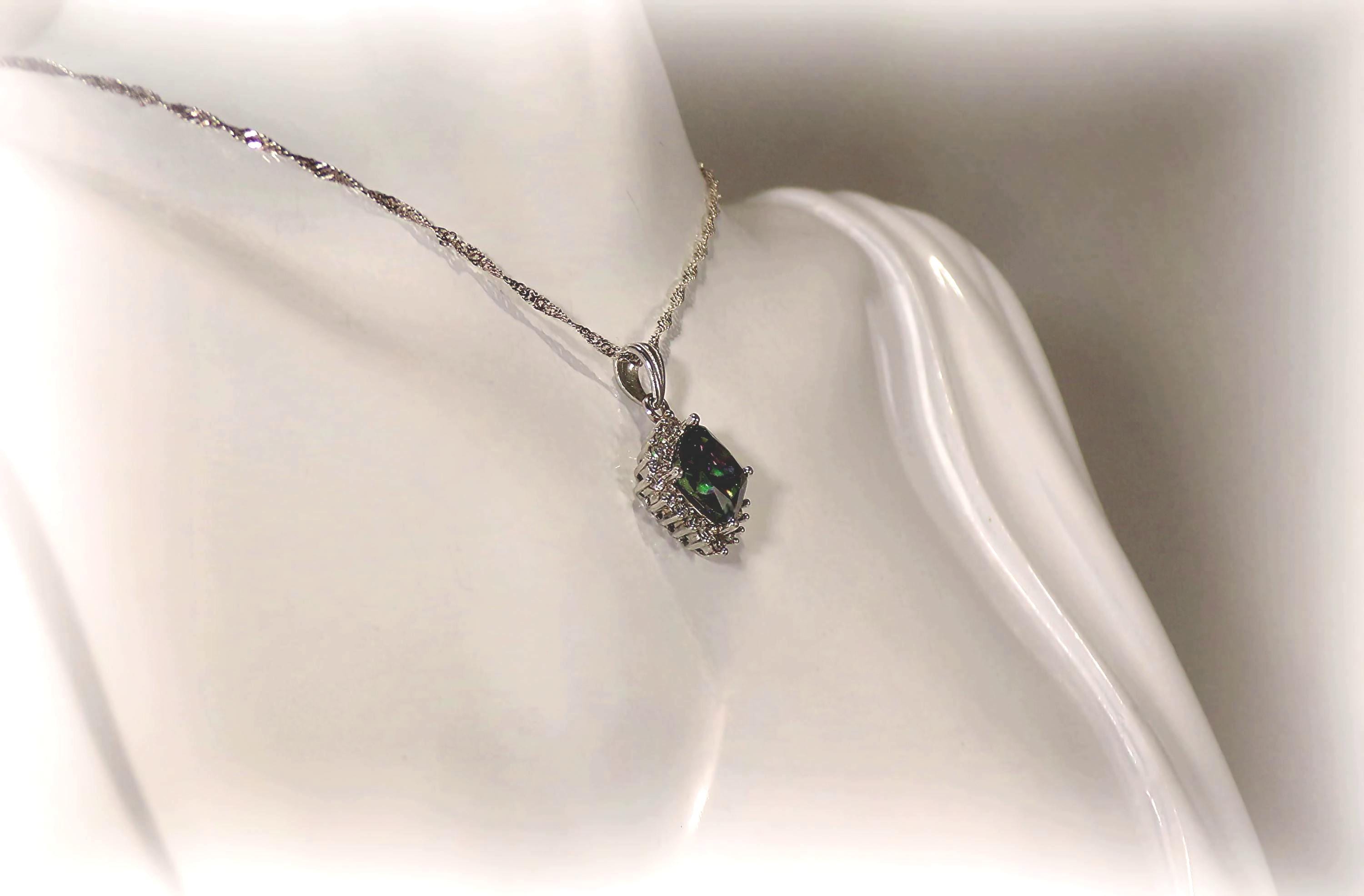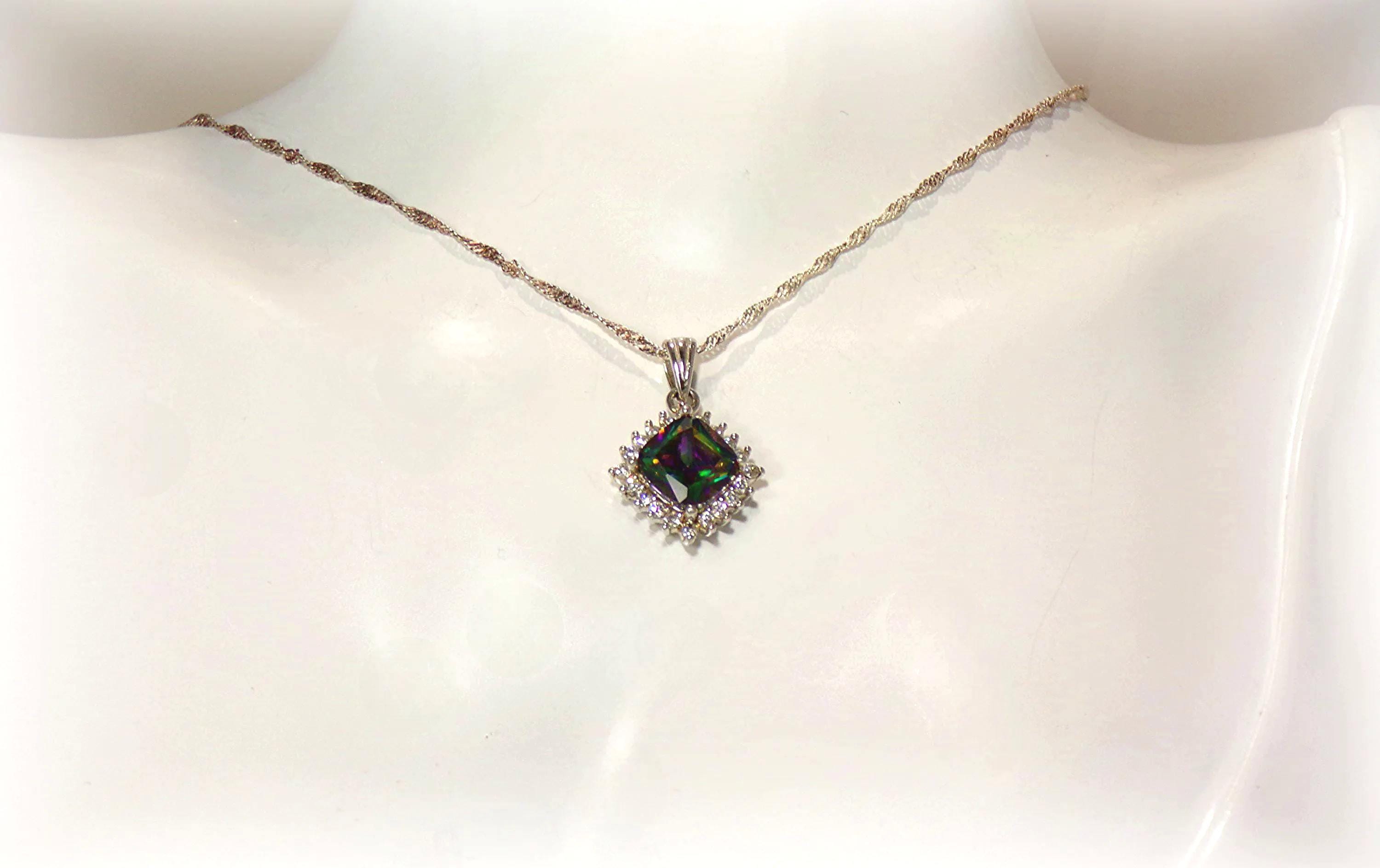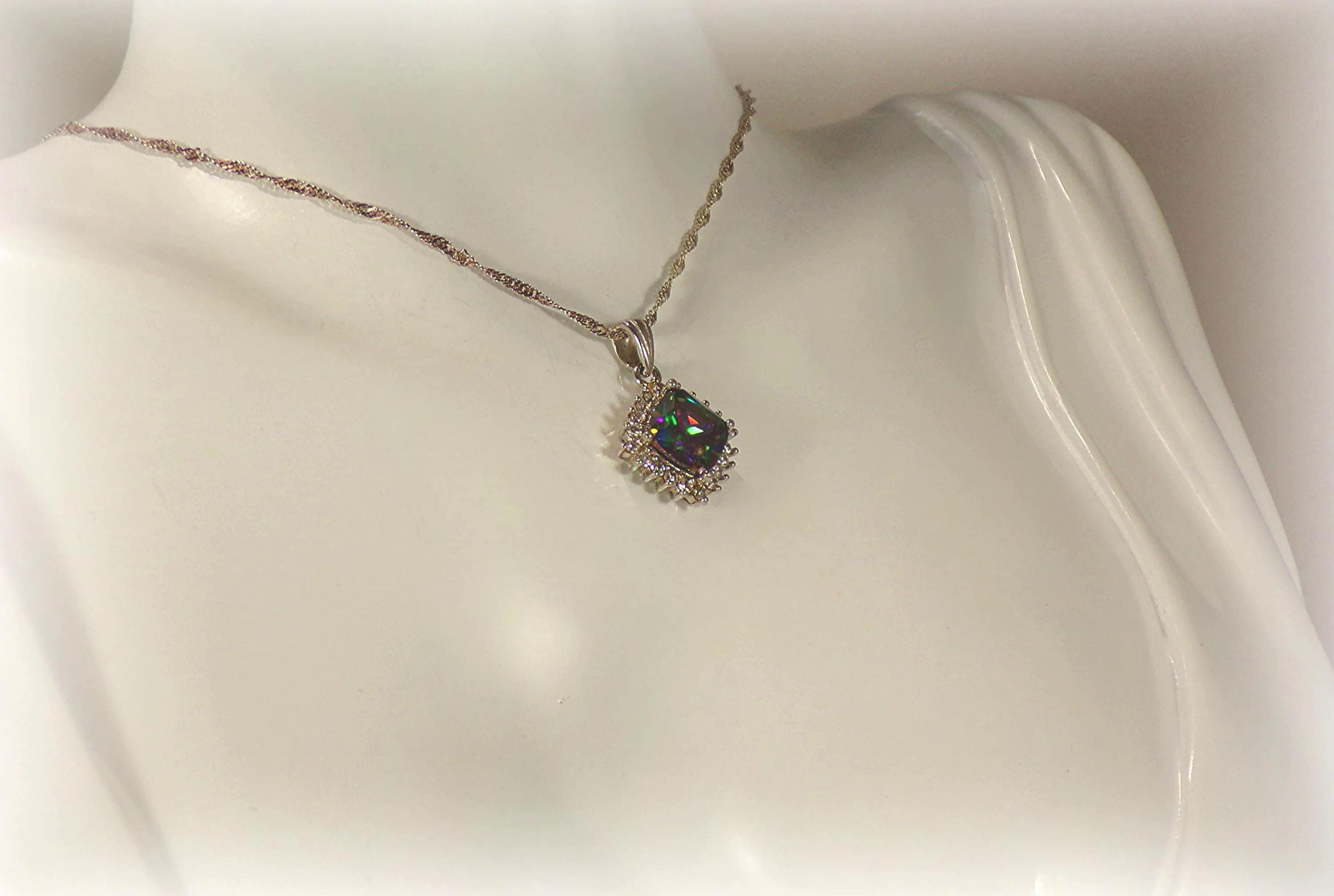 Women’s Vintage Necklace – Cubic Zirconia Mystic Topaz with a Rhinestone Halo – 925 Sterling Silver
