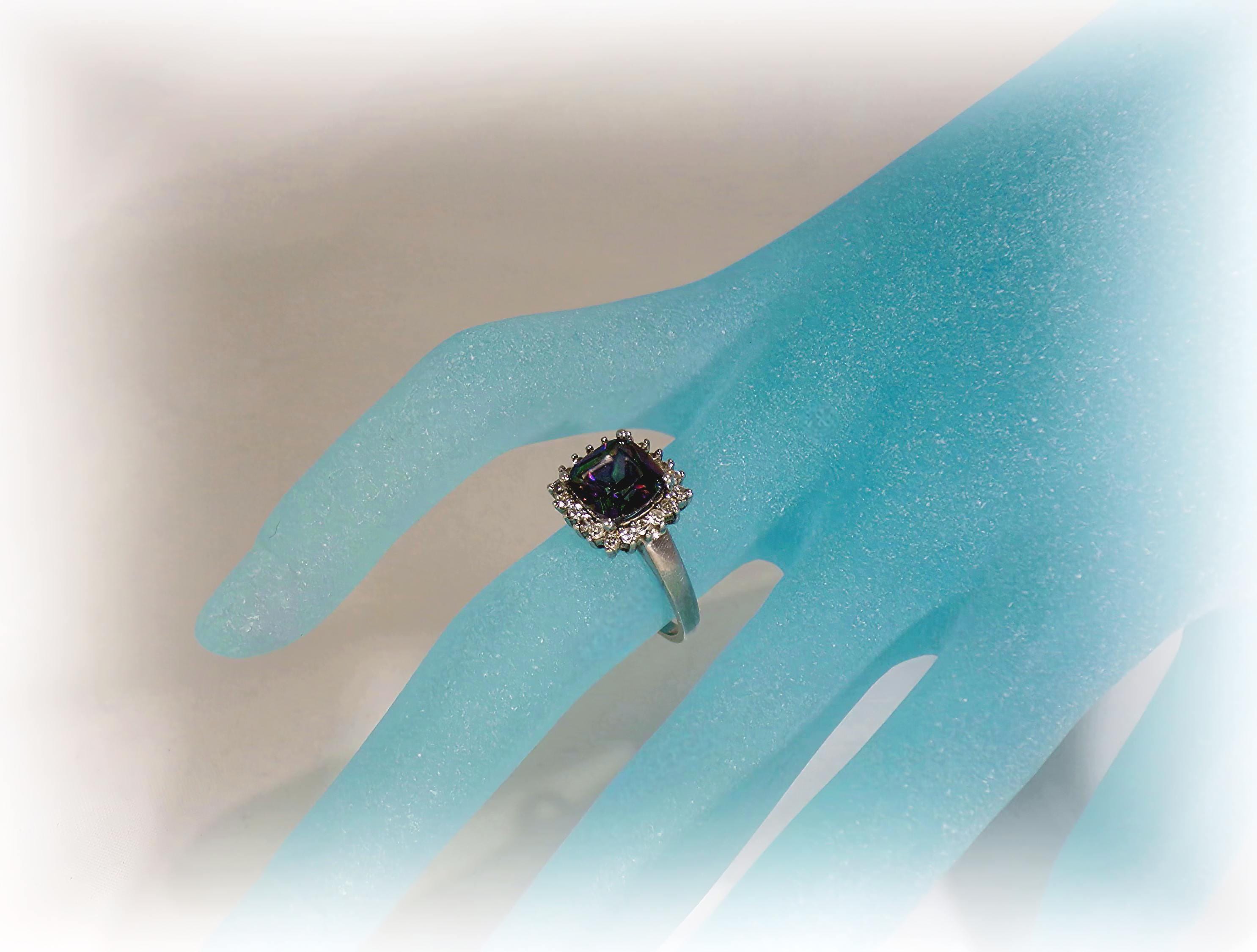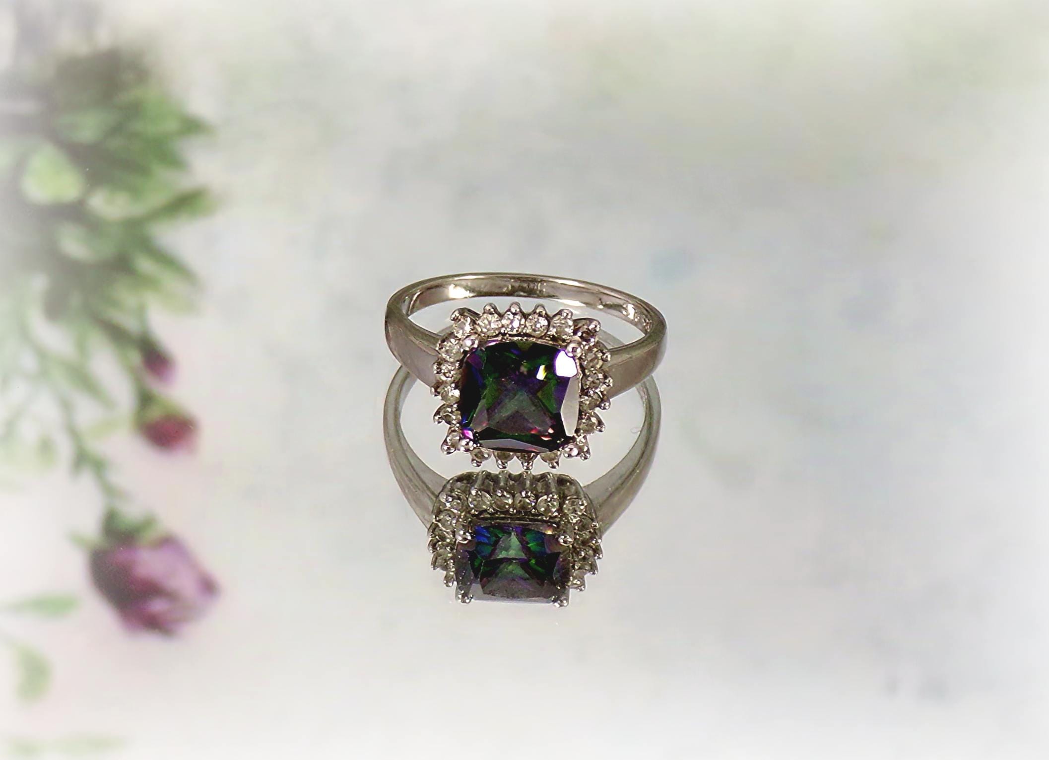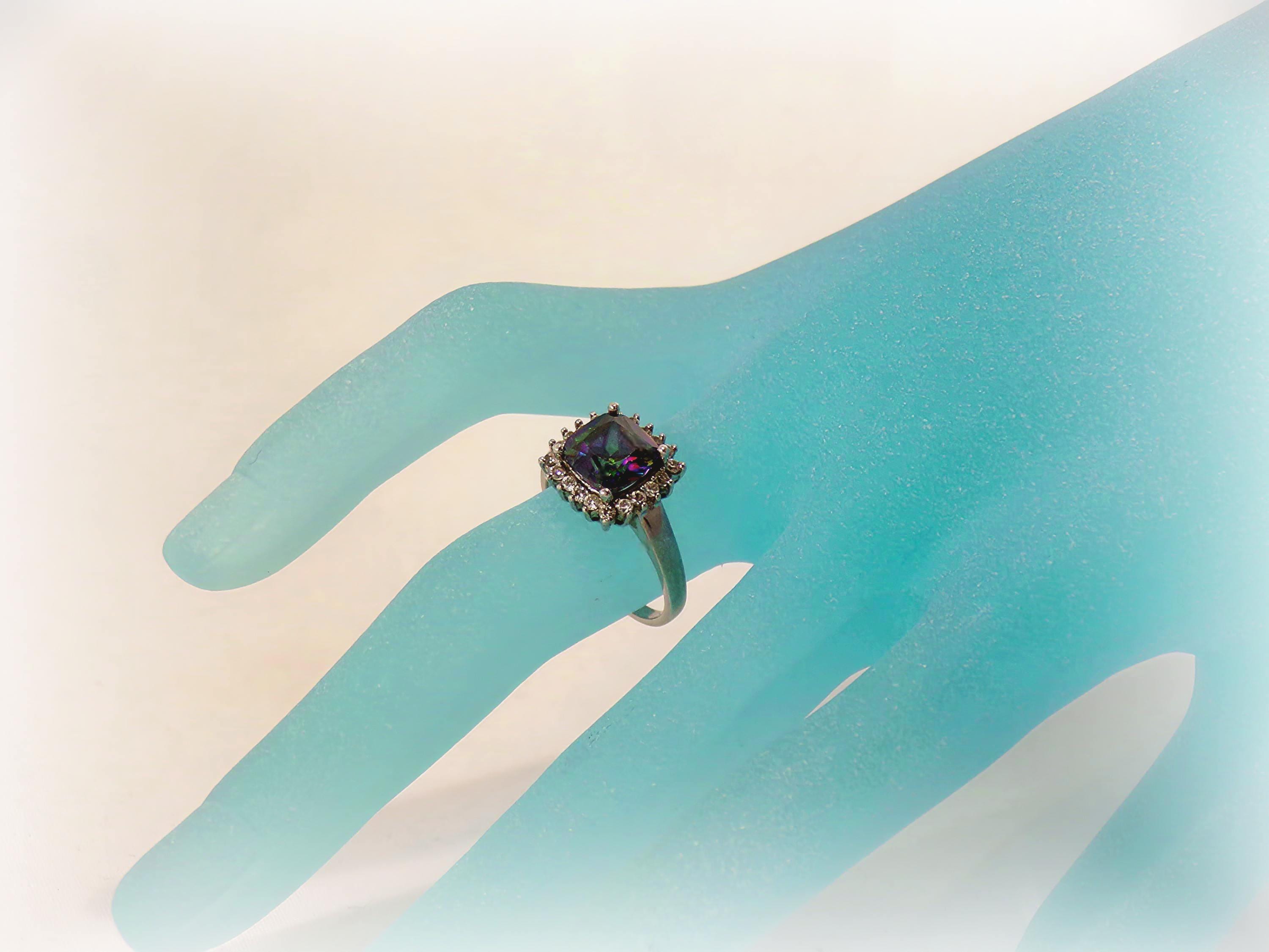Marketing Description: This is a beautifully Square Cut Mystic Topaz Sterling Silver Ring that has a lovely CZ Halo around it. This ring makes a statement no matter how you wear it. This ring has style and elegance, plus the rainbow effect of the Topaz Gemstone is gorgeous!
