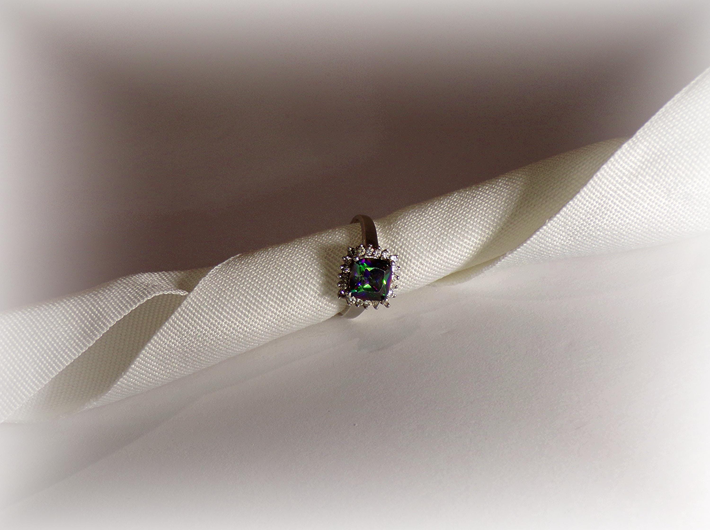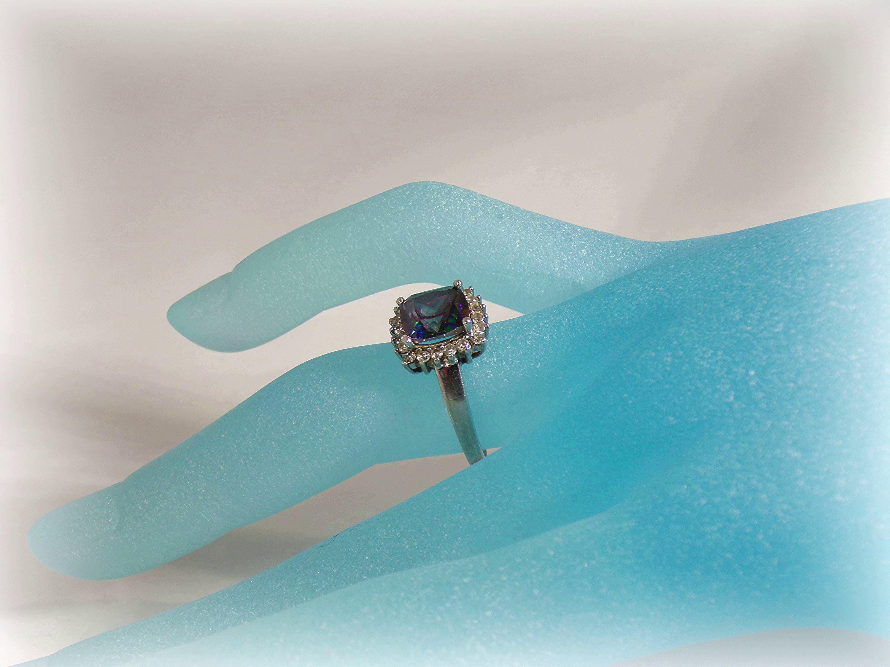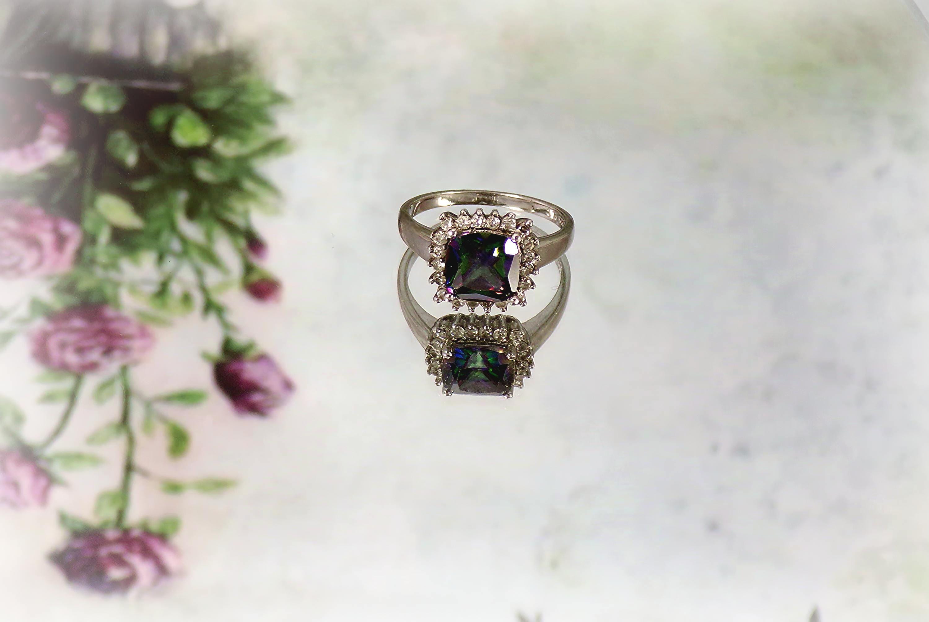 Marketing Description: This is a beautifully Square Cut Mystic Topaz Sterling Silver Ring that has a lovely CZ Halo around it. This ring makes a statement no matter how you wear it. This ring has style and elegance, plus the rainbow effect of the Topaz Gemstone is gorgeous!
