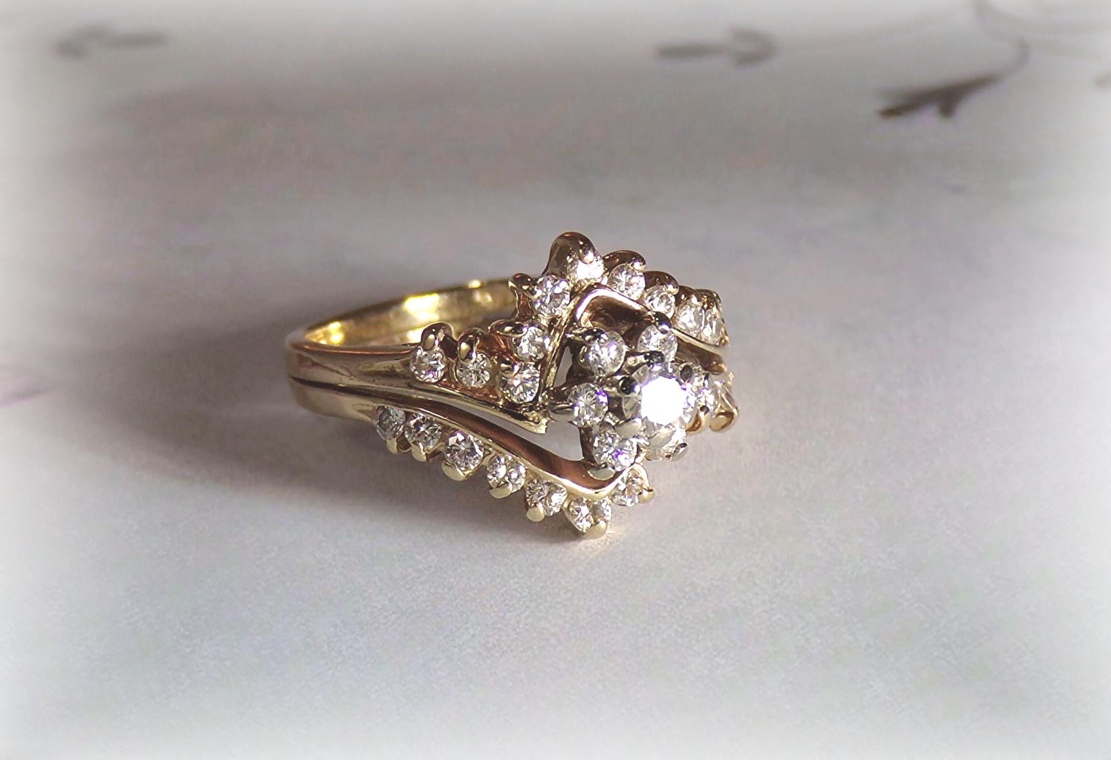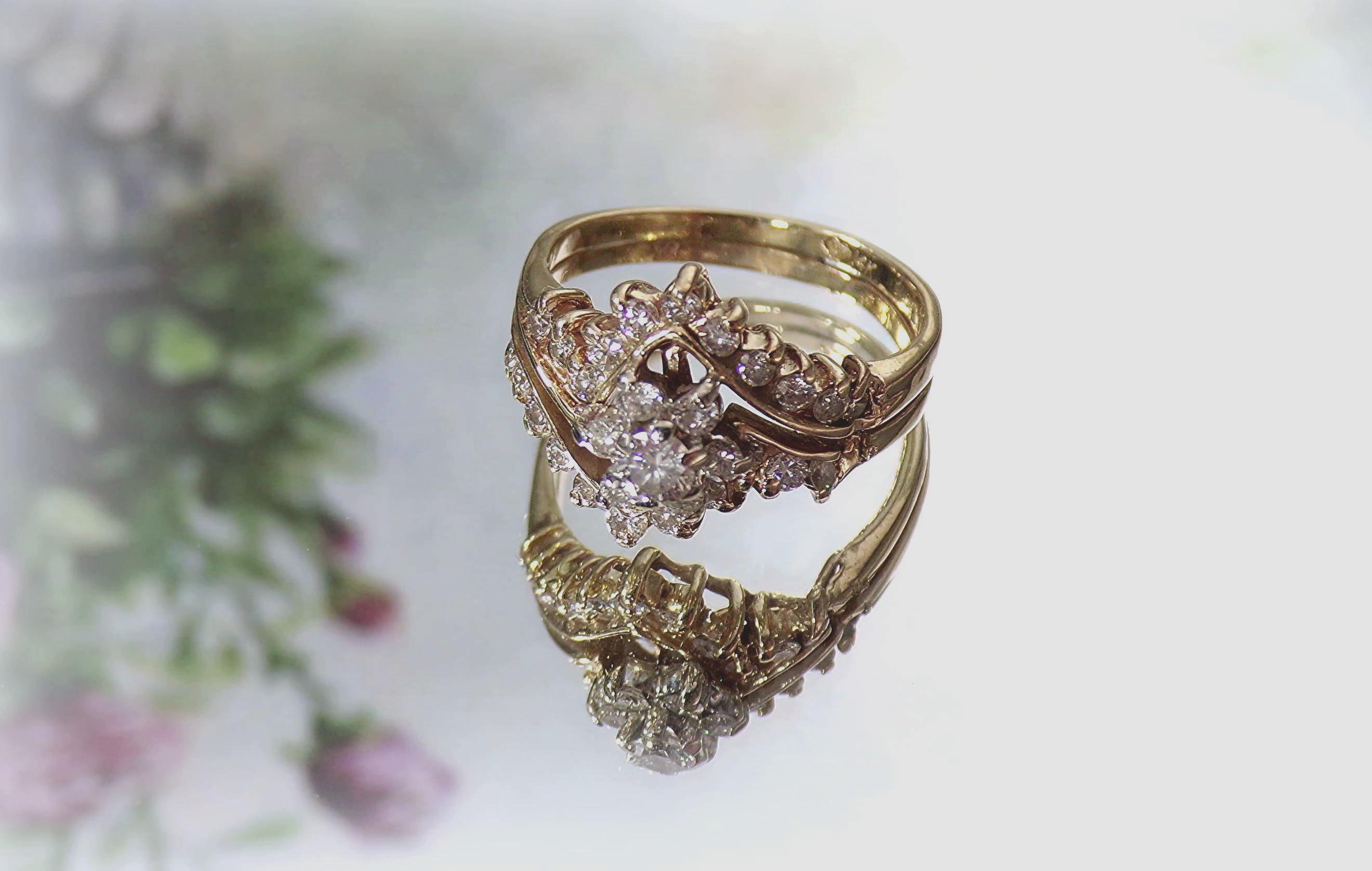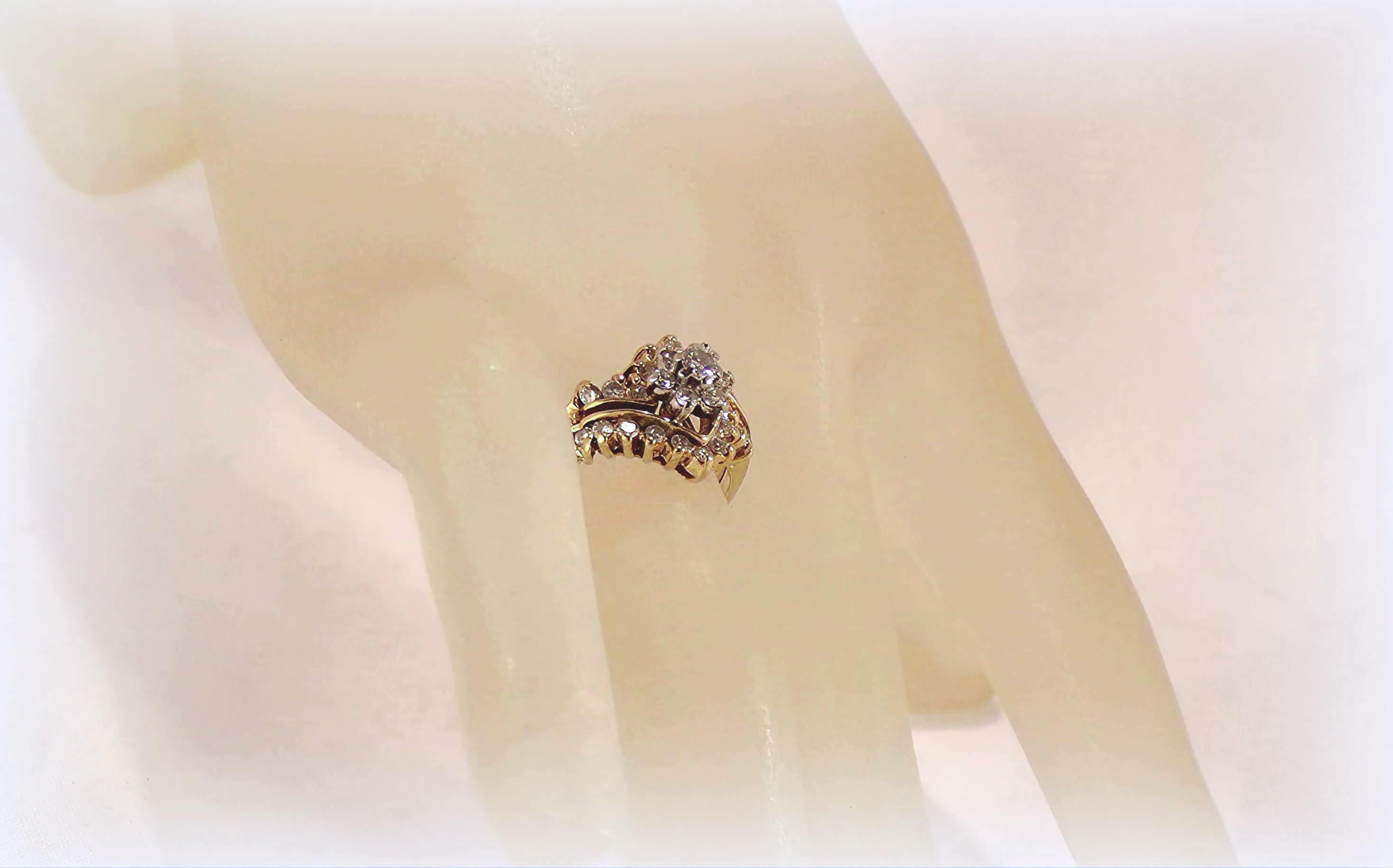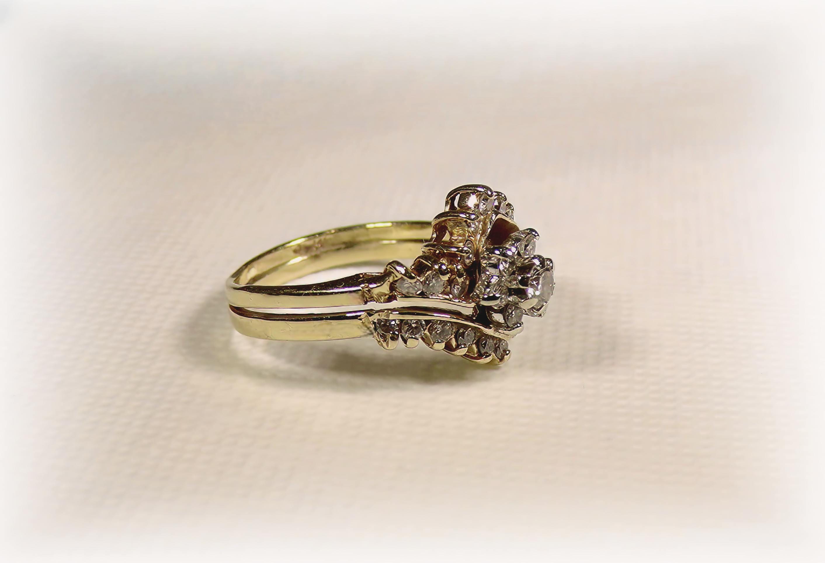 Genuine 14K Yellow Gold Diamond Bridal Ring Set – 7 Round Diamonds Floral Pattern – 22 Diamonds Contour Band - Vintage