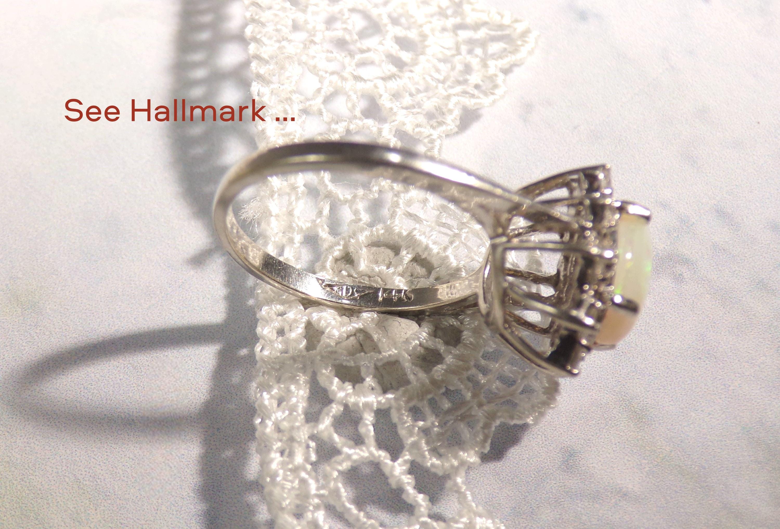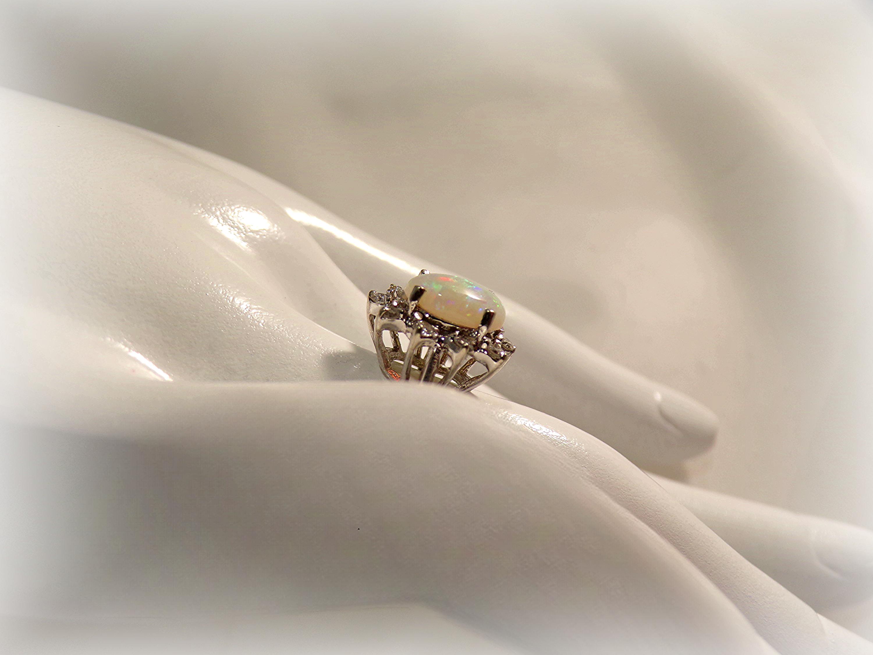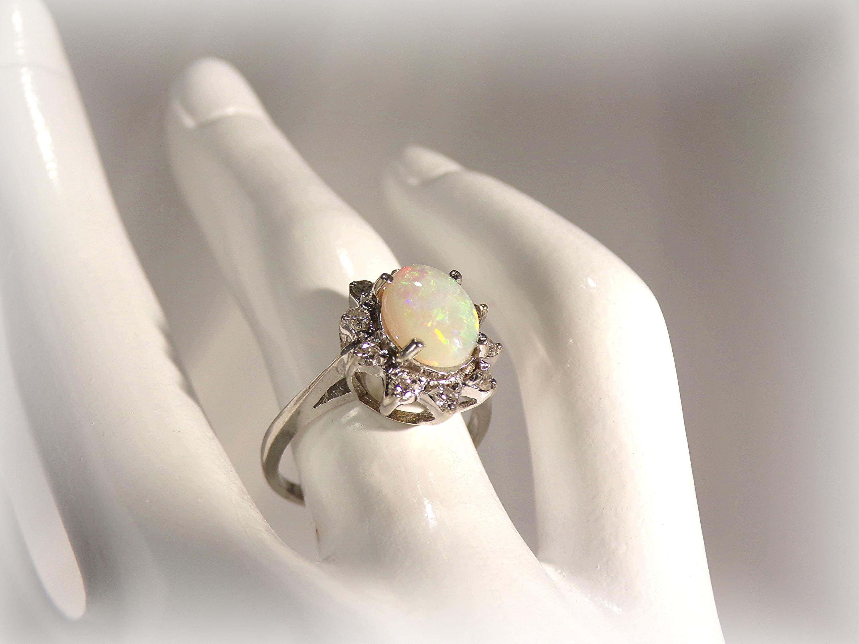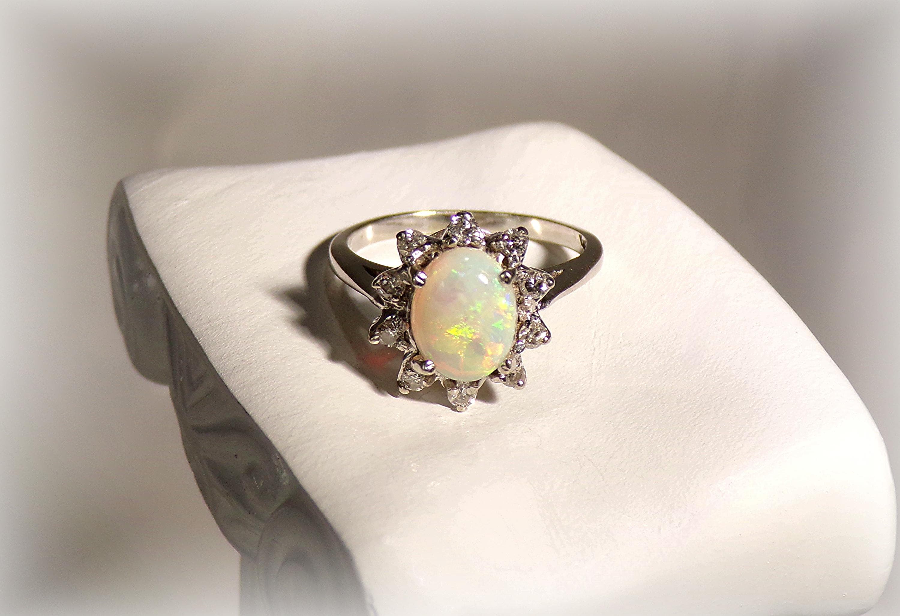 Womens Ring – Australian Opal with 10 Genuine Diamond Halo – 14K White Gold - Vintage