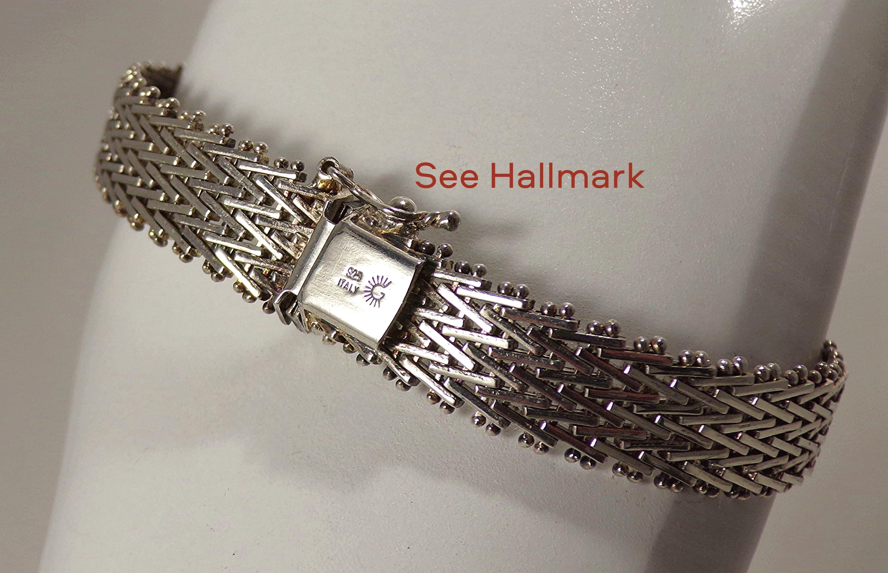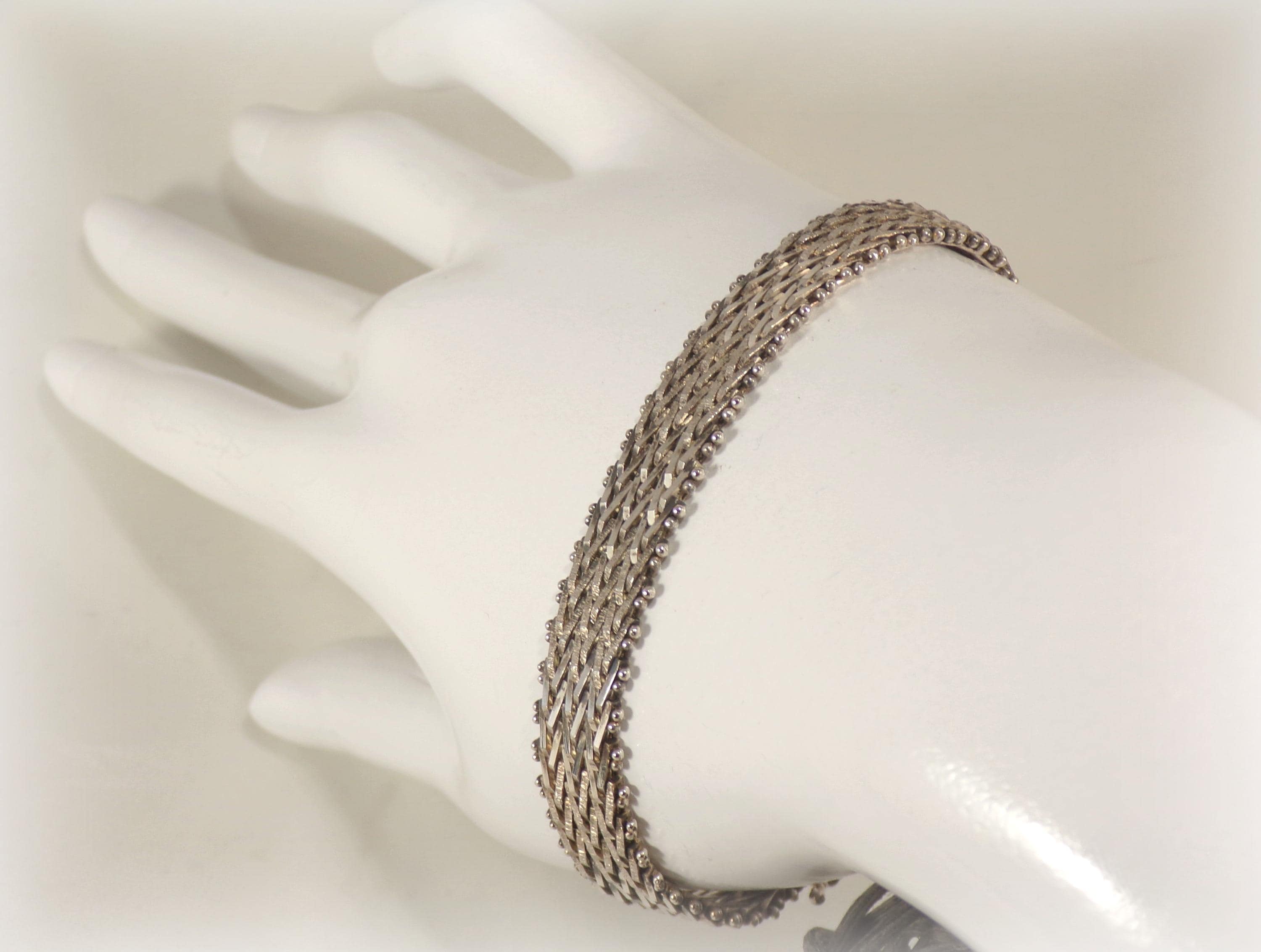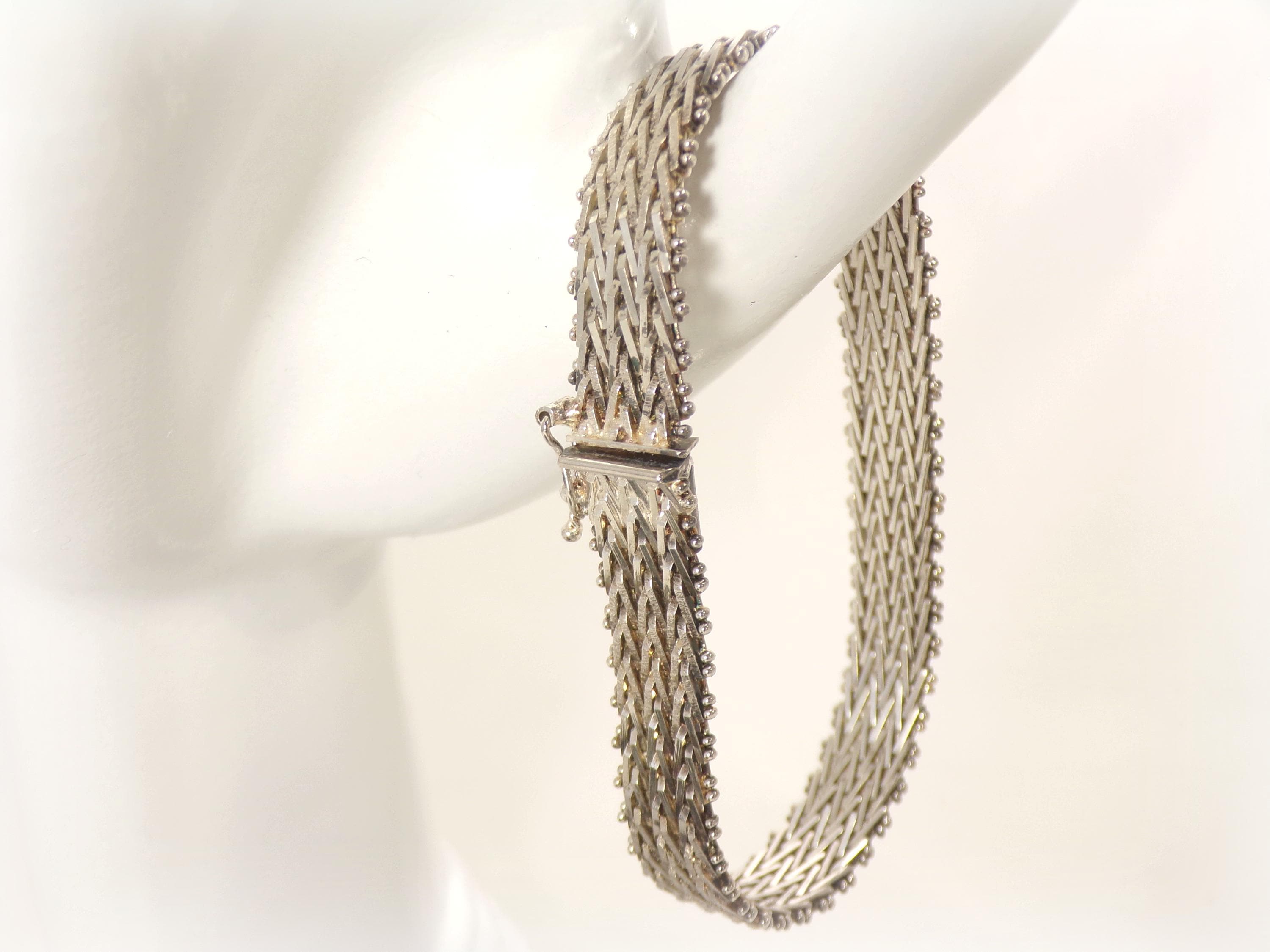 Beautiful reflective light is captured against the smooth and textured links of this expertly crafted Sterling Silver Riccio Chevron Bracelet. This Bracelet is pure quality from the woven design of the links, the Italian Silversmiths, and to the Slide Locking Clasp. This is a rare vintage find that will surely be appreciated by the wearer.