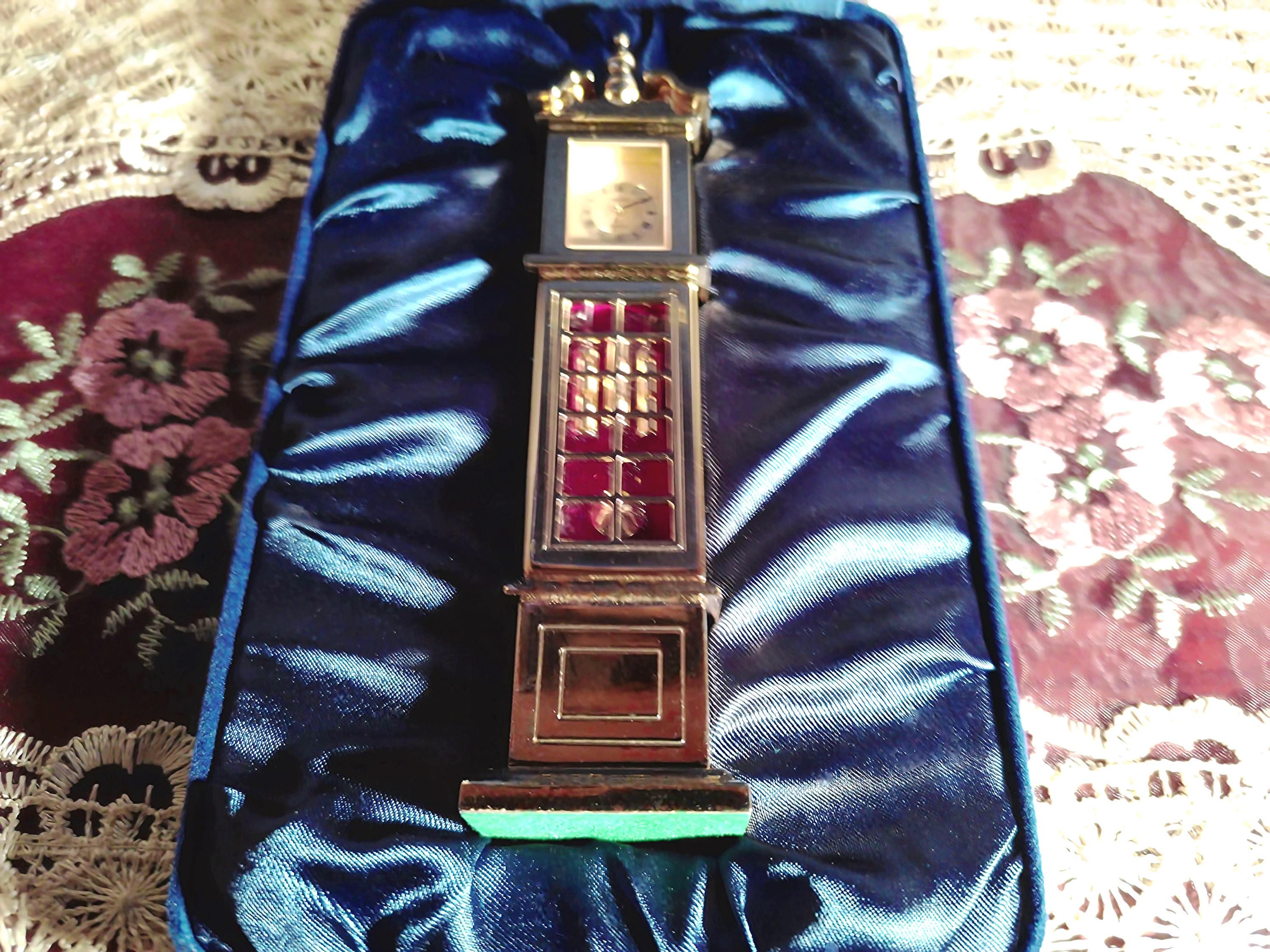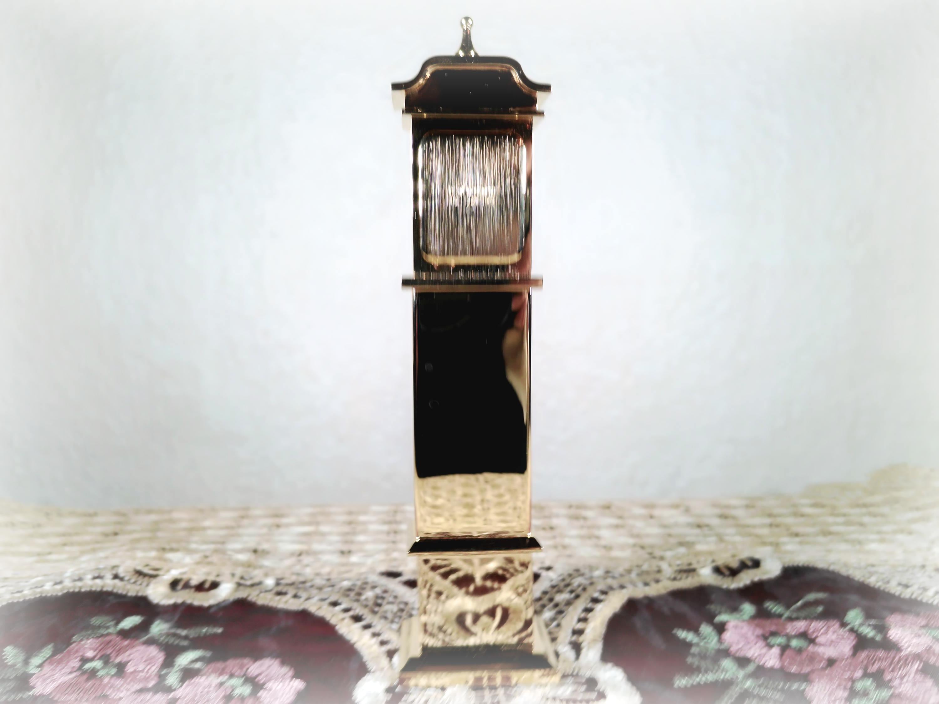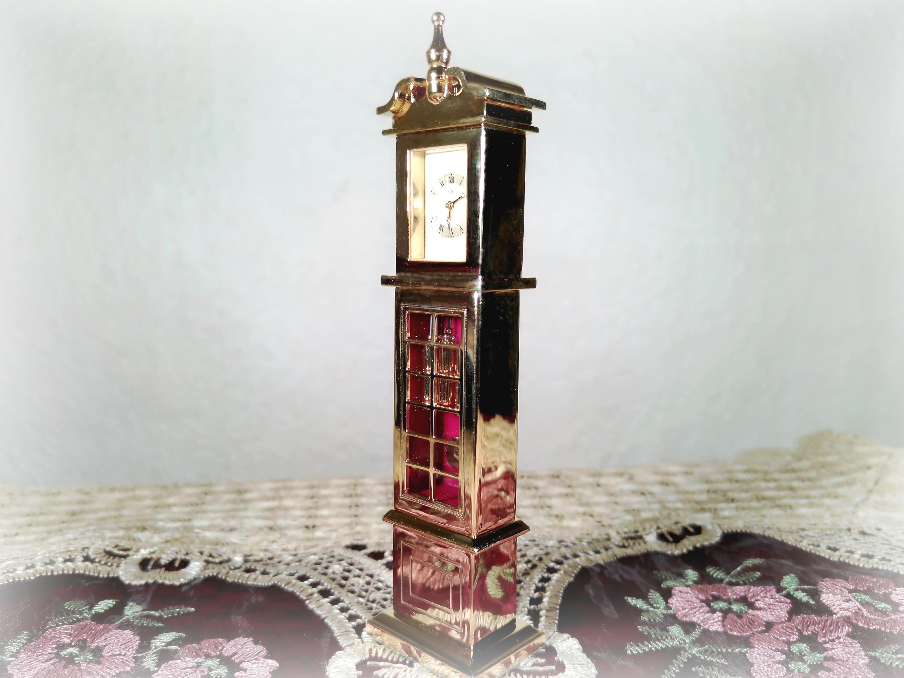 This is a gorgeous, polished brass Grandfather Clock that is perfect for a Desk, tabletop or Doll House. This watch is a Quartz clock that is battery operated. It is a beautiful replica. This clock comes in its original velveteen dark blue case with a dark blue silk-satin insert. It also comes with its original paperwork for warranty and instructions. This clock will have a new battery installed prior to shipping and it is in Like New Condition. New Old Stock (NOS)