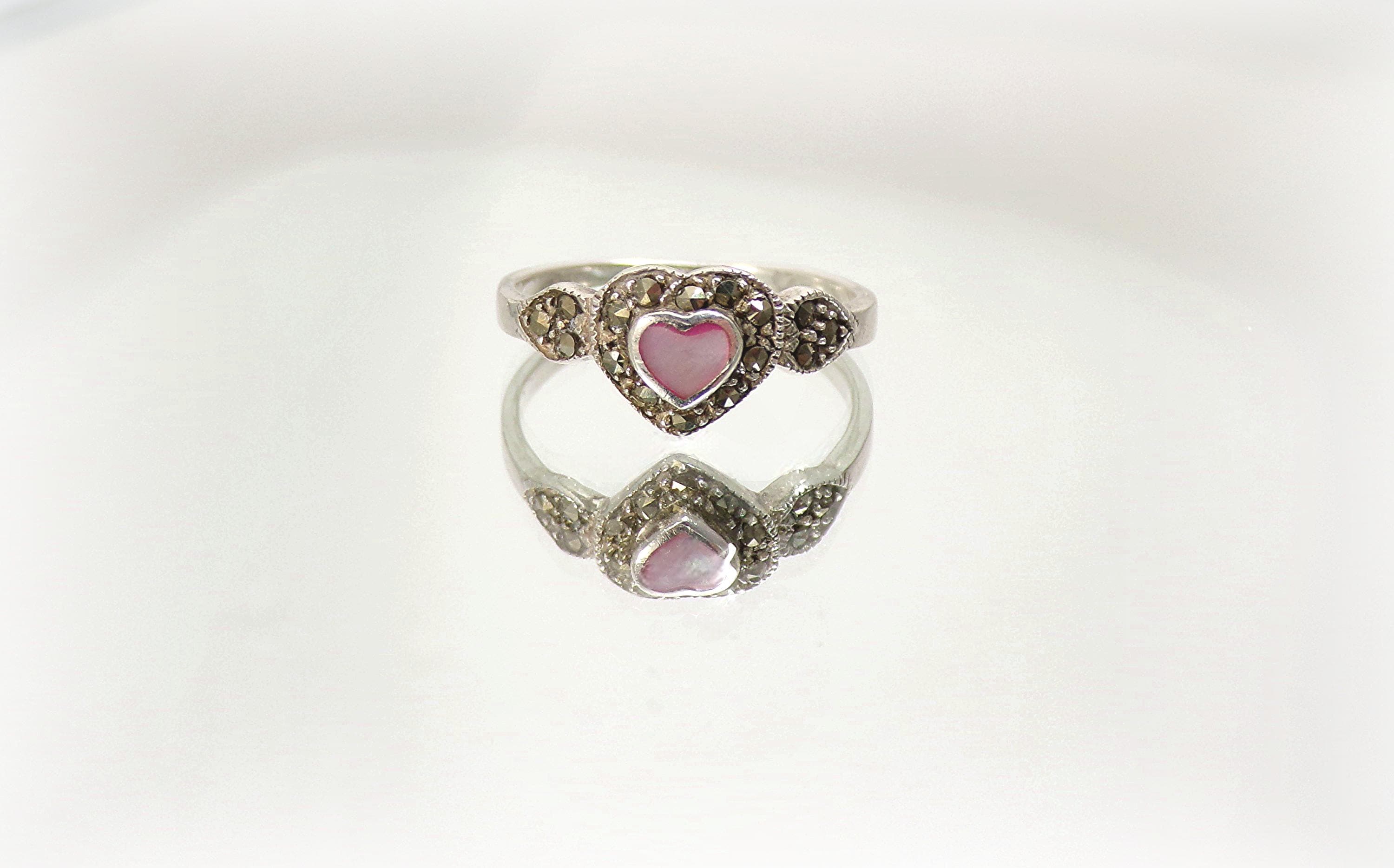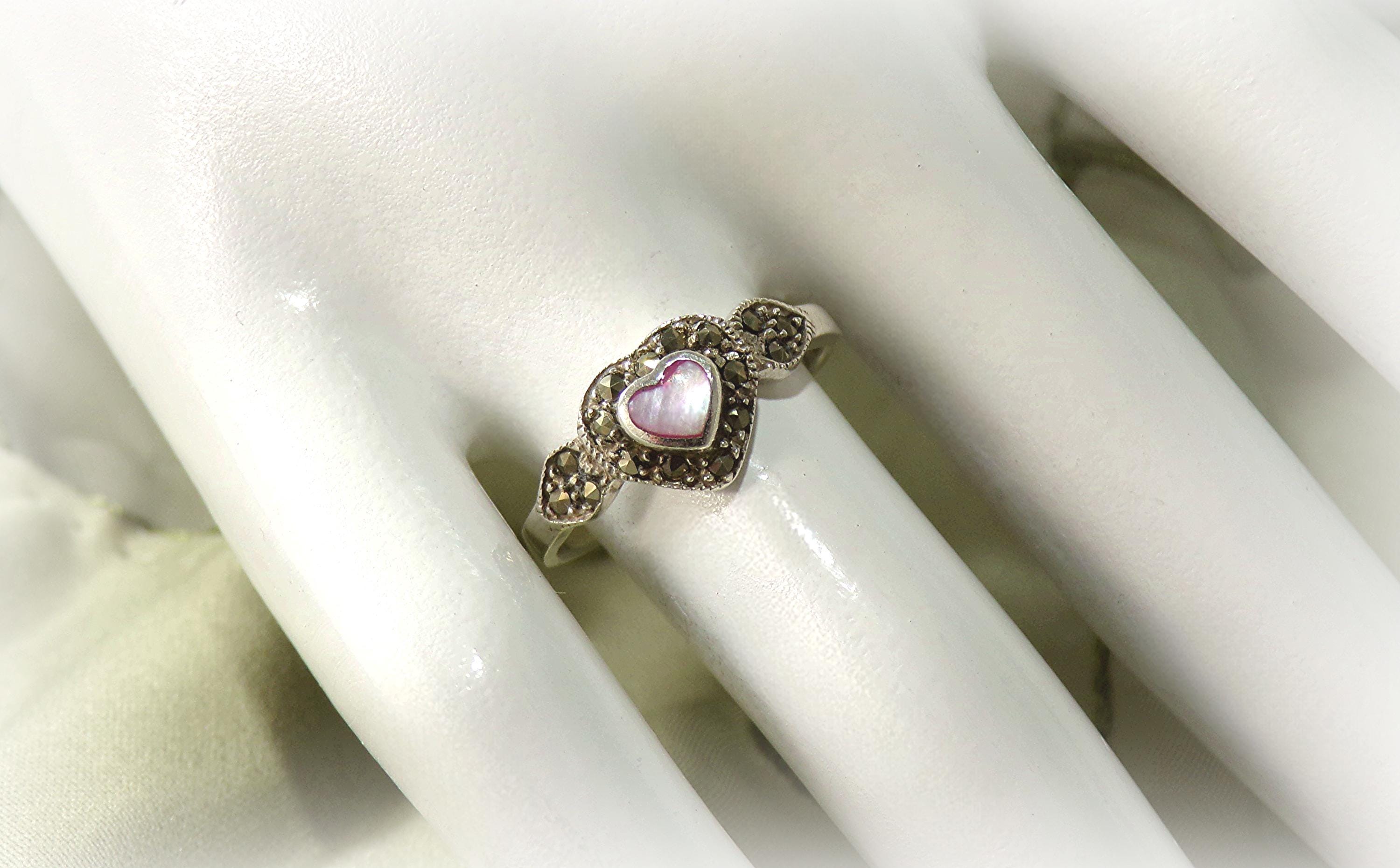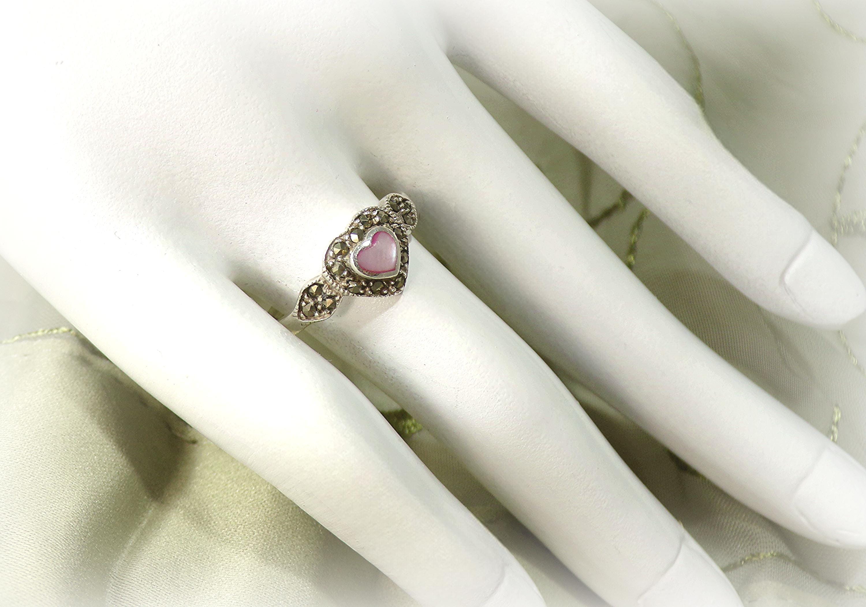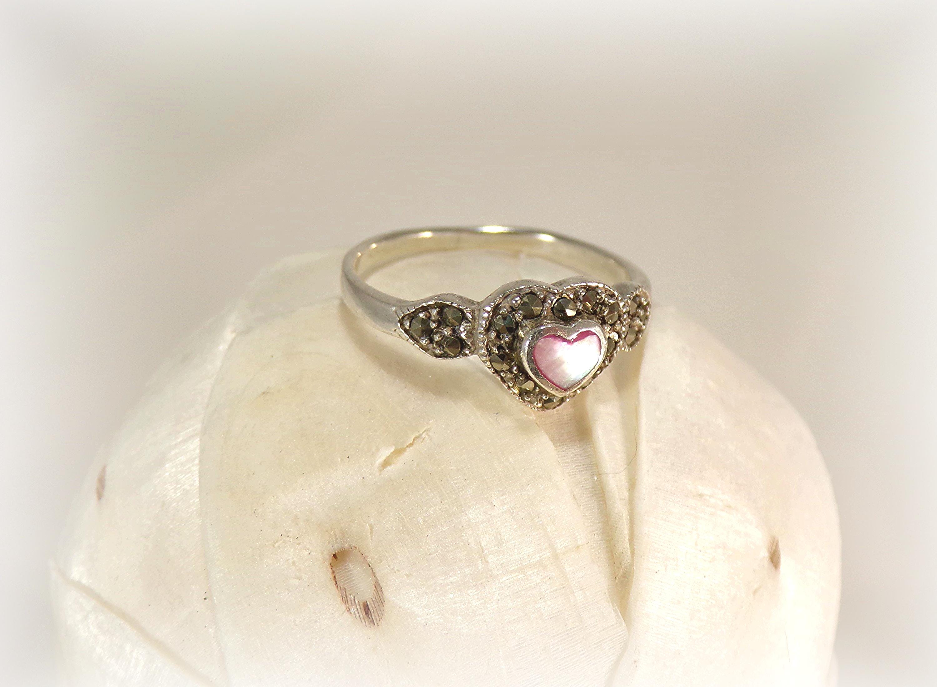 Pink Heart-Shaped Mother of Pearl with Marcasite Ring – 925 Sterling Silver- Vintage